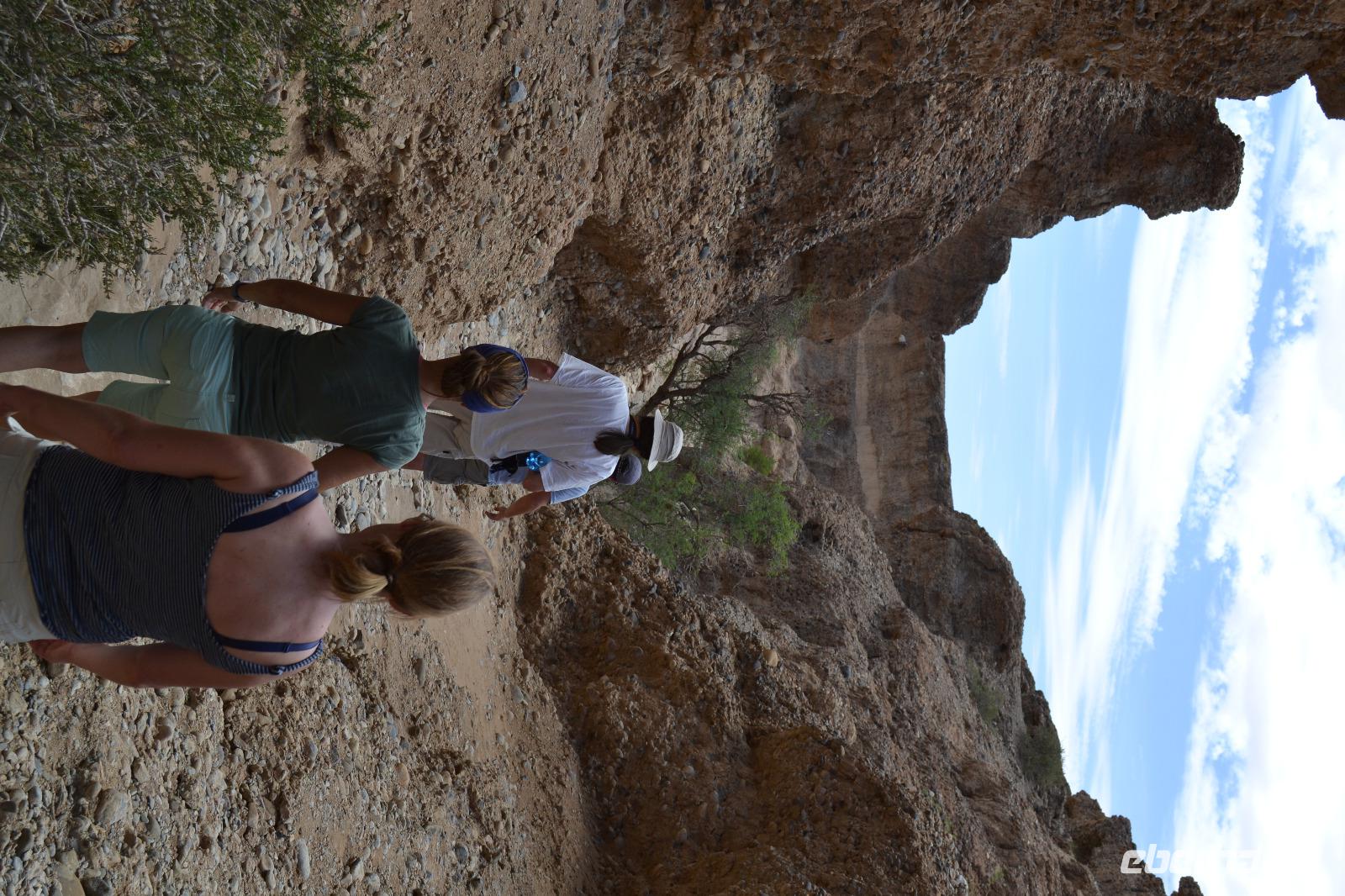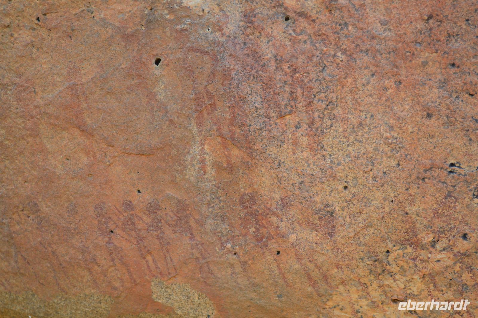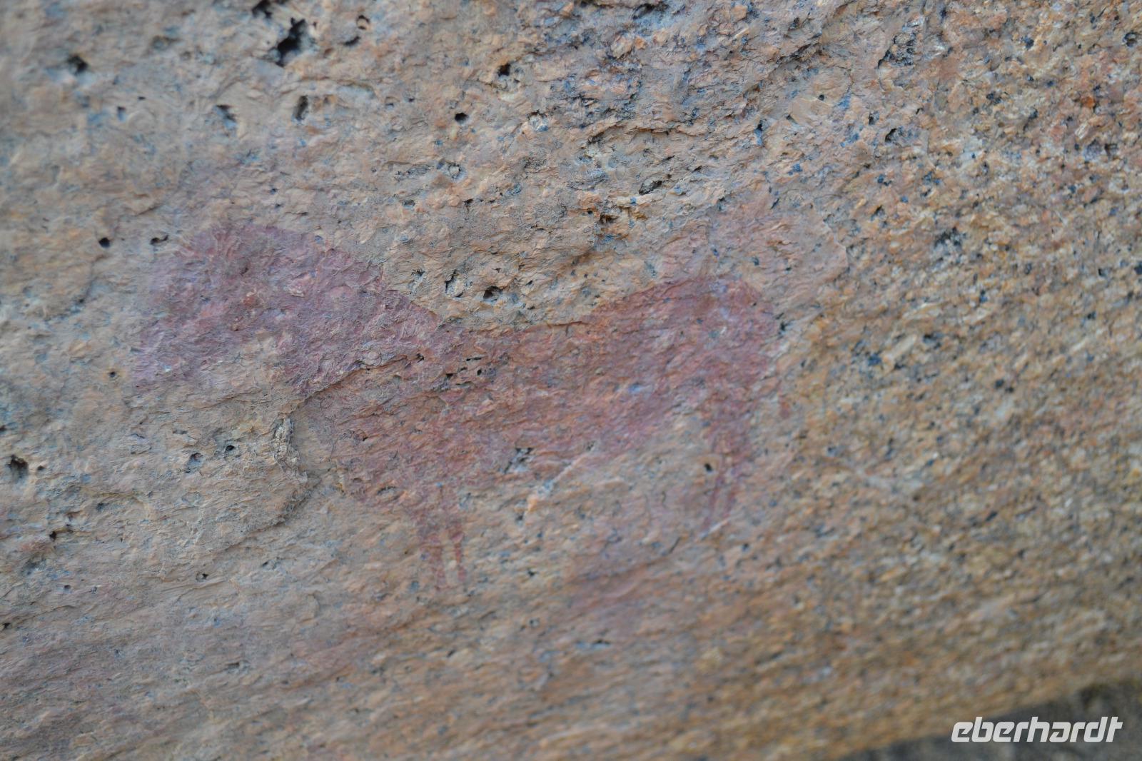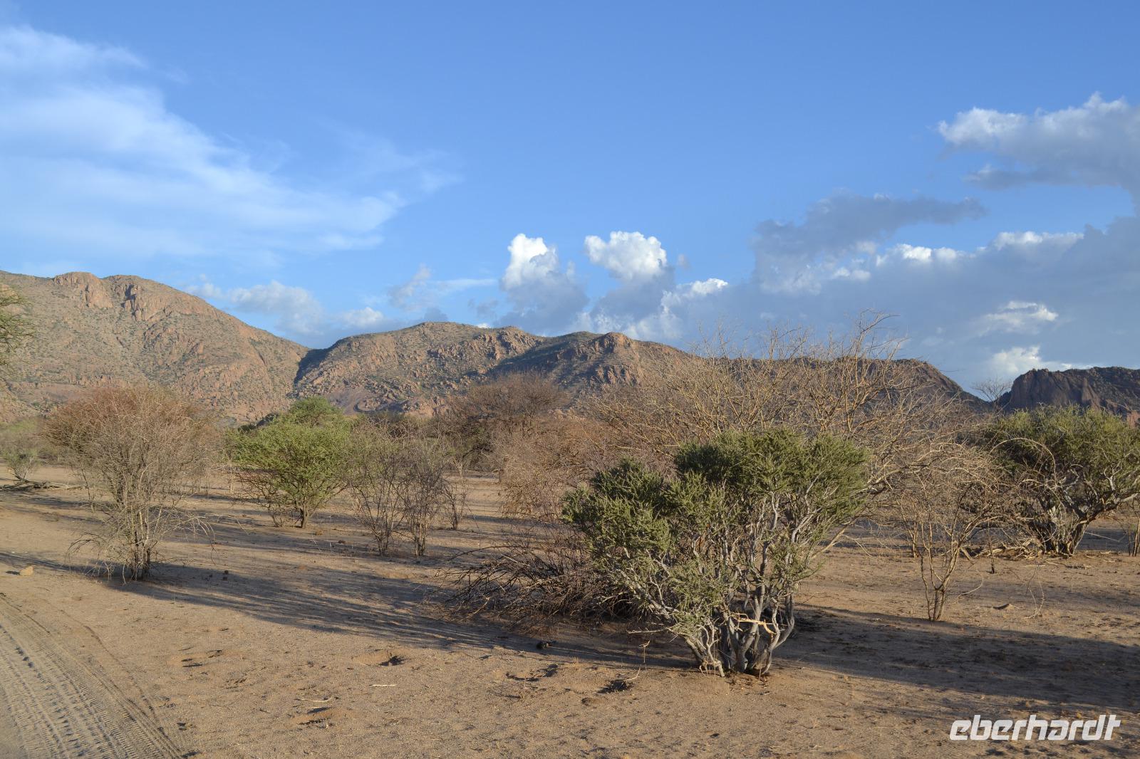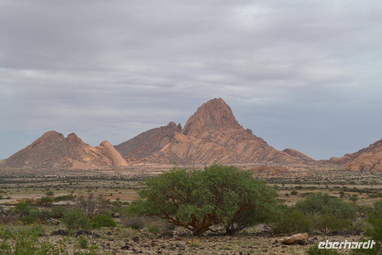 Wir frühstückten in dem neuen Stadthotel und fuhren heute mal etwas später los als gewohnt. Unserer Dagmar ging es heute leider nicht so gut. Sie hatte am Vortag anscheinend etwas Falsches gegessen. Die Kripo besuchte vor der Abfahrt noch die örtliche Polizeistation und schoß ein paar Erinnerungsfotos. Anschließend fuhren wir nicht allzu weit zur Spitzkoppe. Der Inselberg mit 1728 m Höhe wird auch als das „Matterhorn Namibias" bezeichnet. Seit 2011 gilt es als Nationaldenkmal und unterhielt damals eine Polizeistation der Schutztruppe für Deutsch-Südwestafrika. Leider verloren wir auf der gestrigen Holperfahrt unsere Klimaanlage und mussten nun mit offenen Fenstern auskommen. Eine Reparatur oder ein Bustausch war auf Grund der Ferien bis zum 07.01. leider nicht möglich. An dem Berg angekommen unternahmen wir zunächst einen kleinen Spaziergang über die skurrile Fels Landschaft zum Rock Arch, dem Felsbogen. Lange hielt man es auf Grund der Hitze dort allerdings nicht aus. Unter einem schönen Baum veranstalteten wir ein Reste-Picknick, wobei wir einiges am Morgen in Swakopmund frisch einkauften. Unser Highlight war am Ende des Picknicks der Springbock Tanz mit dem anschließend namensgleichen Getränk. Dazu mischten Laura und Dagmar Pfefferminz Likör mit Amarula. Ein leckeres und erfrischendes Schnäpsle. Auf dem Weg zur Lodge hielten wir an den Ständen der Kinder, welche aus Blech gebastelte und bemalte Mobiles verkauften. Wir verteilten die Reste unseres Picknicks an die Kinder, welche sich sehr darüber freuten. Am Nachmittag erreichten wir die Ai Aiba Lodge und bezogen unsere Zimmer am Fuße eines Felsens im Erongo Gebirge. Wie regenerierten uns bei einem kühlen Getränk oder einem kleinen Schläfchen. 17 Uhr ging es dann auf eine Sundowner Fahrt durch das Erongo Tal. Auf dieser Tour mit dem Jeep sahen wir unterschiedlichste Landschaftsbilder, Giraffen, Warzenschweine, Oryx und Wandmalereien. Diese dienten der Weiter Erzählung von Geschichten, waren Veranstaltungsort für Zeremonien und stellten die Geschichte der Ureinwohner dar. An einem höher gelegenen Felsen legten wir mit den Jeeps eine Pause ein. Jeder bekam ein kühles Getränk für den Sonnenuntergang im Gebirge, sowie ein paar Naschereien. Am Abend kamen wir in der Dunkelheit zurück in das Hotel, wo bereits N. Und Dagmar hungrig auf uns und das Abendessen warteten.