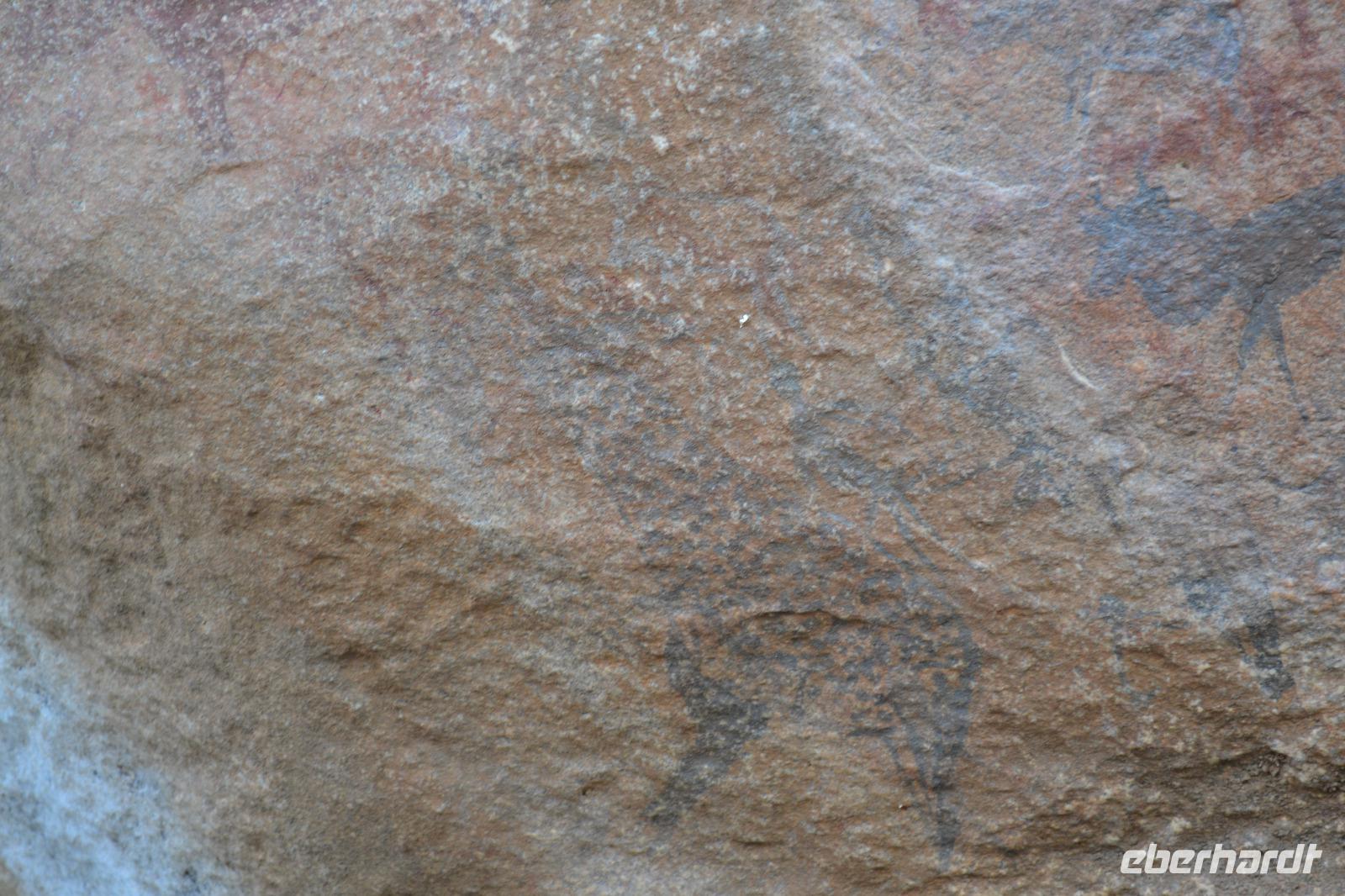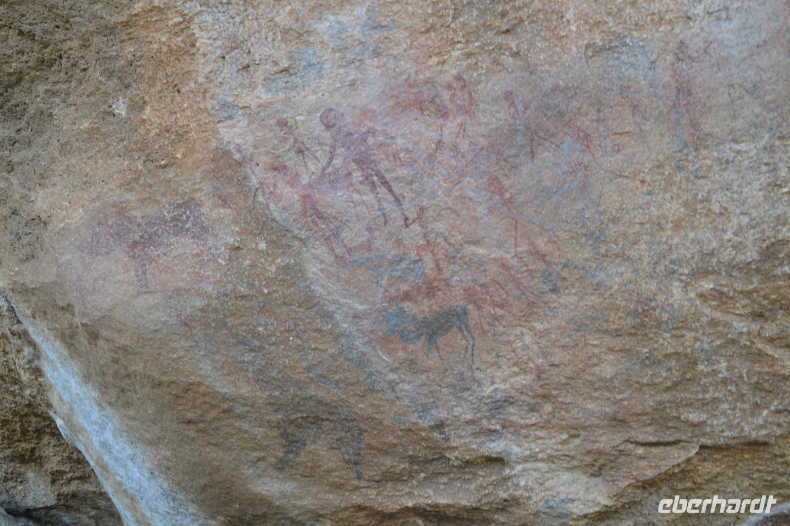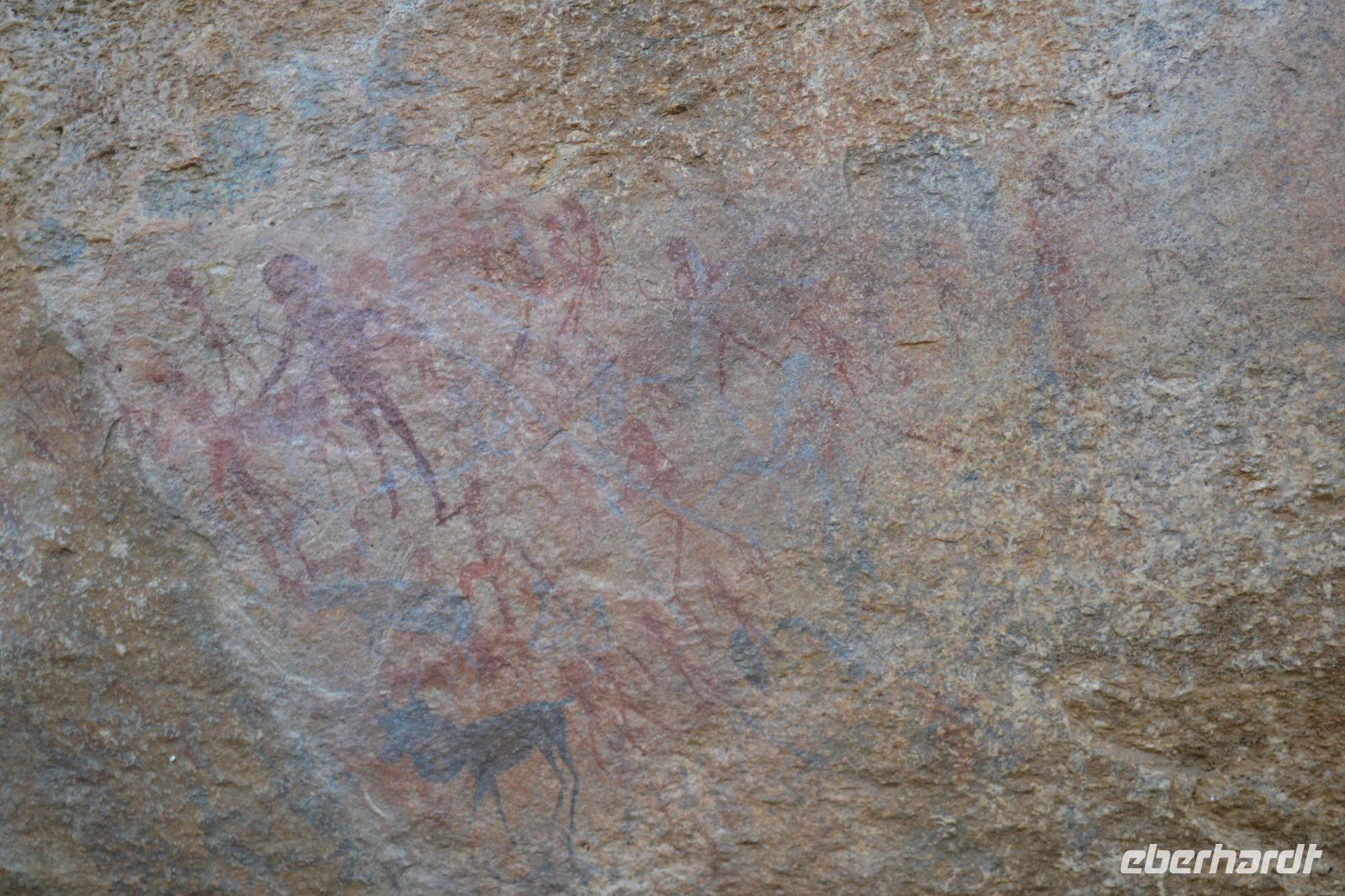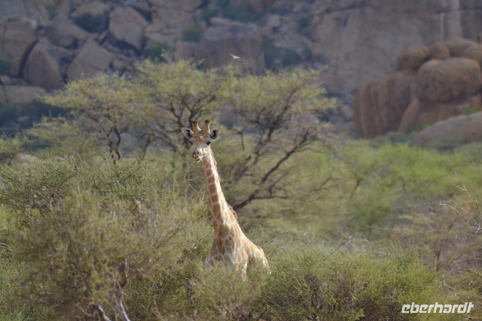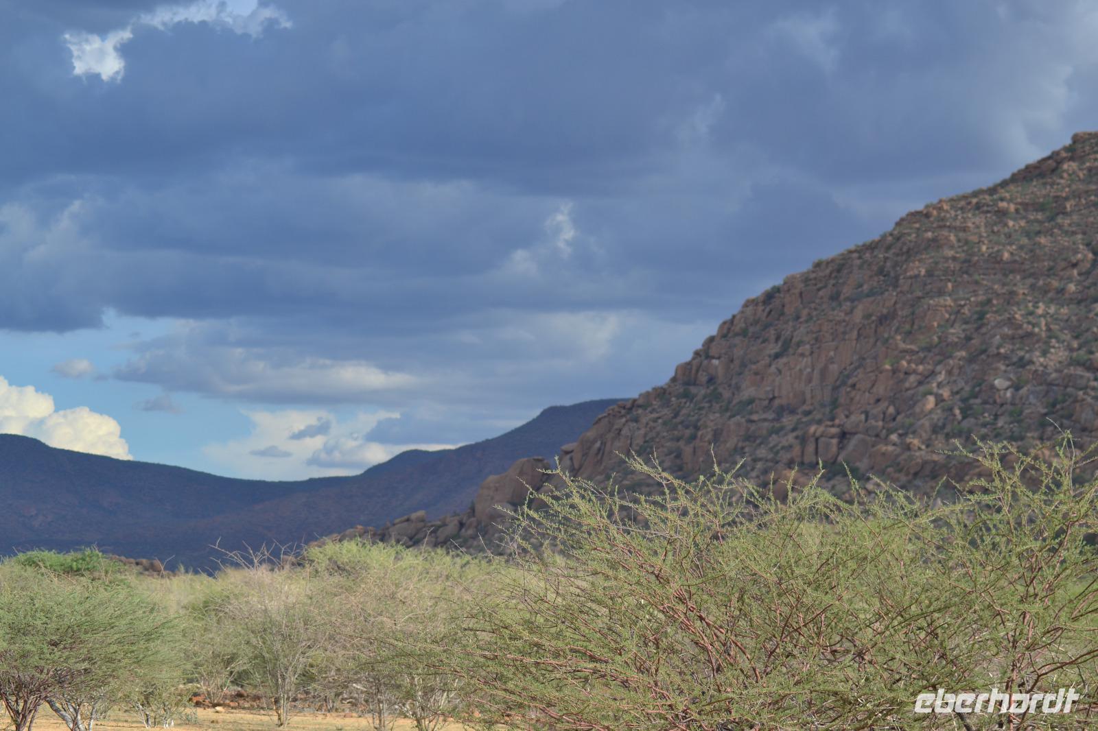 Wir frühstückten in dem neuen Stadthotel und fuhren heute mal etwas später los als gewohnt. Unserer Dagmar ging es heute leider nicht so gut. Sie hatte am Vortag anscheinend etwas Falsches gegessen. Die Kripo besuchte vor der Abfahrt noch die örtliche Polizeistation und schoß ein paar Erinnerungsfotos. Anschließend fuhren wir nicht allzu weit zur Spitzkoppe. Der Inselberg mit 1728 m Höhe wird auch als das „Matterhorn Namibias" bezeichnet. Seit 2011 gilt es als Nationaldenkmal und unterhielt damals eine Polizeistation der Schutztruppe für Deutsch-Südwestafrika. Leider verloren wir auf der gestrigen Holperfahrt unsere Klimaanlage und mussten nun mit offenen Fenstern auskommen. Eine Reparatur oder ein Bustausch war auf Grund der Ferien bis zum 07.01. leider nicht möglich. An dem Berg angekommen unternahmen wir zunächst einen kleinen Spaziergang über die skurrile Fels Landschaft zum Rock Arch, dem Felsbogen. Lange hielt man es auf Grund der Hitze dort allerdings nicht aus. Unter einem schönen Baum veranstalteten wir ein Reste-Picknick, wobei wir einiges am Morgen in Swakopmund frisch einkauften. Unser Highlight war am Ende des Picknicks der Springbock Tanz mit dem anschließend namensgleichen Getränk. Dazu mischten Laura und Dagmar Pfefferminz Likör mit Amarula. Ein leckeres und erfrischendes Schnäpsle. Auf dem Weg zur Lodge hielten wir an den Ständen der Kinder, welche aus Blech gebastelte und bemalte Mobiles verkauften. Wir verteilten die Reste unseres Picknicks an die Kinder, welche sich sehr darüber freuten. Am Nachmittag erreichten wir die Ai Aiba Lodge und bezogen unsere Zimmer am Fuße eines Felsens im Erongo Gebirge. Wie regenerierten uns bei einem kühlen Getränk oder einem kleinen Schläfchen. 17 Uhr ging es dann auf eine Sundowner Fahrt durch das Erongo Tal. Auf dieser Tour mit dem Jeep sahen wir unterschiedlichste Landschaftsbilder, Giraffen, Warzenschweine, Oryx und Wandmalereien. Diese dienten der Weiter Erzählung von Geschichten, waren Veranstaltungsort für Zeremonien und stellten die Geschichte der Ureinwohner dar. An einem höher gelegenen Felsen legten wir mit den Jeeps eine Pause ein. Jeder bekam ein kühles Getränk für den Sonnenuntergang im Gebirge, sowie ein paar Naschereien. Am Abend kamen wir in der Dunkelheit zurück in das Hotel, wo bereits N. Und Dagmar hungrig auf uns und das Abendessen warteten.