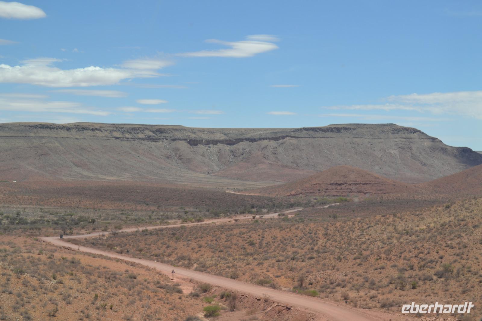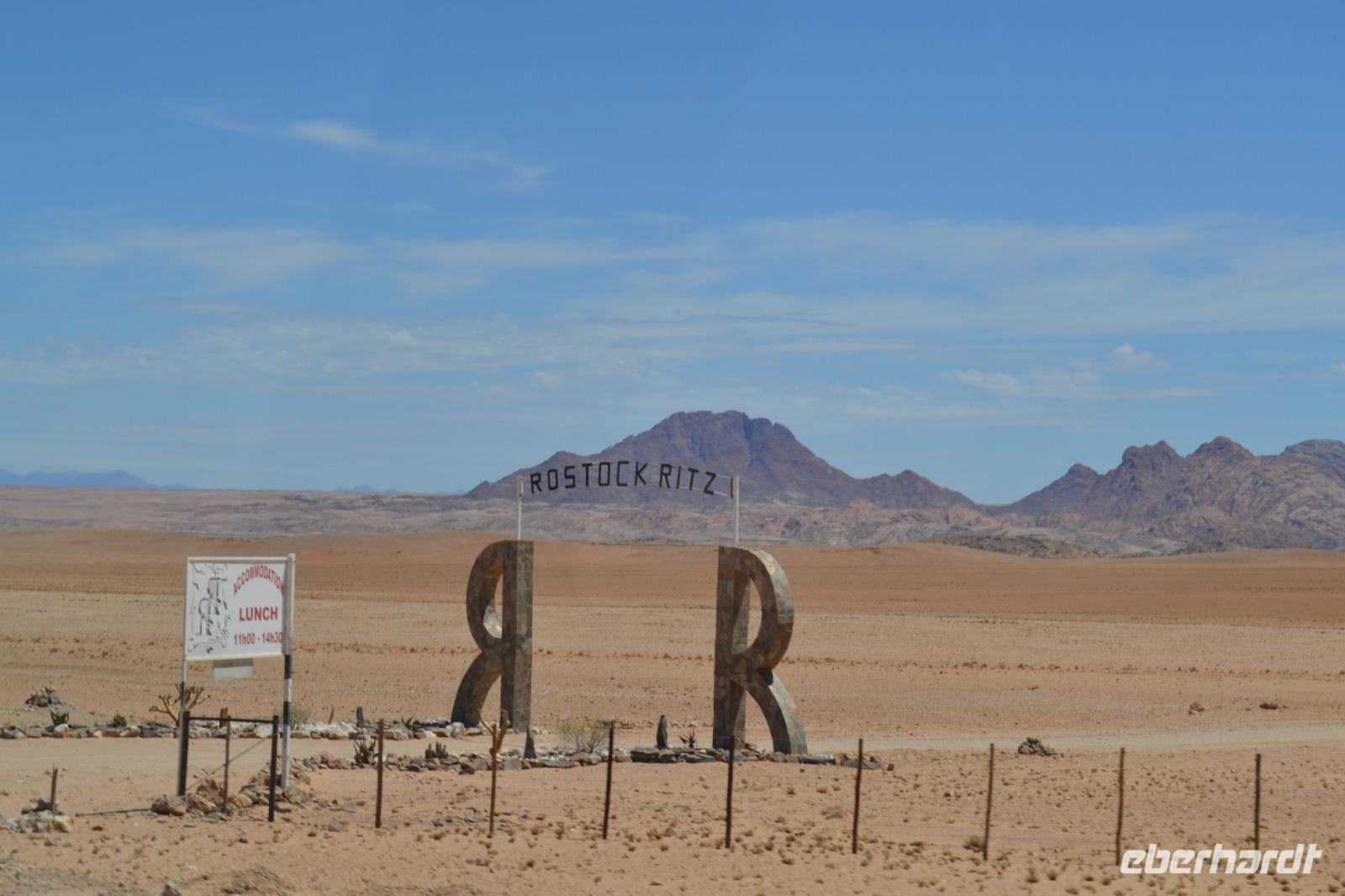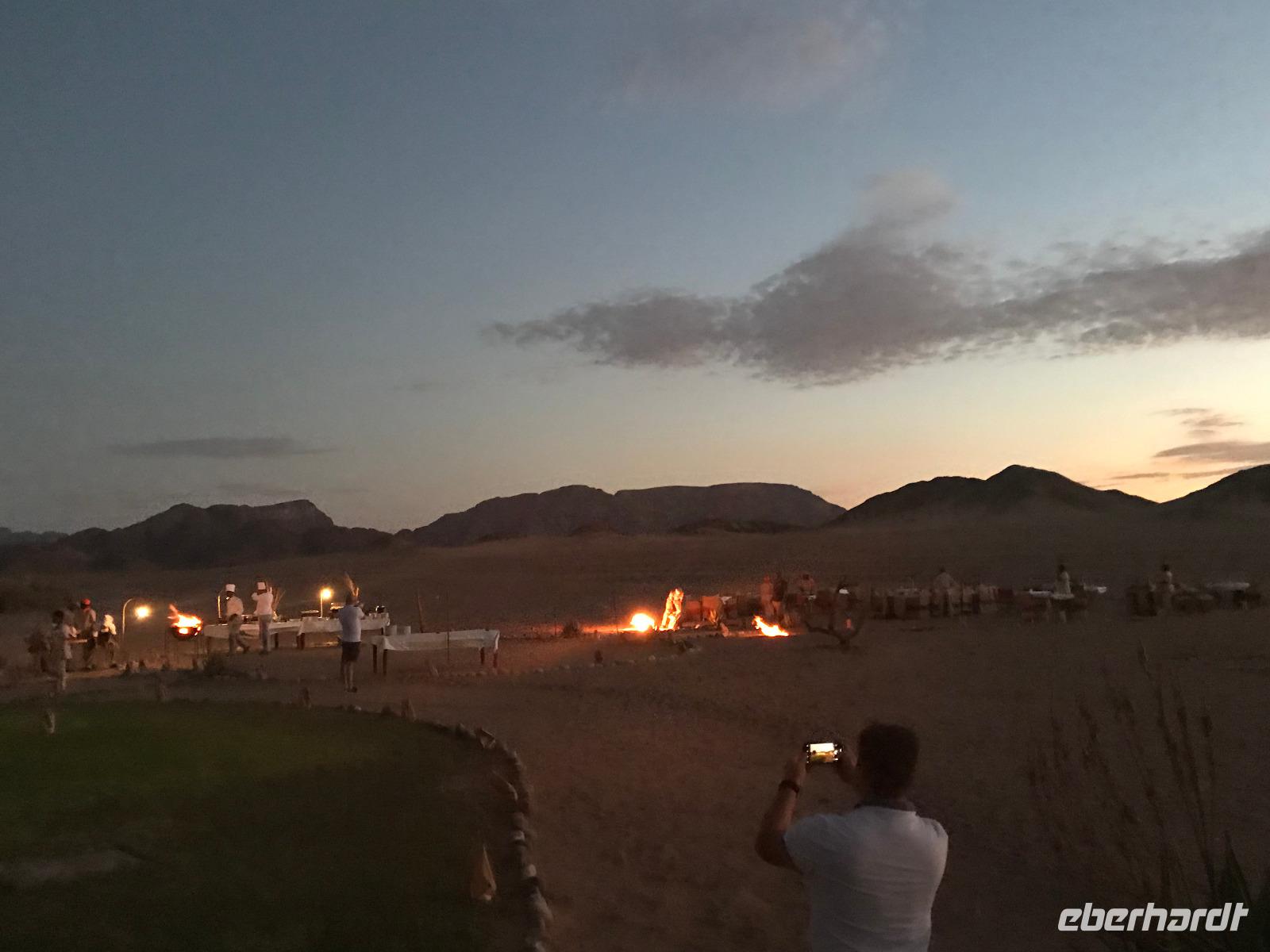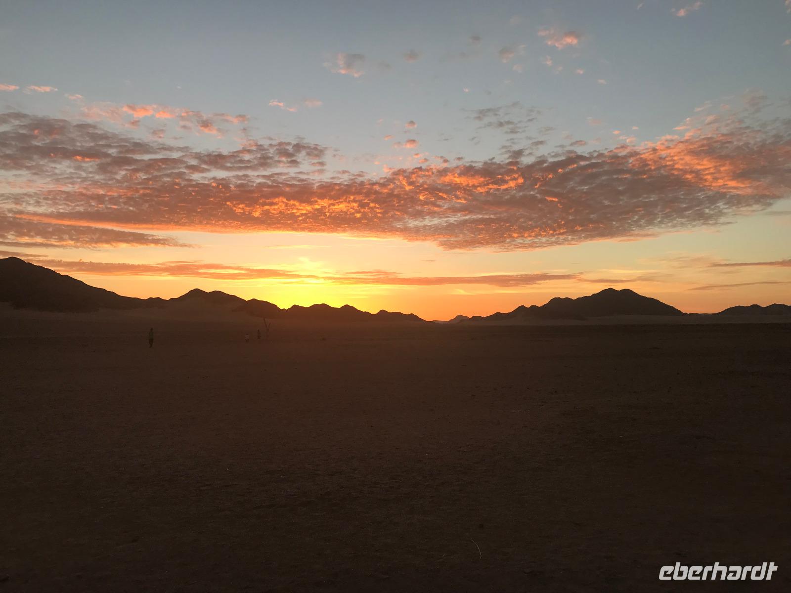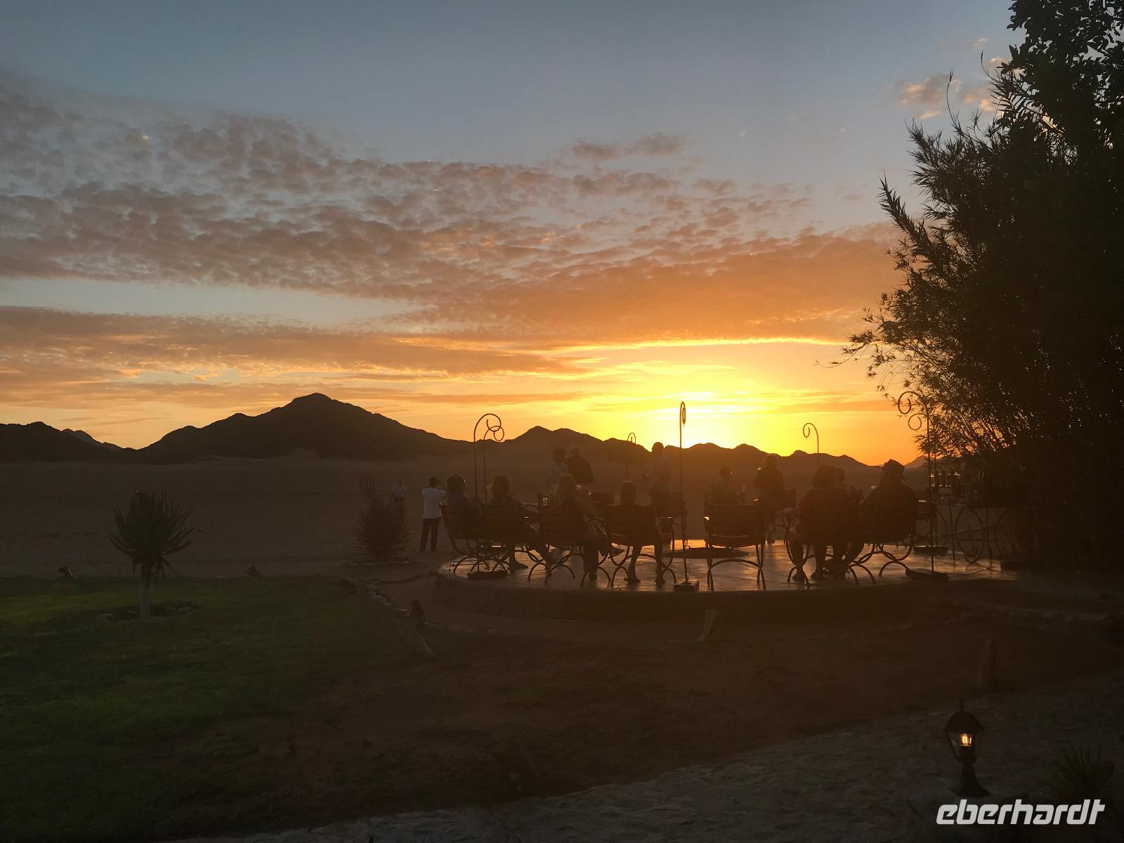 Wir verabschiedeten uns beim Frühstück von der traumhaften Natur mit den dort lebenden Tieren und fuhren weiter gen Osten! Nach einer kurzen Toilettenpause in dem kleinen Ort Mariental ging es über ein extremes Pad nach Maltahöhe. Auf dem landschaftlich kargen Weg erklärte uns Dagmar umfassend die Hintergründe der 11 ethnischen Gruppen Namibia, deren Sprache und Gebiet. Besonders die San und Khoikhoi erklärte sie genau anhand der äußerlichen Merkmale. Namibia ist extrem dünn besiedelt und nach der Mongolei der Staat mit der geringsten Bevölkerungsdichte weltweit. Die Bevölkerung verteilt sich ungleichmäßig und konzentriert sich auf wenige Städte. Hier kam der dritte alkoholische Tipp ins Spiel. Man solle viel Wein trinken, denn dieser enthält wichtige Vitamine. In Maltahöhe leben ca. 50 deutsche Mischlinge und etwa 2.000 San. Wir legten unsere Mittagspause in einem deutschen Country Hotel ein und genossen eine kurze Erholungspause der holprigen Fahrt. Ein leckeres und leichtes Sandwich mit einem erfrischenden Rock Shandy, dem national Getränk des Landes! Nun folgte der am schlechtesten gecradelte Pad der gesamten Reise. Unserer Busfahrer warf den Staubsauger im hinteren Teil des Busses an sonst säßen wir in einer Staubwolke. Die Fahrt durch die Randstufe glich einer Mondlandschaft. Am Nachmittag erreichten wir unser Wüstenschloss, wo wir den Nachmittag nutzen um uns zu entspannen und auf den Silvester Abend vorzubereiten. 19 Uhr trafen wir uns an der Feuerschale und beobachteten den traumhaften Sonnenuntergang entlang der Randstufe. Bei einem kühlen Getränk und leckeren Häppchen starteten wir in den letzten Abend des Jahres. Mit netten Gesprächen lernten wir uns besser kennen. Anschließend aßen wir in einer romantisch beleuchteten Atmosphäre in der dunklen Wüste. Es gab ein traditionelles Braain mit verschiedenem Gemüse, Fisch und Fleischarten. Die letzten Stunden von 2019 verbrachten wir mit der Forschung von Sternbildern und einem kleinen Afrikaans Sprachkur. Am späten Abend boten uns die Hotelangestellten noch eine kleine musikalische und tänzerische Vorführung. Kurz vor Mitternacht wurde das neue Jahr angezündet und ein Countdown zählte das neue Jahr ein. Mit einem Glas Sekt in der Hand tanzten wir zu der A Capella Musik der Angestellten. Nachdem alle Gläser geleert waren fielen wir müde in unsere Betten.