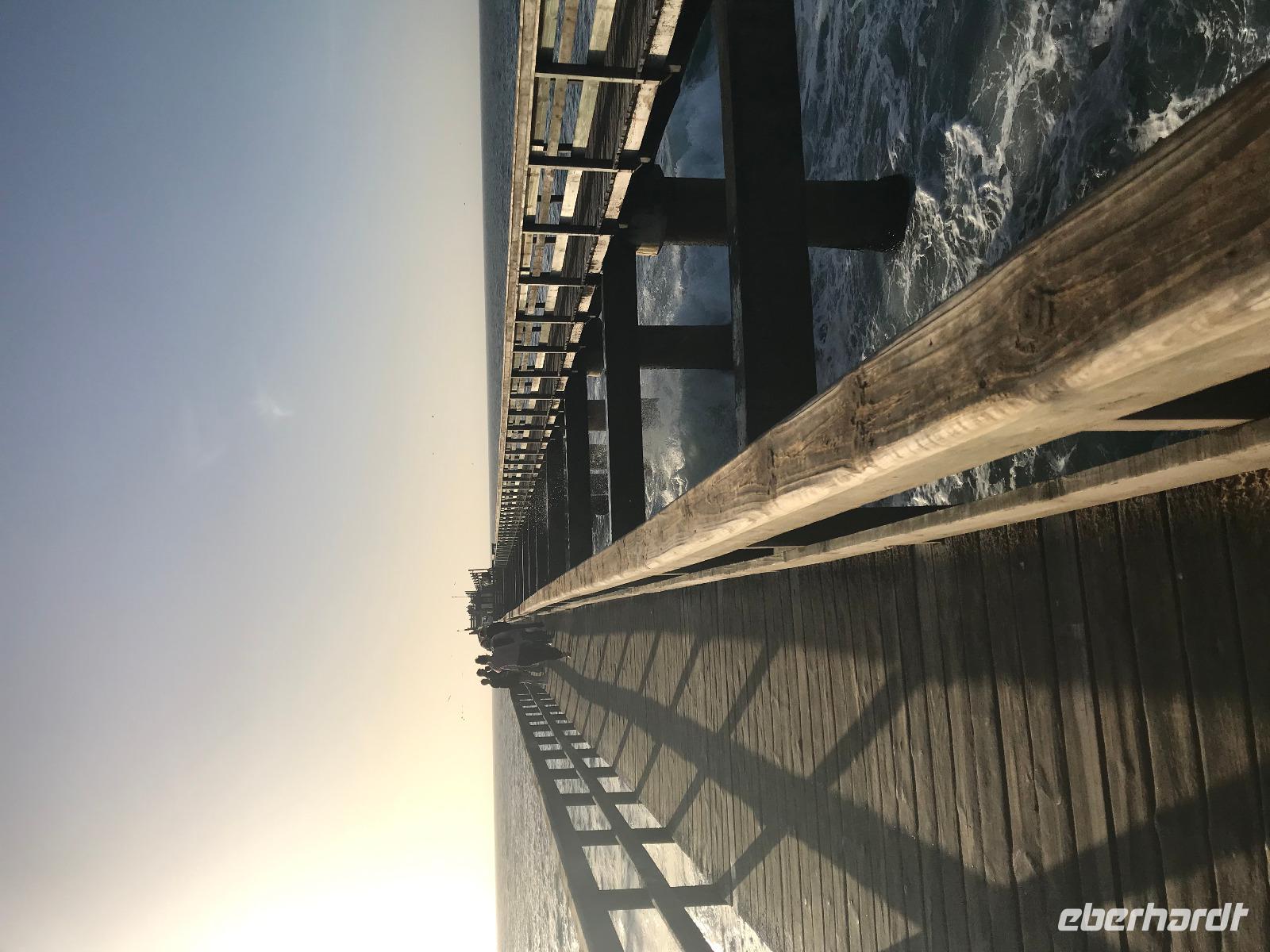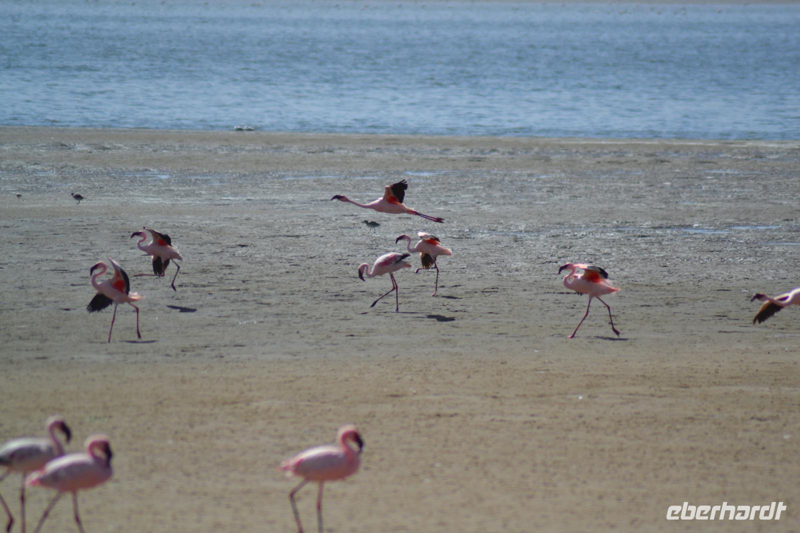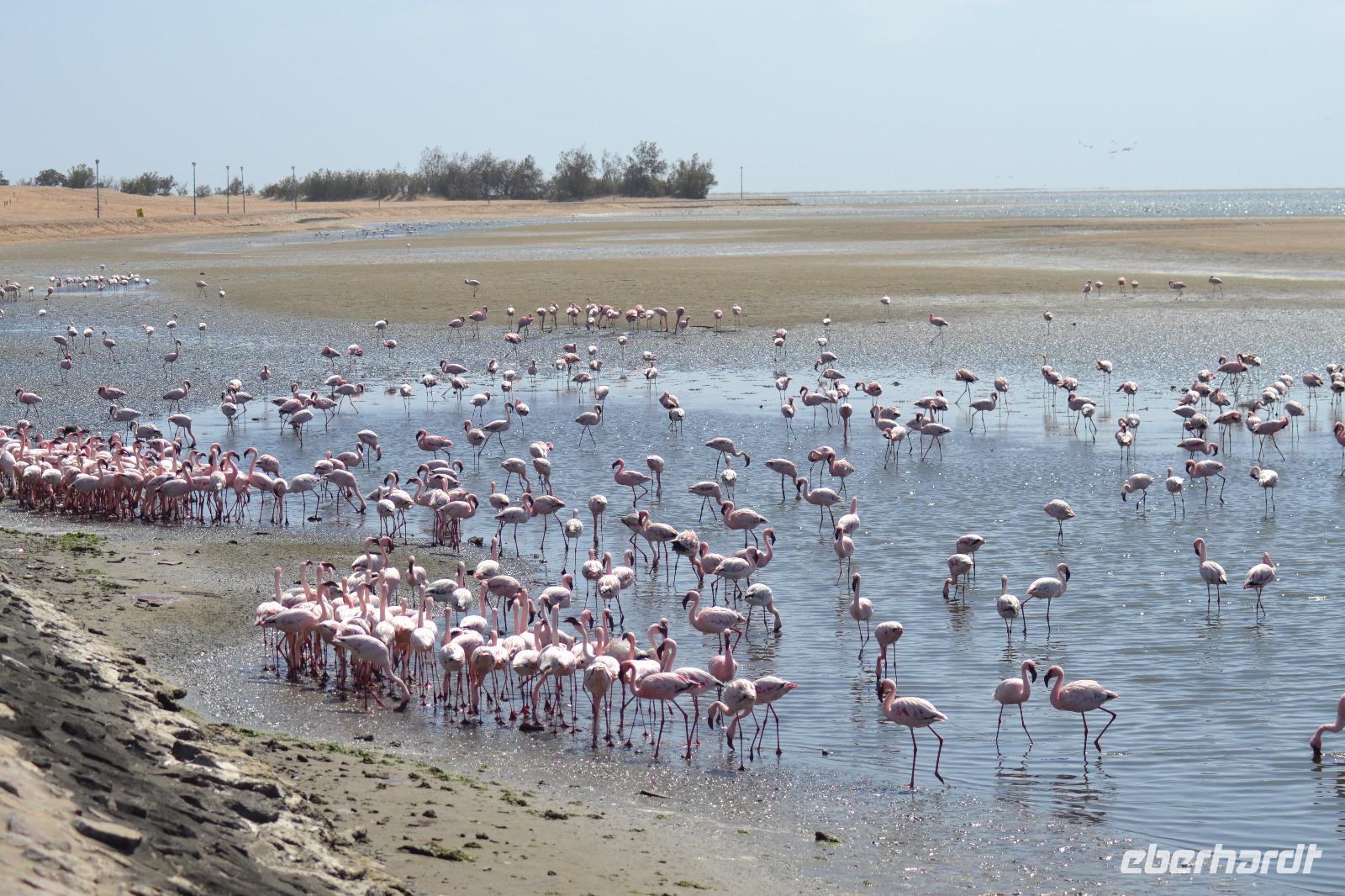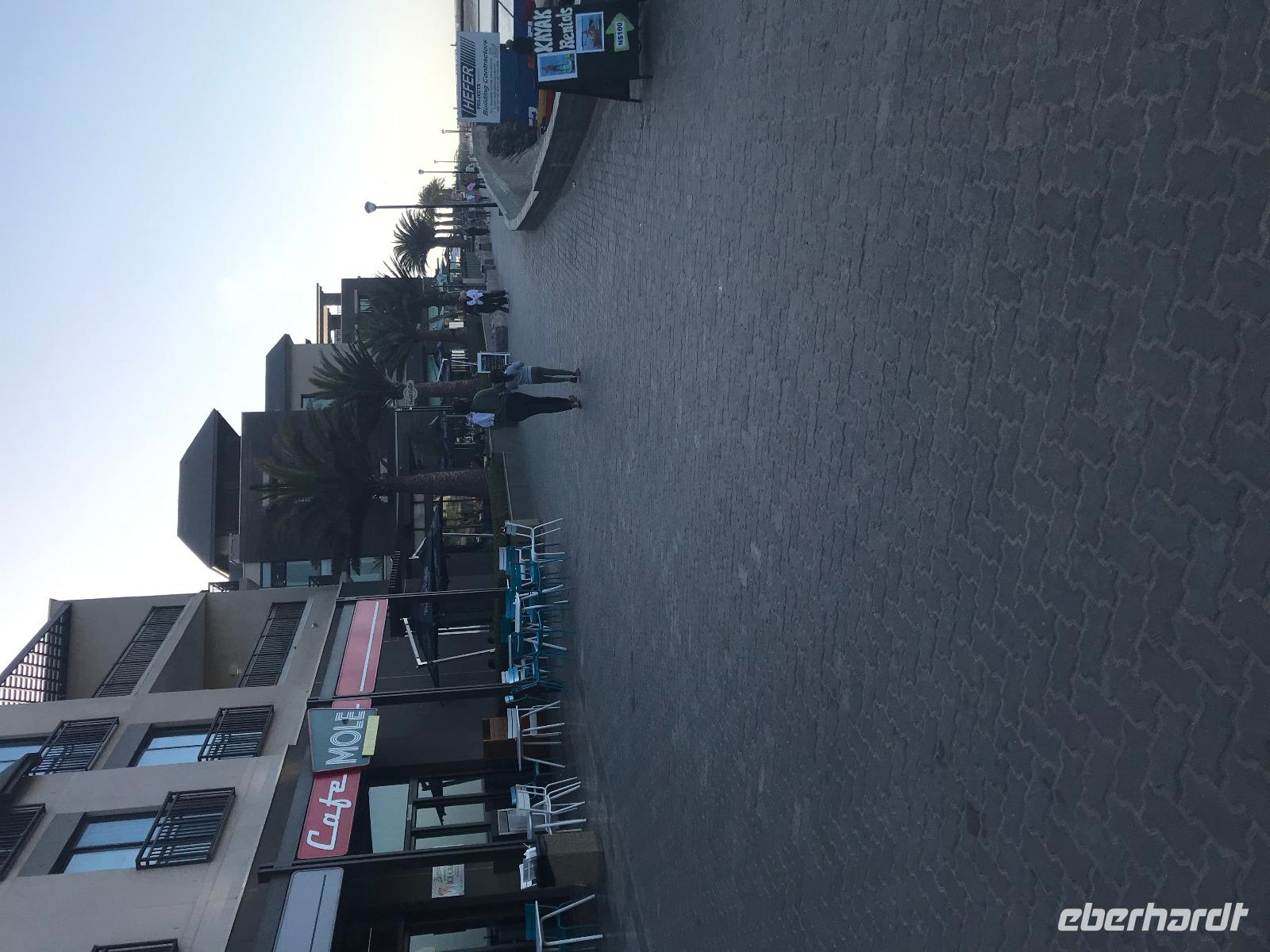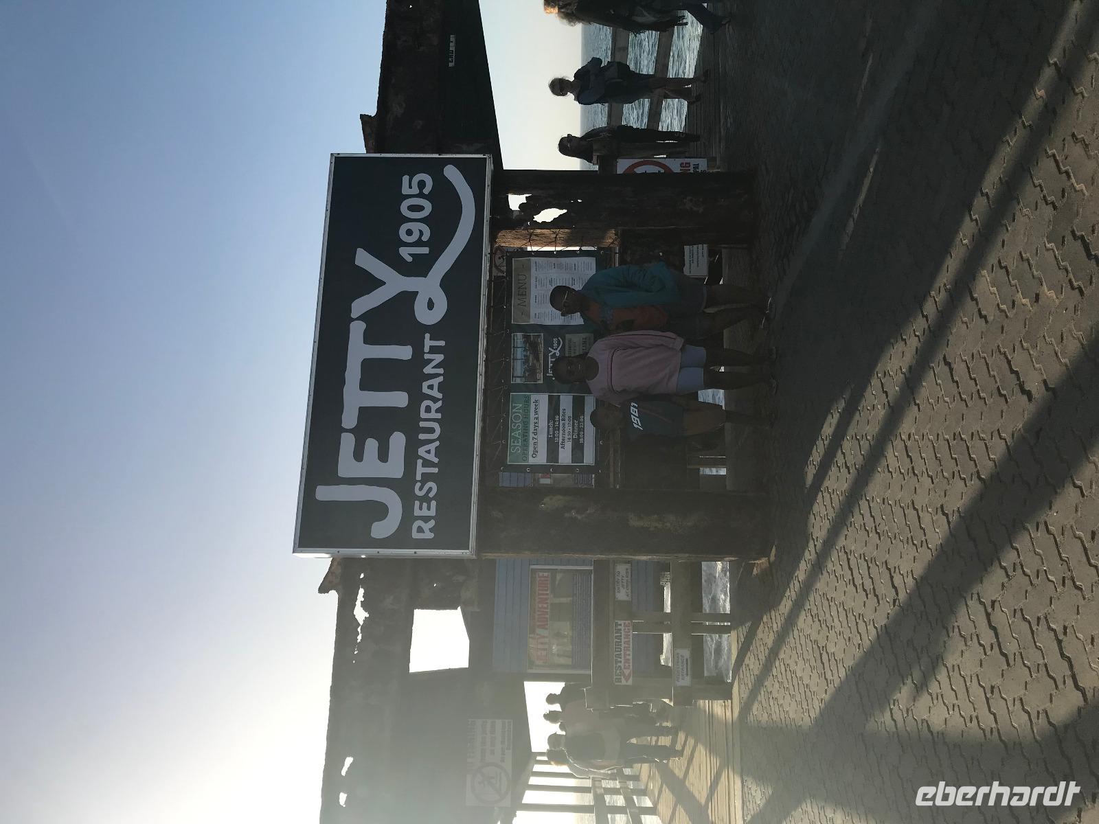 Es war wieder eine kurze Nacht, denn wir fuhren bereits 8 Uhr am Hotel los. Heute stand ein langer Tag im Bus bevor. Auf einer der schlechtesten Straßen Namibias. Nach der ersten längeren Strecke hielten wir in einer Kleinstadt mit nur ca. 80 Einwohnern namens Solitaire. Dort gibt es eine kleine Bäckerei mit europäischen Leckereien. Besonders beliebt ist der frische Apfelkuchen. Auf der ca. 7 stündigen Fahrt durch die Mondlandschaft legten wir unterschiedliche Fotostopps ein. Zunächst am Schild des südlichen Wendekreises des Steinbocks auf dem 23,5 Breitengrad. Auf ihnen steht die Sonne am Mittag zur jeweiligen Sonnenwende im Zenit. Dann fuhren wir über den Gaub Pass bis zum Kuiseb Canyon. Von 1837 bis 1977 hat der Kuiseb River nur 14-mal den Atlantik erreicht. Endlich kühlte es sich ein wenig ab und wir fotografierten den Köcherbaumwald bestehend aus 3 Bäumen. Am Nachmittag trafen wir in der Hafenstadt Walvis Bay ein und sahen die erste AIDA des neuen Jahres im Hafen liegen. An einer Bucht in der Nähe des Hafens tummelten sich tausende von Zwergflamingos die ihr Futter im Wasser fischten. Nach der kurzen Fotopause fuhren wir vorbei am dem neu angelegten Stadtteil Long Beach über die asphaltierte Straße nach Skwakopmund. In dieser Stadt wurde Dagmar geboren. Sie zeigte uns die alten deutschen Gebäude wie das Amtsgericht, die Schule, Hotels, das Bismarck Haus und vieles mehr. Leider blieb uns für die Erkundungstour auf eigene Faust nur wenig Zeit, da uns die Fahrt aus der Wüste zu viel Zeit gekostet hat. Wir erreichten das erst im Frühjahr 2019 eröffnete Hotel Atlantic Garden und machten uns auf den Zimmern frisch. Wir waren vom dem Tag auf der Schotterstraße sehr erschöpft und freuten uns auf das Abendessen. Gemeinsam spazierten wir entlang der Promenade zur Jetty 1905. Das Restaurant liegt auf Seebrücke mit einem traumhaften Ausblick auf das Wasser und den Strand. Wir ließen uns das Essen schmecken und vielen bei angenehmen Temperaturen müde ins Bett.