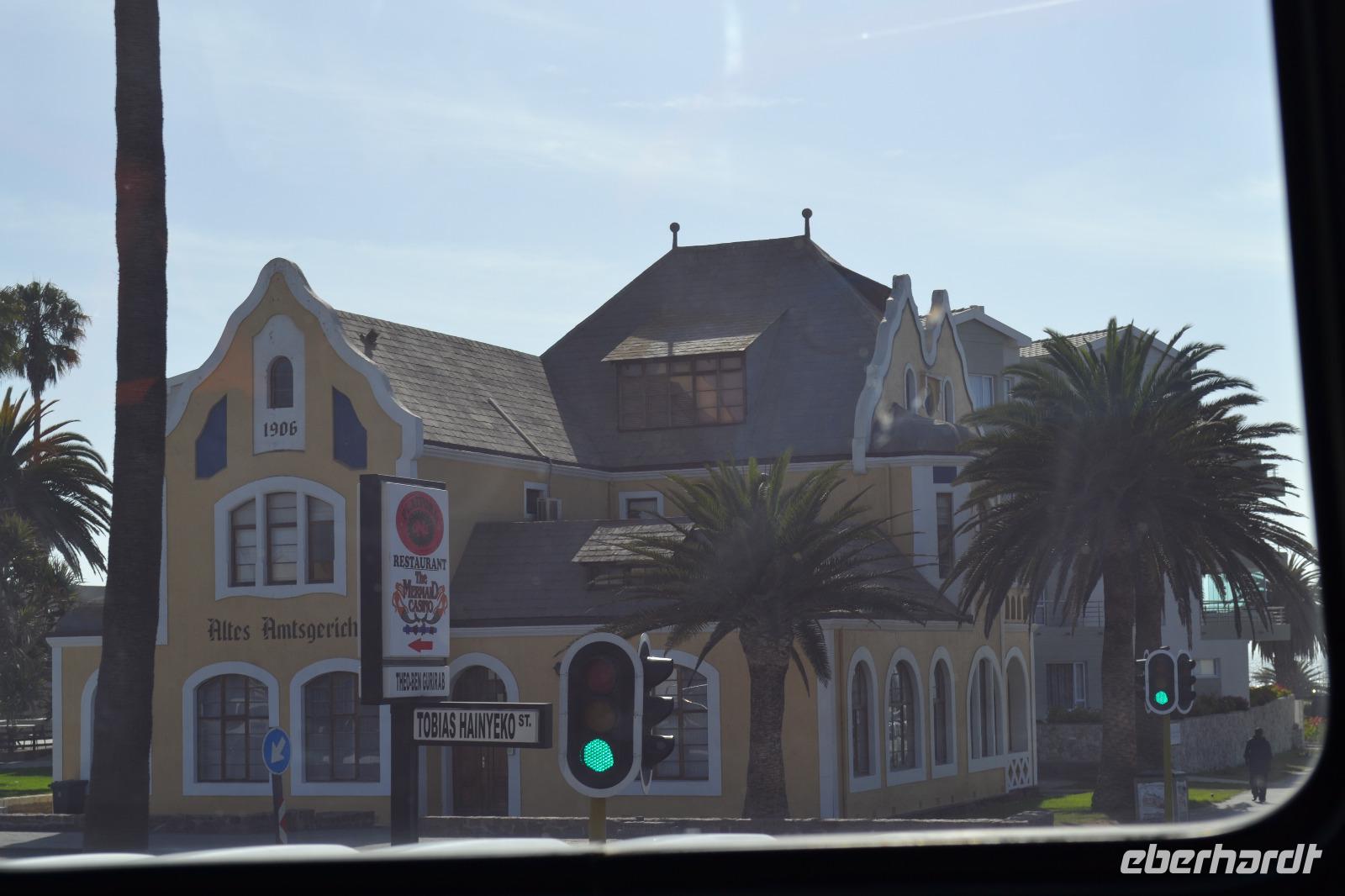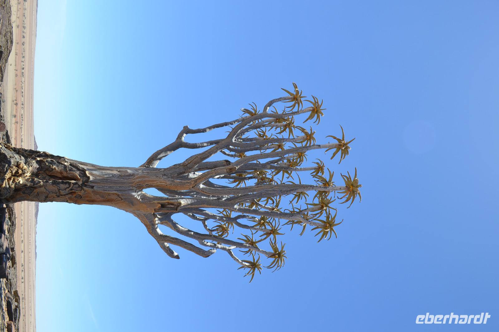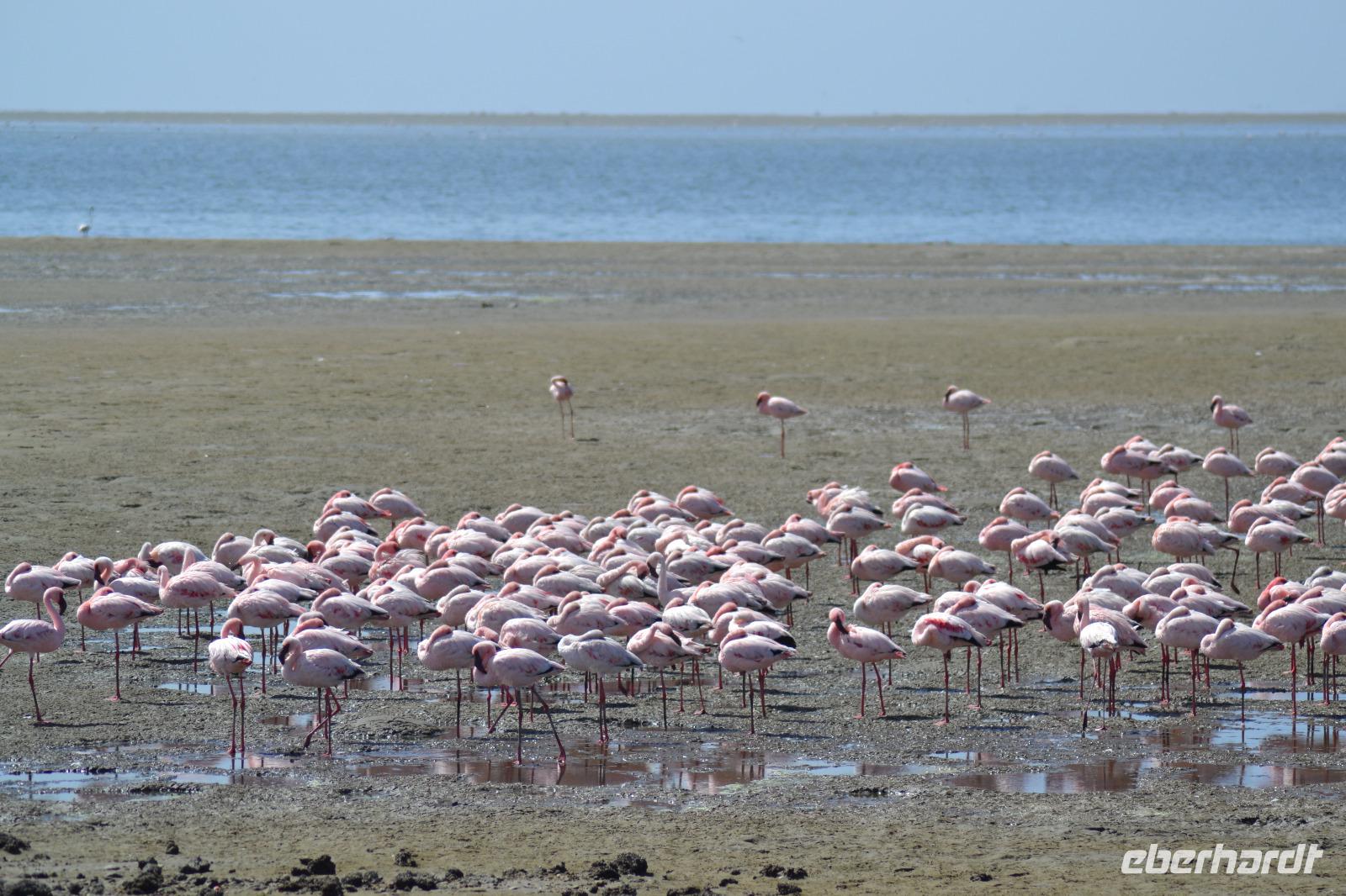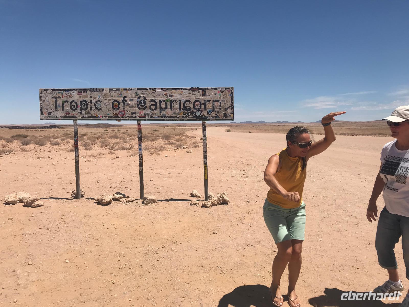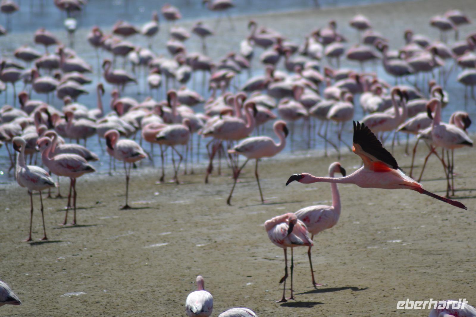 Es war wieder eine kurze Nacht, denn wir fuhren bereits 8 Uhr am Hotel los. Heute stand ein langer Tag im Bus bevor. Auf einer der schlechtesten Straßen Namibias. Nach der ersten längeren Strecke hielten wir in einer Kleinstadt mit nur ca. 80 Einwohnern namens Solitaire. Dort gibt es eine kleine Bäckerei mit europäischen Leckereien. Besonders beliebt ist der frische Apfelkuchen. Auf der ca. 7 stündigen Fahrt durch die Mondlandschaft legten wir unterschiedliche Fotostopps ein. Zunächst am Schild des südlichen Wendekreises des Steinbocks auf dem 23,5 Breitengrad. Auf ihnen steht die Sonne am Mittag zur jeweiligen Sonnenwende im Zenit. Dann fuhren wir über den Gaub Pass bis zum Kuiseb Canyon. Von 1837 bis 1977 hat der Kuiseb River nur 14-mal den Atlantik erreicht. Endlich kühlte es sich ein wenig ab und wir fotografierten den Köcherbaumwald bestehend aus 3 Bäumen. Am Nachmittag trafen wir in der Hafenstadt Walvis Bay ein und sahen die erste AIDA des neuen Jahres im Hafen liegen. An einer Bucht in der Nähe des Hafens tummelten sich tausende von Zwergflamingos die ihr Futter im Wasser fischten. Nach der kurzen Fotopause fuhren wir vorbei am dem neu angelegten Stadtteil Long Beach über die asphaltierte Straße nach Skwakopmund. In dieser Stadt wurde Dagmar geboren. Sie zeigte uns die alten deutschen Gebäude wie das Amtsgericht, die Schule, Hotels, das Bismarck Haus und vieles mehr. Leider blieb uns für die Erkundungstour auf eigene Faust nur wenig Zeit, da uns die Fahrt aus der Wüste zu viel Zeit gekostet hat. Wir erreichten das erst im Frühjahr 2019 eröffnete Hotel Atlantic Garden und machten uns auf den Zimmern frisch. Wir waren vom dem Tag auf der Schotterstraße sehr erschöpft und freuten uns auf das Abendessen. Gemeinsam spazierten wir entlang der Promenade zur Jetty 1905. Das Restaurant liegt auf Seebrücke mit einem traumhaften Ausblick auf das Wasser und den Strand. Wir ließen uns das Essen schmecken und vielen bei angenehmen Temperaturen müde ins Bett.