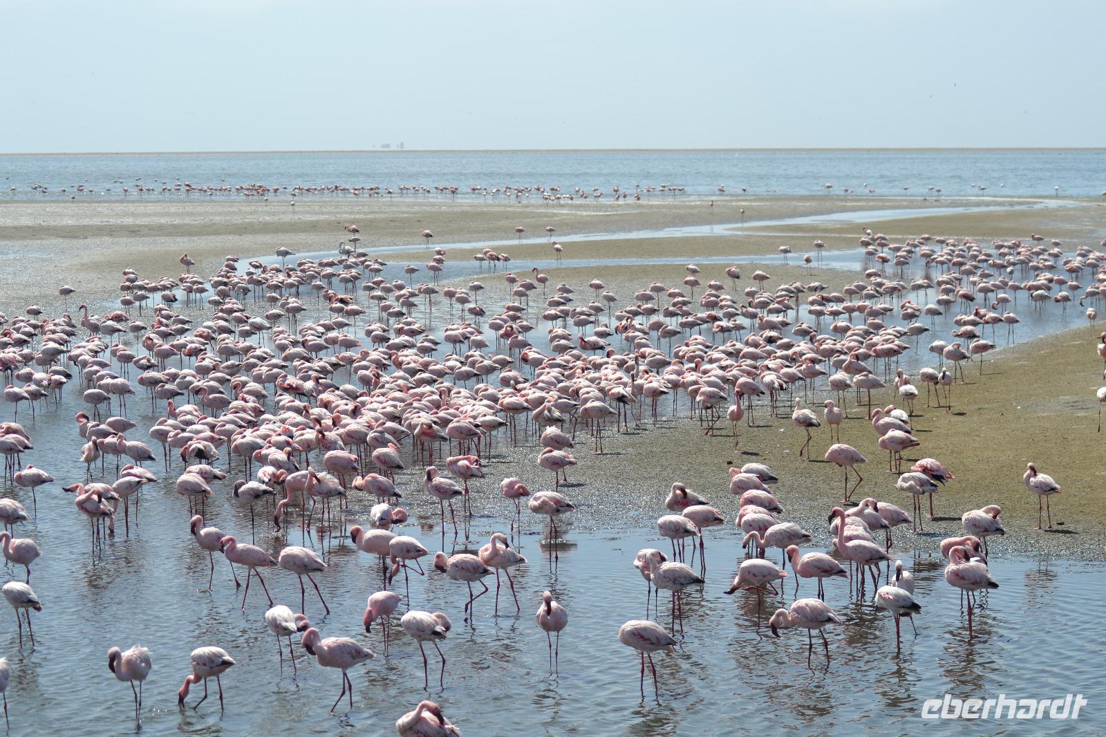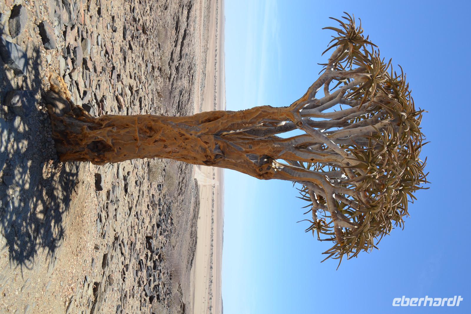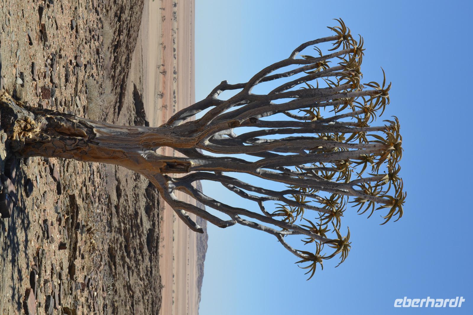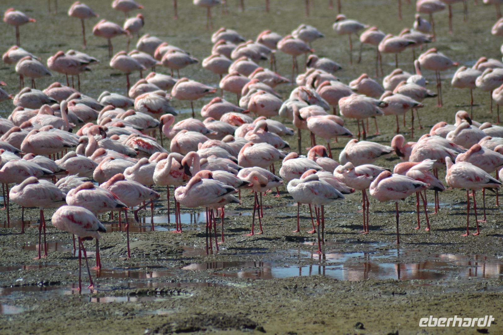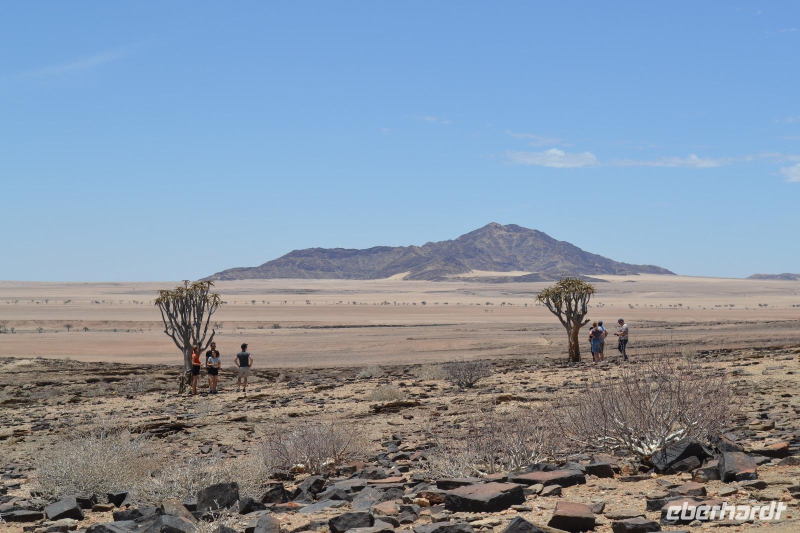 Es war wieder eine kurze Nacht, denn wir fuhren bereits 8 Uhr am Hotel los. Heute stand ein langer Tag im Bus bevor. Auf einer der schlechtesten Straßen Namibias. Nach der ersten längeren Strecke hielten wir in einer Kleinstadt mit nur ca. 80 Einwohnern namens Solitaire. Dort gibt es eine kleine Bäckerei mit europäischen Leckereien. Besonders beliebt ist der frische Apfelkuchen. Auf der ca. 7 stündigen Fahrt durch die Mondlandschaft legten wir unterschiedliche Fotostopps ein. Zunächst am Schild des südlichen Wendekreises des Steinbocks auf dem 23,5 Breitengrad. Auf ihnen steht die Sonne am Mittag zur jeweiligen Sonnenwende im Zenit. Dann fuhren wir über den Gaub Pass bis zum Kuiseb Canyon. Von 1837 bis 1977 hat der Kuiseb River nur 14-mal den Atlantik erreicht. Endlich kühlte es sich ein wenig ab und wir fotografierten den Köcherbaumwald bestehend aus 3 Bäumen. Am Nachmittag trafen wir in der Hafenstadt Walvis Bay ein und sahen die erste AIDA des neuen Jahres im Hafen liegen. An einer Bucht in der Nähe des Hafens tummelten sich tausende von Zwergflamingos die ihr Futter im Wasser fischten. Nach der kurzen Fotopause fuhren wir vorbei am dem neu angelegten Stadtteil Long Beach über die asphaltierte Straße nach Skwakopmund. In dieser Stadt wurde Dagmar geboren. Sie zeigte uns die alten deutschen Gebäude wie das Amtsgericht, die Schule, Hotels, das Bismarck Haus und vieles mehr. Leider blieb uns für die Erkundungstour auf eigene Faust nur wenig Zeit, da uns die Fahrt aus der Wüste zu viel Zeit gekostet hat. Wir erreichten das erst im Frühjahr 2019 eröffnete Hotel Atlantic Garden und machten uns auf den Zimmern frisch. Wir waren vom dem Tag auf der Schotterstraße sehr erschöpft und freuten uns auf das Abendessen. Gemeinsam spazierten wir entlang der Promenade zur Jetty 1905. Das Restaurant liegt auf Seebrücke mit einem traumhaften Ausblick auf das Wasser und den Strand. Wir ließen uns das Essen schmecken und vielen bei angenehmen Temperaturen müde ins Bett.