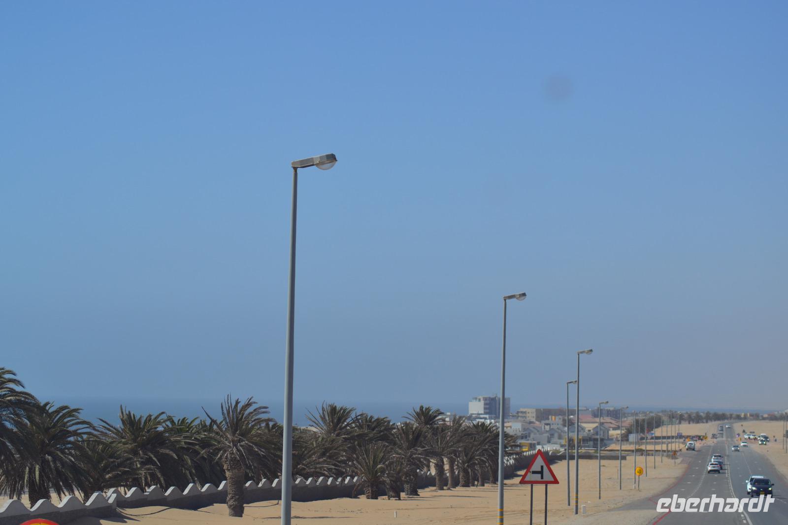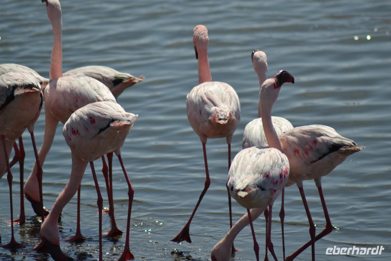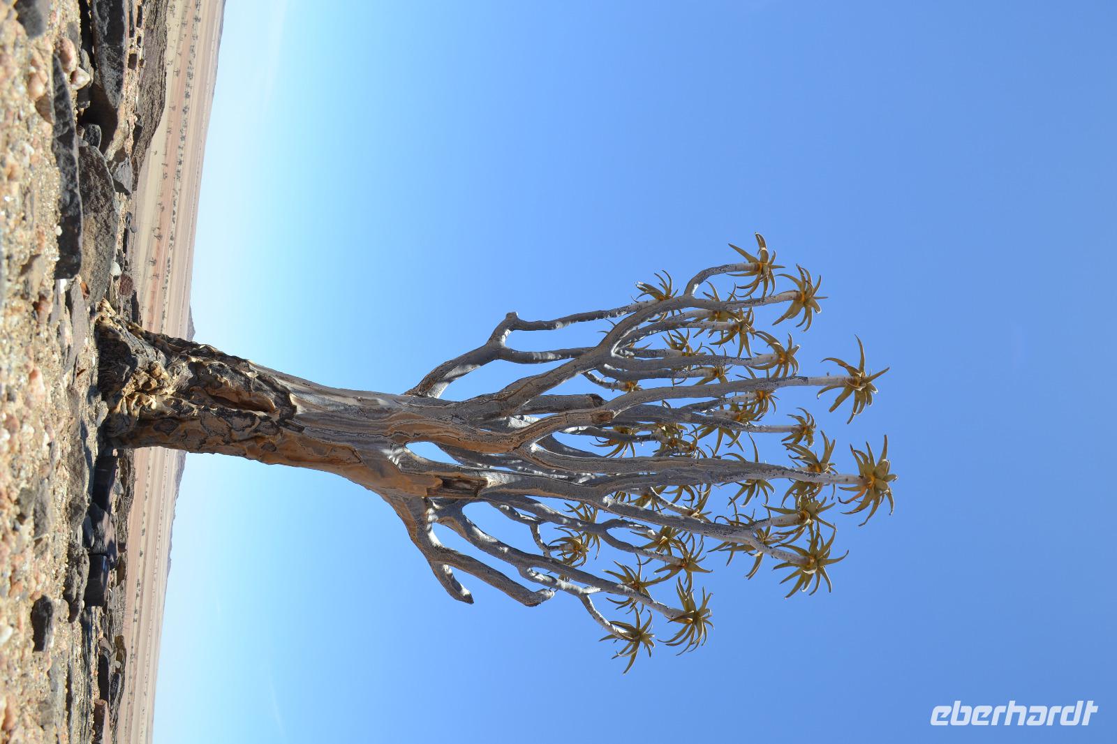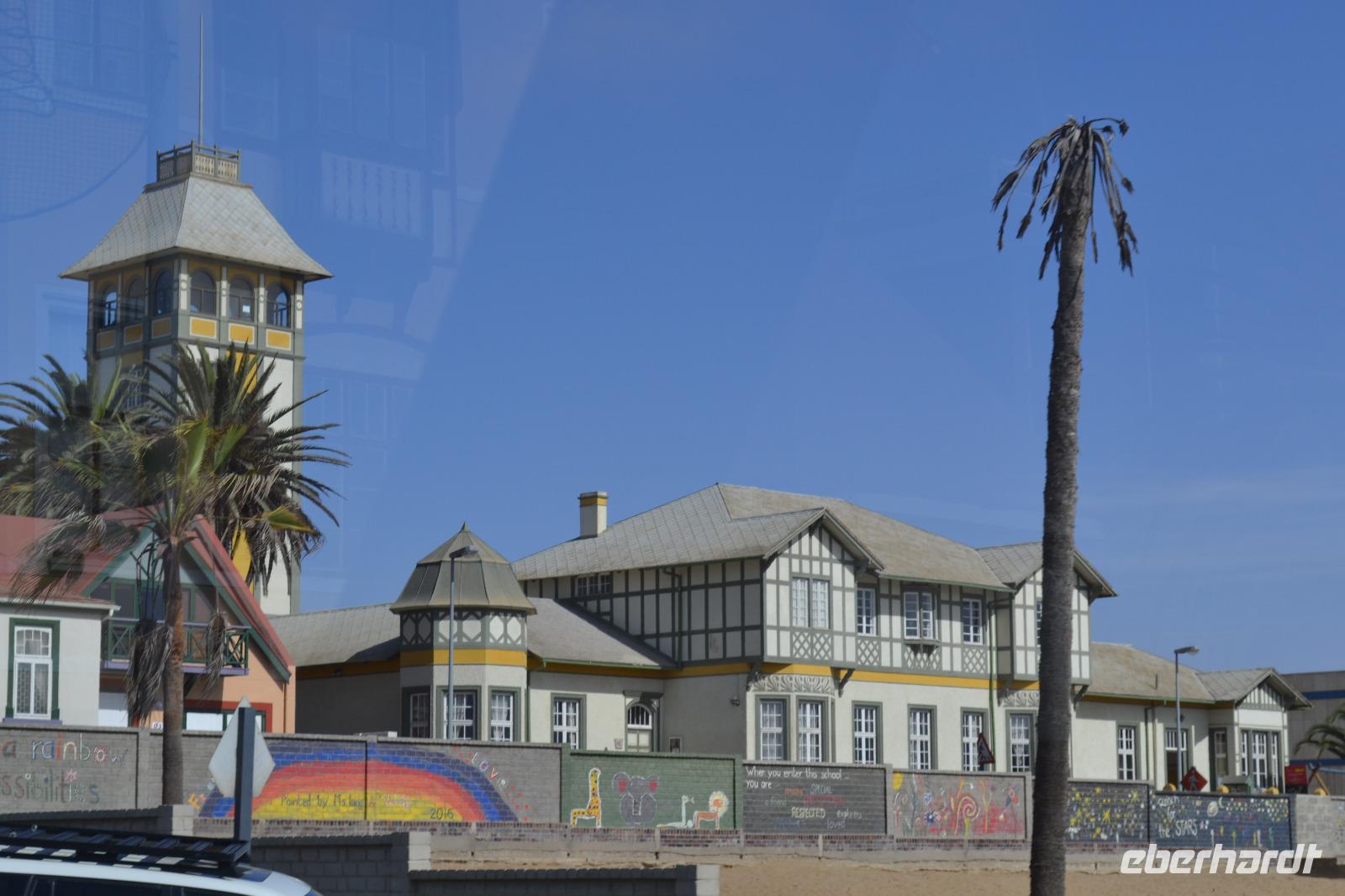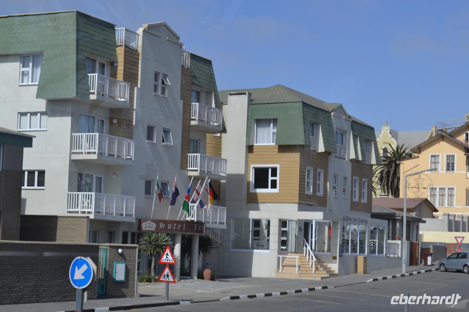 Es war wieder eine kurze Nacht, denn wir fuhren bereits 8 Uhr am Hotel los. Heute stand ein langer Tag im Bus bevor. Auf einer der schlechtesten Straßen Namibias. Nach der ersten längeren Strecke hielten wir in einer Kleinstadt mit nur ca. 80 Einwohnern namens Solitaire. Dort gibt es eine kleine Bäckerei mit europäischen Leckereien. Besonders beliebt ist der frische Apfelkuchen. Auf der ca. 7 stündigen Fahrt durch die Mondlandschaft legten wir unterschiedliche Fotostopps ein. Zunächst am Schild des südlichen Wendekreises des Steinbocks auf dem 23,5 Breitengrad. Auf ihnen steht die Sonne am Mittag zur jeweiligen Sonnenwende im Zenit. Dann fuhren wir über den Gaub Pass bis zum Kuiseb Canyon. Von 1837 bis 1977 hat der Kuiseb River nur 14-mal den Atlantik erreicht. Endlich kühlte es sich ein wenig ab und wir fotografierten den Köcherbaumwald bestehend aus 3 Bäumen. Am Nachmittag trafen wir in der Hafenstadt Walvis Bay ein und sahen die erste AIDA des neuen Jahres im Hafen liegen. An einer Bucht in der Nähe des Hafens tummelten sich tausende von Zwergflamingos die ihr Futter im Wasser fischten. Nach der kurzen Fotopause fuhren wir vorbei am dem neu angelegten Stadtteil Long Beach über die asphaltierte Straße nach Skwakopmund. In dieser Stadt wurde Dagmar geboren. Sie zeigte uns die alten deutschen Gebäude wie das Amtsgericht, die Schule, Hotels, das Bismarck Haus und vieles mehr. Leider blieb uns für die Erkundungstour auf eigene Faust nur wenig Zeit, da uns die Fahrt aus der Wüste zu viel Zeit gekostet hat. Wir erreichten das erst im Frühjahr 2019 eröffnete Hotel Atlantic Garden und machten uns auf den Zimmern frisch. Wir waren vom dem Tag auf der Schotterstraße sehr erschöpft und freuten uns auf das Abendessen. Gemeinsam spazierten wir entlang der Promenade zur Jetty 1905. Das Restaurant liegt auf Seebrücke mit einem traumhaften Ausblick auf das Wasser und den Strand. Wir ließen uns das Essen schmecken und vielen bei angenehmen Temperaturen müde ins Bett.