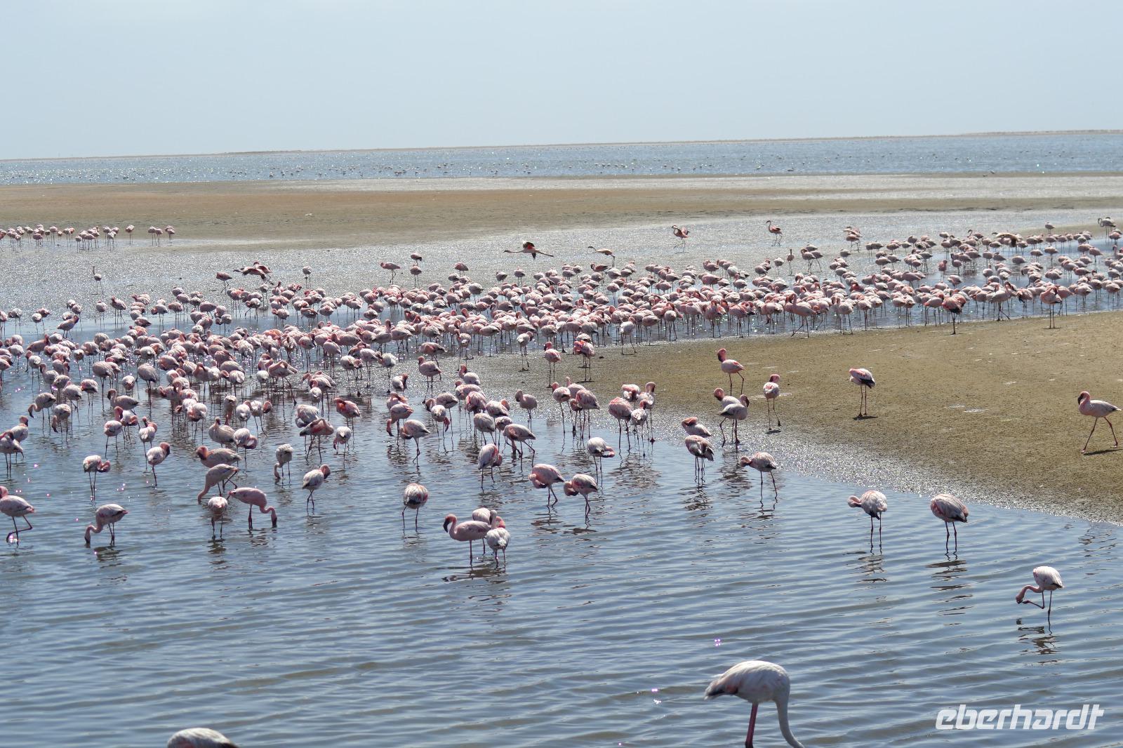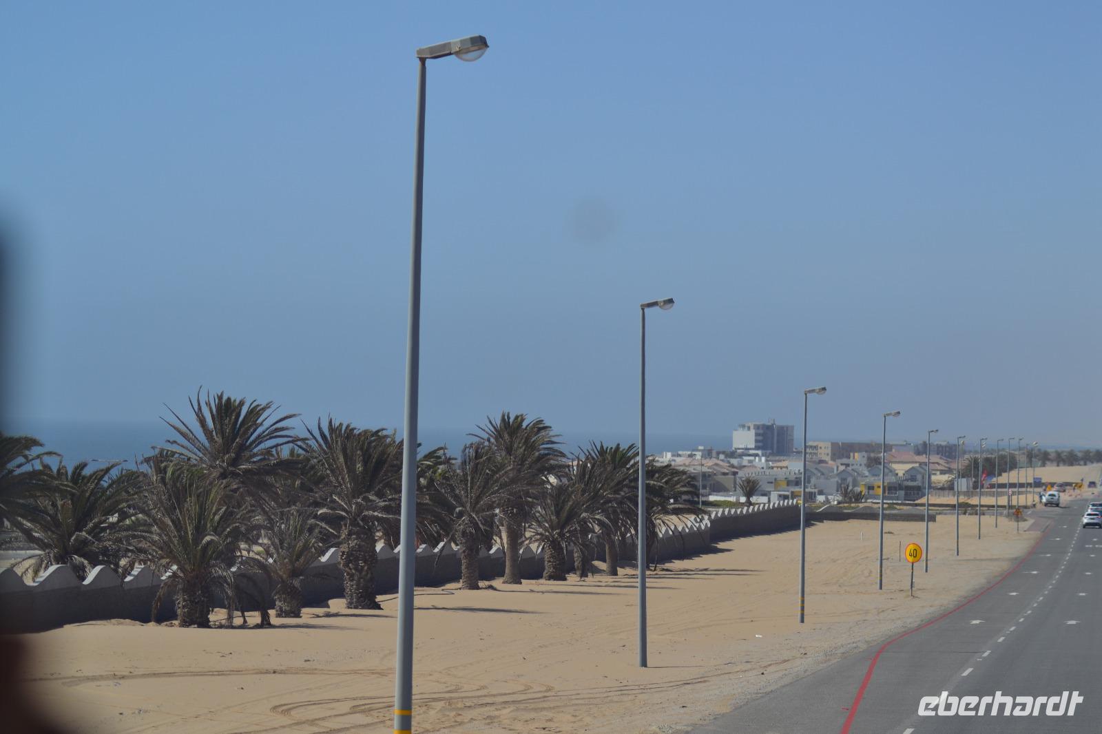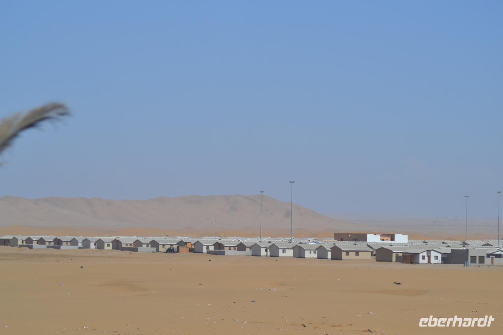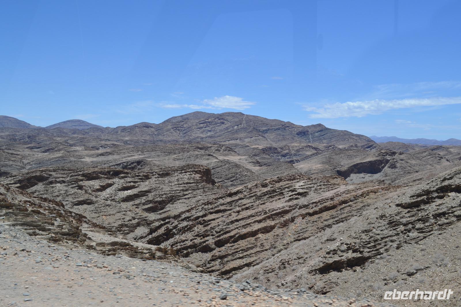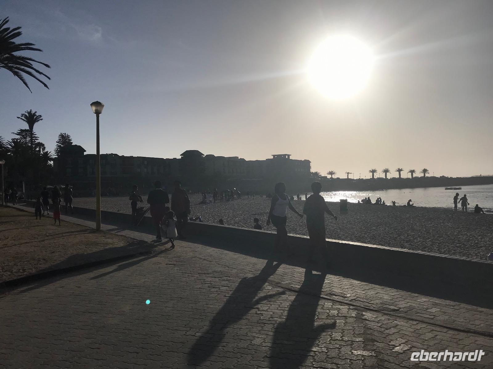 Es war wieder eine kurze Nacht, denn wir fuhren bereits 8 Uhr am Hotel los. Heute stand ein langer Tag im Bus bevor. Auf einer der schlechtesten Straßen Namibias. Nach der ersten längeren Strecke hielten wir in einer Kleinstadt mit nur ca. 80 Einwohnern namens Solitaire. Dort gibt es eine kleine Bäckerei mit europäischen Leckereien. Besonders beliebt ist der frische Apfelkuchen. Auf der ca. 7 stündigen Fahrt durch die Mondlandschaft legten wir unterschiedliche Fotostopps ein. Zunächst am Schild des südlichen Wendekreises des Steinbocks auf dem 23,5 Breitengrad. Auf ihnen steht die Sonne am Mittag zur jeweiligen Sonnenwende im Zenit. Dann fuhren wir über den Gaub Pass bis zum Kuiseb Canyon. Von 1837 bis 1977 hat der Kuiseb River nur 14-mal den Atlantik erreicht. Endlich kühlte es sich ein wenig ab und wir fotografierten den Köcherbaumwald bestehend aus 3 Bäumen. Am Nachmittag trafen wir in der Hafenstadt Walvis Bay ein und sahen die erste AIDA des neuen Jahres im Hafen liegen. An einer Bucht in der Nähe des Hafens tummelten sich tausende von Zwergflamingos die ihr Futter im Wasser fischten. Nach der kurzen Fotopause fuhren wir vorbei am dem neu angelegten Stadtteil Long Beach über die asphaltierte Straße nach Skwakopmund. In dieser Stadt wurde Dagmar geboren. Sie zeigte uns die alten deutschen Gebäude wie das Amtsgericht, die Schule, Hotels, das Bismarck Haus und vieles mehr. Leider blieb uns für die Erkundungstour auf eigene Faust nur wenig Zeit, da uns die Fahrt aus der Wüste zu viel Zeit gekostet hat. Wir erreichten das erst im Frühjahr 2019 eröffnete Hotel Atlantic Garden und machten uns auf den Zimmern frisch. Wir waren vom dem Tag auf der Schotterstraße sehr erschöpft und freuten uns auf das Abendessen. Gemeinsam spazierten wir entlang der Promenade zur Jetty 1905. Das Restaurant liegt auf Seebrücke mit einem traumhaften Ausblick auf das Wasser und den Strand. Wir ließen uns das Essen schmecken und vielen bei angenehmen Temperaturen müde ins Bett.