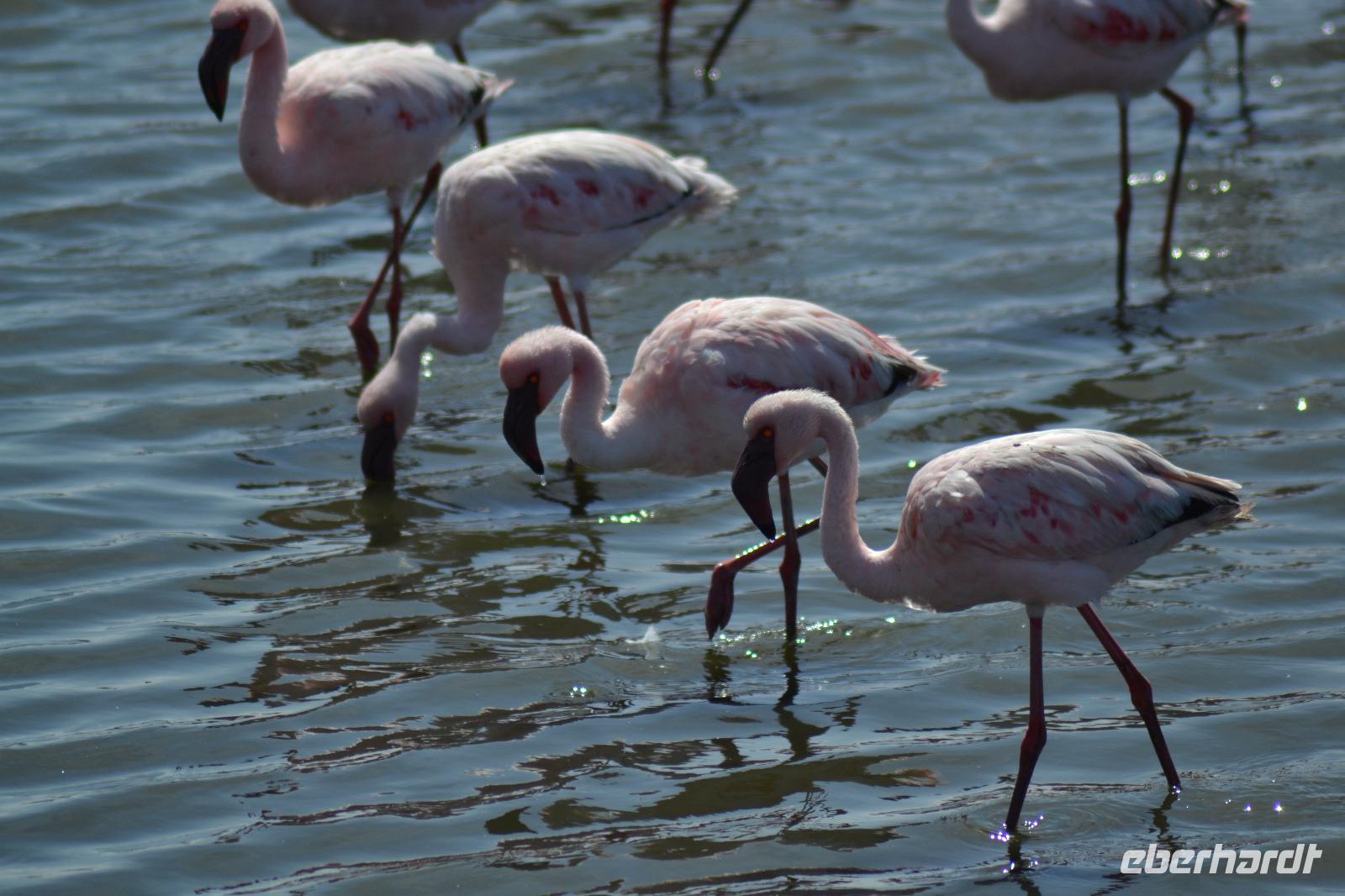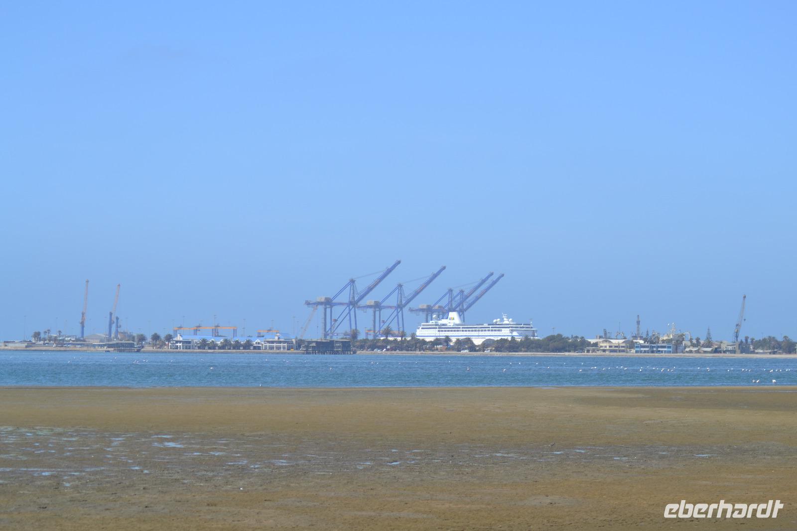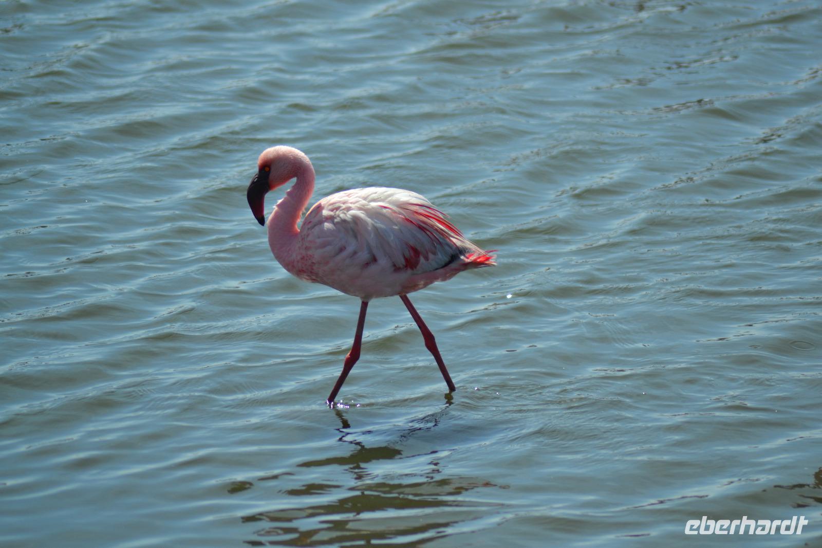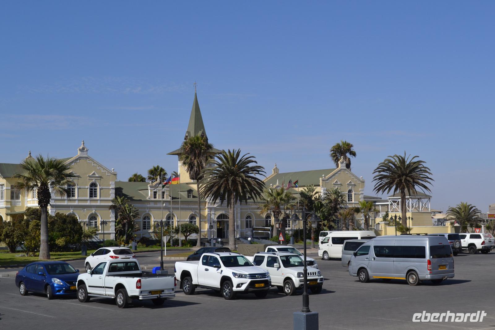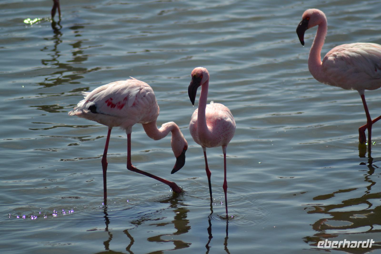 Es war wieder eine kurze Nacht, denn wir fuhren bereits 8 Uhr am Hotel los. Heute stand ein langer Tag im Bus bevor. Auf einer der schlechtesten Straßen Namibias. Nach der ersten längeren Strecke hielten wir in einer Kleinstadt mit nur ca. 80 Einwohnern namens Solitaire. Dort gibt es eine kleine Bäckerei mit europäischen Leckereien. Besonders beliebt ist der frische Apfelkuchen. Auf der ca. 7 stündigen Fahrt durch die Mondlandschaft legten wir unterschiedliche Fotostopps ein. Zunächst am Schild des südlichen Wendekreises des Steinbocks auf dem 23,5 Breitengrad. Auf ihnen steht die Sonne am Mittag zur jeweiligen Sonnenwende im Zenit. Dann fuhren wir über den Gaub Pass bis zum Kuiseb Canyon. Von 1837 bis 1977 hat der Kuiseb River nur 14-mal den Atlantik erreicht. Endlich kühlte es sich ein wenig ab und wir fotografierten den Köcherbaumwald bestehend aus 3 Bäumen. Am Nachmittag trafen wir in der Hafenstadt Walvis Bay ein und sahen die erste AIDA des neuen Jahres im Hafen liegen. An einer Bucht in der Nähe des Hafens tummelten sich tausende von Zwergflamingos die ihr Futter im Wasser fischten. Nach der kurzen Fotopause fuhren wir vorbei am dem neu angelegten Stadtteil Long Beach über die asphaltierte Straße nach Skwakopmund. In dieser Stadt wurde Dagmar geboren. Sie zeigte uns die alten deutschen Gebäude wie das Amtsgericht, die Schule, Hotels, das Bismarck Haus und vieles mehr. Leider blieb uns für die Erkundungstour auf eigene Faust nur wenig Zeit, da uns die Fahrt aus der Wüste zu viel Zeit gekostet hat. Wir erreichten das erst im Frühjahr 2019 eröffnete Hotel Atlantic Garden und machten uns auf den Zimmern frisch. Wir waren vom dem Tag auf der Schotterstraße sehr erschöpft und freuten uns auf das Abendessen. Gemeinsam spazierten wir entlang der Promenade zur Jetty 1905. Das Restaurant liegt auf Seebrücke mit einem traumhaften Ausblick auf das Wasser und den Strand. Wir ließen uns das Essen schmecken und vielen bei angenehmen Temperaturen müde ins Bett.