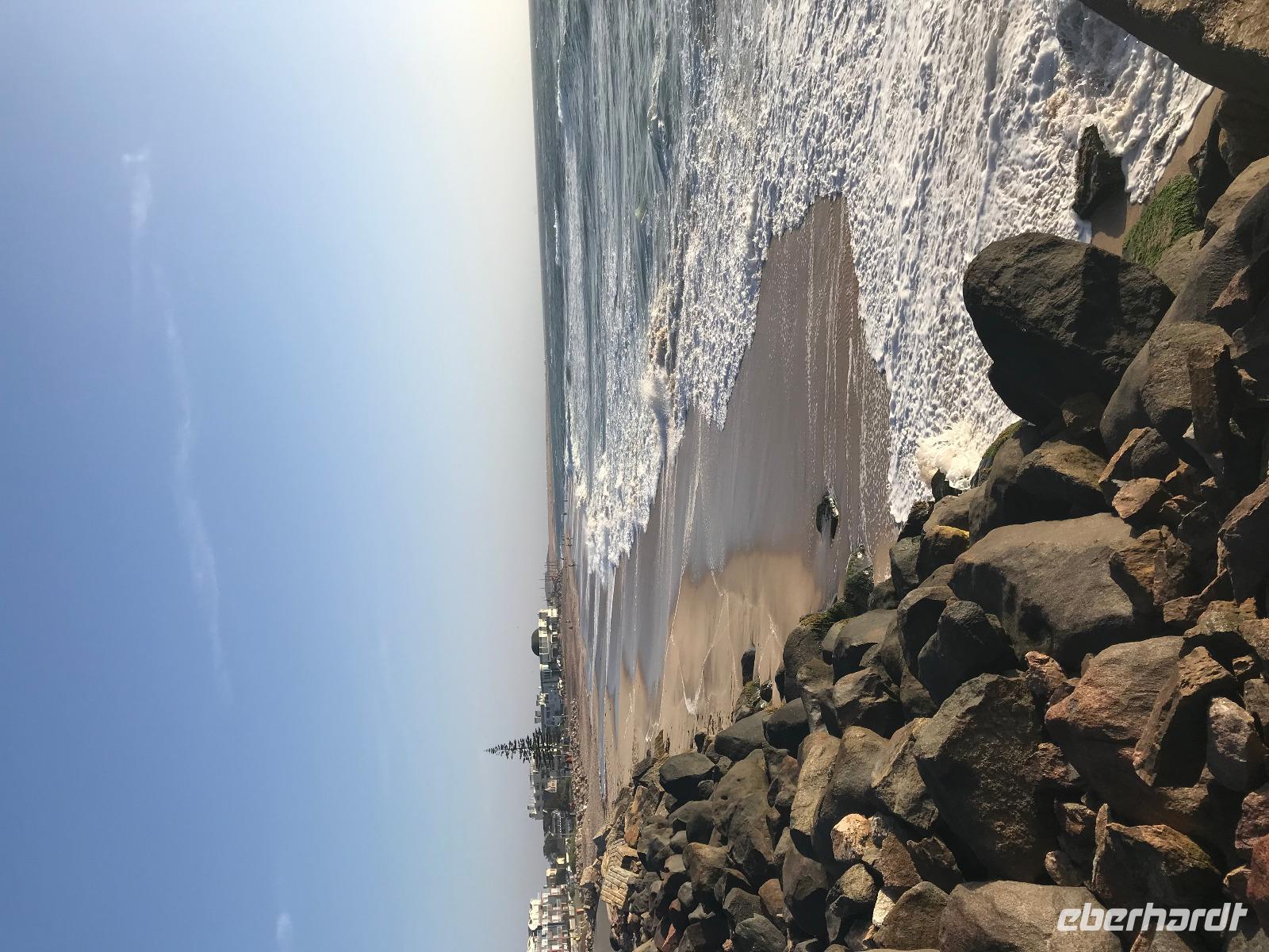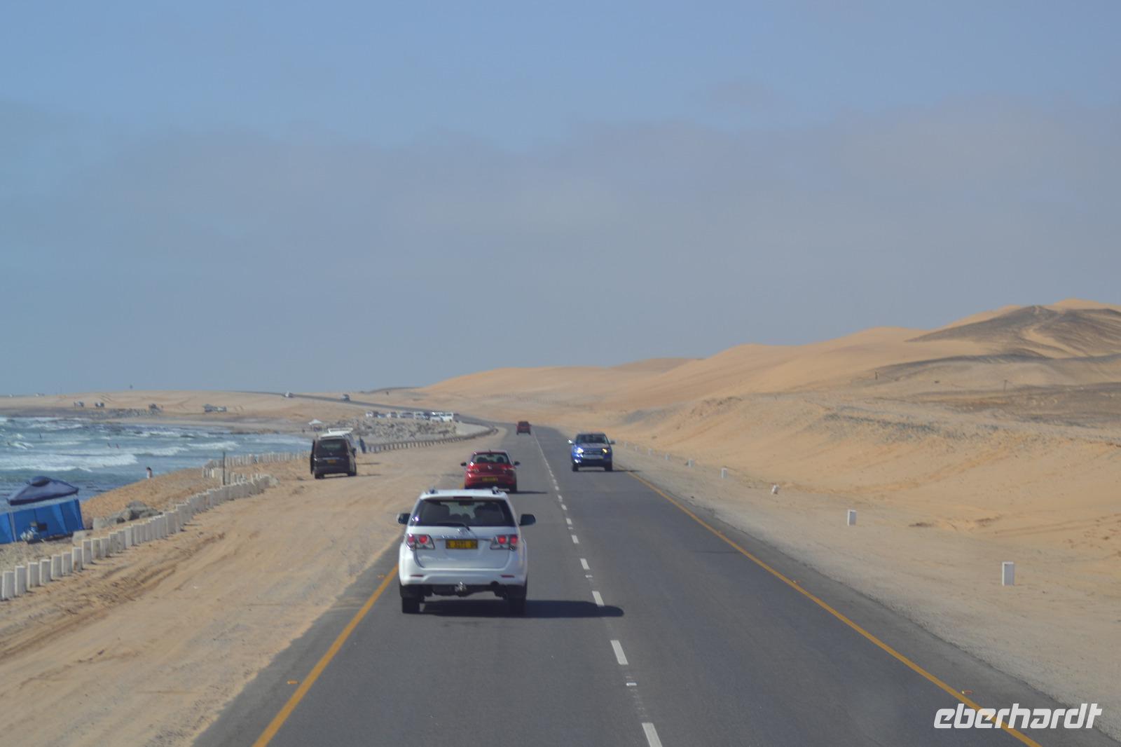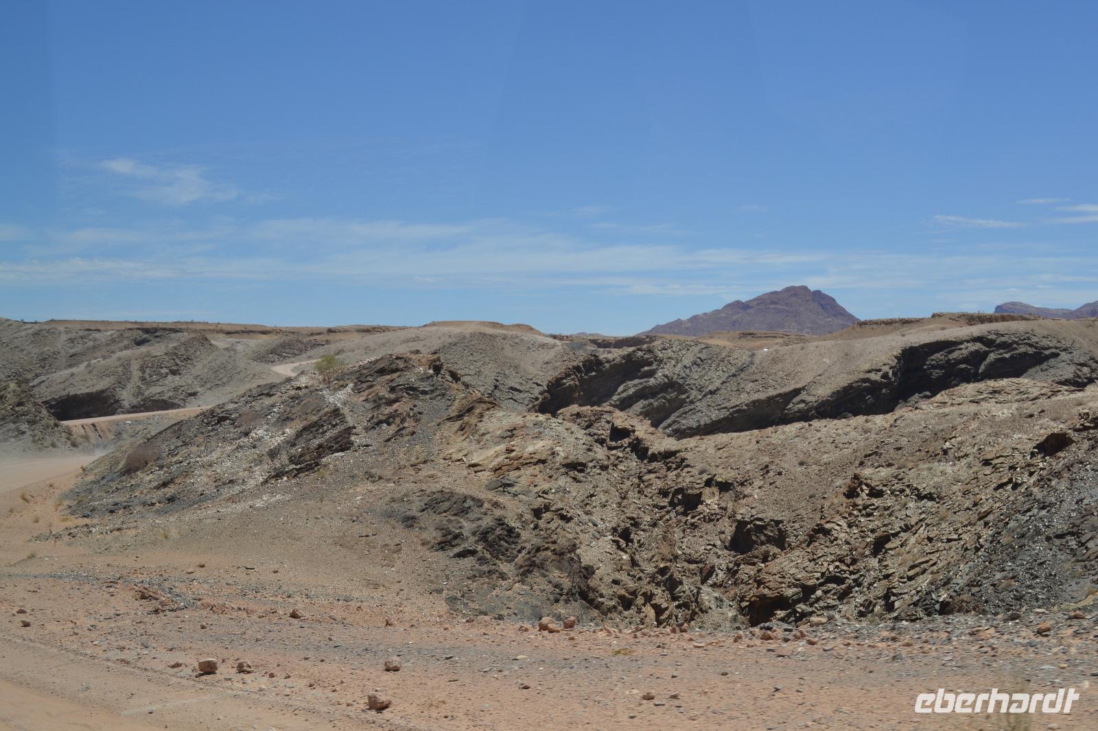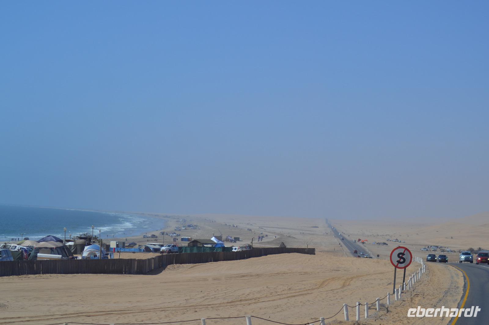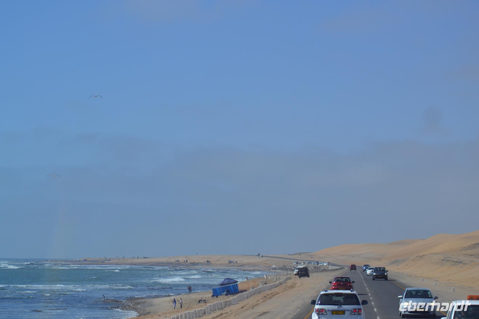Es war wieder eine kurze Nacht, denn wir fuhren bereits 8 Uhr am Hotel los. Heute stand ein langer Tag im Bus bevor. Auf einer der schlechtesten Straßen Namibias. Nach der ersten längeren Strecke hielten wir in einer Kleinstadt mit nur ca. 80 Einwohnern namens Solitaire. Dort gibt es eine kleine Bäckerei mit europäischen Leckereien. Besonders beliebt ist der frische Apfelkuchen. Auf der ca. 7 stündigen Fahrt durch die Mondlandschaft legten wir unterschiedliche Fotostopps ein. Zunächst am Schild des südlichen Wendekreises des Steinbocks auf dem 23,5 Breitengrad. Auf ihnen steht die Sonne am Mittag zur jeweiligen Sonnenwende im Zenit. Dann fuhren wir über den Gaub Pass bis zum Kuiseb Canyon. Von 1837 bis 1977 hat der Kuiseb River nur 14-mal den Atlantik erreicht. Endlich kühlte es sich ein wenig ab und wir fotografierten den Köcherbaumwald bestehend aus 3 Bäumen. Am Nachmittag trafen wir in der Hafenstadt Walvis Bay ein und sahen die erste AIDA des neuen Jahres im Hafen liegen. An einer Bucht in der Nähe des Hafens tummelten sich tausende von Zwergflamingos die ihr Futter im Wasser fischten. Nach der kurzen Fotopause fuhren wir vorbei am dem neu angelegten Stadtteil Long Beach über die asphaltierte Straße nach Skwakopmund. In dieser Stadt wurde Dagmar geboren. Sie zeigte uns die alten deutschen Gebäude wie das Amtsgericht, die Schule, Hotels, das Bismarck Haus und vieles mehr. Leider blieb uns für die Erkundungstour auf eigene Faust nur wenig Zeit, da uns die Fahrt aus der Wüste zu viel Zeit gekostet hat. Wir erreichten das erst im Frühjahr 2019 eröffnete Hotel Atlantic Garden und machten uns auf den Zimmern frisch. Wir waren vom dem Tag auf der Schotterstraße sehr erschöpft und freuten uns auf das Abendessen. Gemeinsam spazierten wir entlang der Promenade zur Jetty 1905. Das Restaurant liegt auf Seebrücke mit einem traumhaften Ausblick auf das Wasser und den Strand. Wir ließen uns das Essen schmecken und vielen bei angenehmen Temperaturen müde ins Bett.