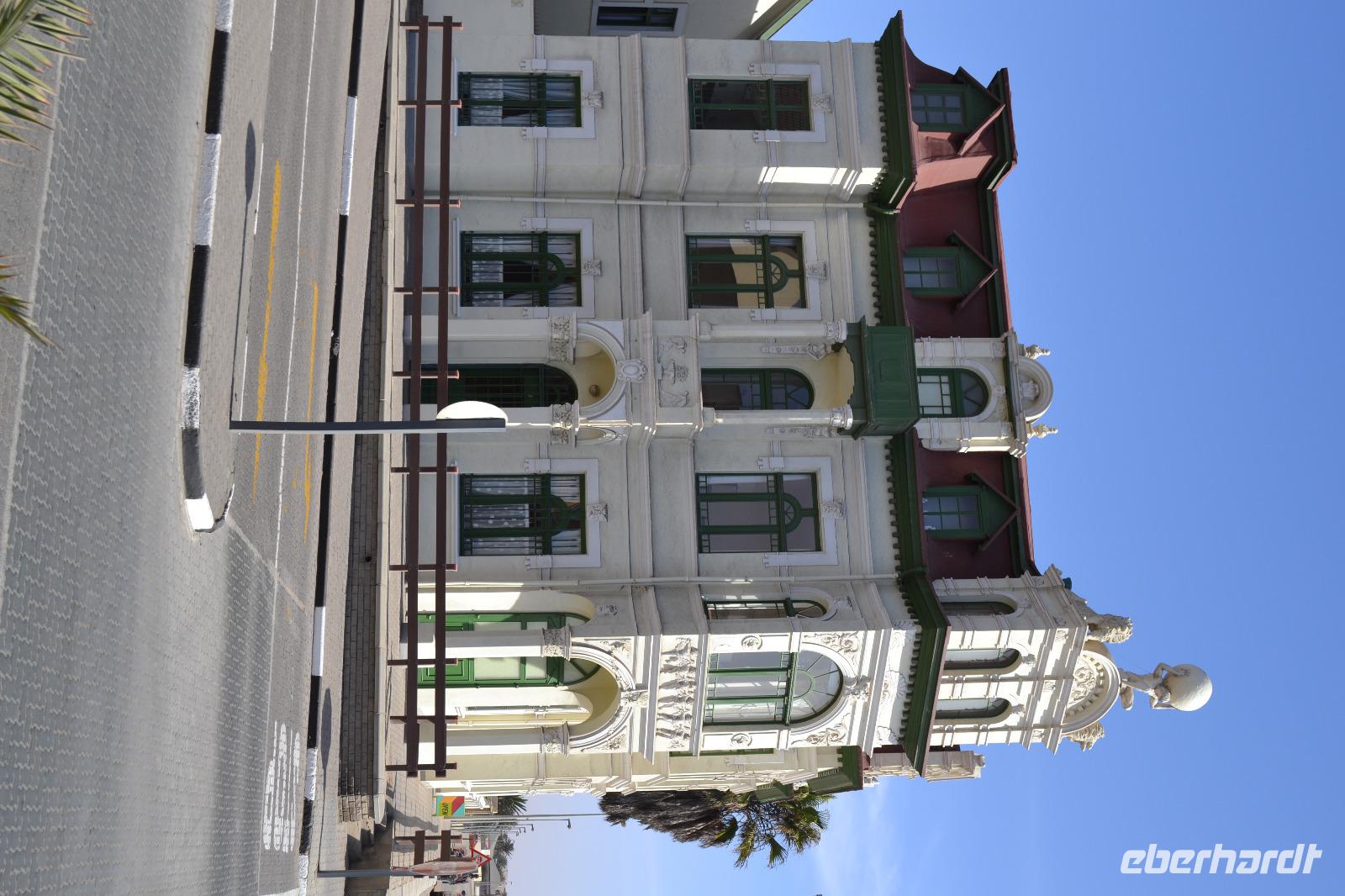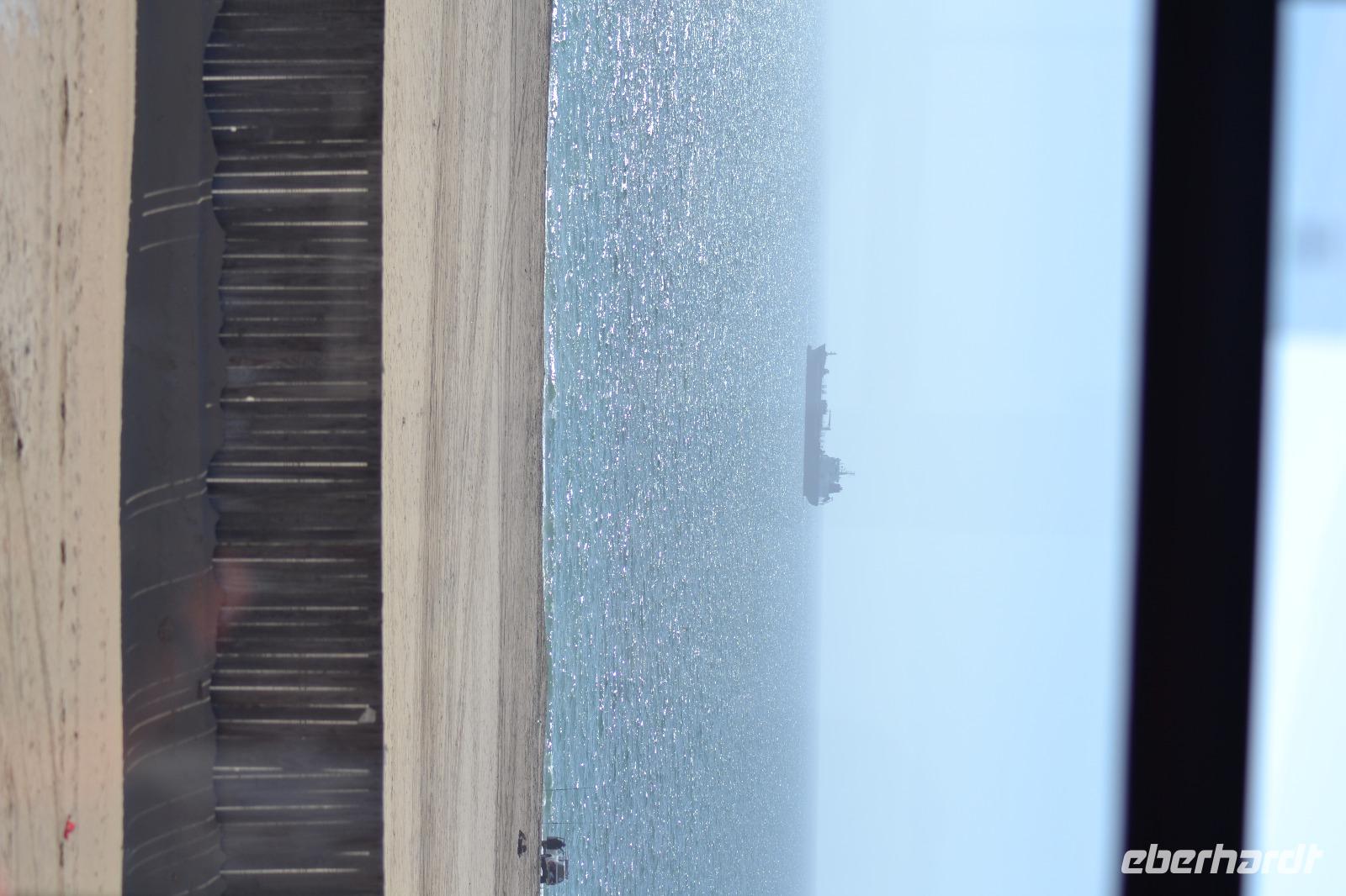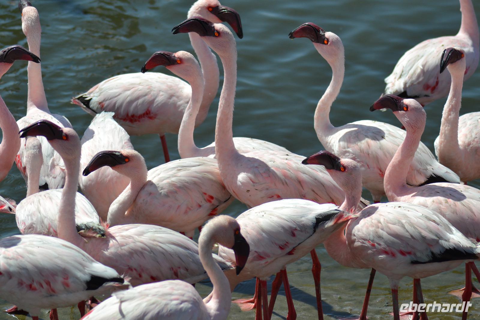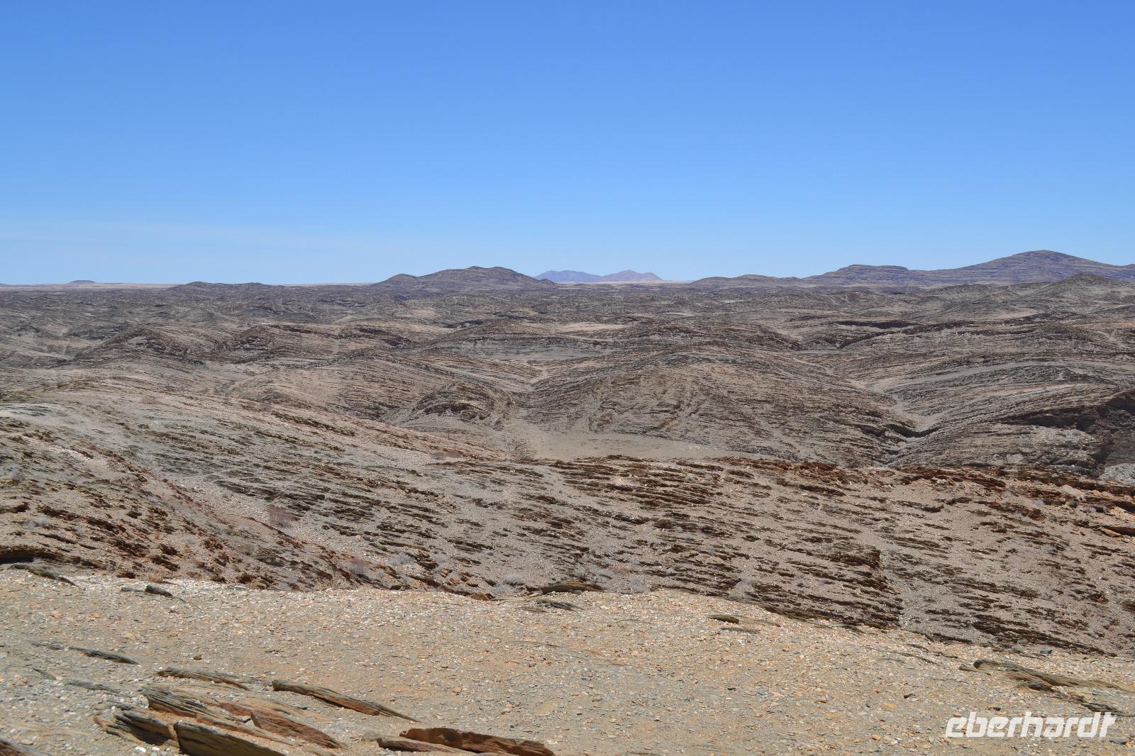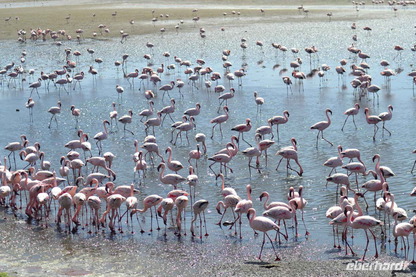 Es war wieder eine kurze Nacht, denn wir fuhren bereits 8 Uhr am Hotel los. Heute stand ein langer Tag im Bus bevor. Auf einer der schlechtesten Straßen Namibias. Nach der ersten längeren Strecke hielten wir in einer Kleinstadt mit nur ca. 80 Einwohnern namens Solitaire. Dort gibt es eine kleine Bäckerei mit europäischen Leckereien. Besonders beliebt ist der frische Apfelkuchen. Auf der ca. 7 stündigen Fahrt durch die Mondlandschaft legten wir unterschiedliche Fotostopps ein. Zunächst am Schild des südlichen Wendekreises des Steinbocks auf dem 23,5 Breitengrad. Auf ihnen steht die Sonne am Mittag zur jeweiligen Sonnenwende im Zenit. Dann fuhren wir über den Gaub Pass bis zum Kuiseb Canyon. Von 1837 bis 1977 hat der Kuiseb River nur 14-mal den Atlantik erreicht. Endlich kühlte es sich ein wenig ab und wir fotografierten den Köcherbaumwald bestehend aus 3 Bäumen. Am Nachmittag trafen wir in der Hafenstadt Walvis Bay ein und sahen die erste AIDA des neuen Jahres im Hafen liegen. An einer Bucht in der Nähe des Hafens tummelten sich tausende von Zwergflamingos die ihr Futter im Wasser fischten. Nach der kurzen Fotopause fuhren wir vorbei am dem neu angelegten Stadtteil Long Beach über die asphaltierte Straße nach Skwakopmund. In dieser Stadt wurde Dagmar geboren. Sie zeigte uns die alten deutschen Gebäude wie das Amtsgericht, die Schule, Hotels, das Bismarck Haus und vieles mehr. Leider blieb uns für die Erkundungstour auf eigene Faust nur wenig Zeit, da uns die Fahrt aus der Wüste zu viel Zeit gekostet hat. Wir erreichten das erst im Frühjahr 2019 eröffnete Hotel Atlantic Garden und machten uns auf den Zimmern frisch. Wir waren vom dem Tag auf der Schotterstraße sehr erschöpft und freuten uns auf das Abendessen. Gemeinsam spazierten wir entlang der Promenade zur Jetty 1905. Das Restaurant liegt auf Seebrücke mit einem traumhaften Ausblick auf das Wasser und den Strand. Wir ließen uns das Essen schmecken und vielen bei angenehmen Temperaturen müde ins Bett.