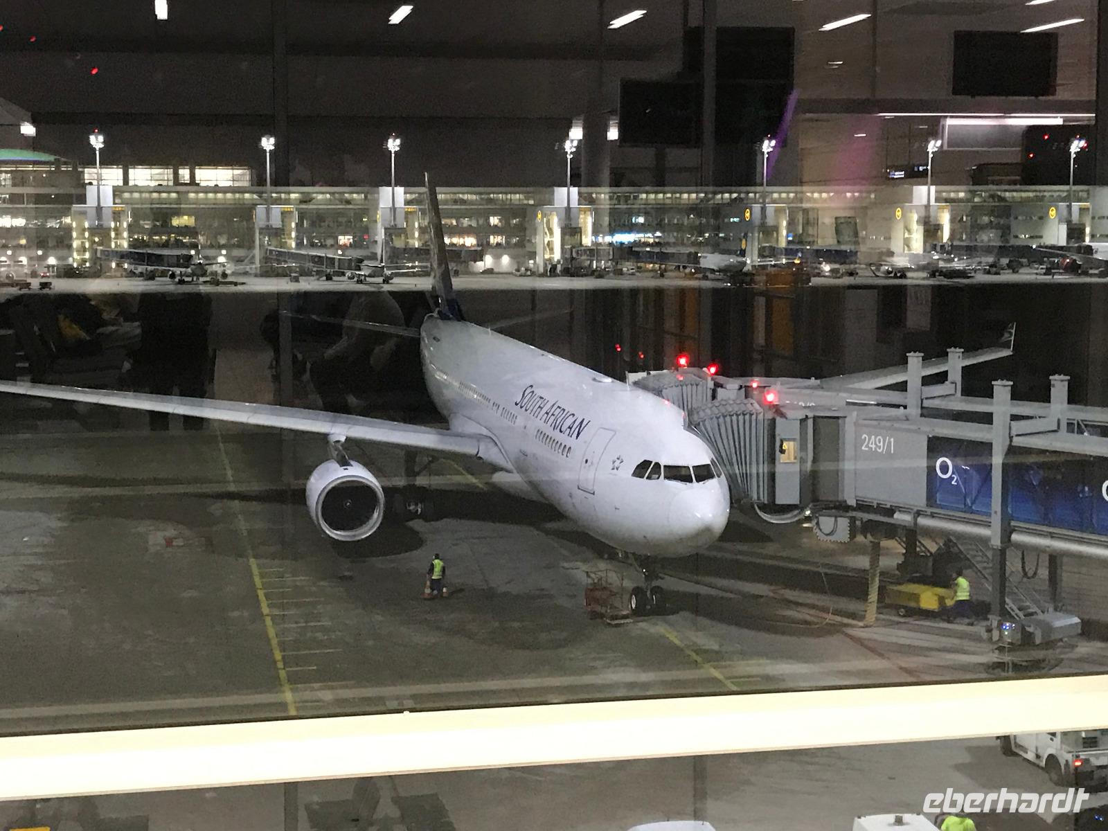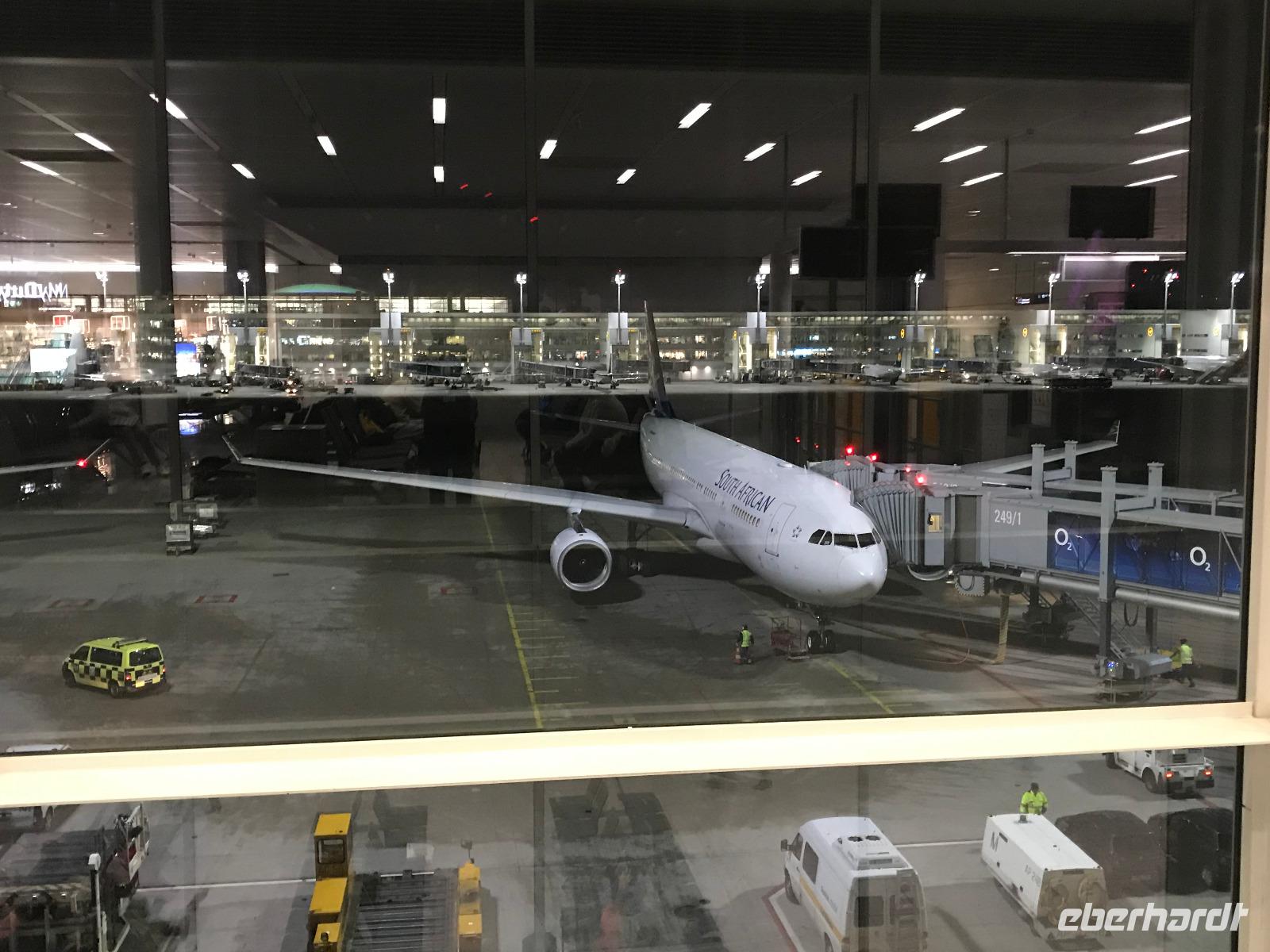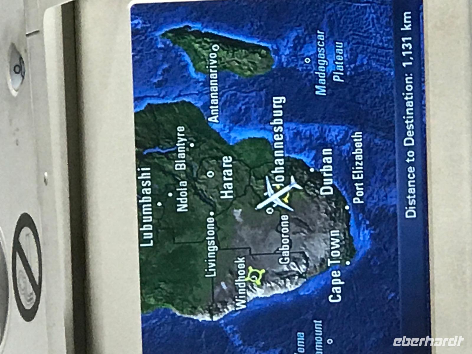 Nach dem Frühstück verabschiedeten wir uns von dem Golfspieler und der Wagenzieherin und fuhren nach Windhoek. Wir kamen ohne Probleme durch und uns blieb noch genügend Zeit für den Geld-Rück-Tausch und einen Kaffee. Unsere Dagmar flog mit uns bis nach Johannesburg. Dort trennten sich dann unsere Wege. Nach dem 6 stündigen Aufenthalt am Flughafen flogen wir mit South African Airways nach München.