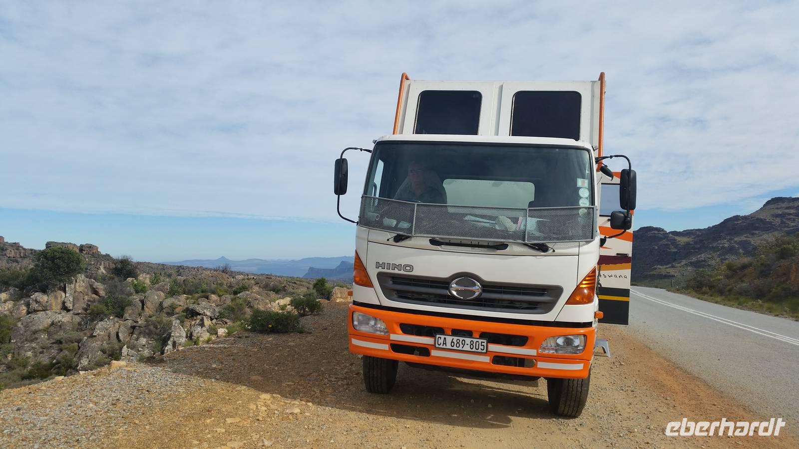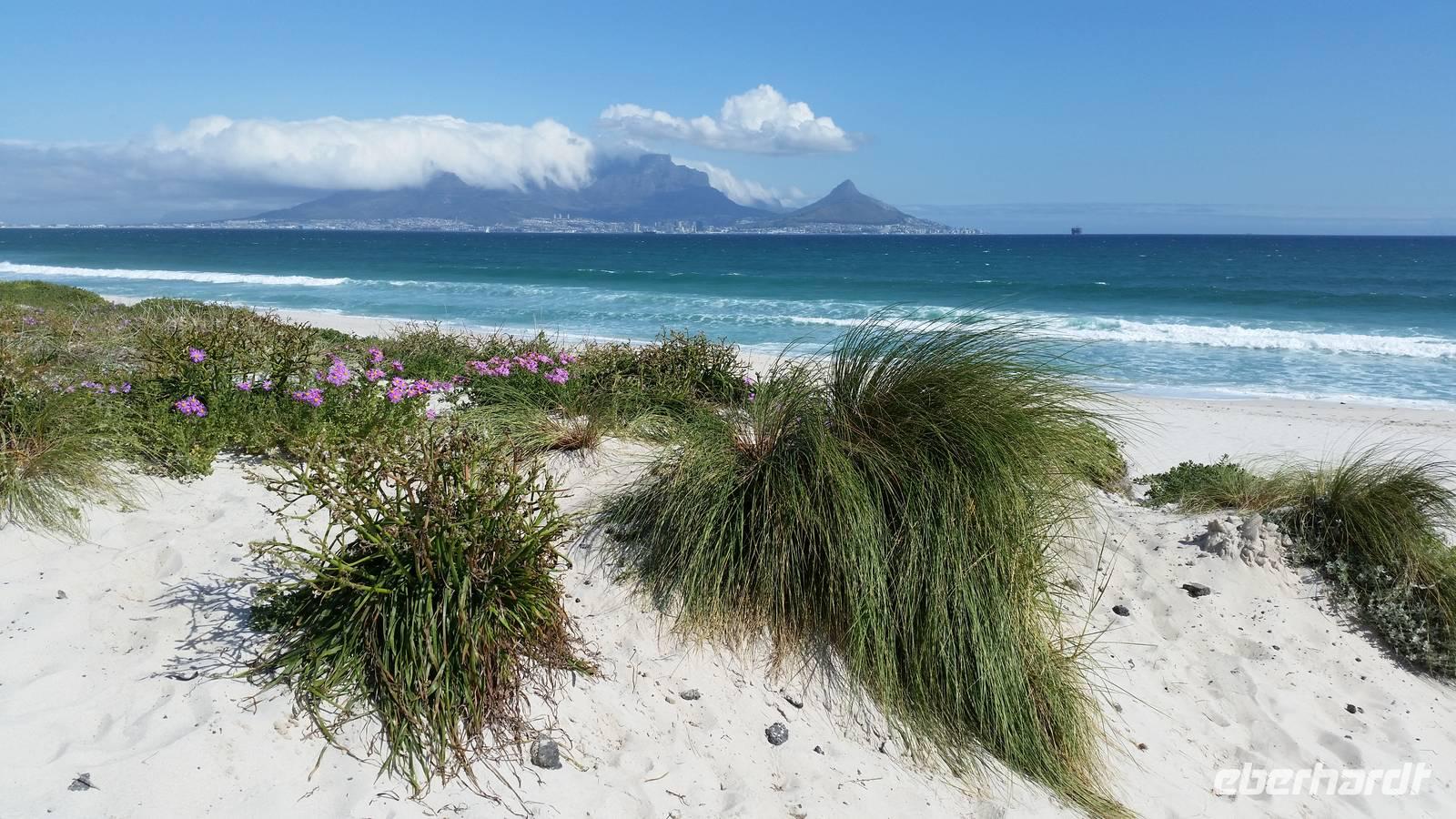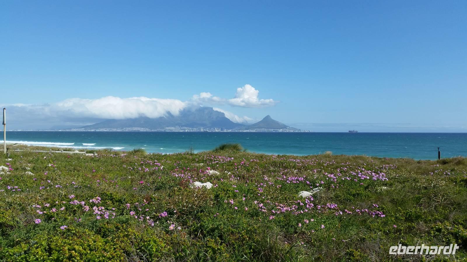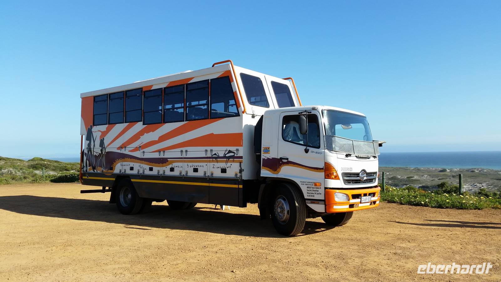 Nach einem angenehmen Flug mit der South African Airways von München über Johannesburg nach Kapstadt nahm uns unser Reiseleiter Tom am Flughafen freudig in Empfang. Nach einem kurzen WC- bzw. Geldtausch-Stopp gingen wir nun erstmal auf Tuchfühlung mit unserem Gefährt für die nächsten zweieinhalb Wochen: von außen wie ein aufgebockter LKW mit Guckfenster, bei näherem Betrachten sahen wir dann einen multifunktionalen Truck mit eine Menge Stauraum für unsere Koffer, Platz für unsere Picknicks und komfortable Sitze um die vielen Kilometer nach Namibia auch wirklich zu genießen. Unser Fahrer Scalla stellte sich auch kurz vor und schon hieß es „alle einsteigen bitte!". Leider verhüllte sich der Tafelberg unter einer weißen Decke, aber dennoch war der Stopp am Bloubergstrand eine Augenweide. Diese Kulisse nutzten wir gleich für ein schönes Gruppenfoto bevor es weiter an der malerischen Westküste entlang ging. Nun chauffierte uns Scalla durch den Nationalpark West Coast und Tom war schon in seinem Element. An besonders schönen Aussichtspunkten stoppten wir und genossen die Aussicht. Am frühen Abend kamen wir, dann doch etwas erschöpft von der langen Anreise, im Protea Hotel Saldhana Bay an, welches uns herzlich willkommen hieß und uns bei einem leckeren, regionalen Buffet verwöhnte. Alle gingen früh zu Bett, denn wir wollten schließlich ausgeschlafen sein, für unseren „new day in south africa"!
