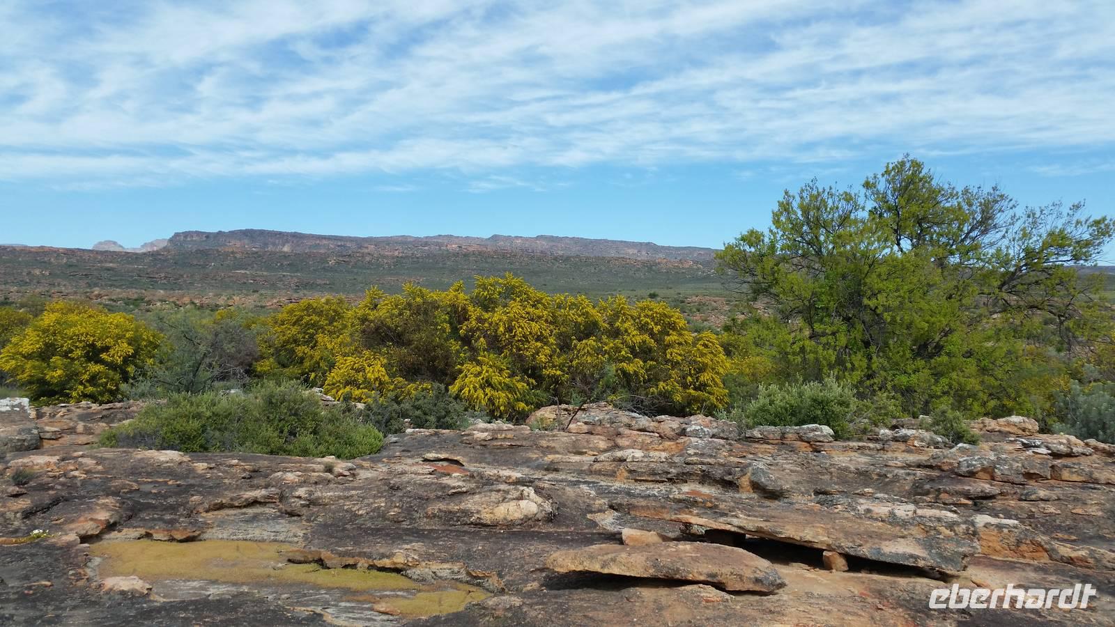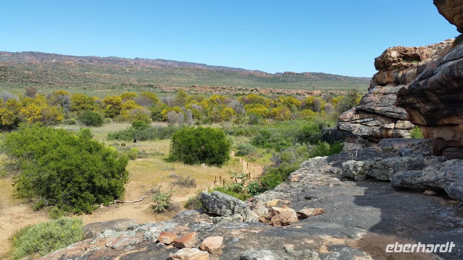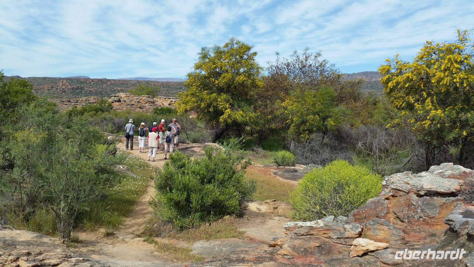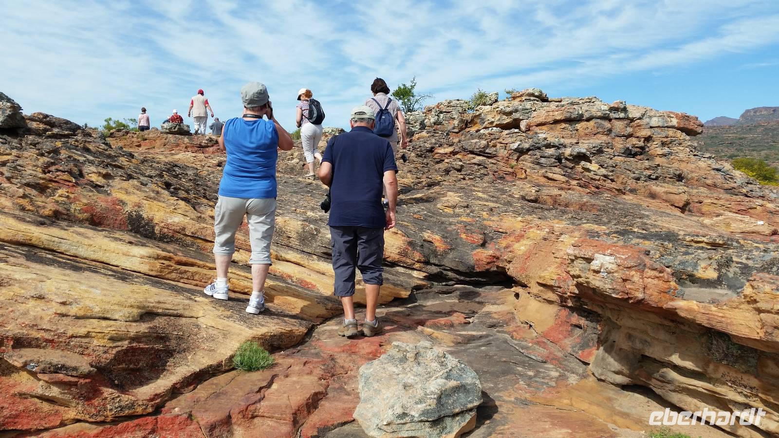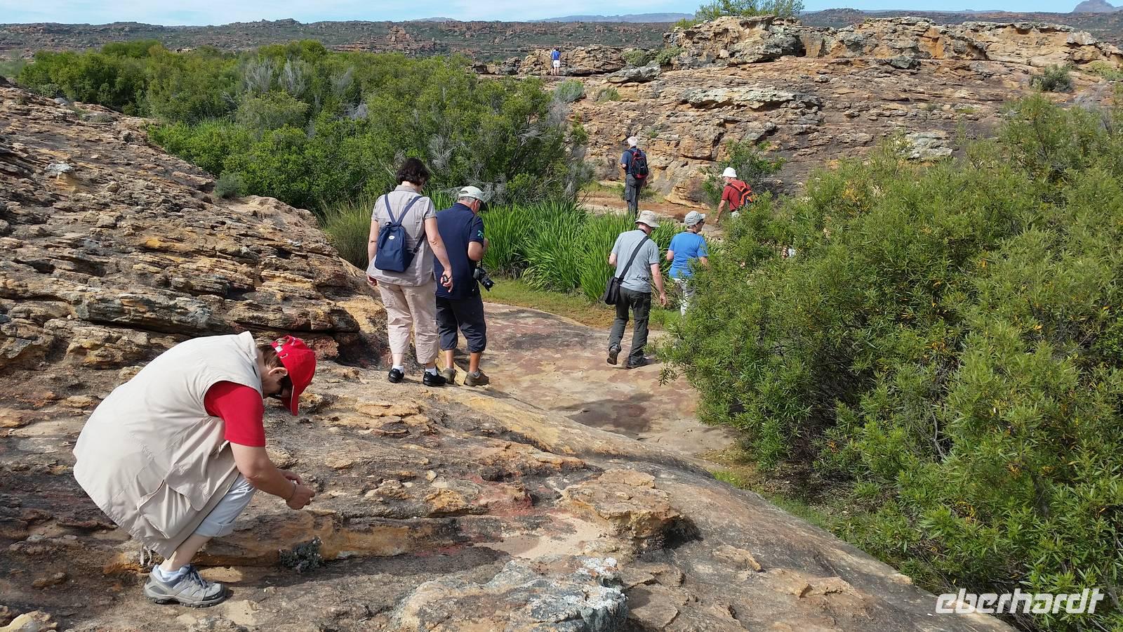 Bei wieder sonnigem Wetter stand heute die Wanderung auf dem Sevilla Rock Art Trail auf dem Programm. Dieser 4km lange Wanderweg ist mit vielen Zeichnungen der San Buschmänner gespickt. Die Malereien, die das Leben dieser Menschen zeigen, sind teilweise so gut erhalten, als wären sie erst gestern entstanden. Es gibt jedoch viele verschiedene Interpretationsmöglichkeiten. Vom „letzten Abendmahl", Monstern, dem Buschmänner-Ballett bis hin zum Ameisenbär gab es noch viele weitere schöne Malereien. Auf der Strecke konnten wir ein wahnsinnig tolles Panorama bestaunen und auch die Blumenfreunde unter uns kamen auf ihre Kosten. Wieder am Ausgangspunkt angekommen, erfrischten wir uns bei einem kühlen Getränk und einem leckeren Sandwich. Dann ging die Reise weiter, Berg hoch, berg runter, Berg hoch, berg runter auf der schnurgeraden Dirt Road über den Booterkloof-Pass schließlich nach Calvinia. Unsere Unterkunft, die Hantam Huis, waren sehr schöne, hübsch eingerichtete Häuschen mit Wohlfühl-Faktor. Den Abend ließen wir bei einem traditionellen Kap-Abendessen im historischem Ambiente ausklingen.