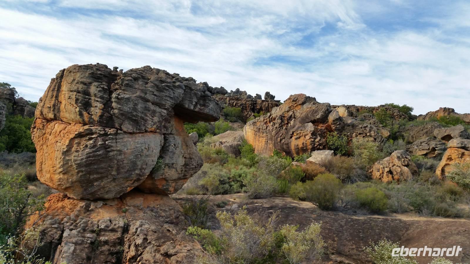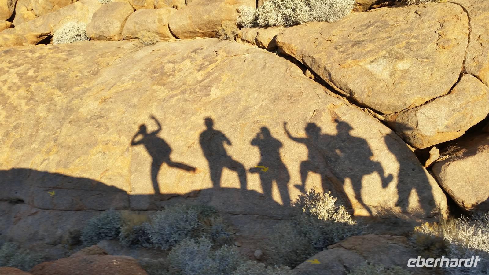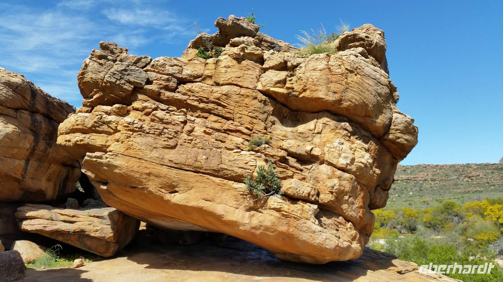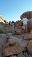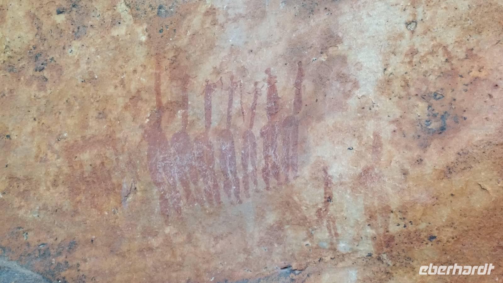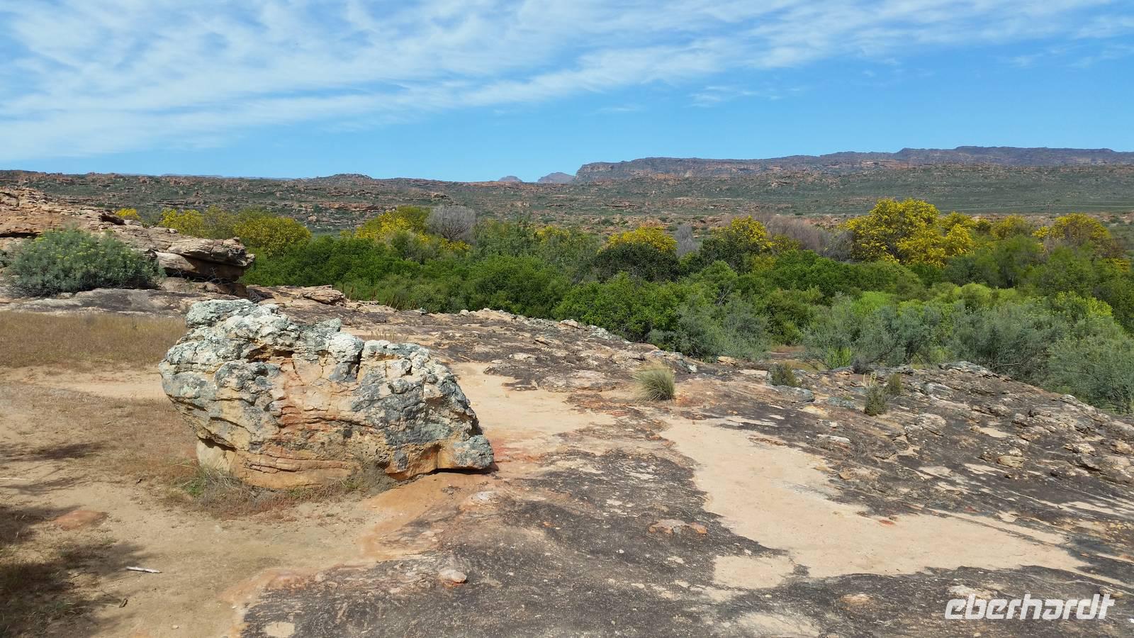 Bei wieder sonnigem Wetter stand heute die Wanderung auf dem Sevilla Rock Art Trail auf dem Programm. Dieser 4km lange Wanderweg ist mit vielen Zeichnungen der San Buschmänner gespickt. Die Malereien, die das Leben dieser Menschen zeigen, sind teilweise so gut erhalten, als wären sie erst gestern entstanden. Es gibt jedoch viele verschiedene Interpretationsmöglichkeiten. Vom „letzten Abendmahl", Monstern, dem Buschmänner-Ballett bis hin zum Ameisenbär gab es noch viele weitere schöne Malereien. Auf der Strecke konnten wir ein wahnsinnig tolles Panorama bestaunen und auch die Blumenfreunde unter uns kamen auf ihre Kosten. Wieder am Ausgangspunkt angekommen, erfrischten wir uns bei einem kühlen Getränk und einem leckeren Sandwich. Dann ging die Reise weiter, Berg hoch, berg runter, Berg hoch, berg runter auf der schnurgeraden Dirt Road über den Booterkloof-Pass schließlich nach Calvinia. Unsere Unterkunft, die Hantam Huis, waren sehr schöne, hübsch eingerichtete Häuschen mit Wohlfühl-Faktor. Den Abend ließen wir bei einem traditionellen Kap-Abendessen im historischem Ambiente ausklingen.