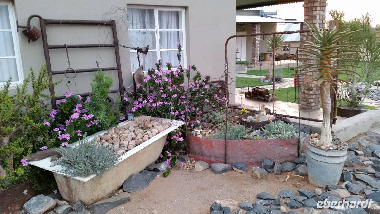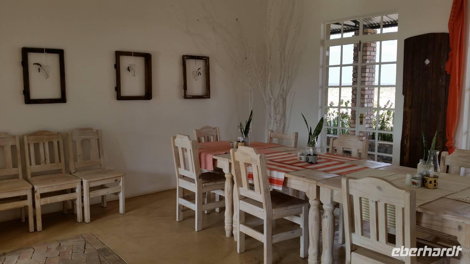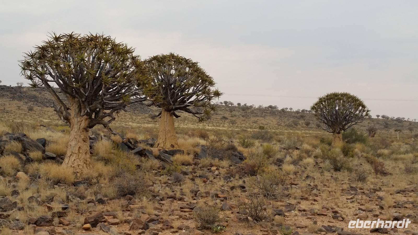 Da wir heute einige Kilometer hinter uns bringen wollten, um die Provinz Northern Cape zu erreichen, starteten wir etwas früher als die letzten Tage. Doch erst einmal genossen wir noch das historische Flair des Hantam Huis und die leckere kapholländische Küche. Anschließend fuhren wir durch die unendliche Weite der Upper Karoo, entlang des Oranje Flusses nach Kakamas und schließlich nach Augrabies in den gleichnamigen Nationalpark. Zwischendurch legten wir den einen oder anderen Stopp ein, um zum Beispiel die bekannten Köcherbäume zu fotografieren. Besonders beeindruckt waren wir von der guten Fahrleistung unseres Scallas, der die kilometerlangen, schnurgeraden Straßen wunderbar meisterte! Am Camp angekommen machten wir uns kurz in unserem „neuen Heim" frisch und nahmen dann unser gemeinsames Picknick am großen Tisch ein. Auf diesem Gelände mussten wir besonders Acht geben, denn es waren sehr schlaue, aber auch sehr dreiste Affen unterwegs. So hielten wir aus „Sicherheitsgründen" Türen und Fenster weitesgehend geschlossen. Bevor wir zu unserer kleinen Rundfahrt aufbrachen, bestaunten wir noch den mächtigen Augrabies Falls. Hier stürzt sich der Oranje-Fluss mit viel donnerndem Getöse in eine 60 Meter tiefe Schlucht. Nach diesen vielen Eindrücken unternahmen wir noch mit unserem Fahrer Scalla eine imposante Entdeckungstour durch das Game Reserve des Camps. Leider waren keine größeren Getiere zu sehen, aber die Landschaft, die Weite und die tiefe, lange Schlucht waren beeindruckend. Wieder einmal „Lääächeln" fürs Gruppenfoto und dann ging es schon zurück ins Camp. Dort bereitete Tom schon unser Abendessen vor und ließ sich auch nicht von zwei attackierenden Pavianen abschrecken ? Es gab hausgemachtes Baap, Kohlsalat, Rote Beete, Hühnchen und Bratwurst sowie scharfe Bohnen. Alles schmeckte hervorragend und Tom freute sich über das viele Lob. Den Abend ließen wir stimmungsvoll bei Wein oder Bier unter freiem Himmel zu Ende gehen...
