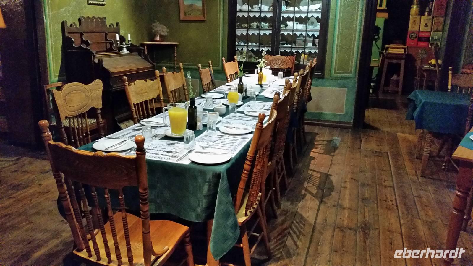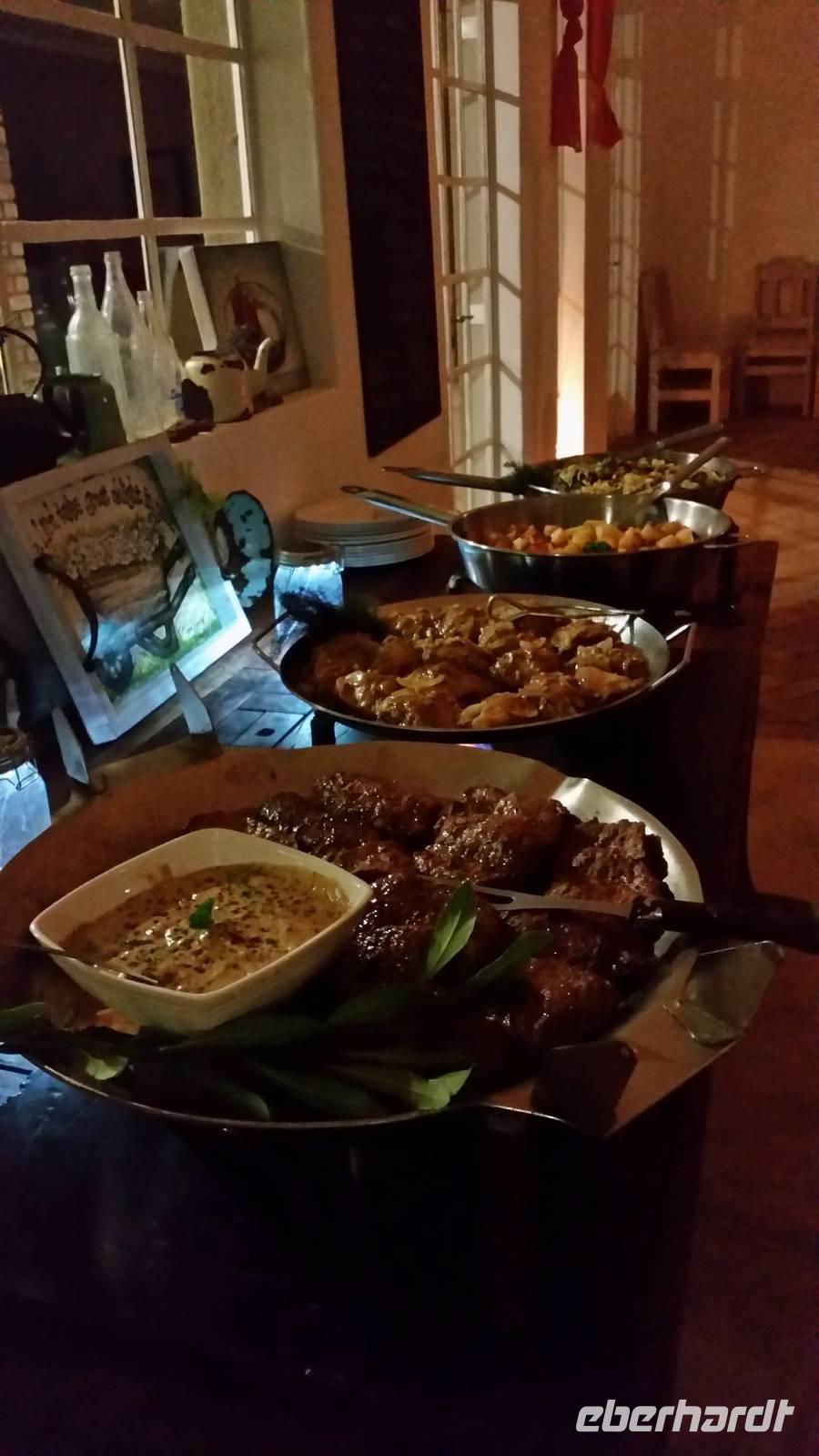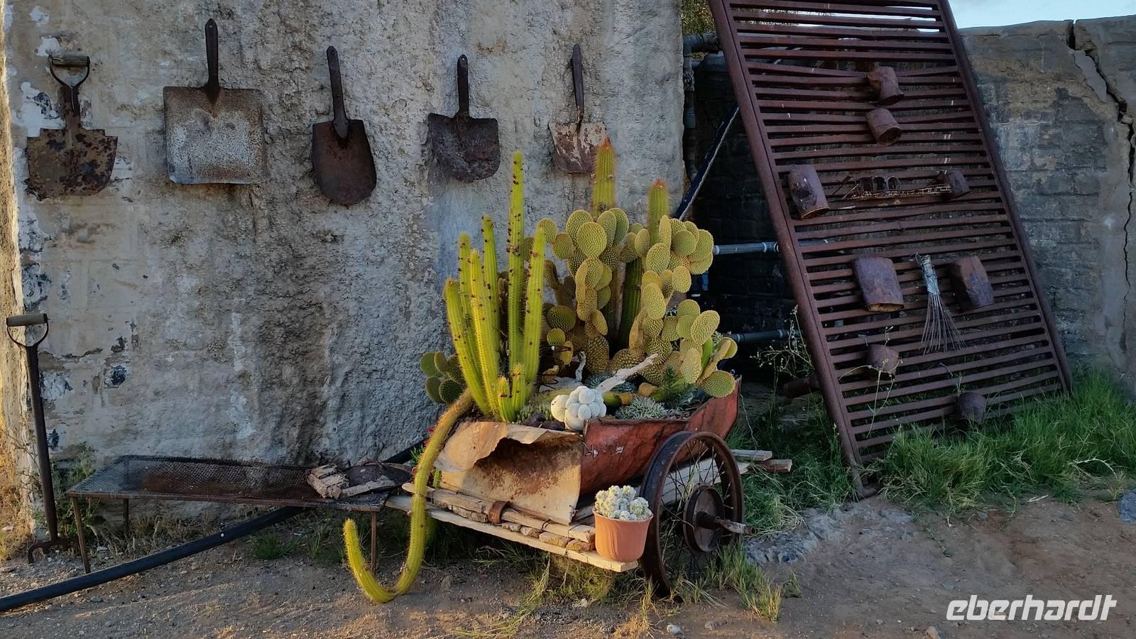 Da wir heute einige Kilometer hinter uns bringen wollten, um die Provinz Northern Cape zu erreichen, starteten wir etwas früher als die letzten Tage. Doch erst einmal genossen wir noch das historische Flair des Hantam Huis und die leckere kapholländische Küche. Anschließend fuhren wir durch die unendliche Weite der Upper Karoo, entlang des Oranje Flusses nach Kakamas und schließlich nach Augrabies in den gleichnamigen Nationalpark. Zwischendurch legten wir den einen oder anderen Stopp ein, um zum Beispiel die bekannten Köcherbäume zu fotografieren. Besonders beeindruckt waren wir von der guten Fahrleistung unseres Scallas, der die kilometerlangen, schnurgeraden Straßen wunderbar meisterte! Am Camp angekommen machten wir uns kurz in unserem „neuen Heim" frisch und nahmen dann unser gemeinsames Picknick am großen Tisch ein. Auf diesem Gelände mussten wir besonders Acht geben, denn es waren sehr schlaue, aber auch sehr dreiste Affen unterwegs. So hielten wir aus „Sicherheitsgründen" Türen und Fenster weitesgehend geschlossen. Bevor wir zu unserer kleinen Rundfahrt aufbrachen, bestaunten wir noch den mächtigen Augrabies Falls. Hier stürzt sich der Oranje-Fluss mit viel donnerndem Getöse in eine 60 Meter tiefe Schlucht. Nach diesen vielen Eindrücken unternahmen wir noch mit unserem Fahrer Scalla eine imposante Entdeckungstour durch das Game Reserve des Camps. Leider waren keine größeren Getiere zu sehen, aber die Landschaft, die Weite und die tiefe, lange Schlucht waren beeindruckend. Wieder einmal „Lääächeln" fürs Gruppenfoto und dann ging es schon zurück ins Camp. Dort bereitete Tom schon unser Abendessen vor und ließ sich auch nicht von zwei attackierenden Pavianen abschrecken ? Es gab hausgemachtes Baap, Kohlsalat, Rote Beete, Hühnchen und Bratwurst sowie scharfe Bohnen. Alles schmeckte hervorragend und Tom freute sich über das viele Lob. Den Abend ließen wir stimmungsvoll bei Wein oder Bier unter freiem Himmel zu Ende gehen...