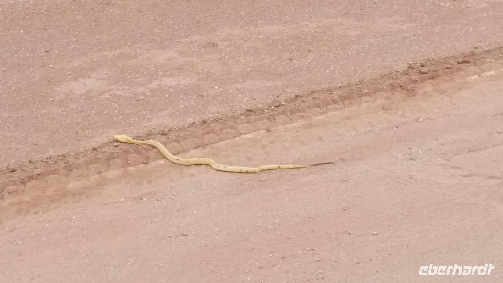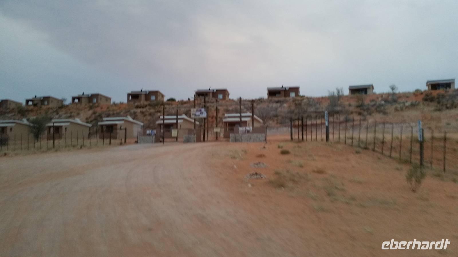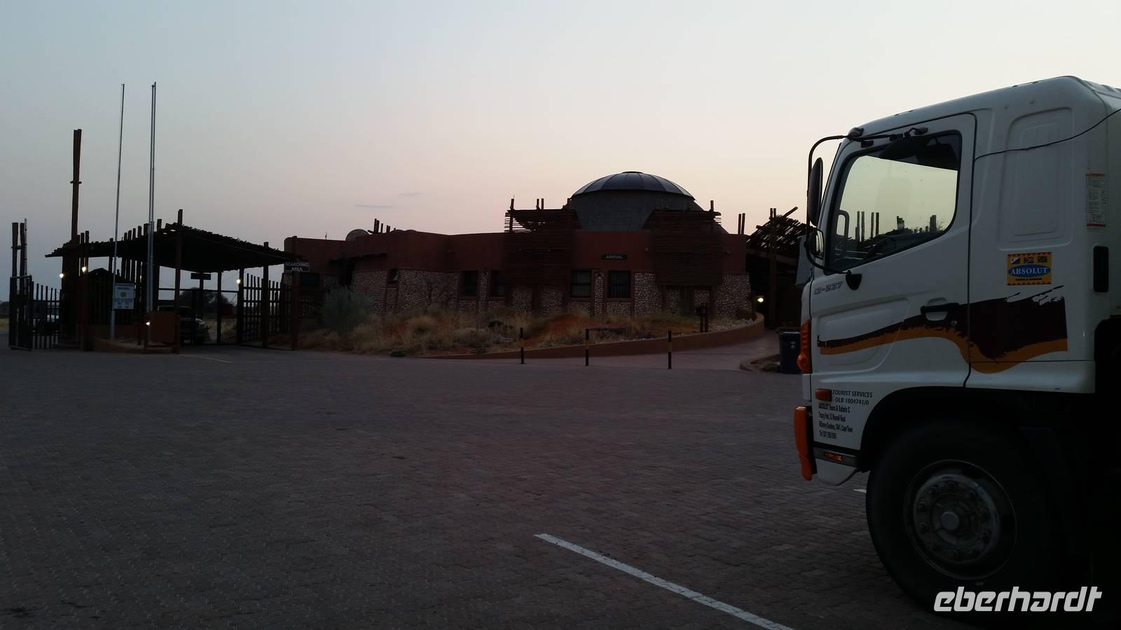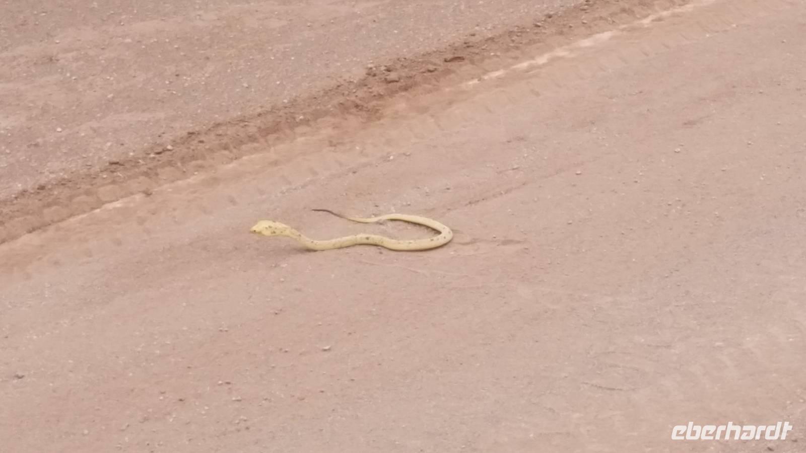 Heute hieß es erst einmal Abschied nehmen von Südafrika, denn die unendliche Weite Namibias erwartete uns. Nach dem Frühstück fuhren wir die vielen Kilometer in Richtung der ehemaligen Kolonie Deutsch Südwest Afrika. Über Rietfontier überquerten wir schließlich die Grenze und erledigten die entsprechenden Formalitäten. Kurz nachdem wir wieder auf der Strecke waren, war plötzlich große Aufregung im Bus, denn Tom hatte eine Kap-Kobra auf der Straße liegen sehen. Scalla legte schnell den Rückwärtsgang ein, damit wir das giftige Tier aus dem Bus fotografieren konnten. Die Schlange war natürlich wenig erfreut und bäumte sich regelrecht vor uns auf. Zum Glück waren wir sicher hinter verschlossenen Scheiben. Was für ein Erlebnis! Dann rollten wir weiter und weiter und kamen schließlich am Nachmittag in unsere Lodge „Alte Kalköfen" an. In unserem gemütlichen Häuschen und in der gepflegten Anlage konnten wir den Nachmittag noch etwas genüsslich ausklingen lassen.