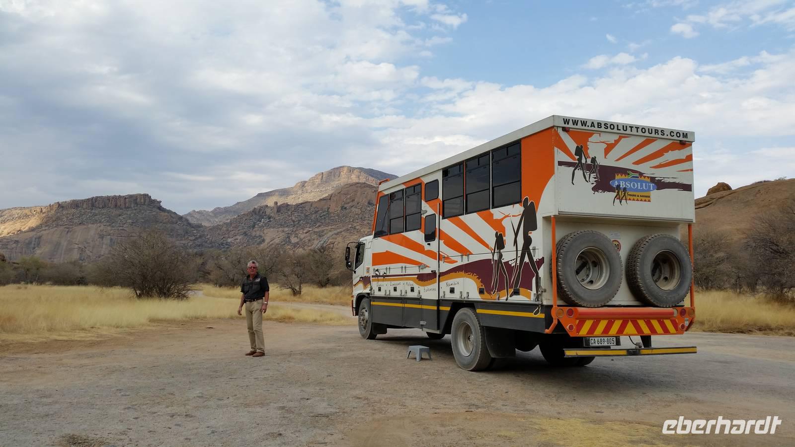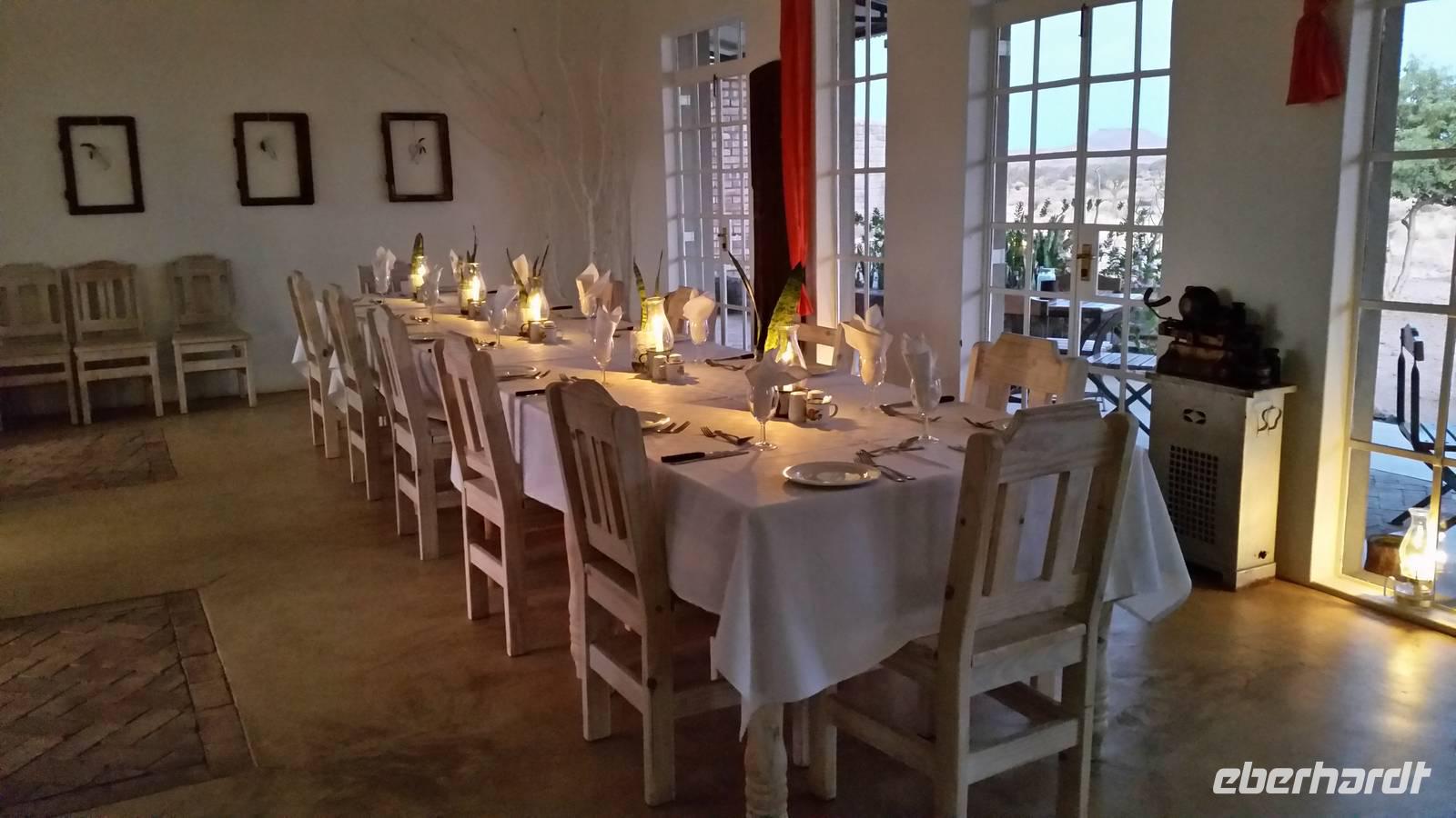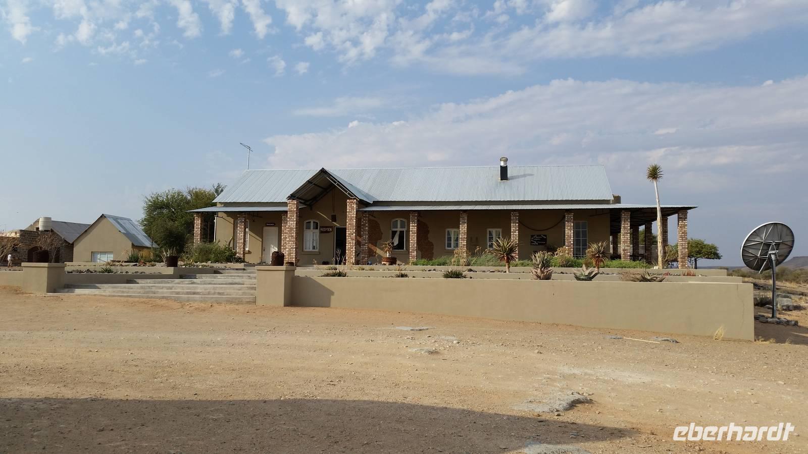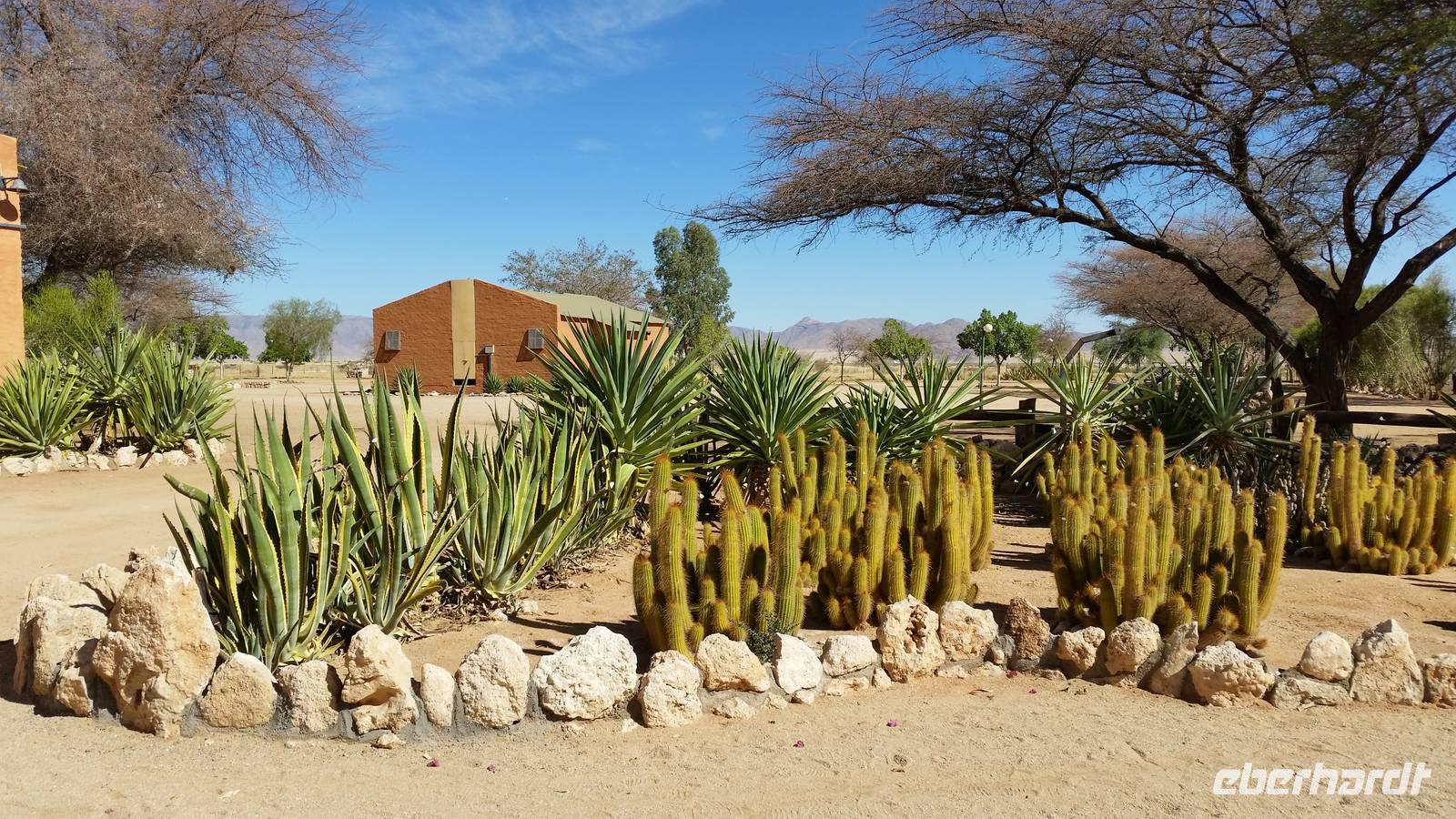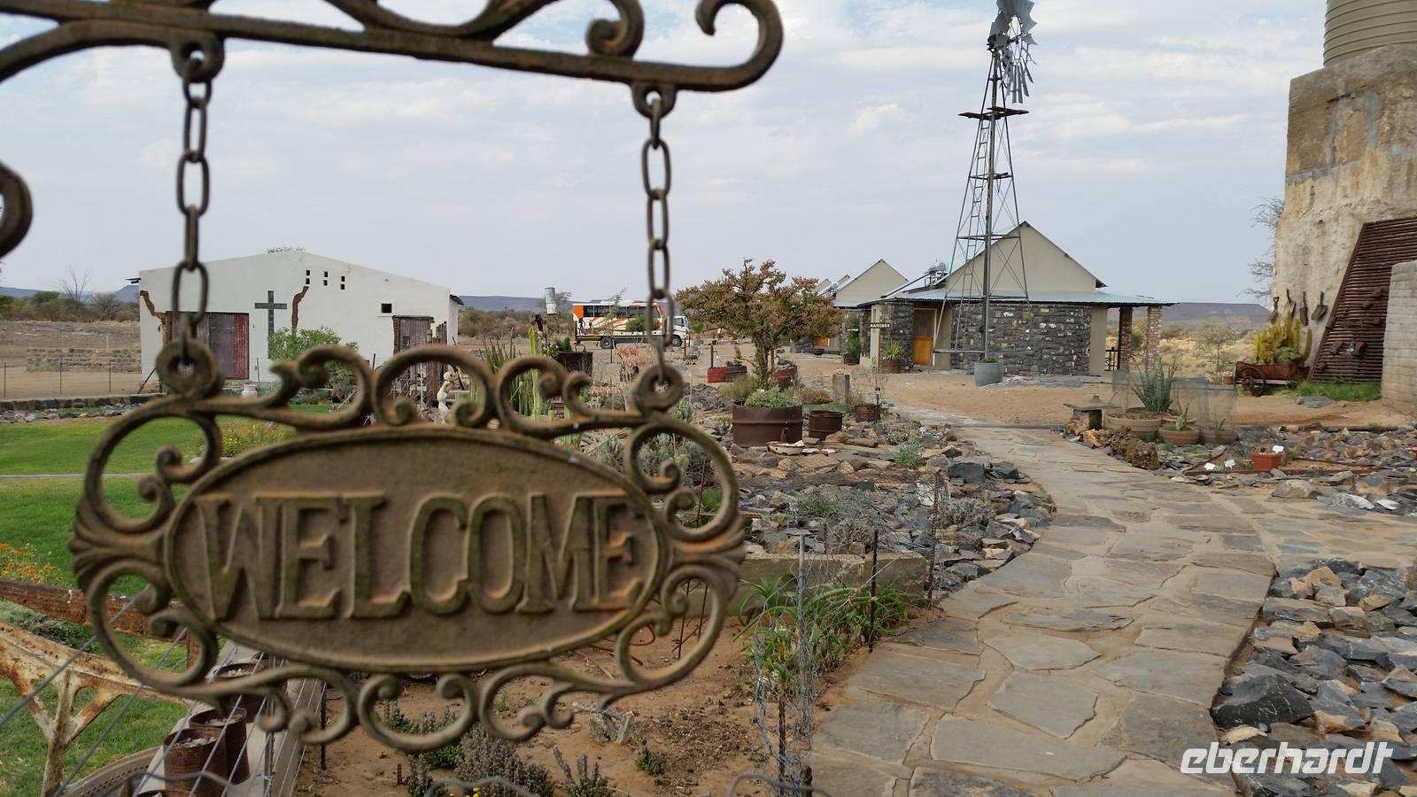 Heute hieß es erst einmal Abschied nehmen von Südafrika, denn die unendliche Weite Namibias erwartete uns. Nach dem Frühstück fuhren wir die vielen Kilometer in Richtung der ehemaligen Kolonie Deutsch Südwest Afrika. Über Rietfontier überquerten wir schließlich die Grenze und erledigten die entsprechenden Formalitäten. Kurz nachdem wir wieder auf der Strecke waren, war plötzlich große Aufregung im Bus, denn Tom hatte eine Kap-Kobra auf der Straße liegen sehen. Scalla legte schnell den Rückwärtsgang ein, damit wir das giftige Tier aus dem Bus fotografieren konnten. Die Schlange war natürlich wenig erfreut und bäumte sich regelrecht vor uns auf. Zum Glück waren wir sicher hinter verschlossenen Scheiben. Was für ein Erlebnis! Dann rollten wir weiter und weiter und kamen schließlich am Nachmittag in unsere Lodge „Alte Kalköfen" an. In unserem gemütlichen Häuschen und in der gepflegten Anlage konnten wir den Nachmittag noch etwas genüsslich ausklingen lassen.