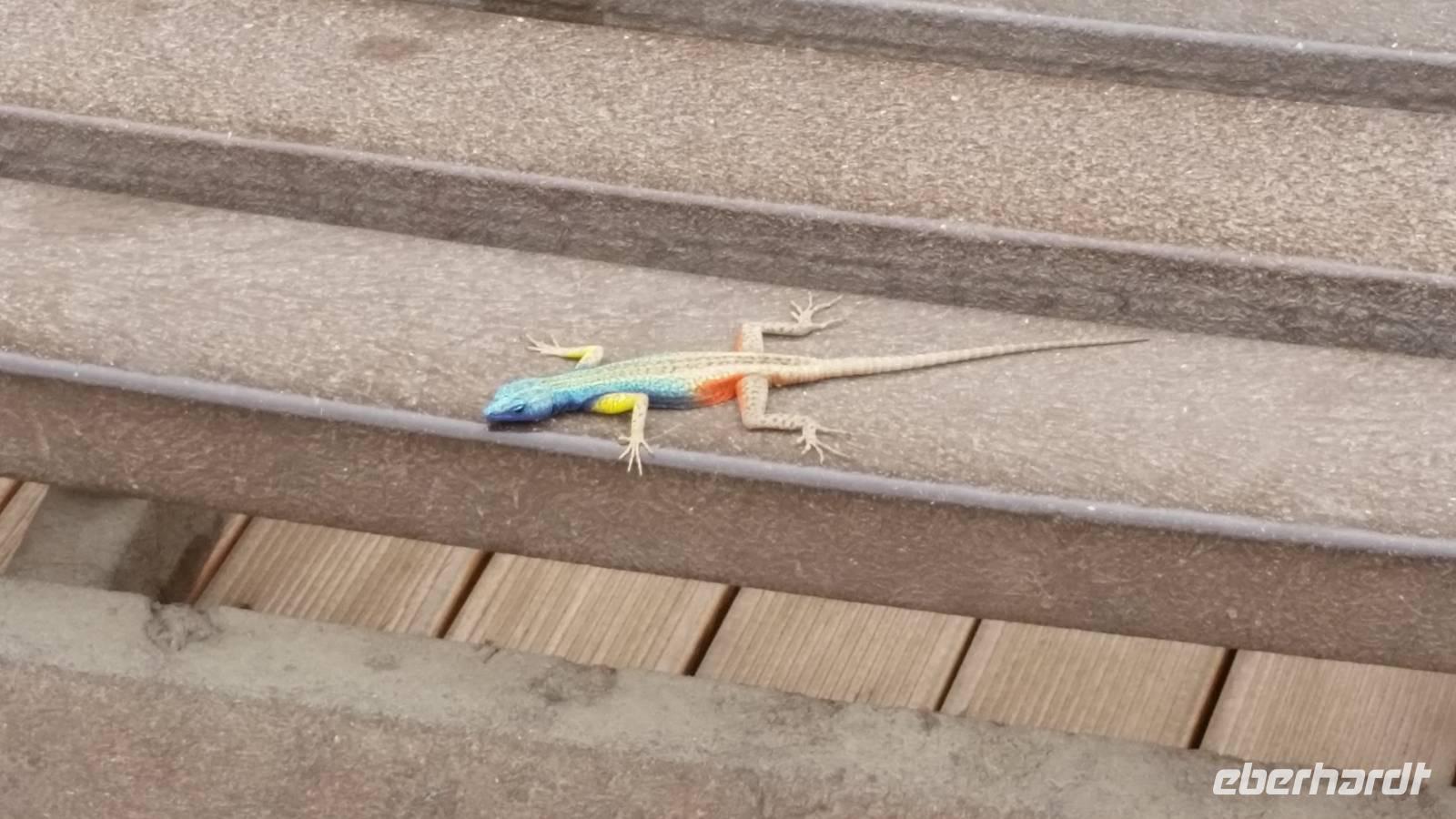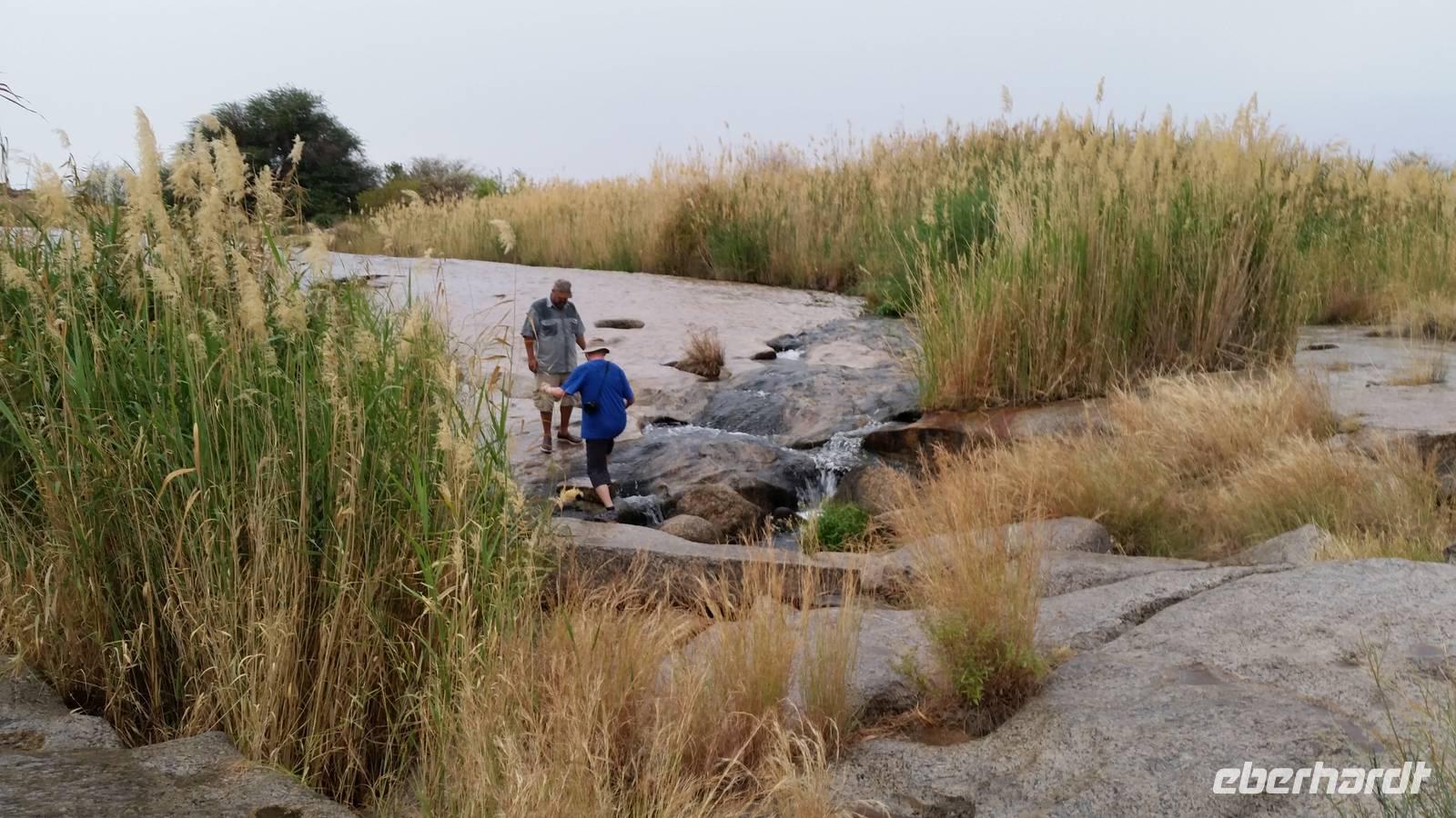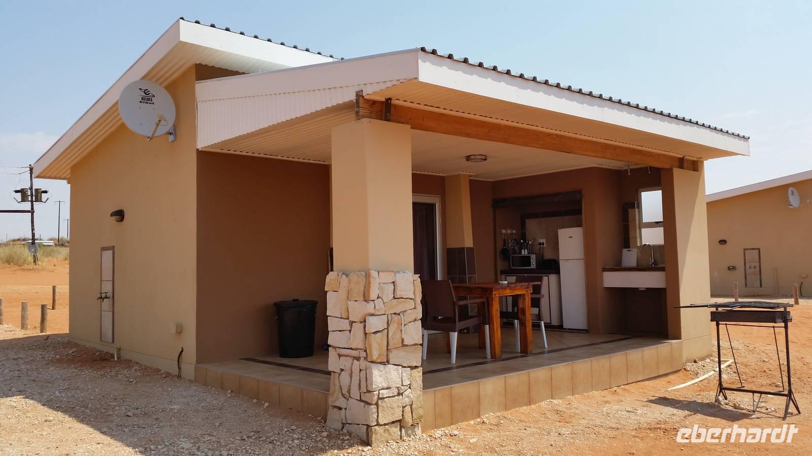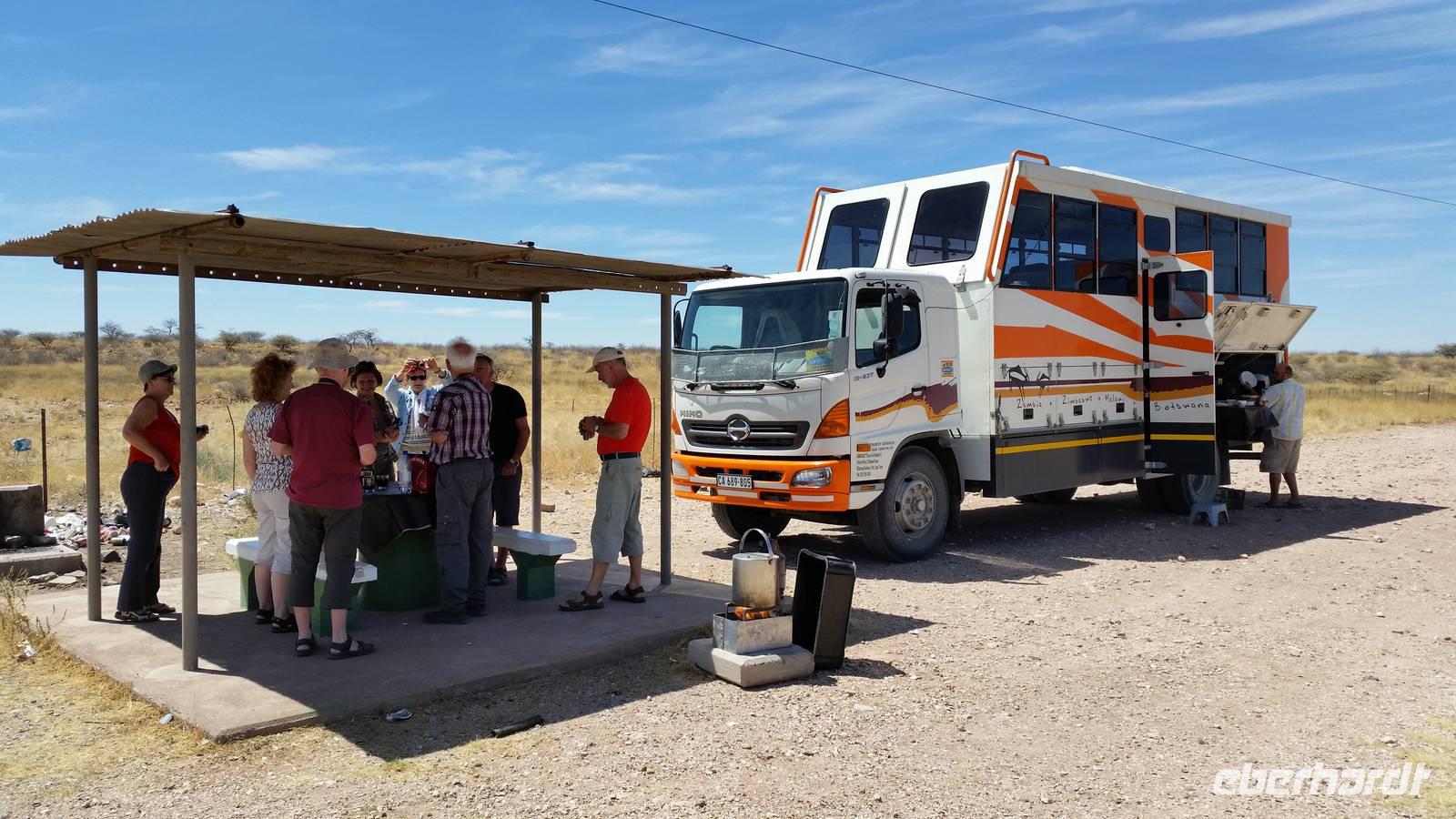 Heute hieß es erst einmal Abschied nehmen von Südafrika, denn die unendliche Weite Namibias erwartete uns. Nach dem Frühstück fuhren wir die vielen Kilometer in Richtung der ehemaligen Kolonie Deutsch Südwest Afrika. Über Rietfontier überquerten wir schließlich die Grenze und erledigten die entsprechenden Formalitäten. Kurz nachdem wir wieder auf der Strecke waren, war plötzlich große Aufregung im Bus, denn Tom hatte eine Kap-Kobra auf der Straße liegen sehen. Scalla legte schnell den Rückwärtsgang ein, damit wir das giftige Tier aus dem Bus fotografieren konnten. Die Schlange war natürlich wenig erfreut und bäumte sich regelrecht vor uns auf. Zum Glück waren wir sicher hinter verschlossenen Scheiben. Was für ein Erlebnis! Dann rollten wir weiter und weiter und kamen schließlich am Nachmittag in unsere Lodge „Alte Kalköfen" an. In unserem gemütlichen Häuschen und in der gepflegten Anlage konnten wir den Nachmittag noch etwas genüsslich ausklingen lassen.
