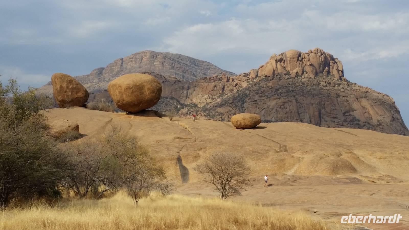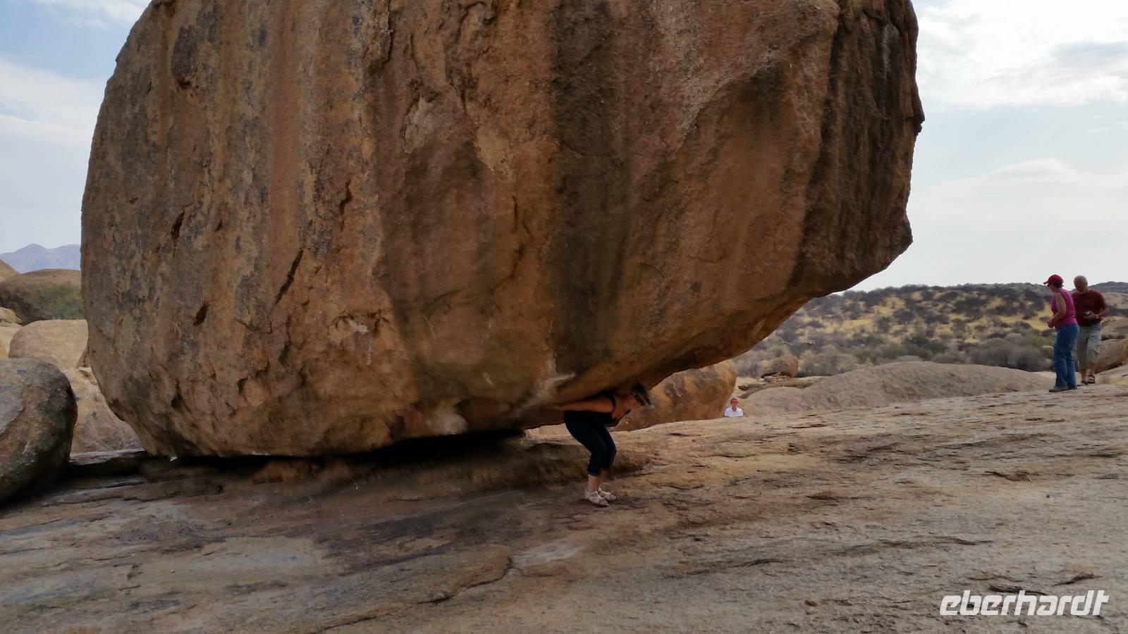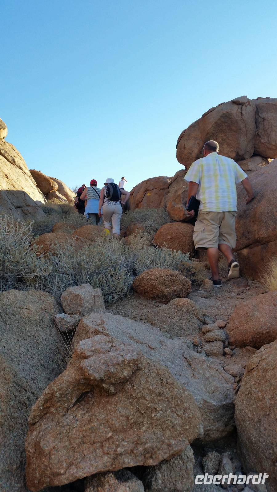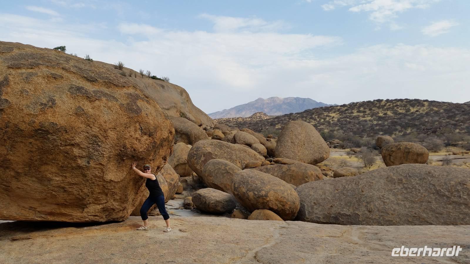 Heute hieß es schon wieder Abschied nehmen von Swakopmund. Doch bevor wir ins Erongo-Gebirge fuhren, unternahmen wir erst einmal eine 3-stündige amüsante Katamaran-Fahrt auf der wir mit Kapitän Hans auf Tuchfühlung mit Pelikanen und Robben gingen. Außerdem wurden wir hervorragend mit Austern, Fischspezialitäten und Sekt verköstigt. Dann fuhren wir vorbei an der imposanten Spitzkoppe in die malerische Berg- und Savannenlandschaft des Erongo Gebirges. Da die Gegend reich an Halbedelsteinen ist, machten wir Halt an einem urtypischen afrikanischen Edelsteinmarkt, bei dem sich der ein oder andere noch ein kleines Souvenir mitnahm und den Kindern dort mit Obst und Süßigkeiten eine Freude bereitete. Bevor wir in unserer Lodge ankamen, besuchten wir noch die Bull´s Party, eine Ansammlung vieler bizarrer Gesteinsformationen, die aussehen wir große Kugeln die man mal eben so wegrollen könnte. Den restlichen Nachmittag verbrachten wir dann noch in unserer urgemütlichen „Hohenstein Lodge"...