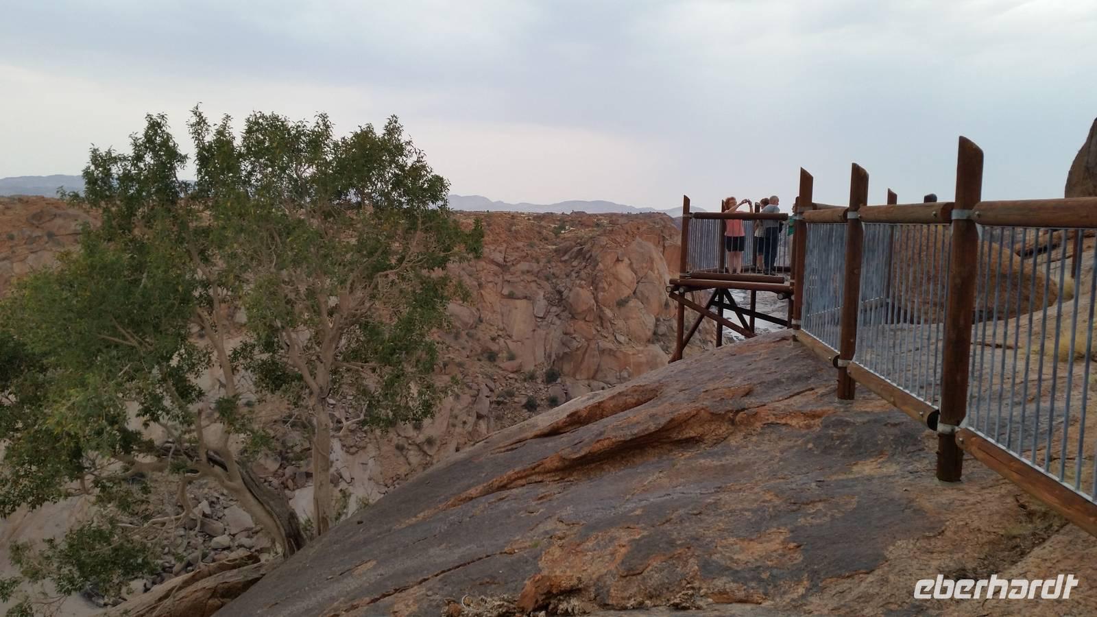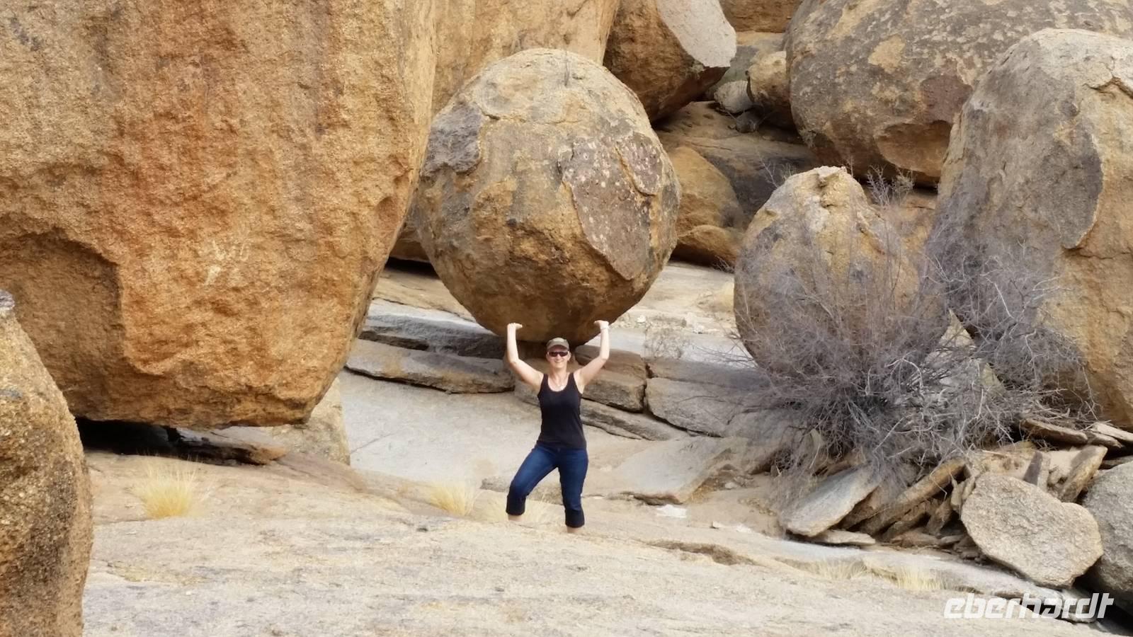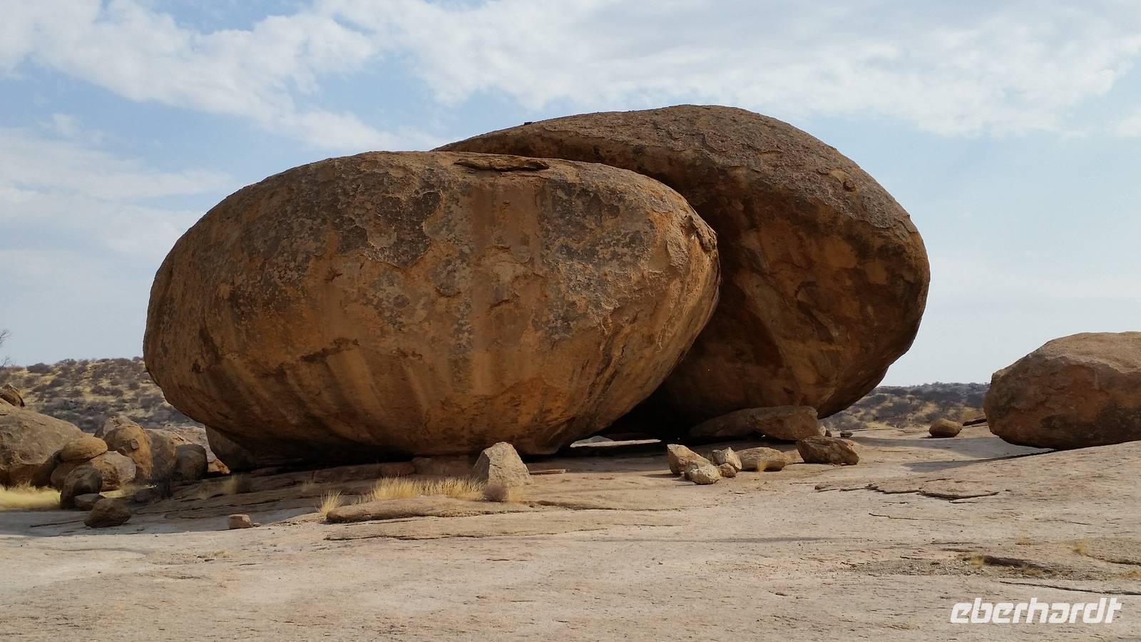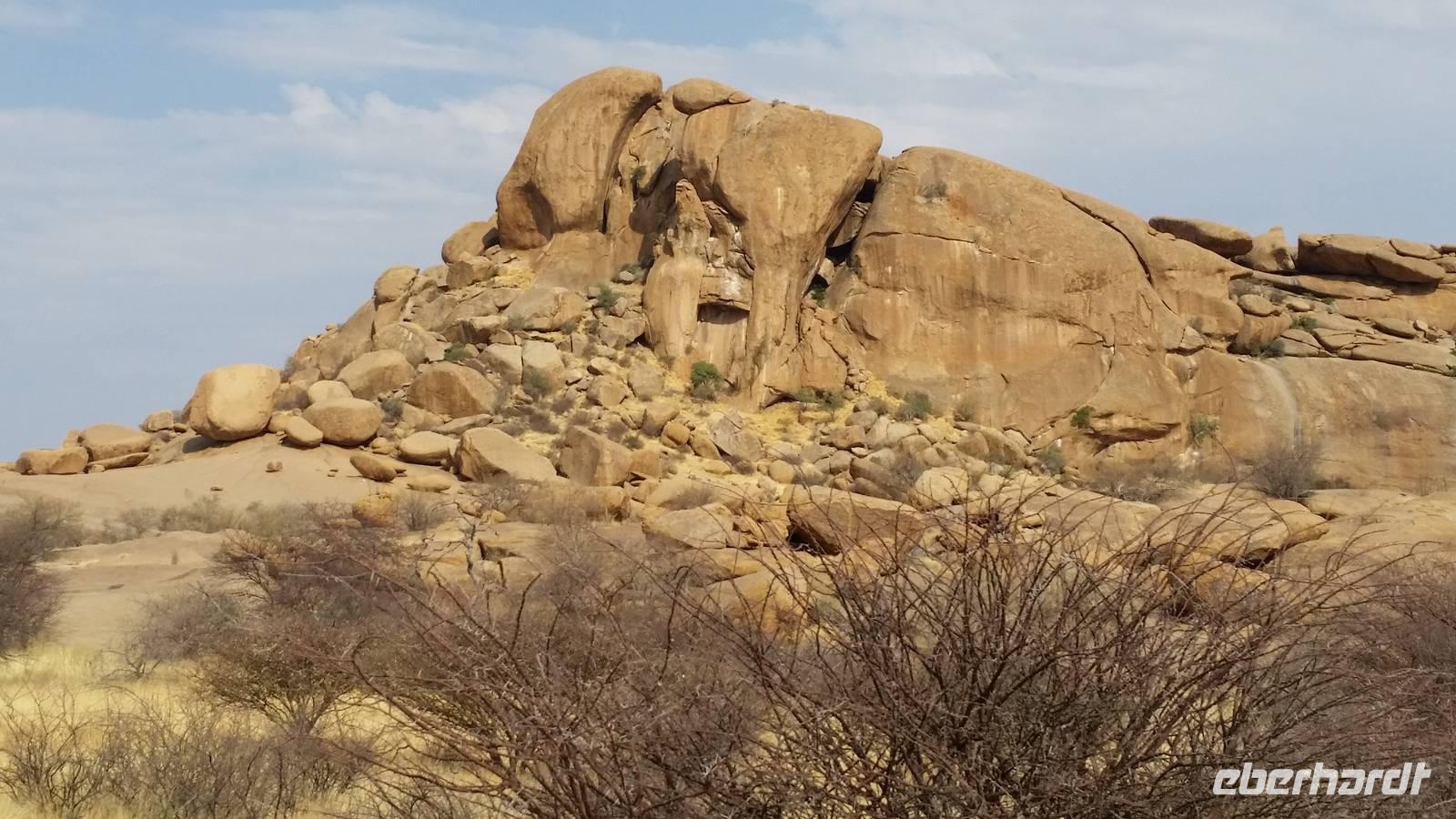 Heute hieß es schon wieder Abschied nehmen von Swakopmund. Doch bevor wir ins Erongo-Gebirge fuhren, unternahmen wir erst einmal eine 3-stündige amüsante Katamaran-Fahrt auf der wir mit Kapitän Hans auf Tuchfühlung mit Pelikanen und Robben gingen. Außerdem wurden wir hervorragend mit Austern, Fischspezialitäten und Sekt verköstigt. Dann fuhren wir vorbei an der imposanten Spitzkoppe in die malerische Berg- und Savannenlandschaft des Erongo Gebirges. Da die Gegend reich an Halbedelsteinen ist, machten wir Halt an einem urtypischen afrikanischen Edelsteinmarkt, bei dem sich der ein oder andere noch ein kleines Souvenir mitnahm und den Kindern dort mit Obst und Süßigkeiten eine Freude bereitete. Bevor wir in unserer Lodge ankamen, besuchten wir noch die Bull´s Party, eine Ansammlung vieler bizarrer Gesteinsformationen, die aussehen wir große Kugeln die man mal eben so wegrollen könnte. Den restlichen Nachmittag verbrachten wir dann noch in unserer urgemütlichen „Hohenstein Lodge"...