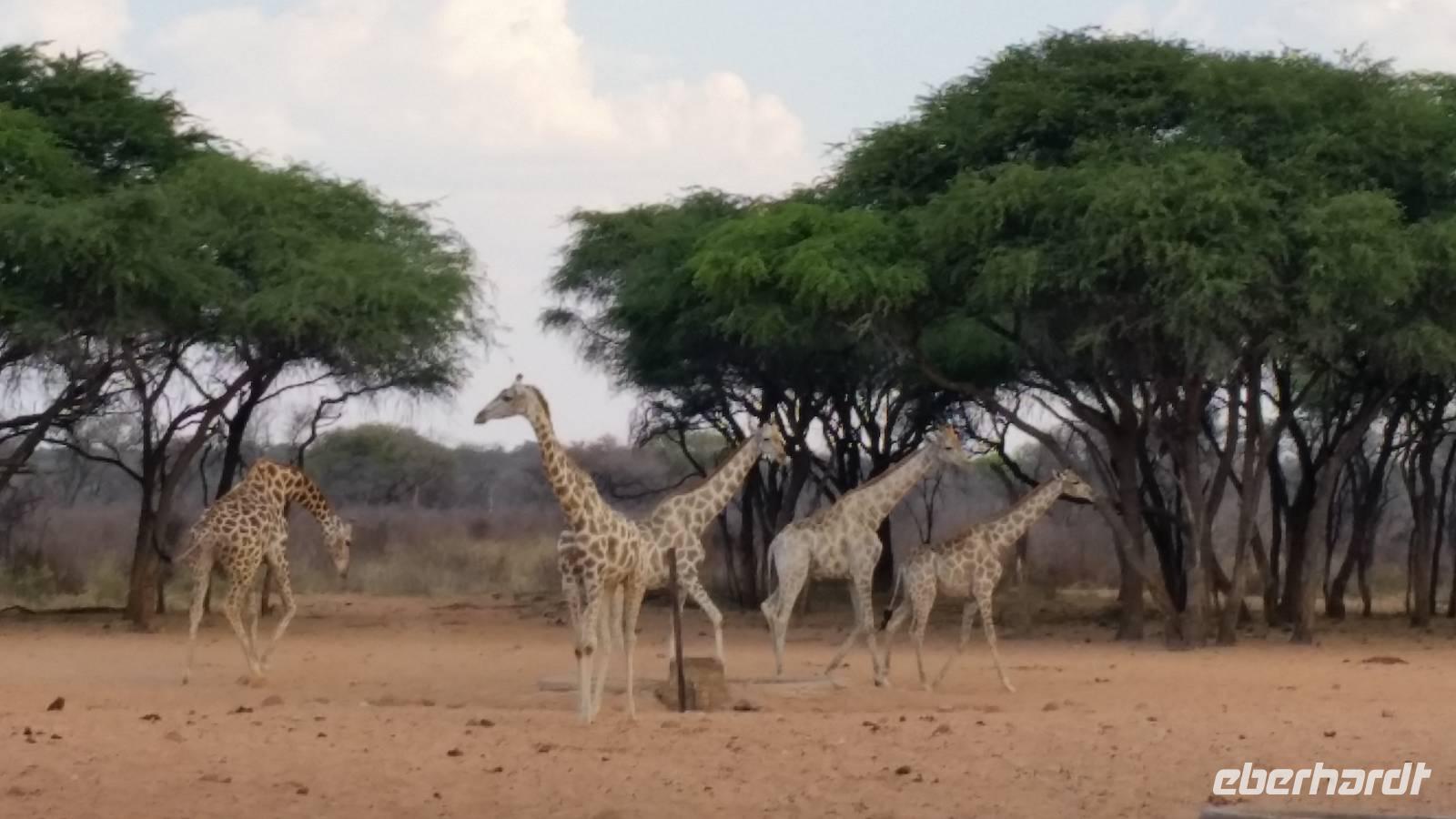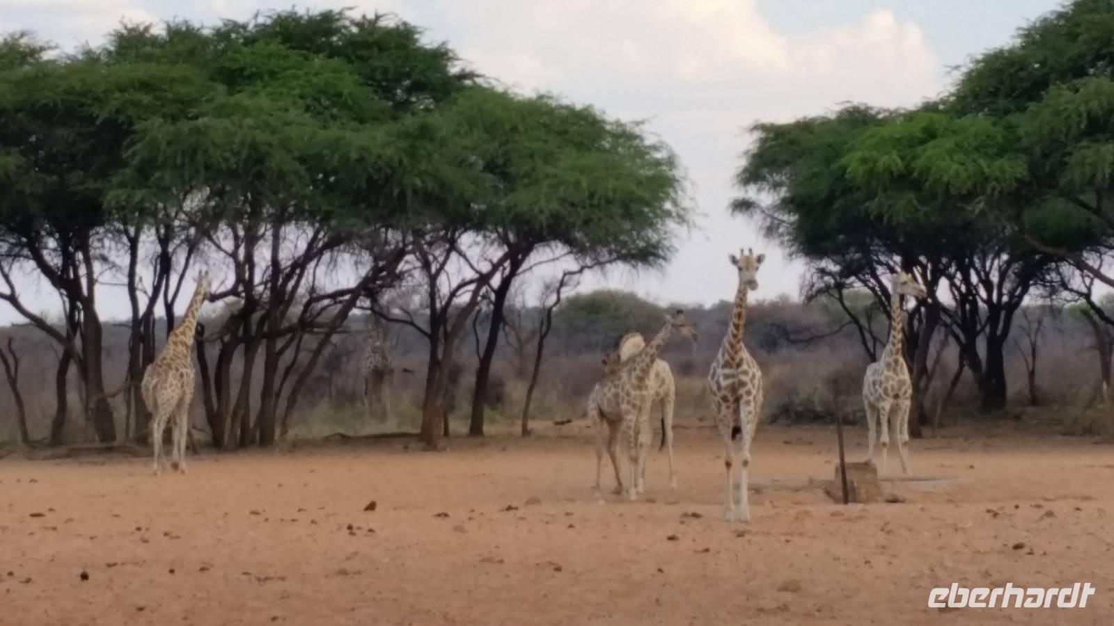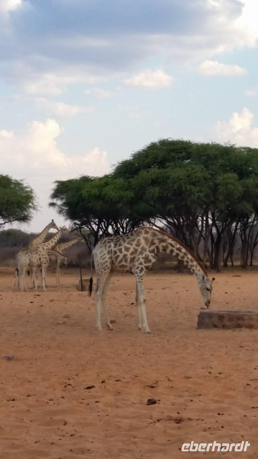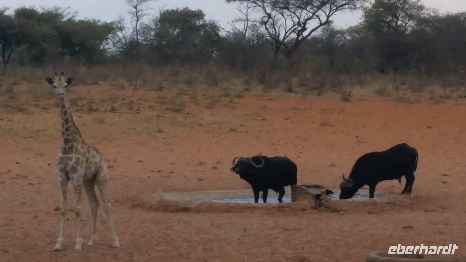 Im Camp nahmen wir dann unser Abendessen ein, bevor wir uns wieder mit Kameras und Wein ausgerüstet am Wasserloch trafen. Dort gab es dann auch einiges zu sehen: zuerst das Nashorn, dann die Giraffe dazu und schließlich der Elefant. Die Zeit verging wie im Fluge und es war an der Zeit schlafen zu gehen, denn in aller Frühe wollten wir wieder auf Pirsch gehen.