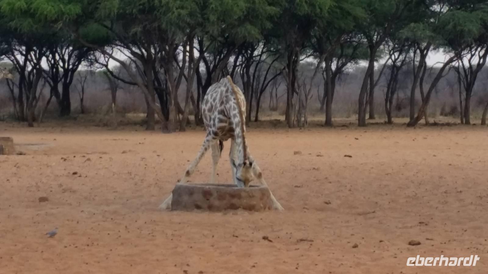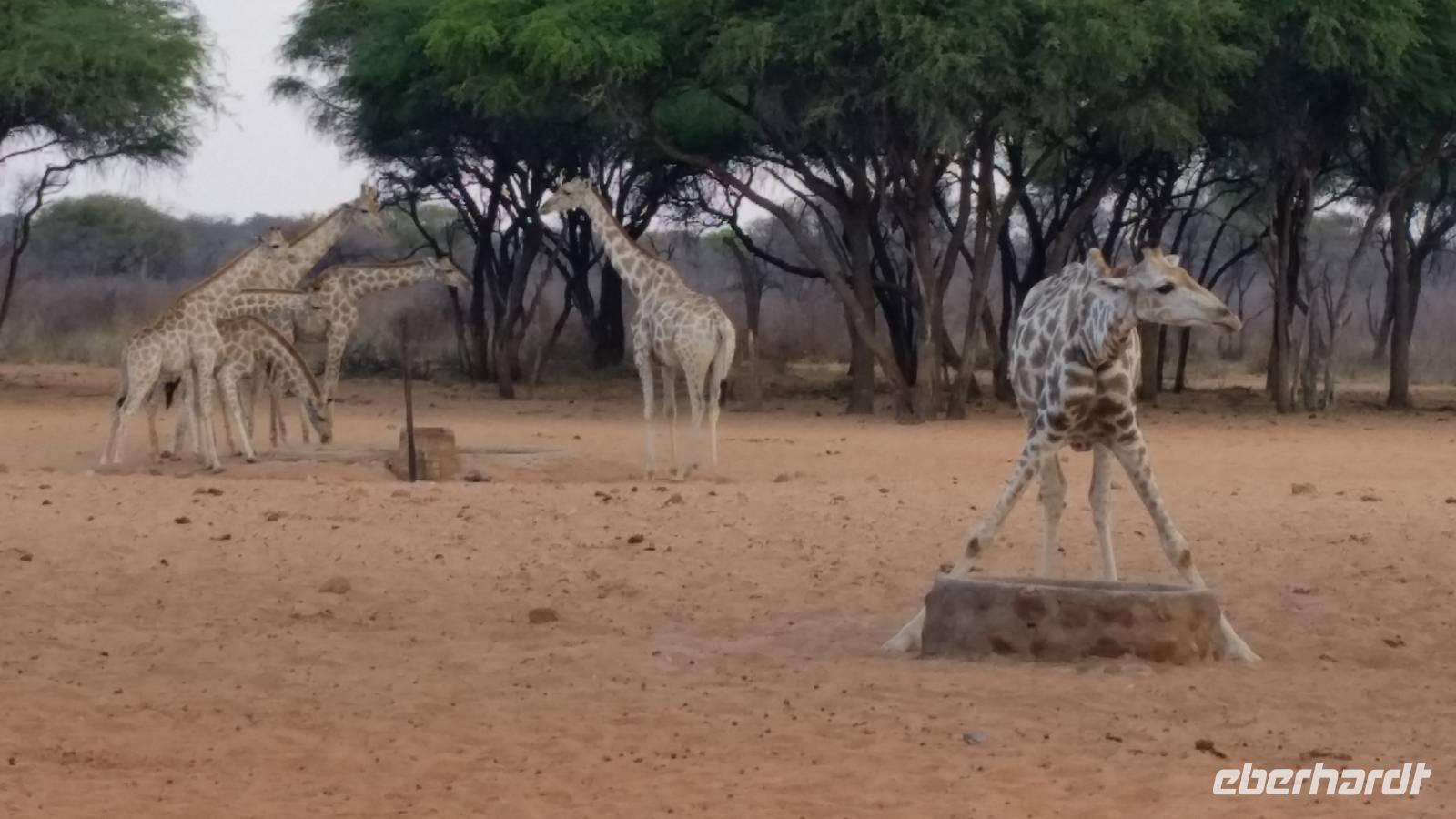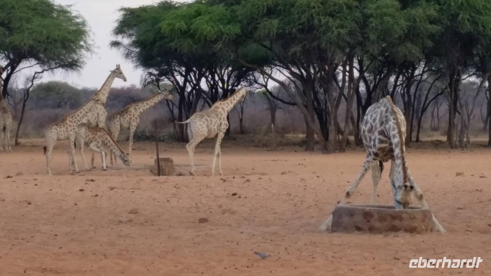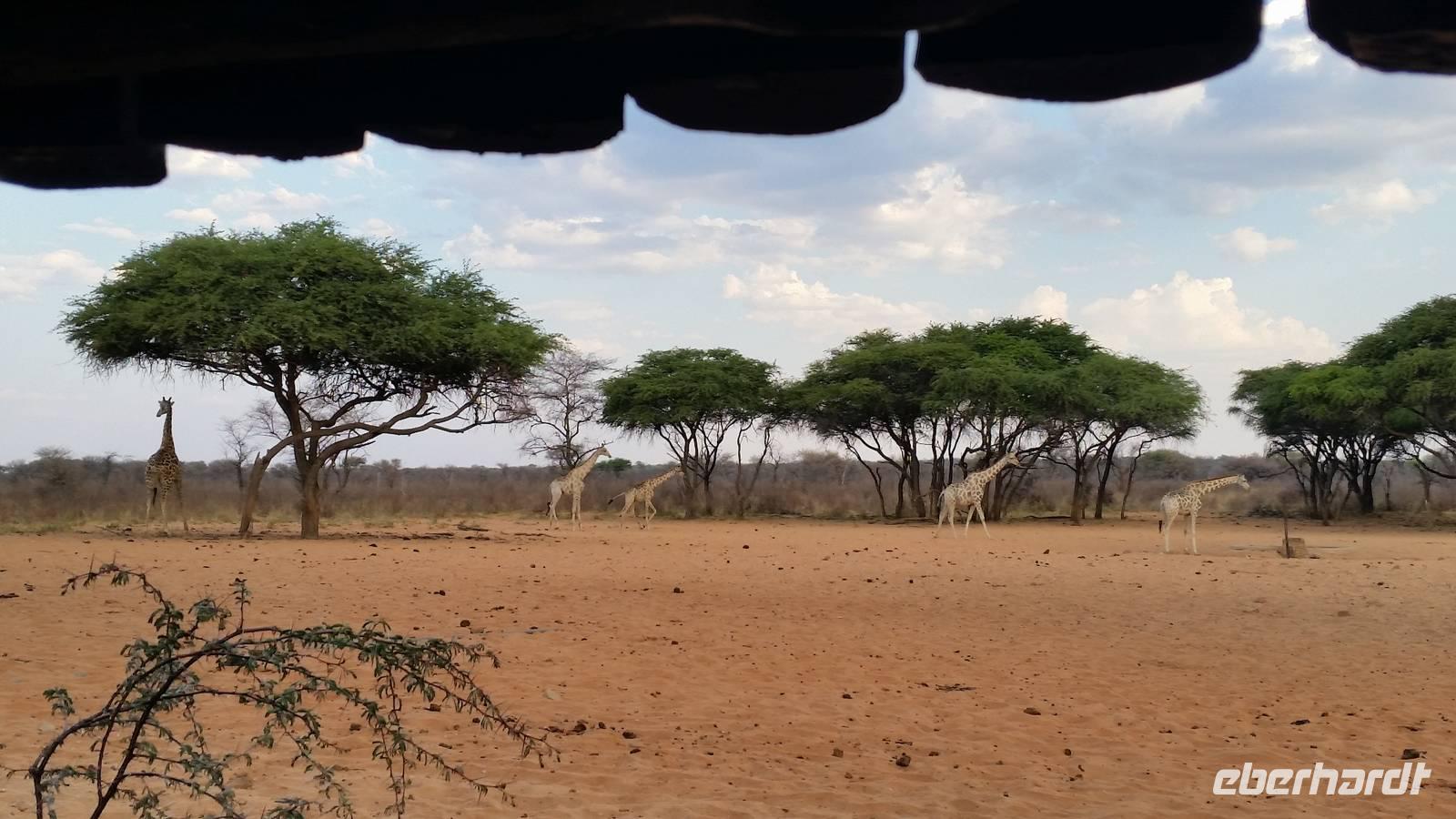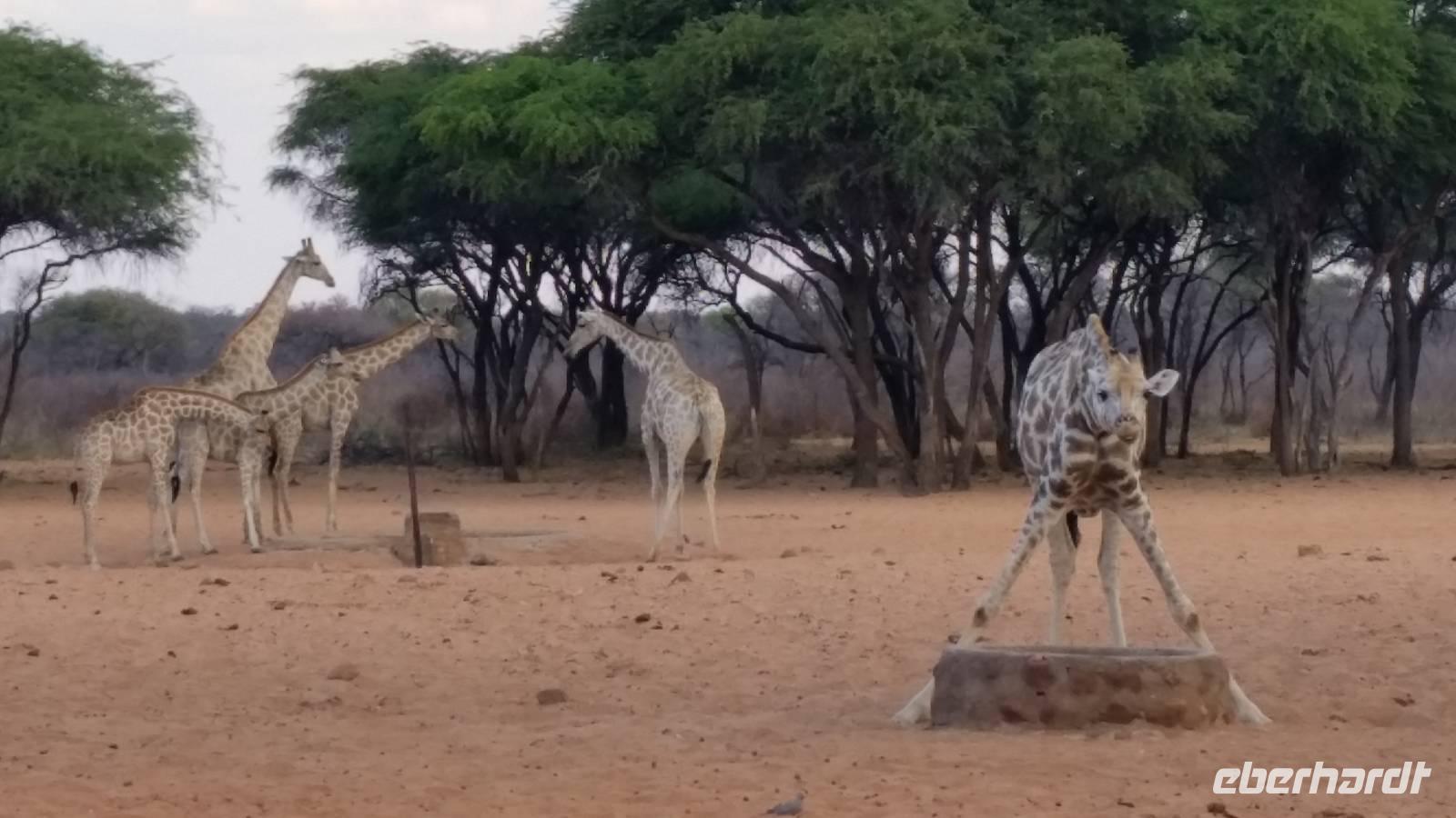 Im Camp nahmen wir dann unser Abendessen ein, bevor wir uns wieder mit Kameras und Wein ausgerüstet am Wasserloch trafen. Dort gab es dann auch einiges zu sehen: zuerst das Nashorn, dann die Giraffe dazu und schließlich der Elefant. Die Zeit verging wie im Fluge und es war an der Zeit schlafen zu gehen, denn in aller Frühe wollten wir wieder auf Pirsch gehen.
