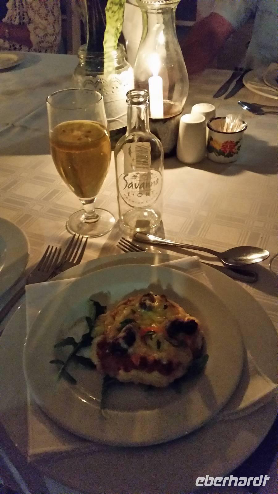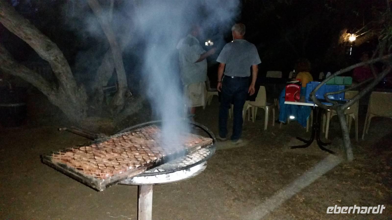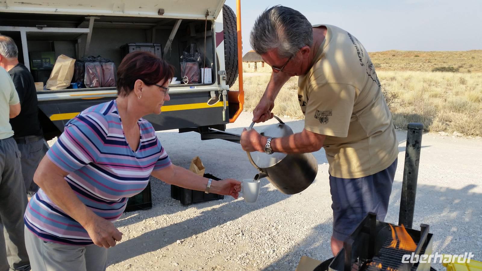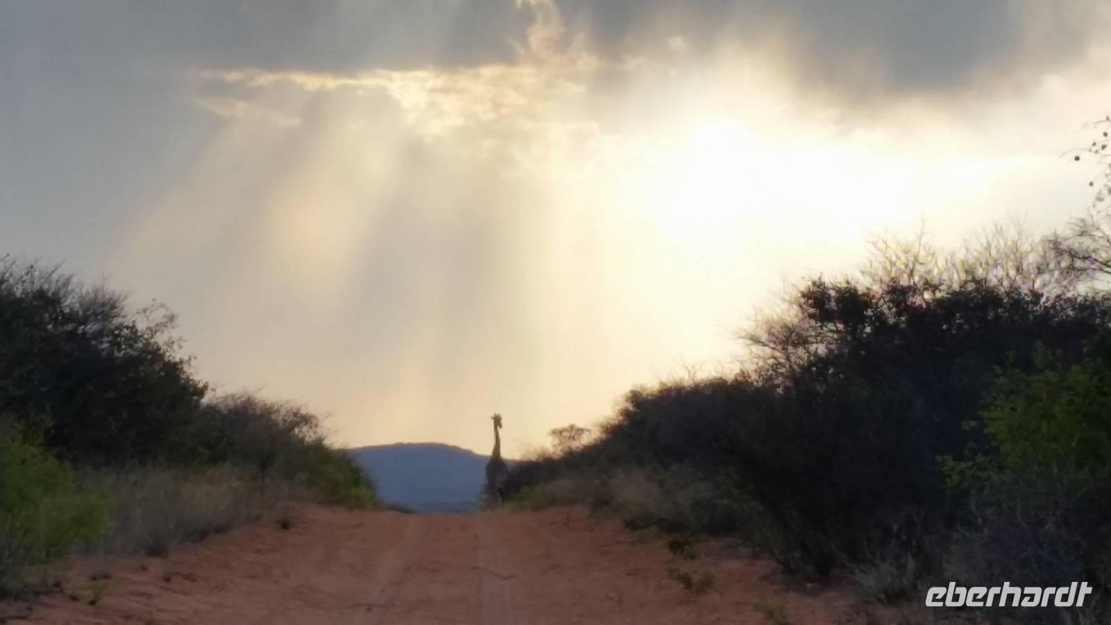 Im Camp nahmen wir dann unser Abendessen ein, bevor wir uns wieder mit Kameras und Wein ausgerüstet am Wasserloch trafen. Dort gab es dann auch einiges zu sehen: zuerst das Nashorn, dann die Giraffe dazu und schließlich der Elefant. Die Zeit verging wie im Fluge und es war an der Zeit schlafen zu gehen, denn in aller Frühe wollten wir wieder auf Pirsch gehen.