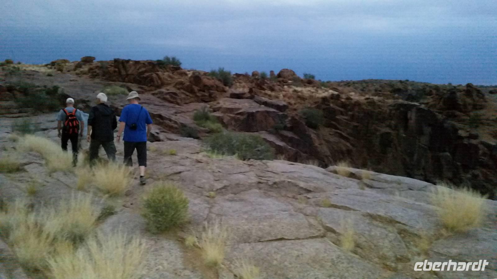 Ein Teil von uns krabbelte sogar bis ganz nach oben. Die Fotos sind auf alle Fälle einzigartig und keinesfalls langweilig geworden! Weiter sollte es nun gehen in das richtige Sossusvlei, aber auf Grund des Sturmes stimmte die Gruppe einstimmig dagegen mit den offenen Jeeps noch weiter hinein zu fahren. Wir machten uns nun auf den Weg zum Sesriem Canyon, zu Deutsch Sechs-Riemen-Canyon, da früher 6 Ochsenwagenriemen benötigt wurden, um das Wasser hochzuziehen. Dort spazierten wir ein Stück hinunter, währenddessen Tom und Scalla das Mittagessen vorbereiteten und nebenher noch einem anderen Kollegen aus der Patsche halfen. Gut gestärkt vom leckeren Reissalat ging es nun wieder zurück in unsere Lodge zum Entspannen am Nachmittag. Den Abend ließen wir, weil es gestern so schön war, auf dem Hausberg beim Sonnenuntergang ausklingen.