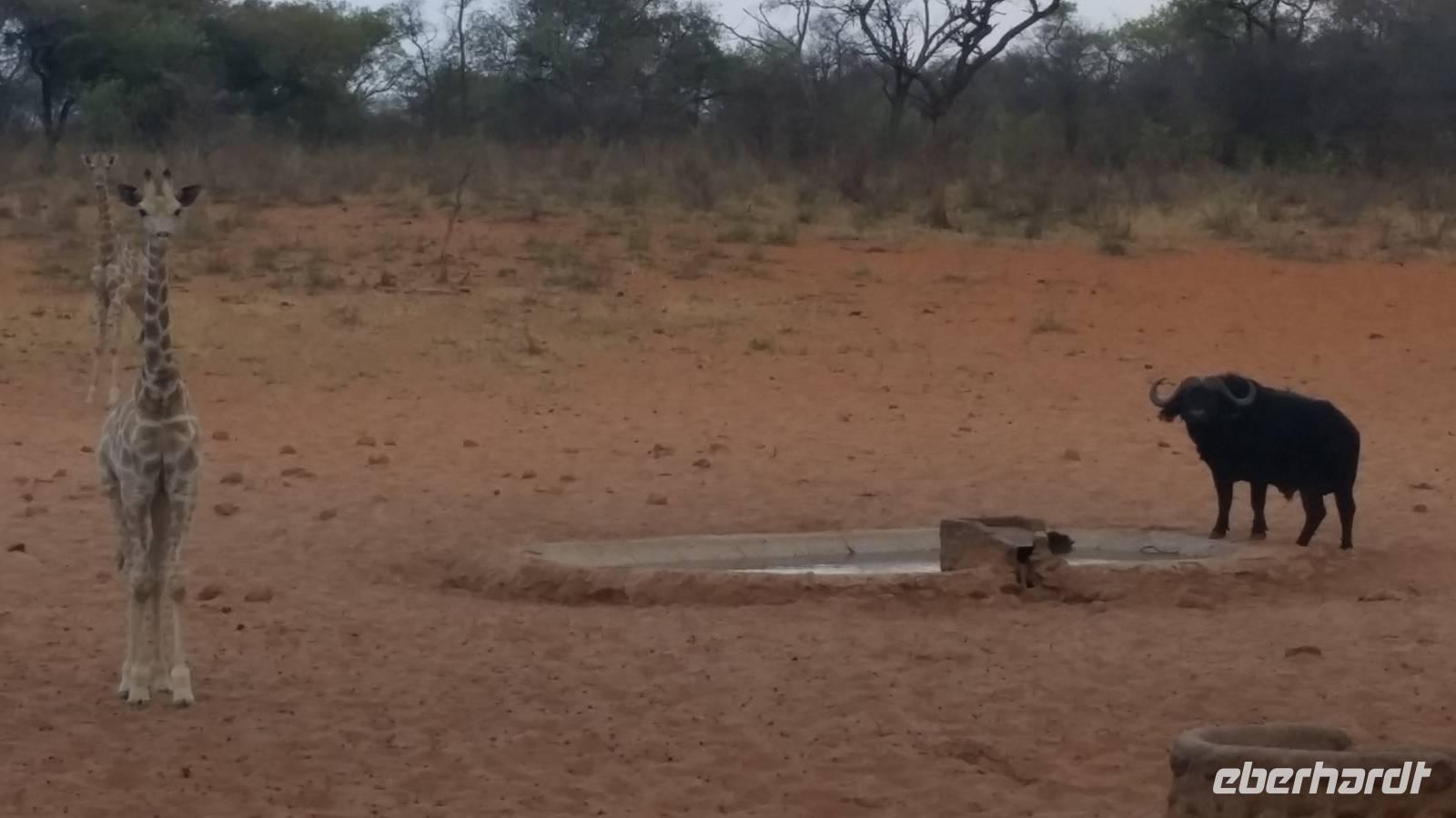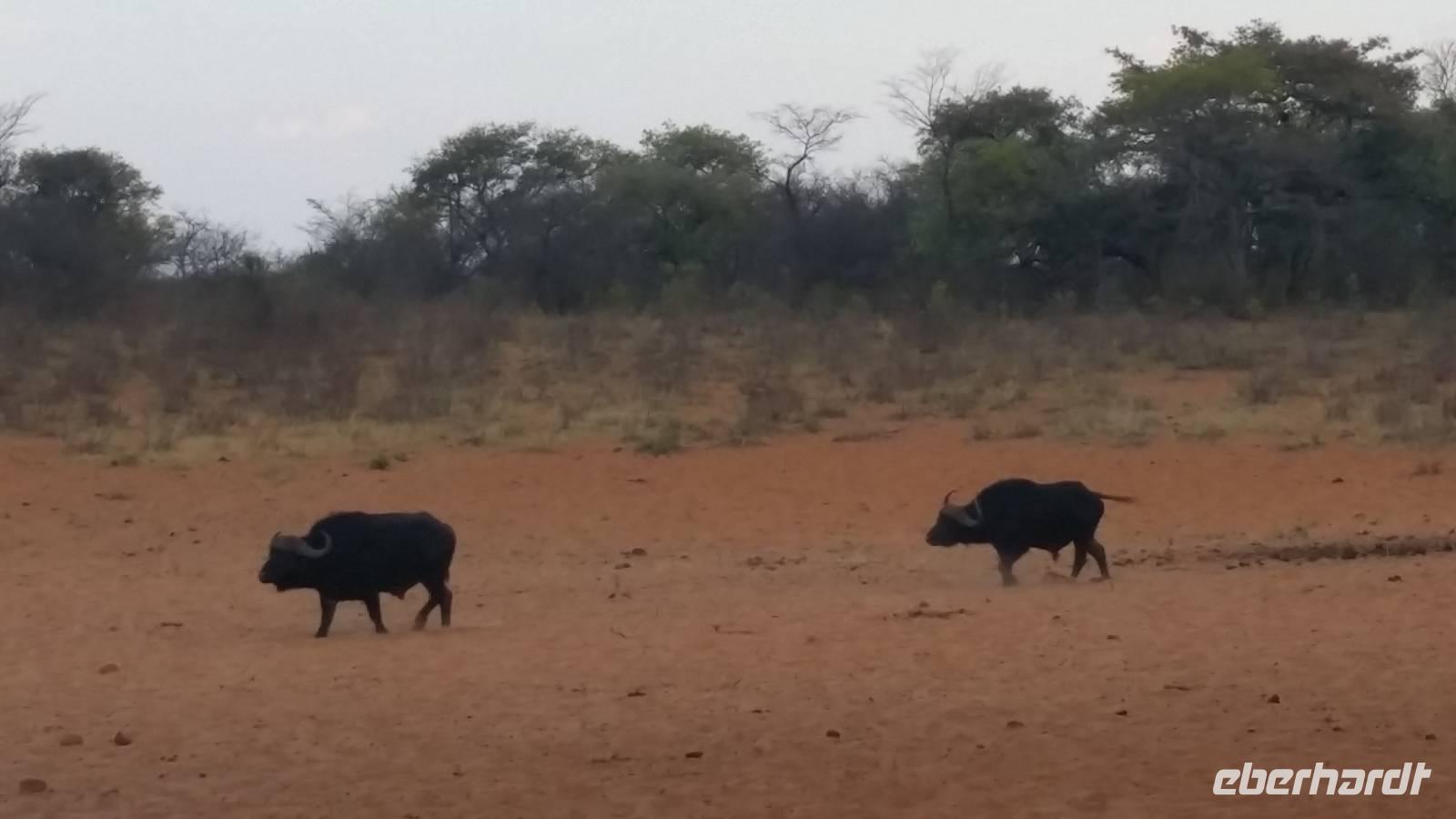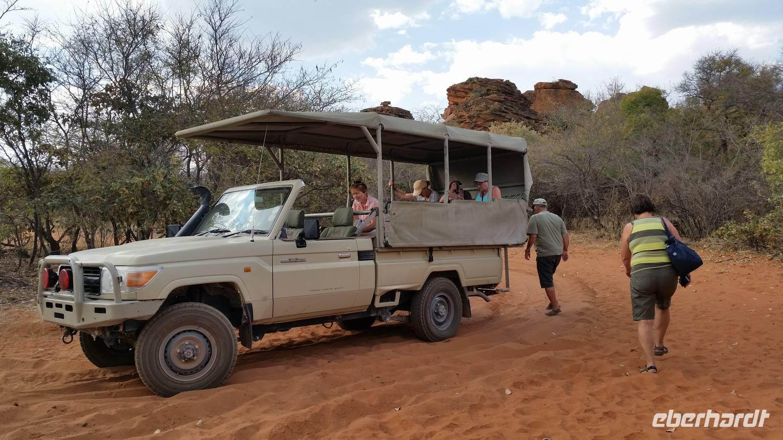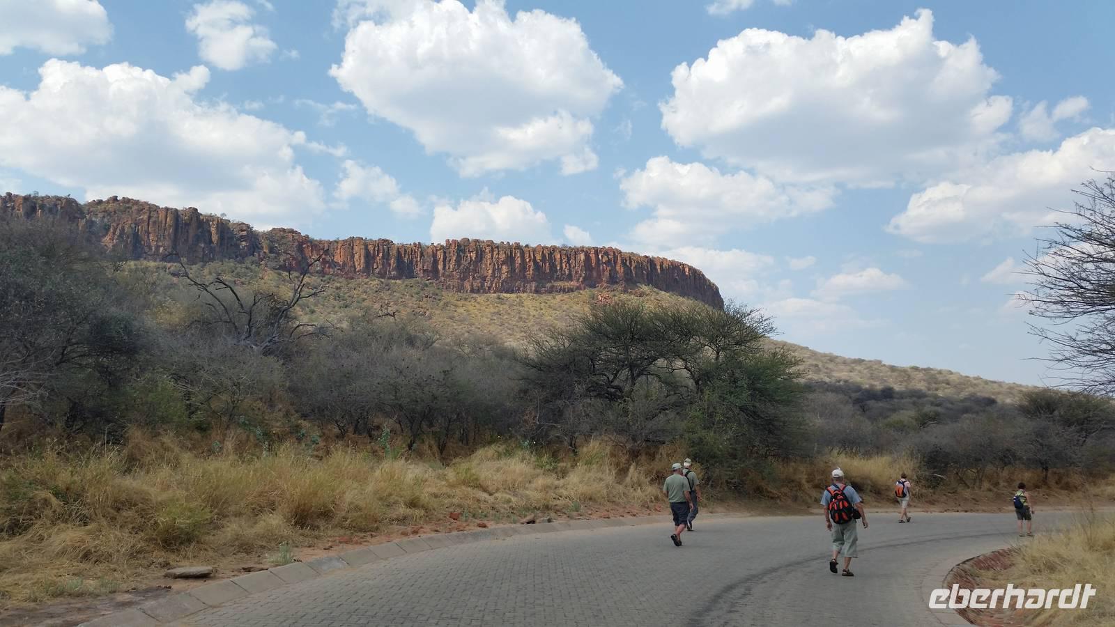 Noch vor dem Frühstück unternahmen wir eine kleine Wanderung zum Soldatenfriedhof, auf dem die gefallenen Kriegsopfer der Schlacht am Waterberg 1904 begraben waren. Unter anderem stammten diese Opfer aus Magdeburg, Zwickau oder Dresden. Danach stärkten wir uns bei einem leckeren Frühstück und konnten nun die Zeit bis zum gemeinsamen Picknick individuell gestalten. Ein Teil erwanderte das Waterberg-Gebiet noch etwas und hielt sich mit lautem Getöse die lästigen Paviane vom Hals, der andere Teil entspannte am Pool. Am Nachmittag fuhren wir dann im offenen Jeep auf das Waterberg-Plateau. Nach einem gigantischen Foto-Stopp mit Aussicht auf das weite, flache Land genossen wir die Rundfahrt mit unserem Guide Martin, der uns neben Nashörnern, Giraffen und Kudus sogar noch unentdeckte Tiere wie die Säbelantilope und die Elan-Antilope zeigte. Und dann hatten wir ja noch einen kleinen Wunsch: wir wollten die BigFive komplett haben und dafür fehlte uns der Büffel. Dies erklärten wir Martin und er versprach uns, welche zu finden. Und er hatte nicht zu viel versprochen: am dritten Wasserloch kamen endlich zwei dieser mächtigen Tiere zur Tränke! BINGO! Auftrag erfüllt! Nun konnte es ganz entspannt wieder zurück ins Camp gehen, wo wir Tom gleich von unseren Erfolgen berichteten...