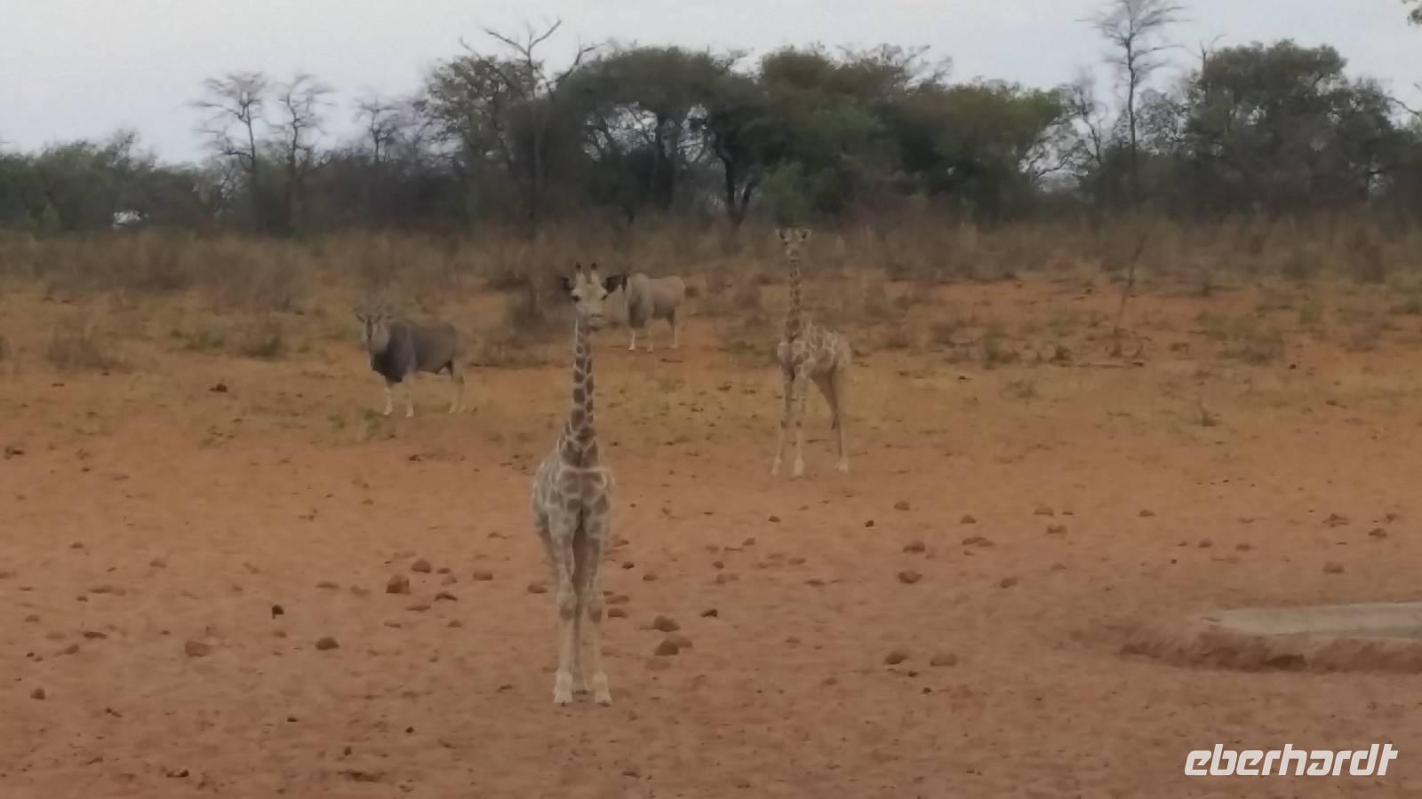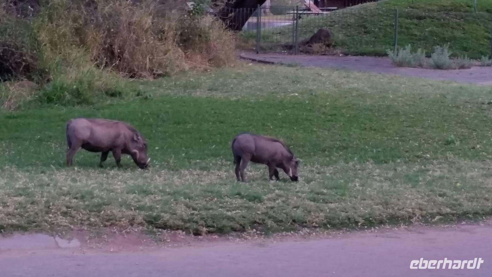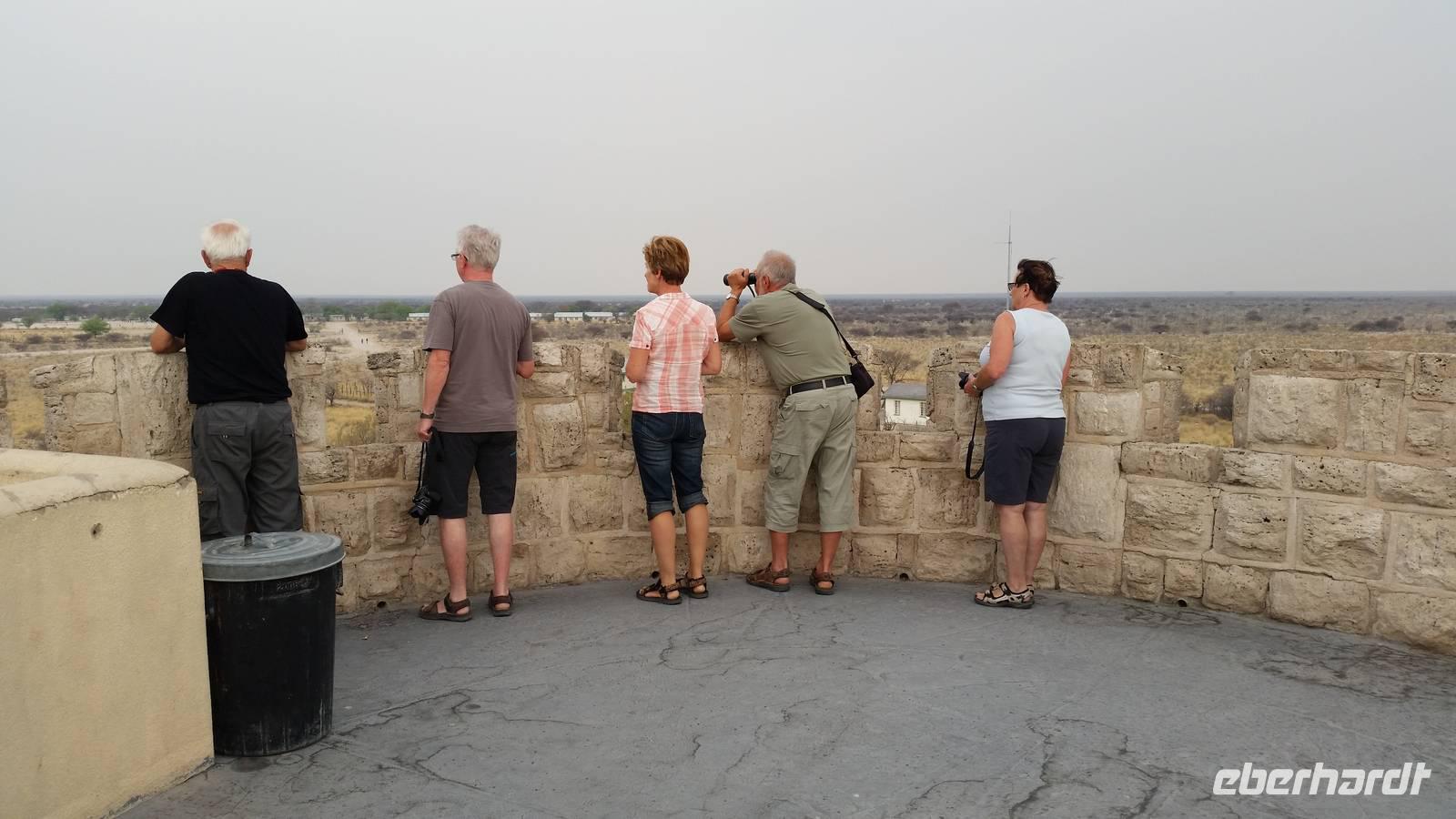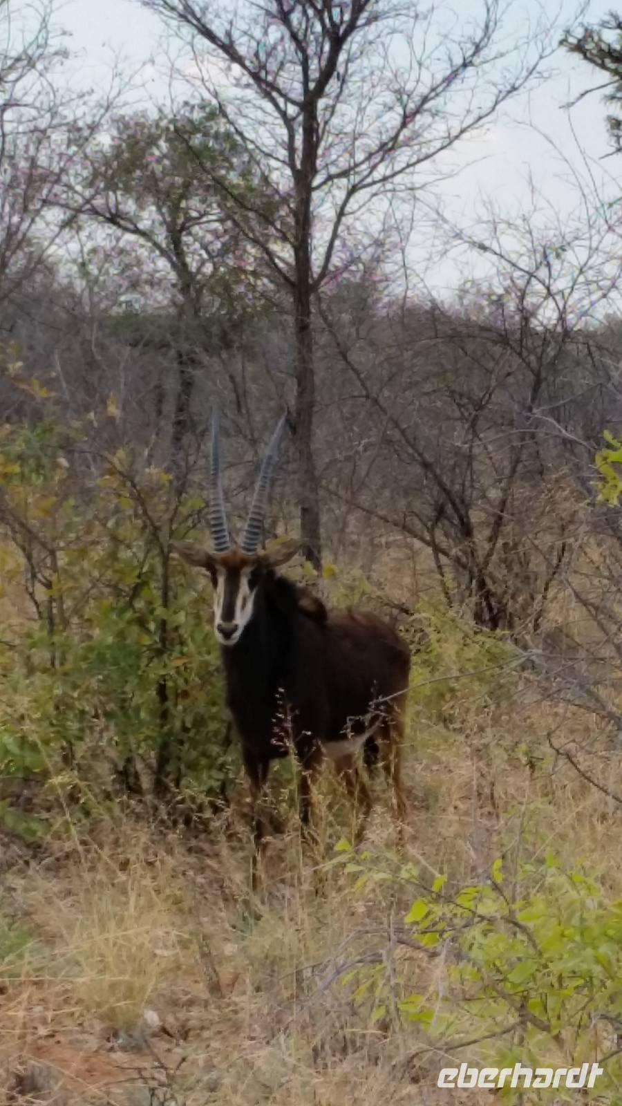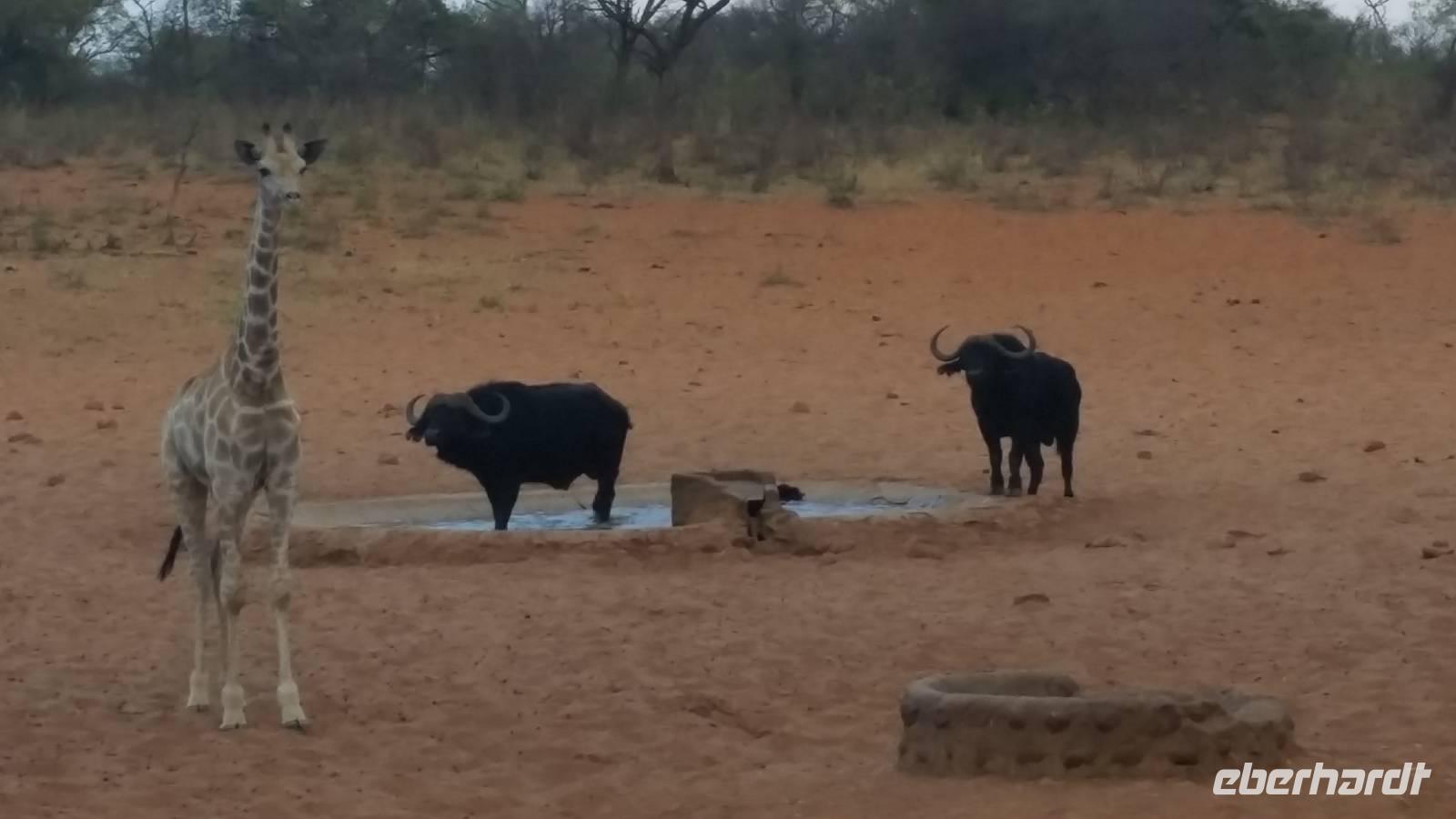 Noch vor dem Frühstück unternahmen wir eine kleine Wanderung zum Soldatenfriedhof, auf dem die gefallenen Kriegsopfer der Schlacht am Waterberg 1904 begraben waren. Unter anderem stammten diese Opfer aus Magdeburg, Zwickau oder Dresden. Danach stärkten wir uns bei einem leckeren Frühstück und konnten nun die Zeit bis zum gemeinsamen Picknick individuell gestalten. Ein Teil erwanderte das Waterberg-Gebiet noch etwas und hielt sich mit lautem Getöse die lästigen Paviane vom Hals, der andere Teil entspannte am Pool. Am Nachmittag fuhren wir dann im offenen Jeep auf das Waterberg-Plateau. Nach einem gigantischen Foto-Stopp mit Aussicht auf das weite, flache Land genossen wir die Rundfahrt mit unserem Guide Martin, der uns neben Nashörnern, Giraffen und Kudus sogar noch unentdeckte Tiere wie die Säbelantilope und die Elan-Antilope zeigte. Und dann hatten wir ja noch einen kleinen Wunsch: wir wollten die BigFive komplett haben und dafür fehlte uns der Büffel. Dies erklärten wir Martin und er versprach uns, welche zu finden. Und er hatte nicht zu viel versprochen: am dritten Wasserloch kamen endlich zwei dieser mächtigen Tiere zur Tränke! BINGO! Auftrag erfüllt! Nun konnte es ganz entspannt wieder zurück ins Camp gehen, wo wir Tom gleich von unseren Erfolgen berichteten...