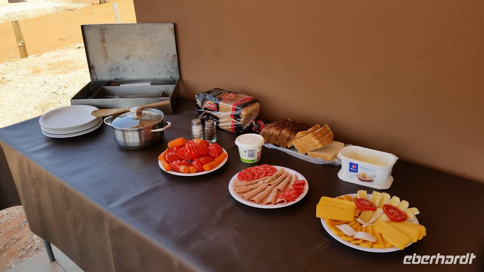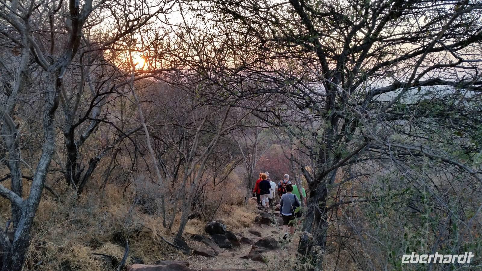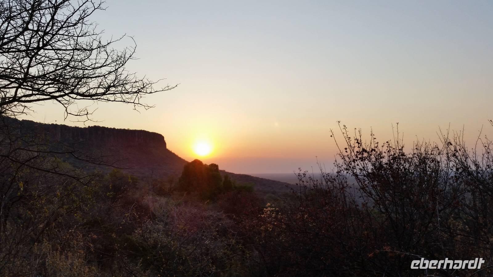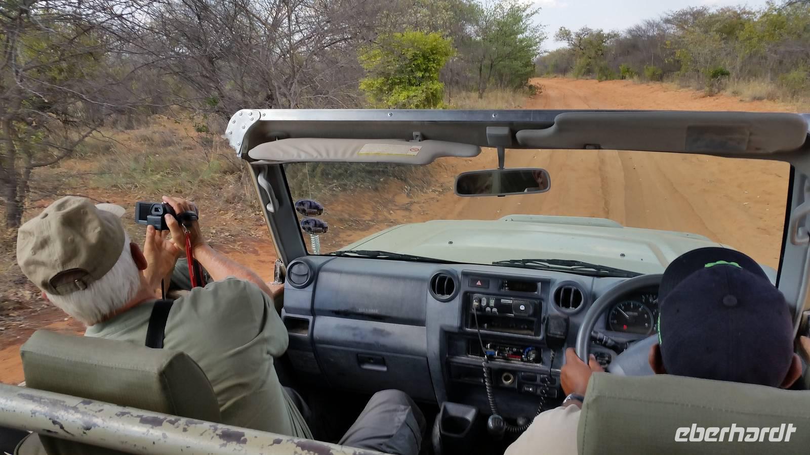Noch vor dem Frühstück unternahmen wir eine kleine Wanderung zum Soldatenfriedhof, auf dem die gefallenen Kriegsopfer der Schlacht am Waterberg 1904 begraben waren. Unter anderem stammten diese Opfer aus Magdeburg, Zwickau oder Dresden. Danach stärkten wir uns bei einem leckeren Frühstück und konnten nun die Zeit bis zum gemeinsamen Picknick individuell gestalten. Ein Teil erwanderte das Waterberg-Gebiet noch etwas und hielt sich mit lautem Getöse die lästigen Paviane vom Hals, der andere Teil entspannte am Pool. Am Nachmittag fuhren wir dann im offenen Jeep auf das Waterberg-Plateau. Nach einem gigantischen Foto-Stopp mit Aussicht auf das weite, flache Land genossen wir die Rundfahrt mit unserem Guide Martin, der uns neben Nashörnern, Giraffen und Kudus sogar noch unentdeckte Tiere wie die Säbelantilope und die Elan-Antilope zeigte. Und dann hatten wir ja noch einen kleinen Wunsch: wir wollten die BigFive komplett haben und dafür fehlte uns der Büffel. Dies erklärten wir Martin und er versprach uns, welche zu finden. Und er hatte nicht zu viel versprochen: am dritten Wasserloch kamen endlich zwei dieser mächtigen Tiere zur Tränke! BINGO! Auftrag erfüllt! Nun konnte es ganz entspannt wieder zurück ins Camp gehen, wo wir Tom gleich von unseren Erfolgen berichteten...