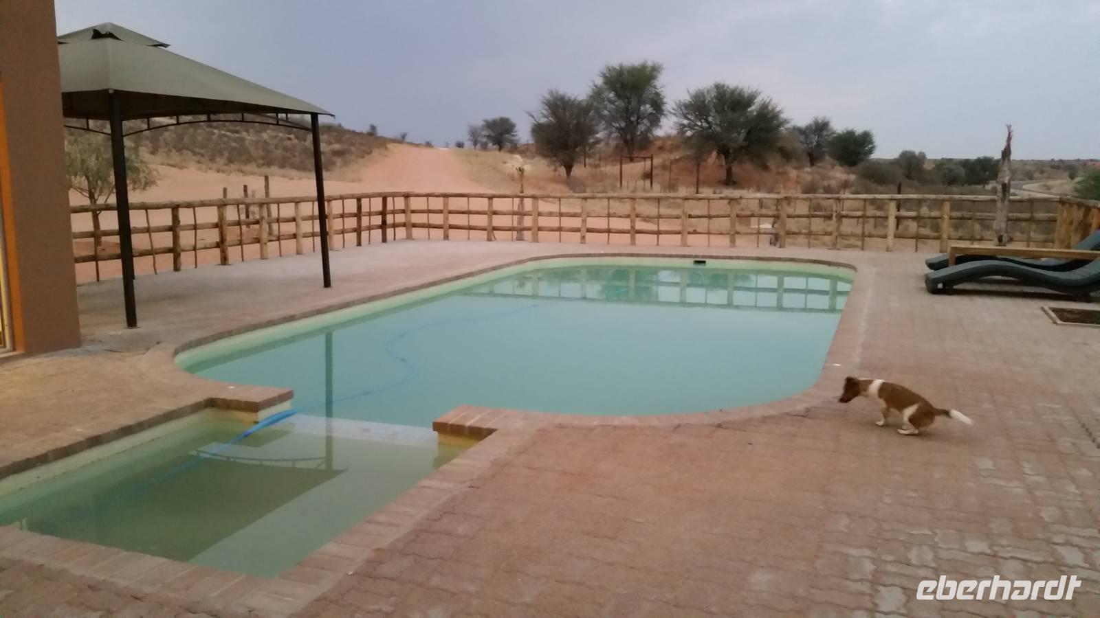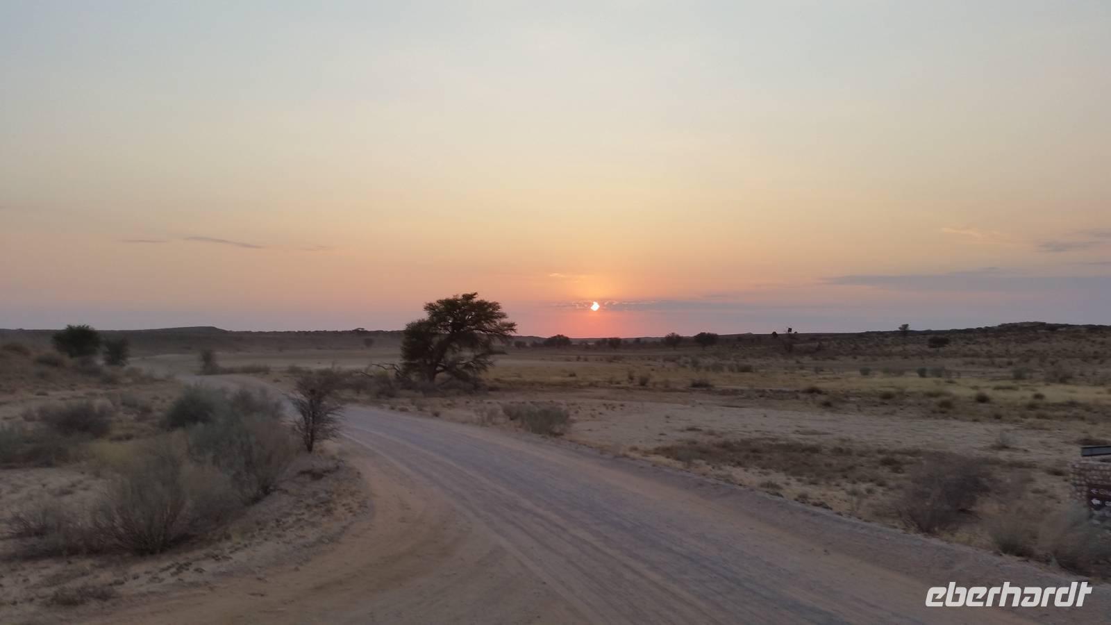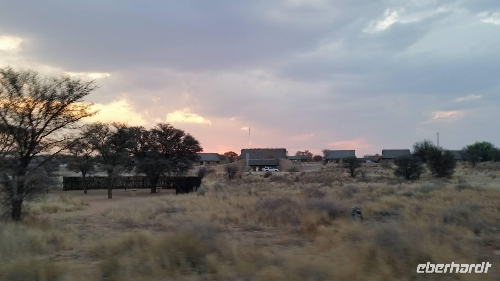 Nachdem Tom und ich mit einigen Gästen die Wanderung auf dem Dassi-Trail absolviert hatten, stärkten wir uns erst einmal bei einem leckeren, hausgemachten Frühstück. Dann packten wir wieder alle sieben Sachen zusammen und machten uns auf die weitere Strecke in die Kalahari. Ziel war der 38.000 km2 große Kgalagadi Transfrontier Park, der erste grenzüberschreitende Park Afrikas. Zwischendurch stoppten wir in Upington, um unsere Picknick-Vorräte aufzufrischen. Am späten Nachmittag kamen wir schließlich an unserem Ziel an und gingen schon auf eine kurze Pirschfahrt in den Park. Die kleine „Schnuppertour" war durchaus erfolgreich, denn wir sahen Springböcke, Antilopen, Strauße und sogar eine Löwin und ihr Junges. Dann setzte bereits die Dämmerung ein und wir mussten leider den Park schon wieder verlassen. Aber wir freuten uns schon alle auf die ganztägige Pirschfahrt!