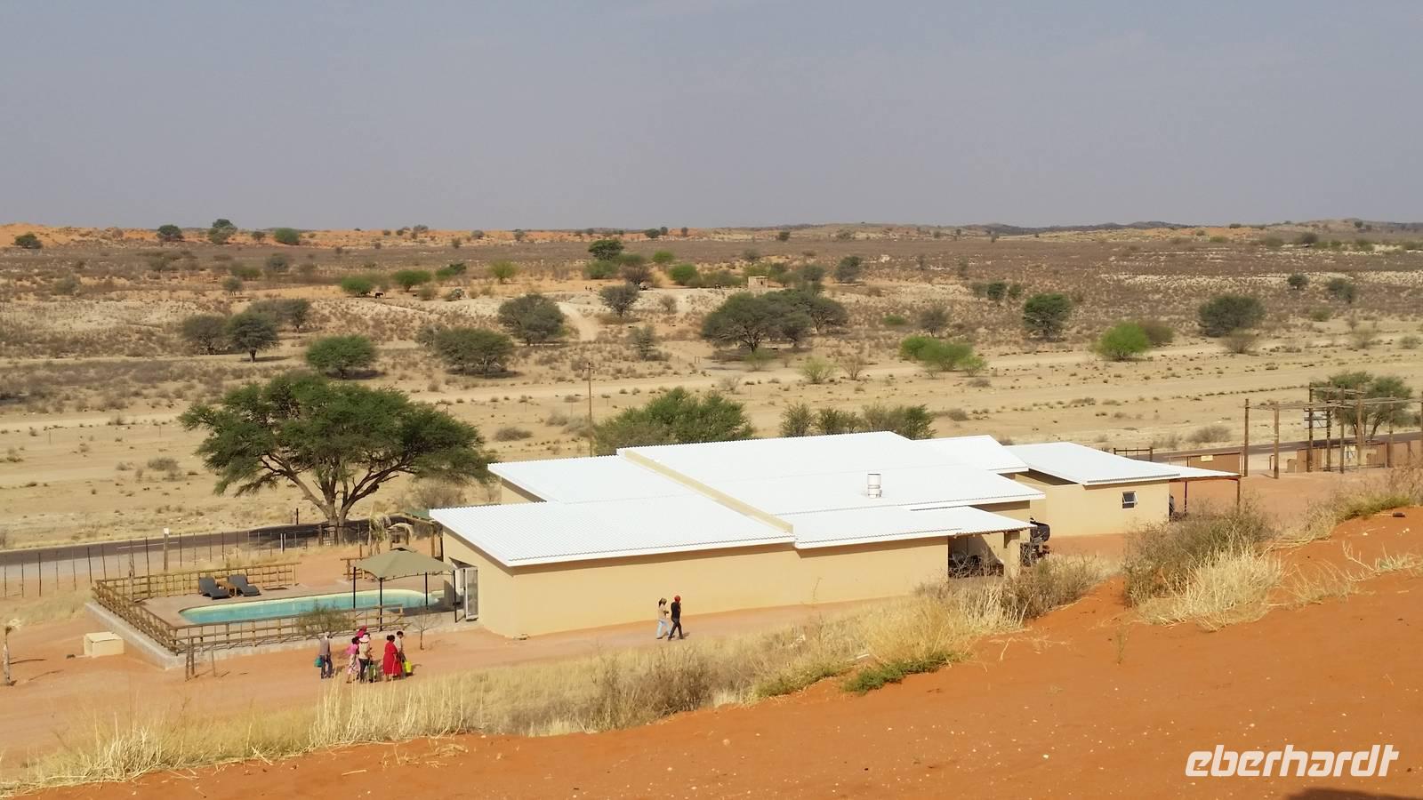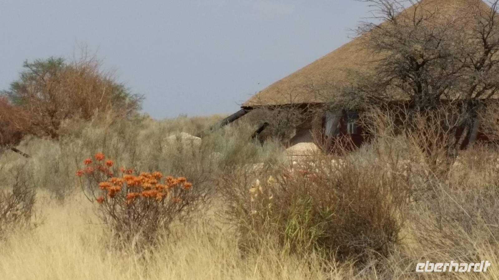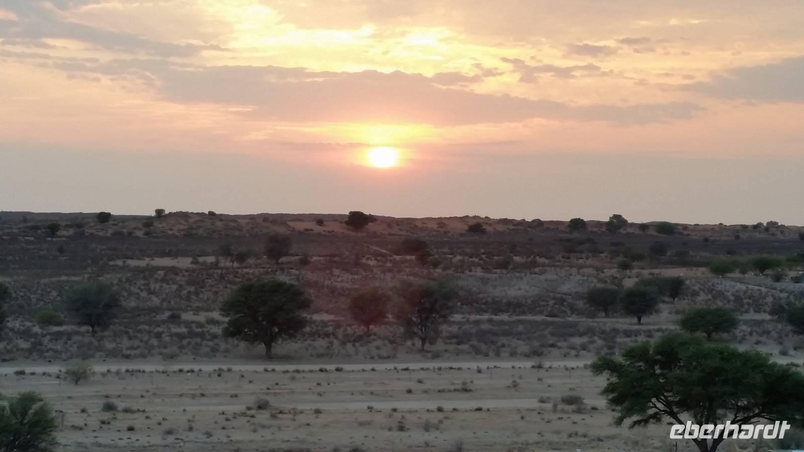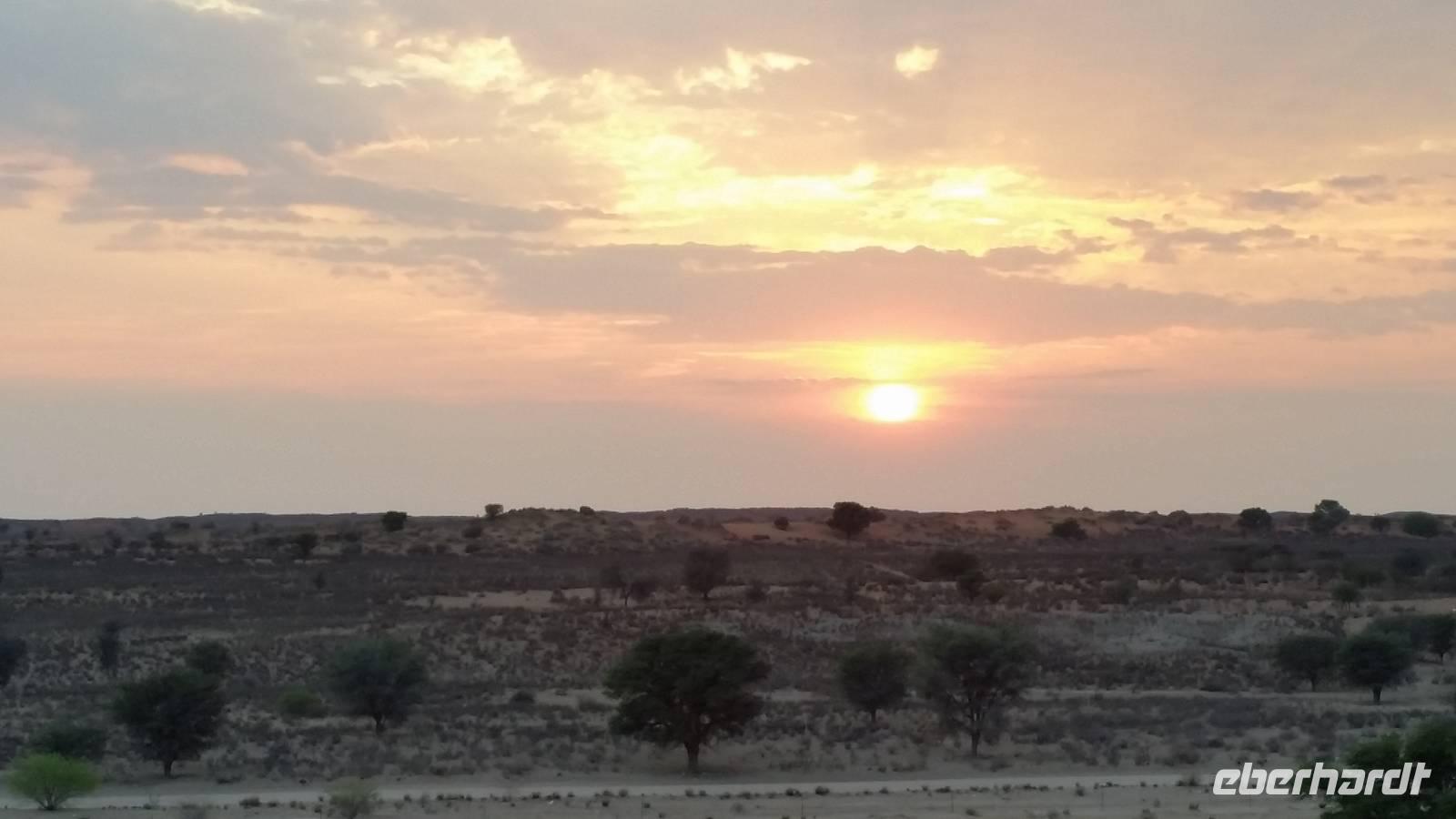 Nachdem Tom und ich mit einigen Gästen die Wanderung auf dem Dassi-Trail absolviert hatten, stärkten wir uns erst einmal bei einem leckeren, hausgemachten Frühstück. Dann packten wir wieder alle sieben Sachen zusammen und machten uns auf die weitere Strecke in die Kalahari. Ziel war der 38.000 km2 große Kgalagadi Transfrontier Park, der erste grenzüberschreitende Park Afrikas. Zwischendurch stoppten wir in Upington, um unsere Picknick-Vorräte aufzufrischen. Am späten Nachmittag kamen wir schließlich an unserem Ziel an und gingen schon auf eine kurze Pirschfahrt in den Park. Die kleine „Schnuppertour" war durchaus erfolgreich, denn wir sahen Springböcke, Antilopen, Strauße und sogar eine Löwin und ihr Junges. Dann setzte bereits die Dämmerung ein und wir mussten leider den Park schon wieder verlassen. Aber wir freuten uns schon alle auf die ganztägige Pirschfahrt!