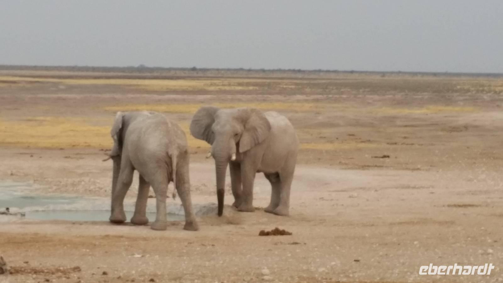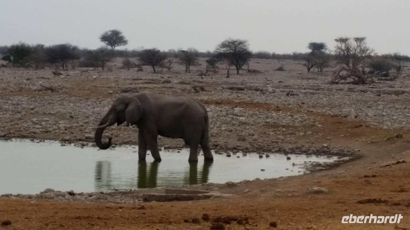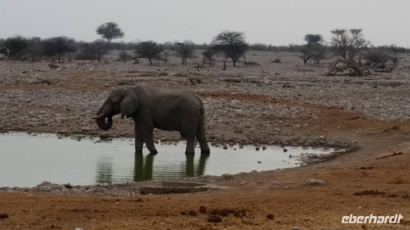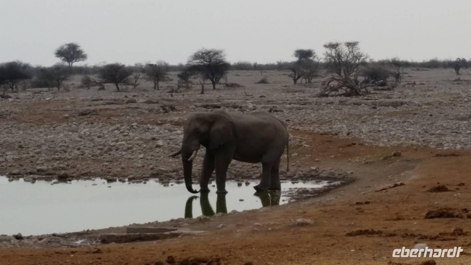 Die Zeichen auf Erfolg standen am heutigen Tag gar nicht so gut. In der Nacht setzte Regen ein, keine gute Voraussetzung um viele Tiere an den Wasserlöchern im Nationalpark zu sehen. Aber wir sind ja alle Optimisten, und so sahen wir den Regen positiv - denn dann staubten die Straßen nicht so. Also starteten wir wie geplant ganz früh und der Regen hatte sich mittlerweile auch schon wieder verzogen. Wir peilten dieselbe Stelle wie gestern Nachmittag an in der Hoffnung die Löwen dort nochmal anzutreffen. Und siehe da! Bingo! Da waren sie und dieses Mal nicht so träge und müde! Weiter ging es in den Park und wir bekamen eine Menge Tiere zu Gesicht: Kudus, Gnus, Zebras, Giraffen, eine Herde Elefanten, eine Straußenfamilie und sogar einen Leoparden und Geparden! Volle Punktzahl, mehr war fast nicht machbar. Da es im Etosha-Park keine Büffel gibt, waren die BIG5 leider unerreichbar, aber unser Kampfgeist war geweckt, die noch fehlende „5. Trophäe" im Waterberg-Park zu erhaschen!