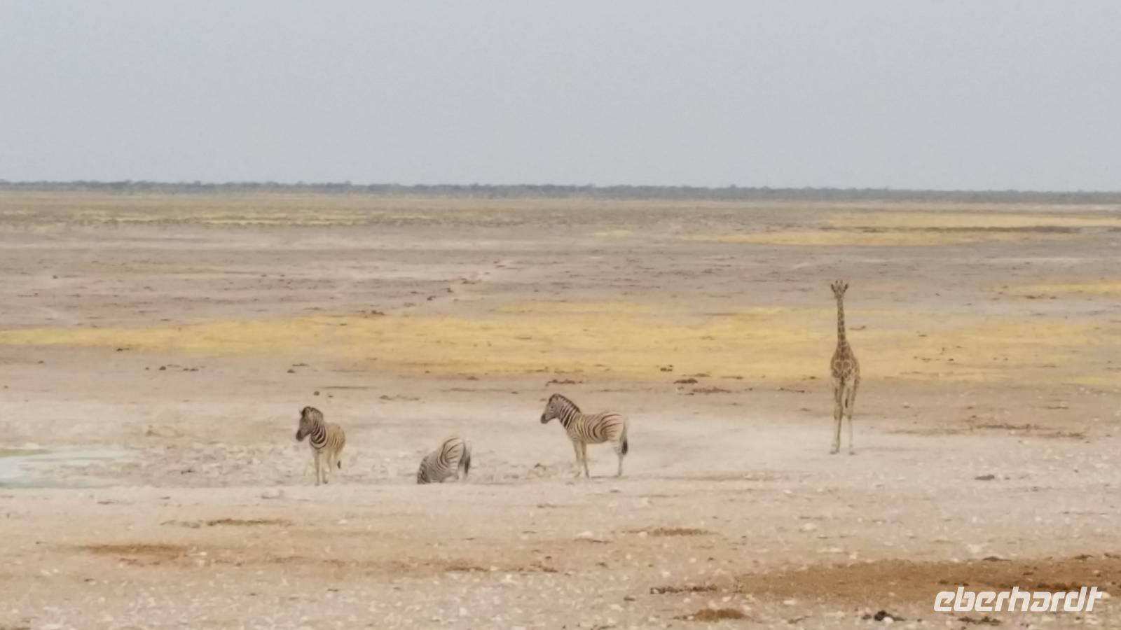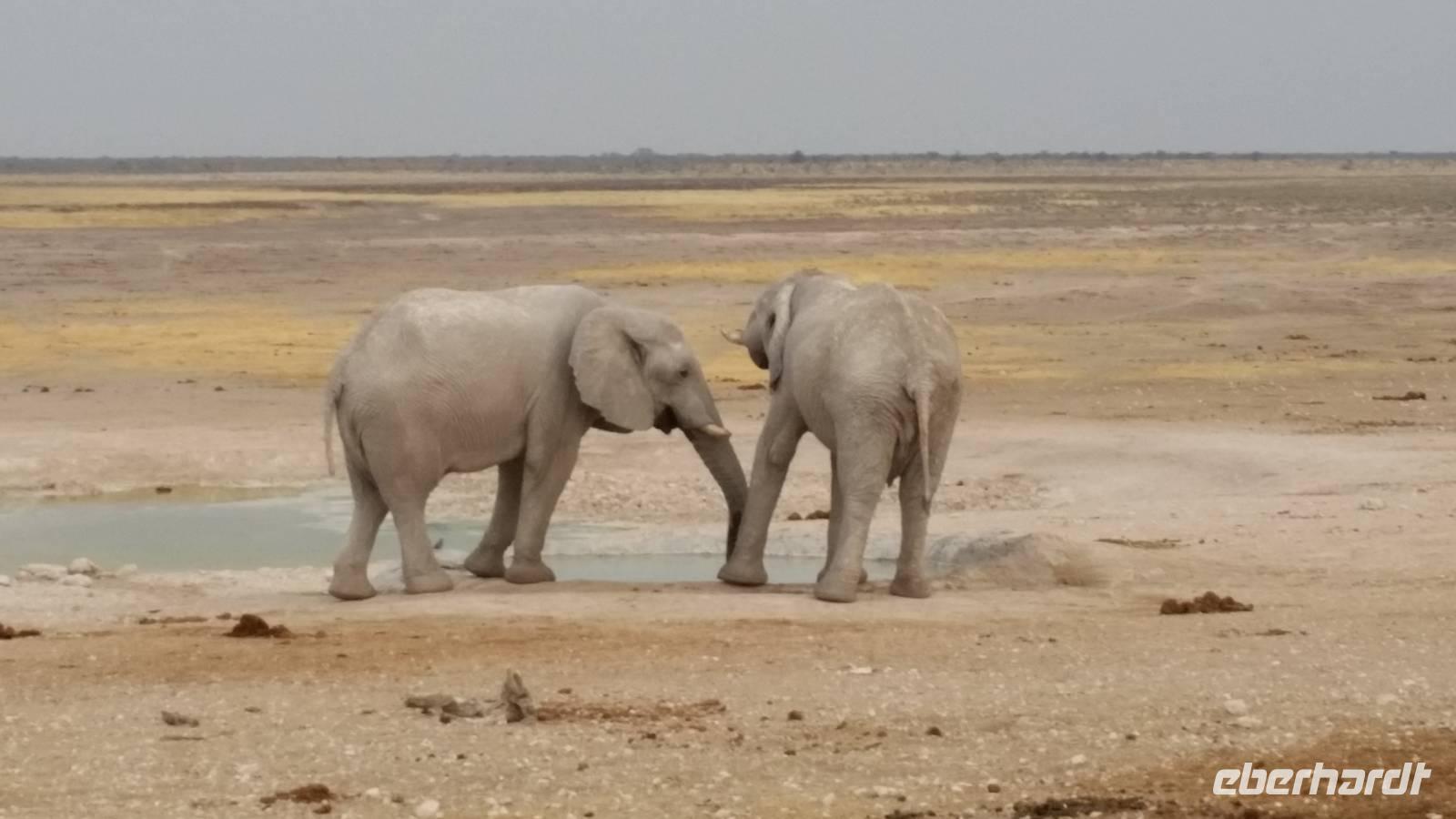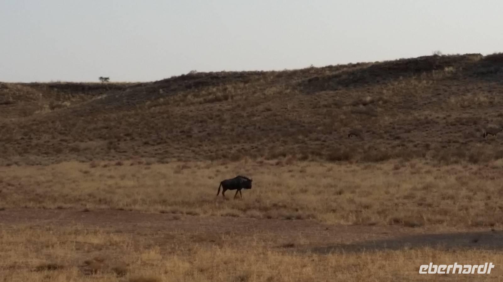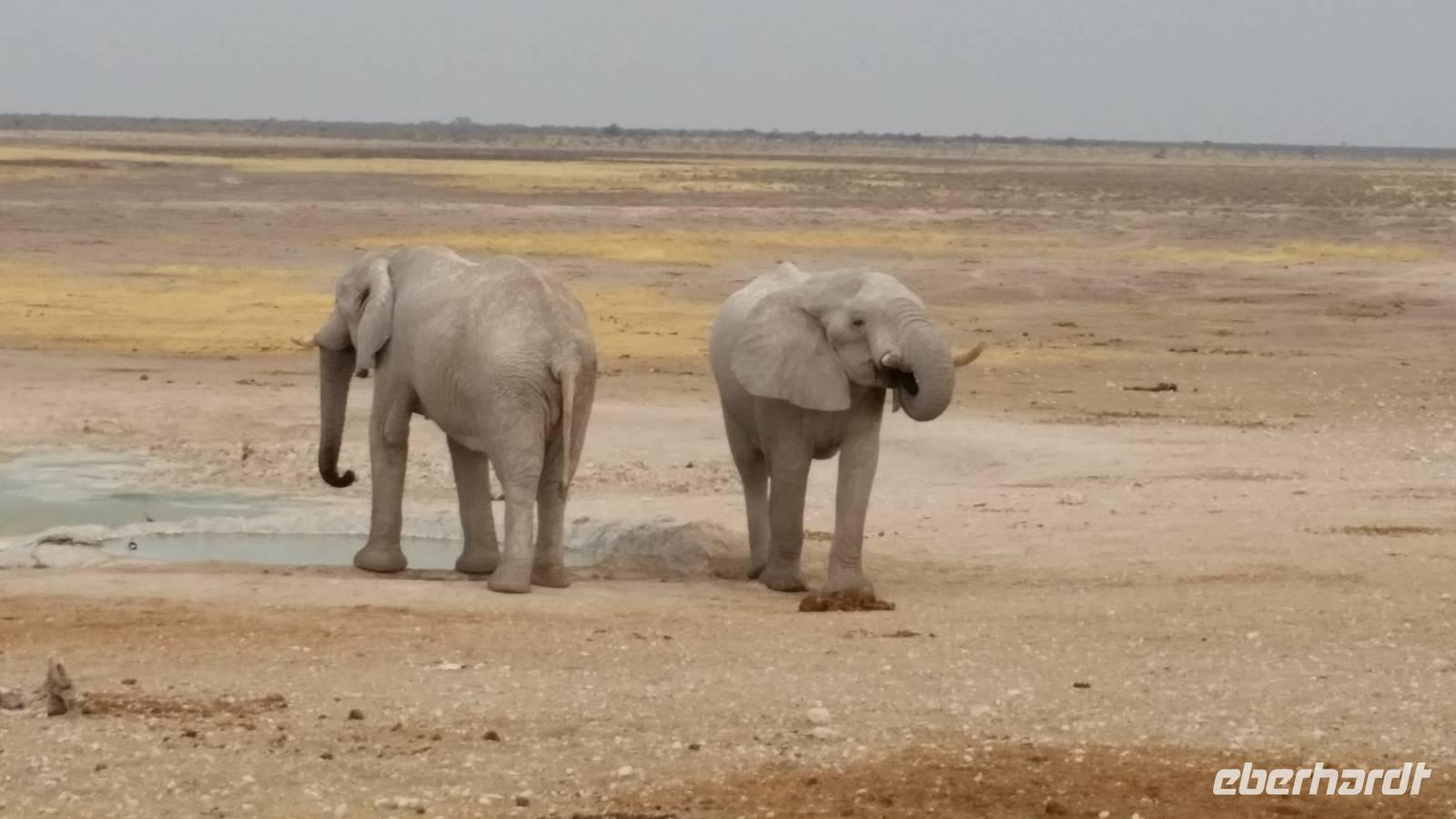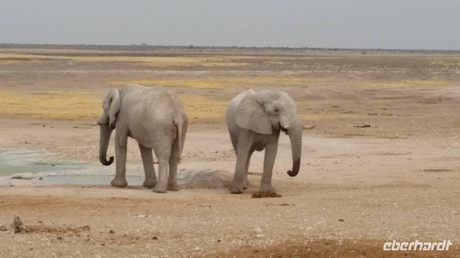 Die Zeichen auf Erfolg standen am heutigen Tag gar nicht so gut. In der Nacht setzte Regen ein, keine gute Voraussetzung um viele Tiere an den Wasserlöchern im Nationalpark zu sehen. Aber wir sind ja alle Optimisten, und so sahen wir den Regen positiv - denn dann staubten die Straßen nicht so. Also starteten wir wie geplant ganz früh und der Regen hatte sich mittlerweile auch schon wieder verzogen. Wir peilten dieselbe Stelle wie gestern Nachmittag an in der Hoffnung die Löwen dort nochmal anzutreffen. Und siehe da! Bingo! Da waren sie und dieses Mal nicht so träge und müde! Weiter ging es in den Park und wir bekamen eine Menge Tiere zu Gesicht: Kudus, Gnus, Zebras, Giraffen, eine Herde Elefanten, eine Straußenfamilie und sogar einen Leoparden und Geparden! Volle Punktzahl, mehr war fast nicht machbar. Da es im Etosha-Park keine Büffel gibt, waren die BIG5 leider unerreichbar, aber unser Kampfgeist war geweckt, die noch fehlende „5. Trophäe" im Waterberg-Park zu erhaschen!
