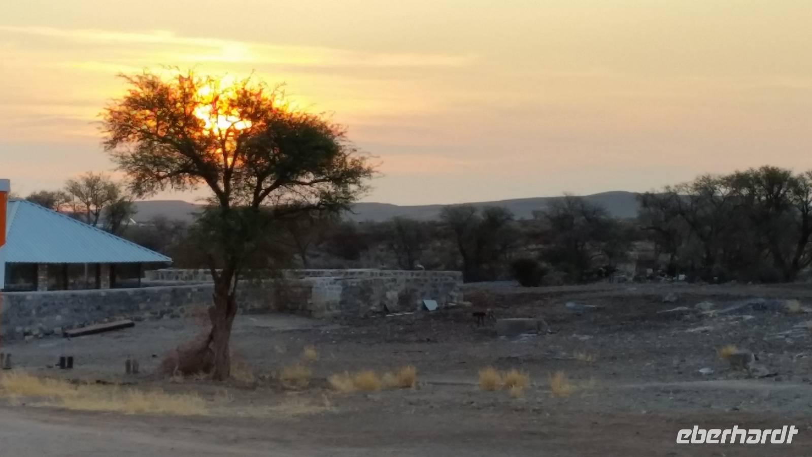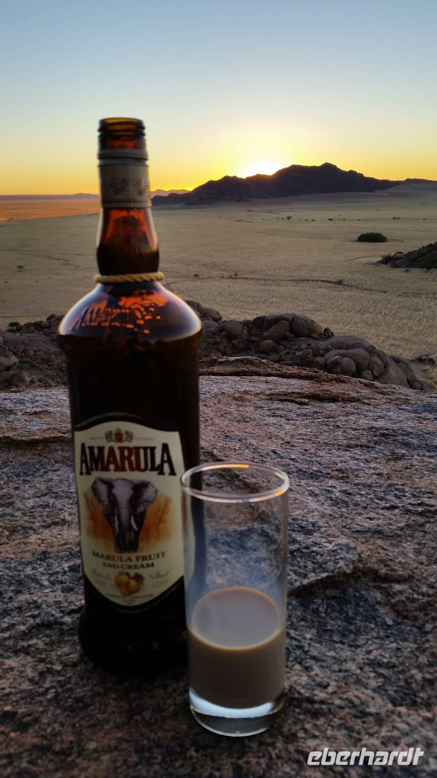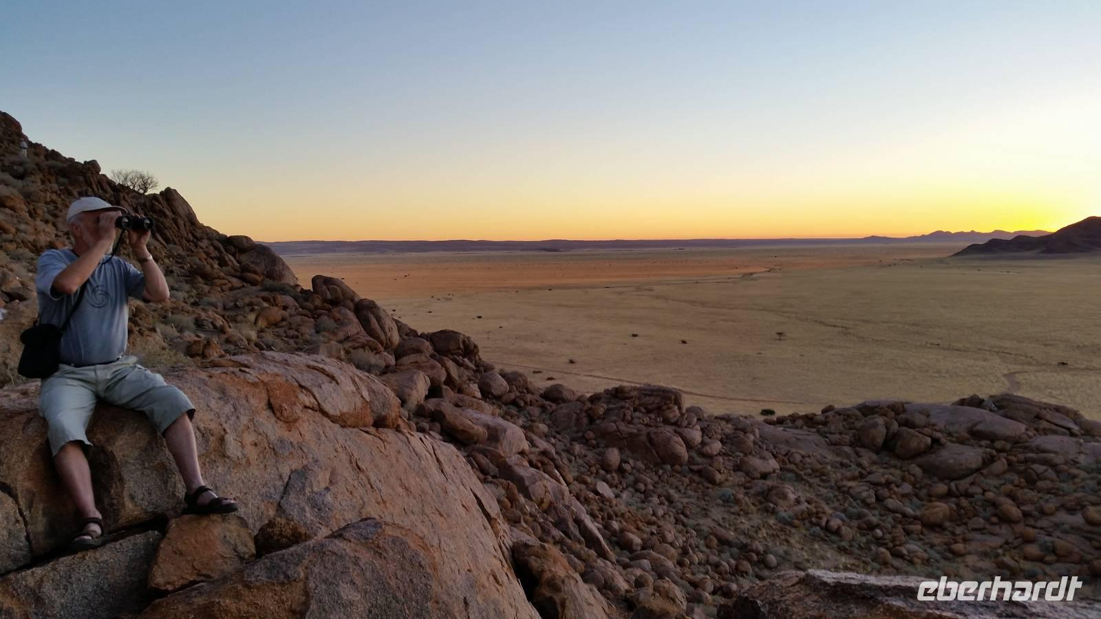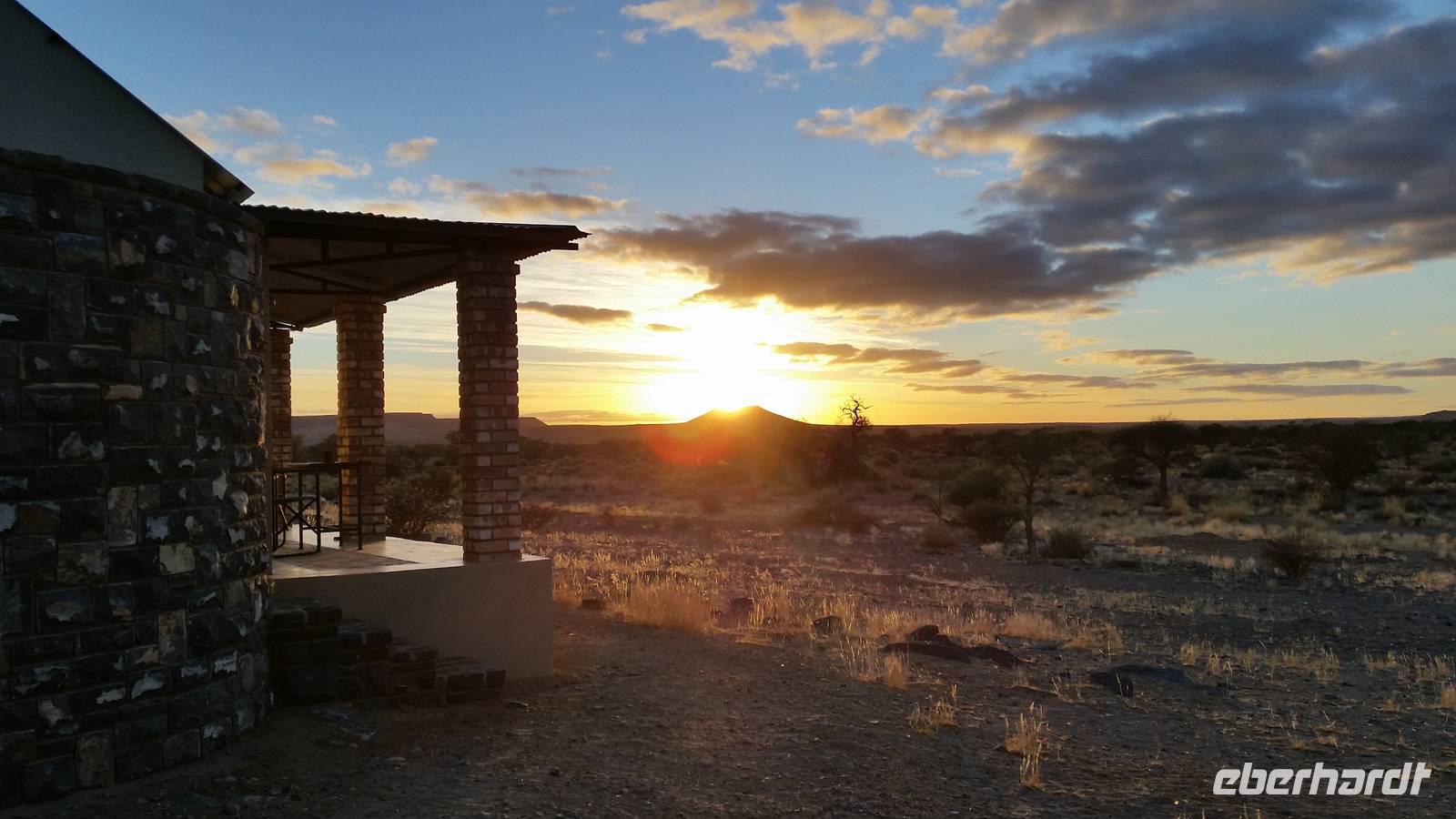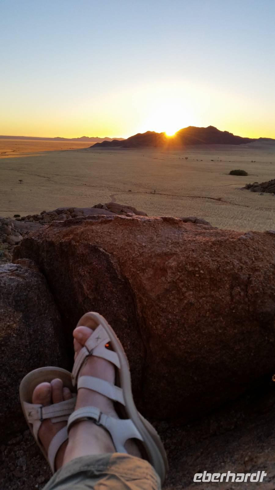 Bevor wir in dem gemütlichen Ambiente der Lodge Alte Kalköfen frühstückten, unternahmen wir noch einen kleinen Rundgang durch das Gelände. Der Besitzer zeigte uns seine „lebenden Steine", den Kalkofen und die liebevoll angelegte Gartenanlage. Zum Frühstück gab es auch auf Grund eines Ehrentages ein Ständchen der besonderen Art und einen kleinen Geburtstagskuchen. Dann machten wir uns auf die Weiterreise über Helmeringhausen, Maltahöhe und Solitaire in unsere Lodge am Rande des Namib Naukluft Parks. Am Abend bestiegen wir den kleinen Hausberg um den Sonnenuntergang zu beobachten. Oben angekommen erzählte uns Tom noch die ein oder andere wahre oder unwahre Geschichte ? und dann stießen wir bei einem Gläschen Amarula auf einen Tag voller eindrucksvoller Landschaften, herzlichen Menschen und tollen Momenten an!