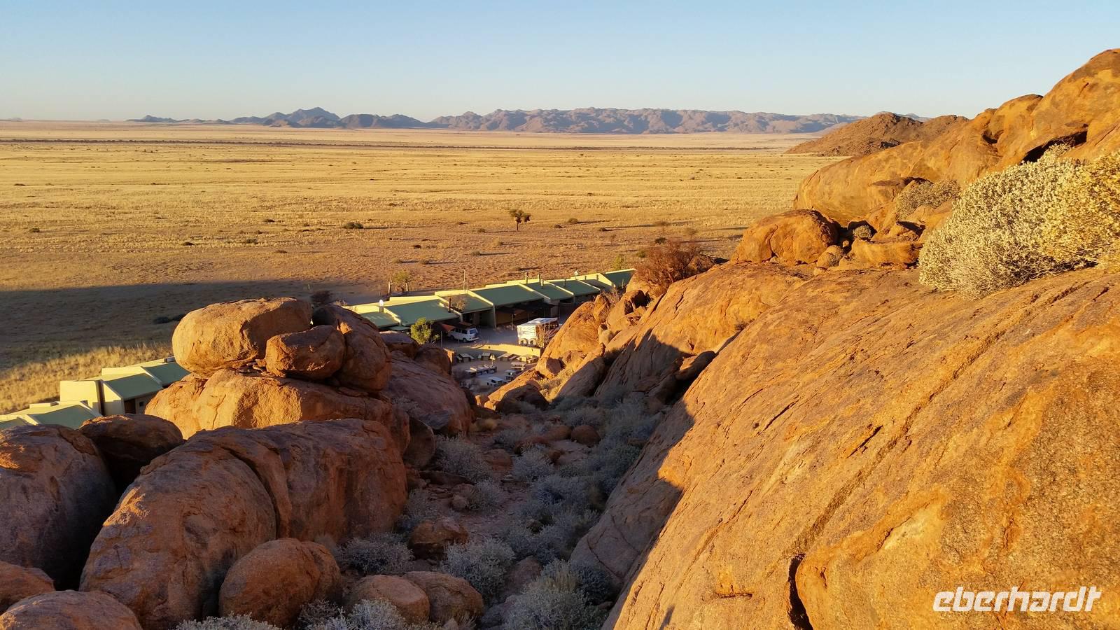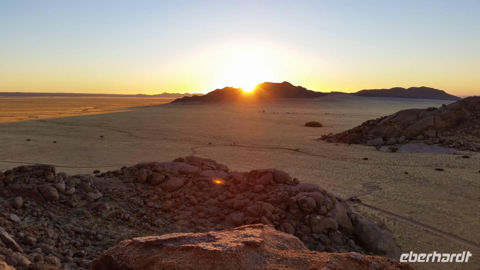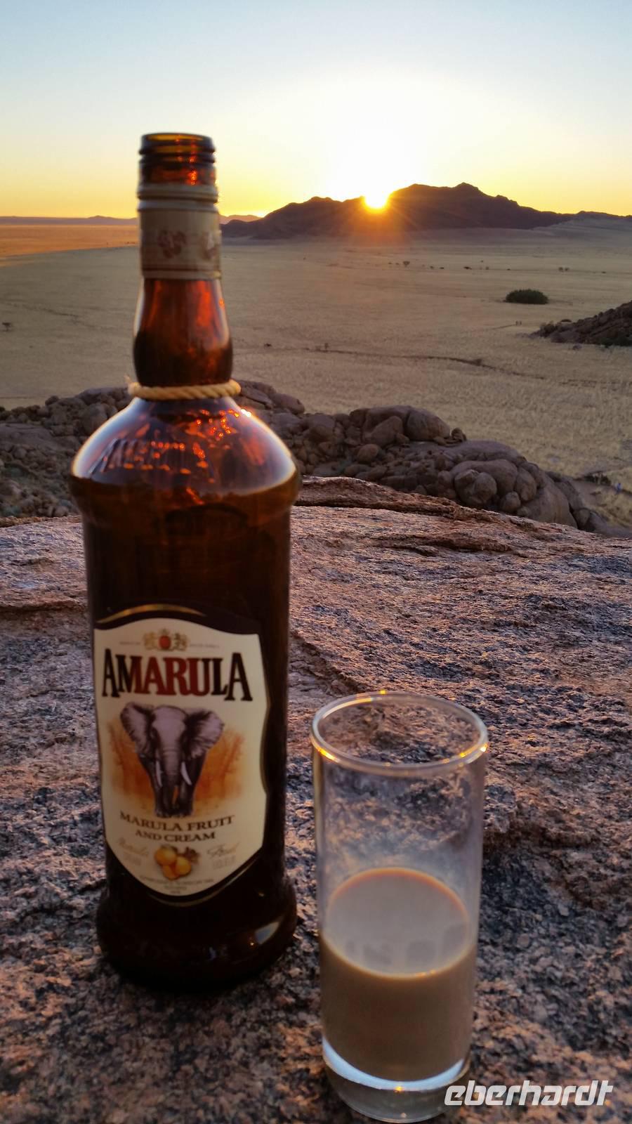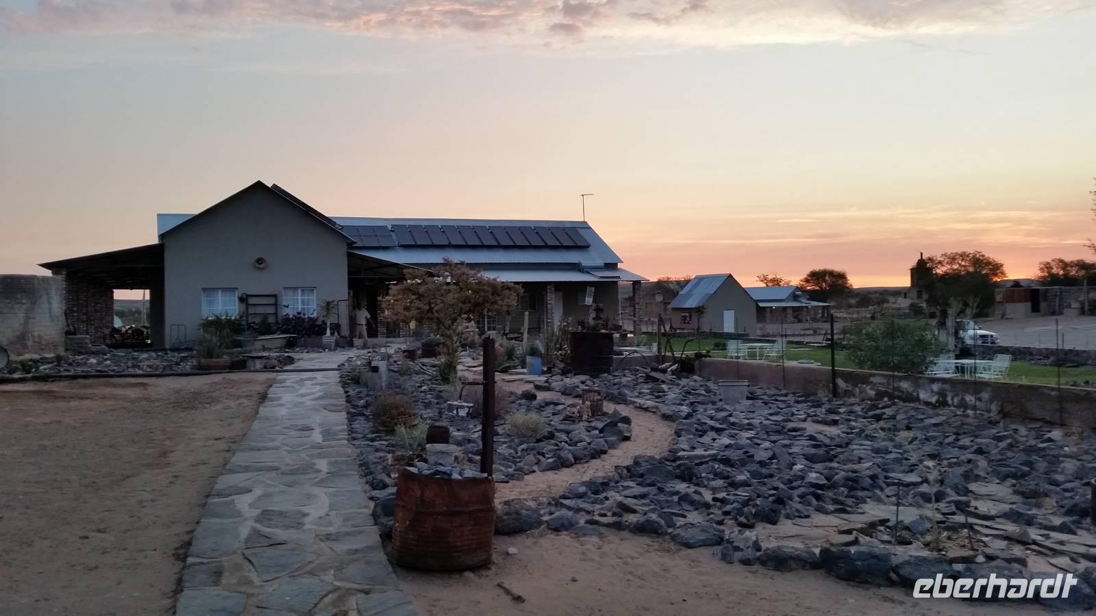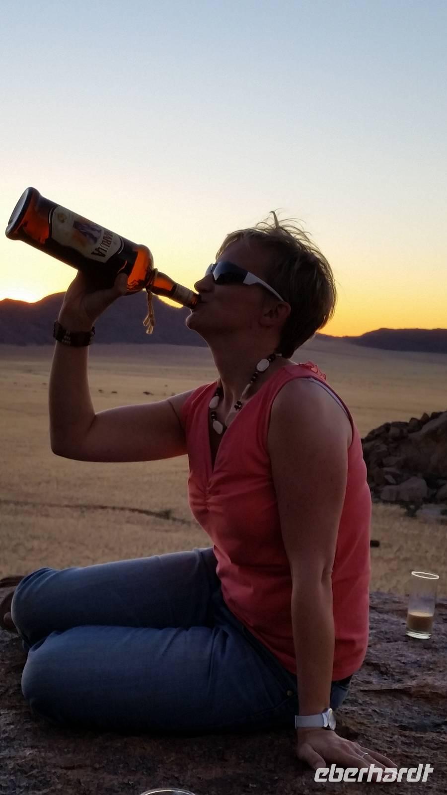Bevor wir in dem gemütlichen Ambiente der Lodge Alte Kalköfen frühstückten, unternahmen wir noch einen kleinen Rundgang durch das Gelände. Der Besitzer zeigte uns seine „lebenden Steine", den Kalkofen und die liebevoll angelegte Gartenanlage. Zum Frühstück gab es auch auf Grund eines Ehrentages ein Ständchen der besonderen Art und einen kleinen Geburtstagskuchen. Dann machten wir uns auf die Weiterreise über Helmeringhausen, Maltahöhe und Solitaire in unsere Lodge am Rande des Namib Naukluft Parks. Am Abend bestiegen wir den kleinen Hausberg um den Sonnenuntergang zu beobachten. Oben angekommen erzählte uns Tom noch die ein oder andere wahre oder unwahre Geschichte ? und dann stießen wir bei einem Gläschen Amarula auf einen Tag voller eindrucksvoller Landschaften, herzlichen Menschen und tollen Momenten an!