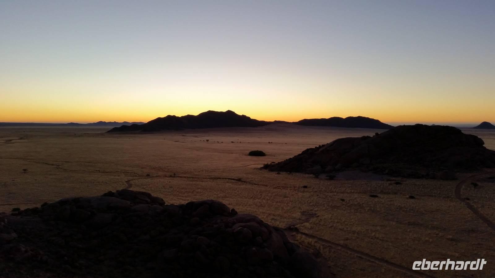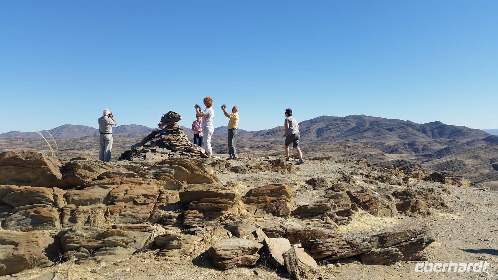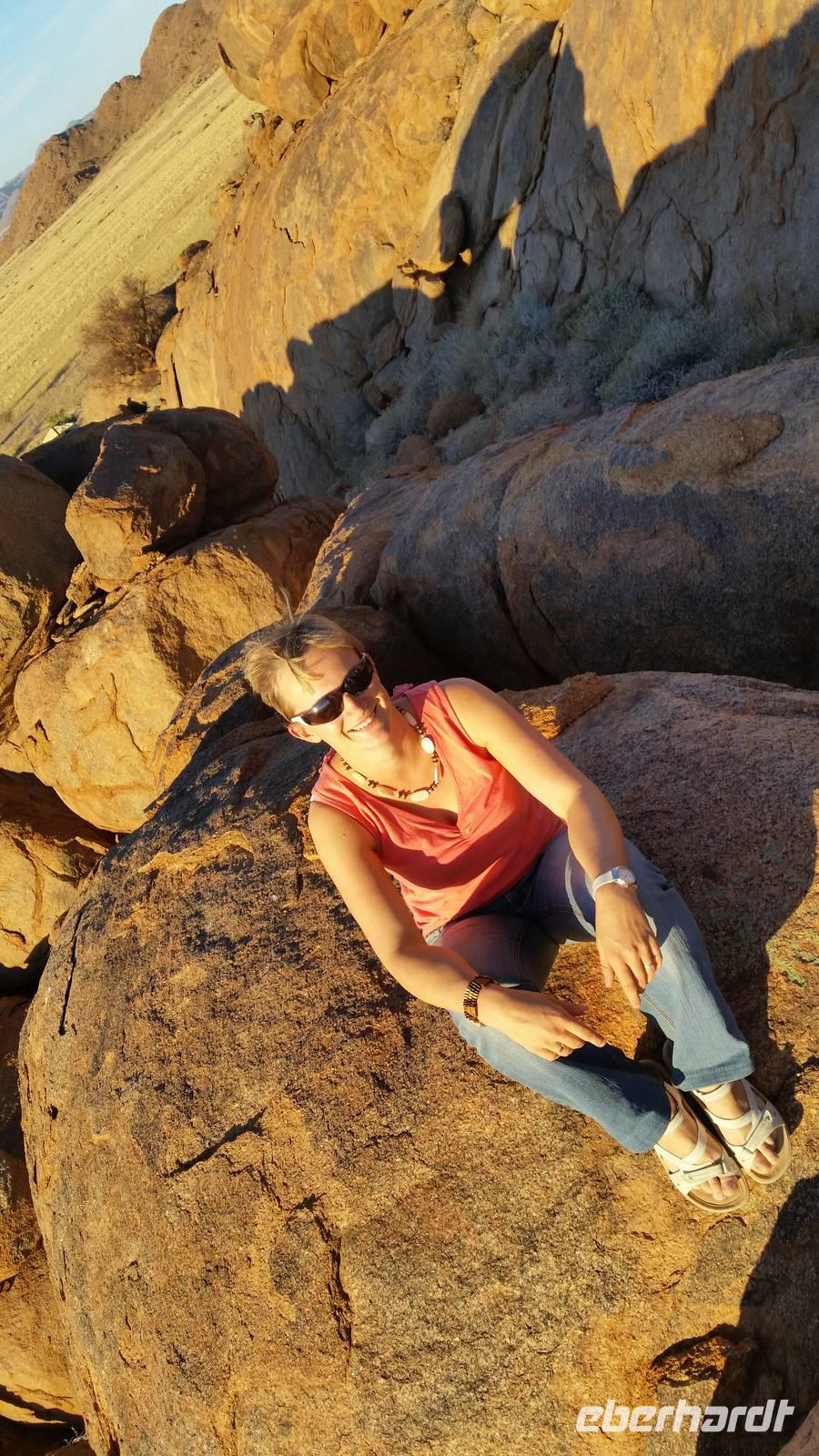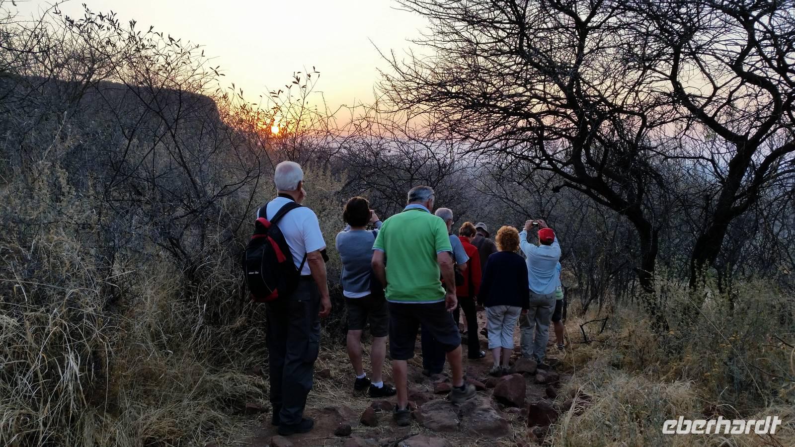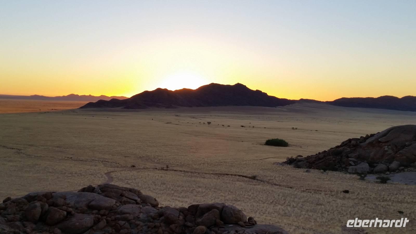 Bevor wir in dem gemütlichen Ambiente der Lodge Alte Kalköfen frühstückten, unternahmen wir noch einen kleinen Rundgang durch das Gelände. Der Besitzer zeigte uns seine „lebenden Steine", den Kalkofen und die liebevoll angelegte Gartenanlage. Zum Frühstück gab es auch auf Grund eines Ehrentages ein Ständchen der besonderen Art und einen kleinen Geburtstagskuchen. Dann machten wir uns auf die Weiterreise über Helmeringhausen, Maltahöhe und Solitaire in unsere Lodge am Rande des Namib Naukluft Parks. Am Abend bestiegen wir den kleinen Hausberg um den Sonnenuntergang zu beobachten. Oben angekommen erzählte uns Tom noch die ein oder andere wahre oder unwahre Geschichte ? und dann stießen wir bei einem Gläschen Amarula auf einen Tag voller eindrucksvoller Landschaften, herzlichen Menschen und tollen Momenten an!