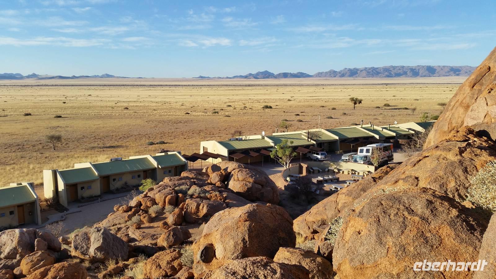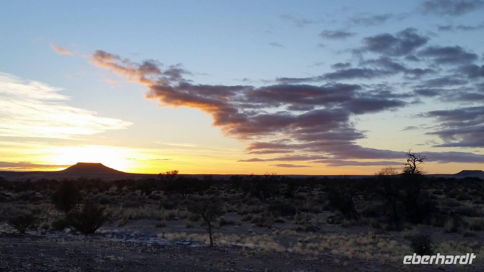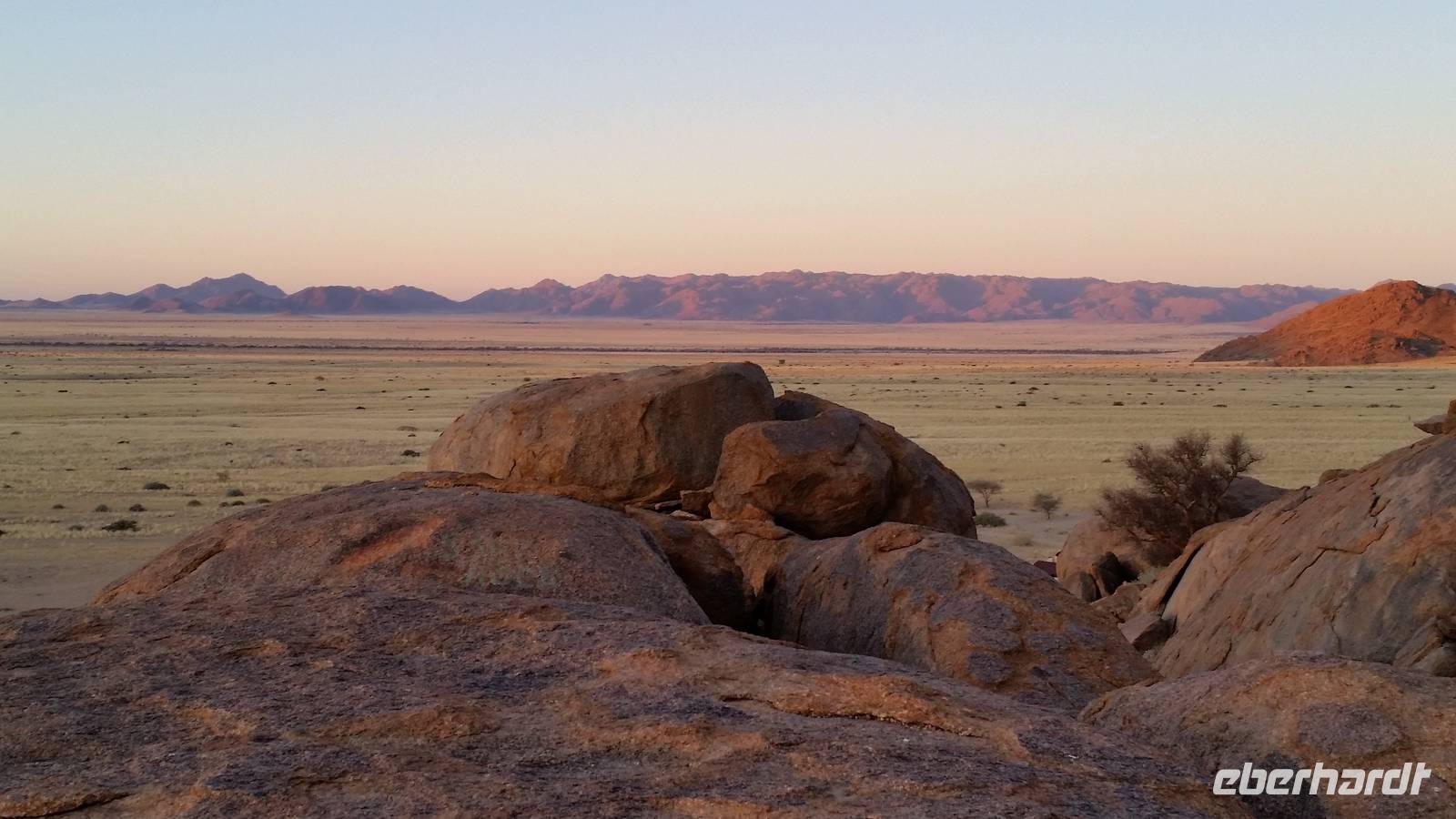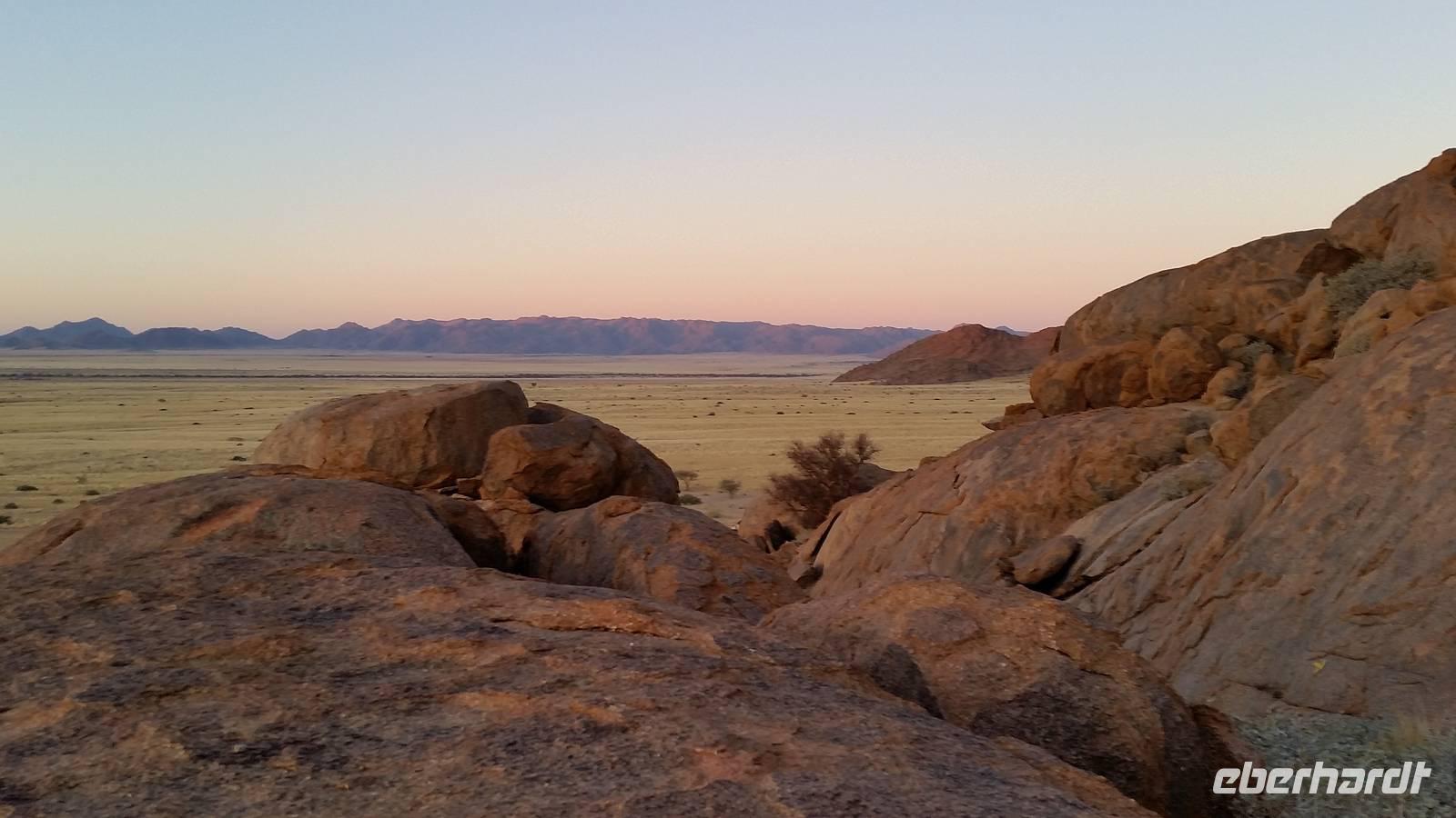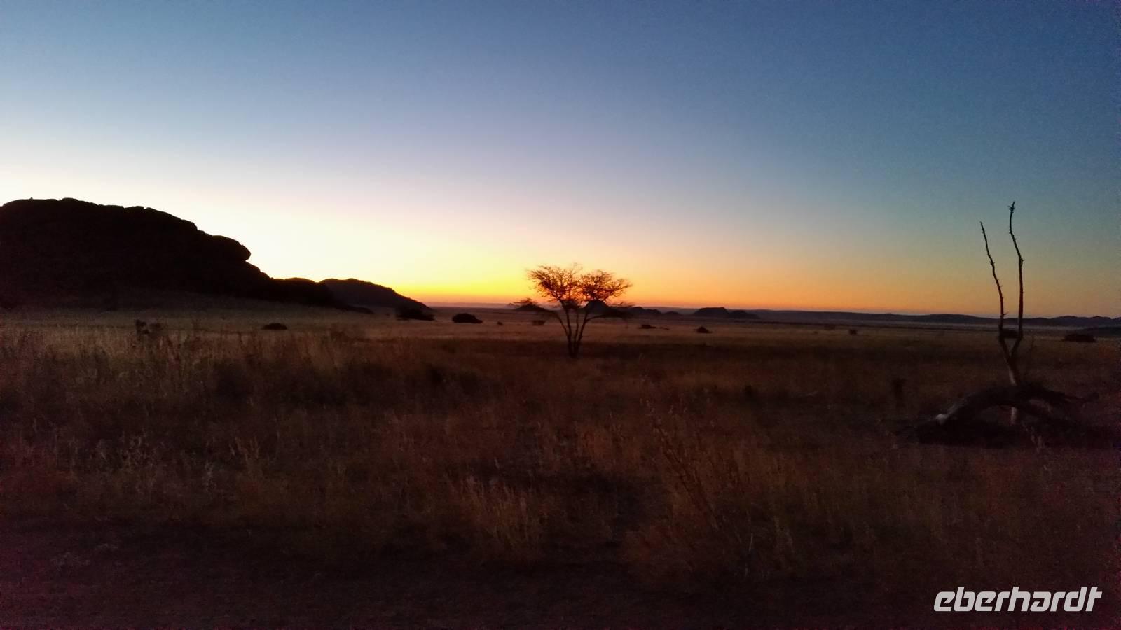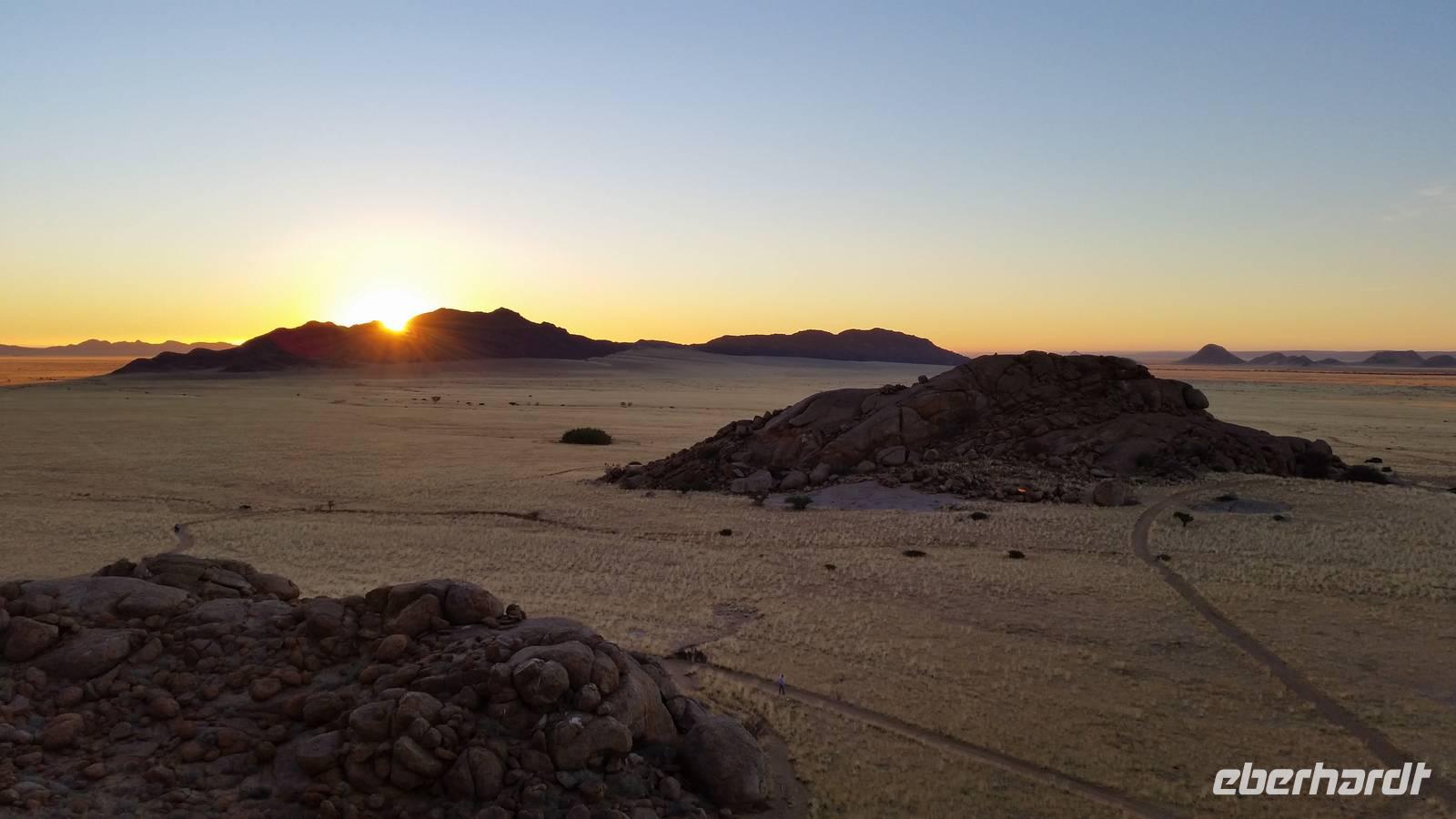 Bevor wir in dem gemütlichen Ambiente der Lodge Alte Kalköfen frühstückten, unternahmen wir noch einen kleinen Rundgang durch das Gelände. Der Besitzer zeigte uns seine „lebenden Steine", den Kalkofen und die liebevoll angelegte Gartenanlage. Zum Frühstück gab es auch auf Grund eines Ehrentages ein Ständchen der besonderen Art und einen kleinen Geburtstagskuchen. Dann machten wir uns auf die Weiterreise über Helmeringhausen, Maltahöhe und Solitaire in unsere Lodge am Rande des Namib Naukluft Parks. Am Abend bestiegen wir den kleinen Hausberg um den Sonnenuntergang zu beobachten. Oben angekommen erzählte uns Tom noch die ein oder andere wahre oder unwahre Geschichte ? und dann stießen wir bei einem Gläschen Amarula auf einen Tag voller eindrucksvoller Landschaften, herzlichen Menschen und tollen Momenten an!