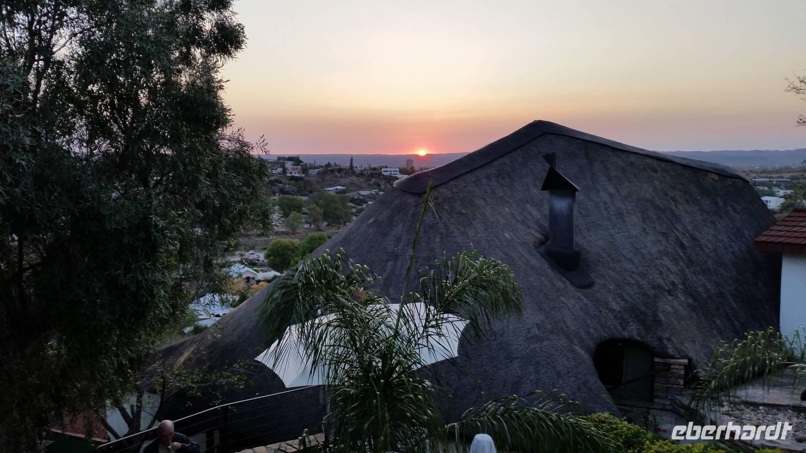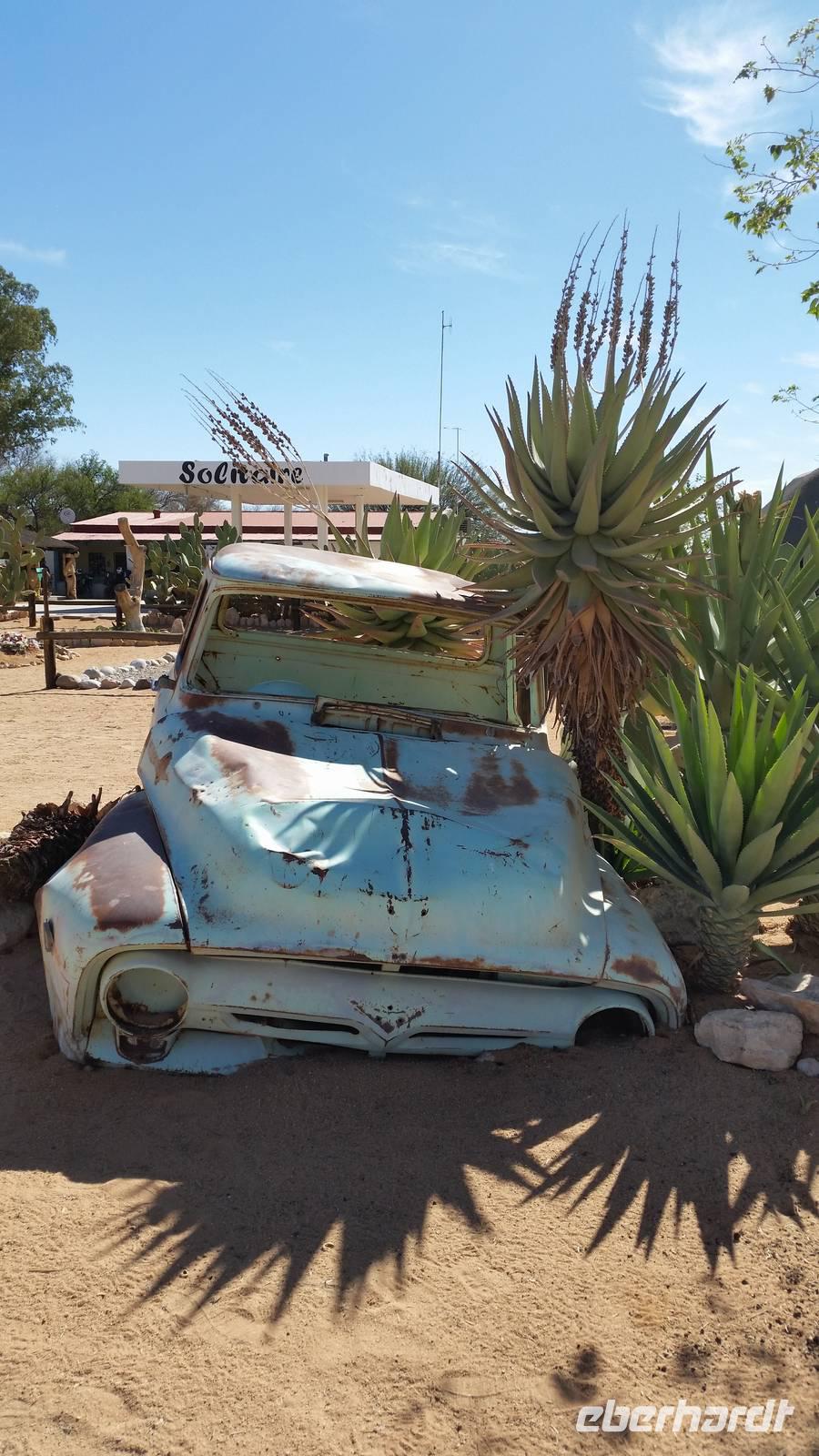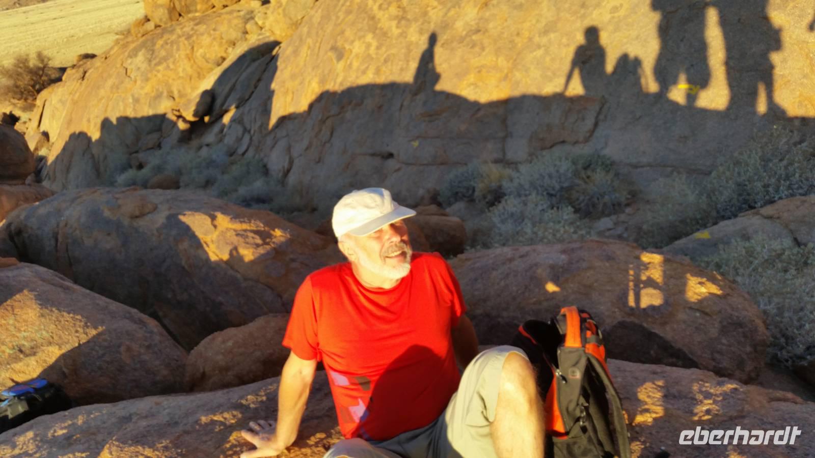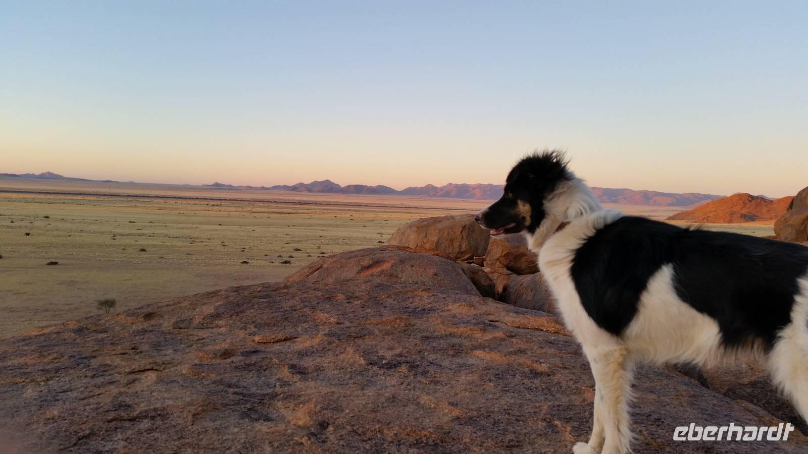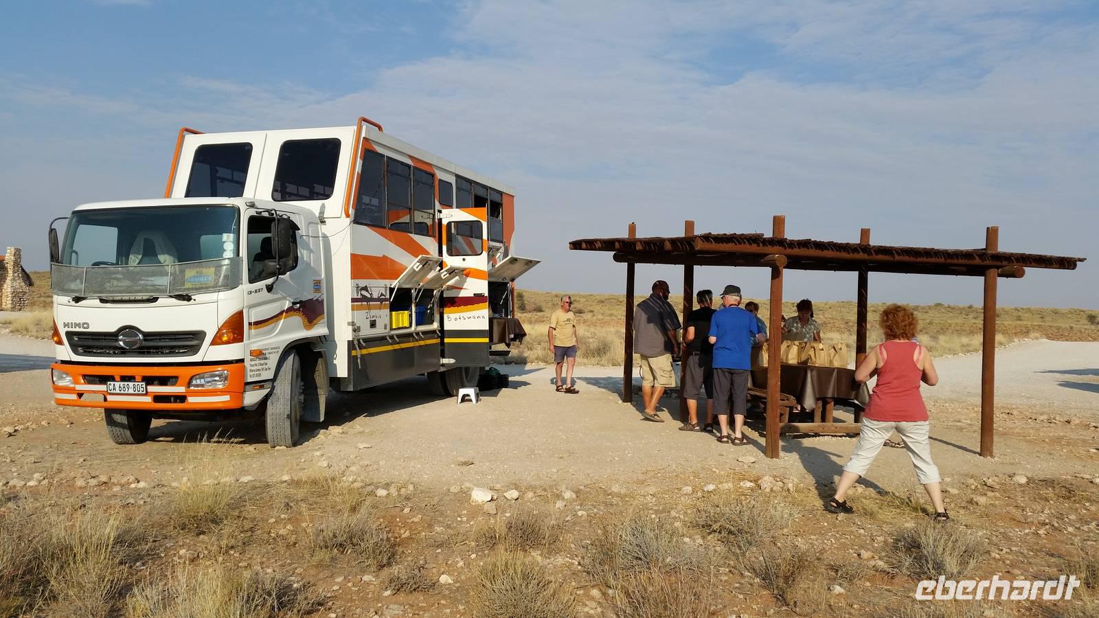 Bevor wir in dem gemütlichen Ambiente der Lodge Alte Kalköfen frühstückten, unternahmen wir noch einen kleinen Rundgang durch das Gelände. Der Besitzer zeigte uns seine „lebenden Steine", den Kalkofen und die liebevoll angelegte Gartenanlage. Zum Frühstück gab es auch auf Grund eines Ehrentages ein Ständchen der besonderen Art und einen kleinen Geburtstagskuchen. Dann machten wir uns auf die Weiterreise über Helmeringhausen, Maltahöhe und Solitaire in unsere Lodge am Rande des Namib Naukluft Parks. Am Abend bestiegen wir den kleinen Hausberg um den Sonnenuntergang zu beobachten. Oben angekommen erzählte uns Tom noch die ein oder andere wahre oder unwahre Geschichte ? und dann stießen wir bei einem Gläschen Amarula auf einen Tag voller eindrucksvoller Landschaften, herzlichen Menschen und tollen Momenten an!