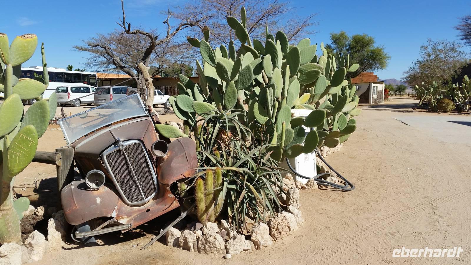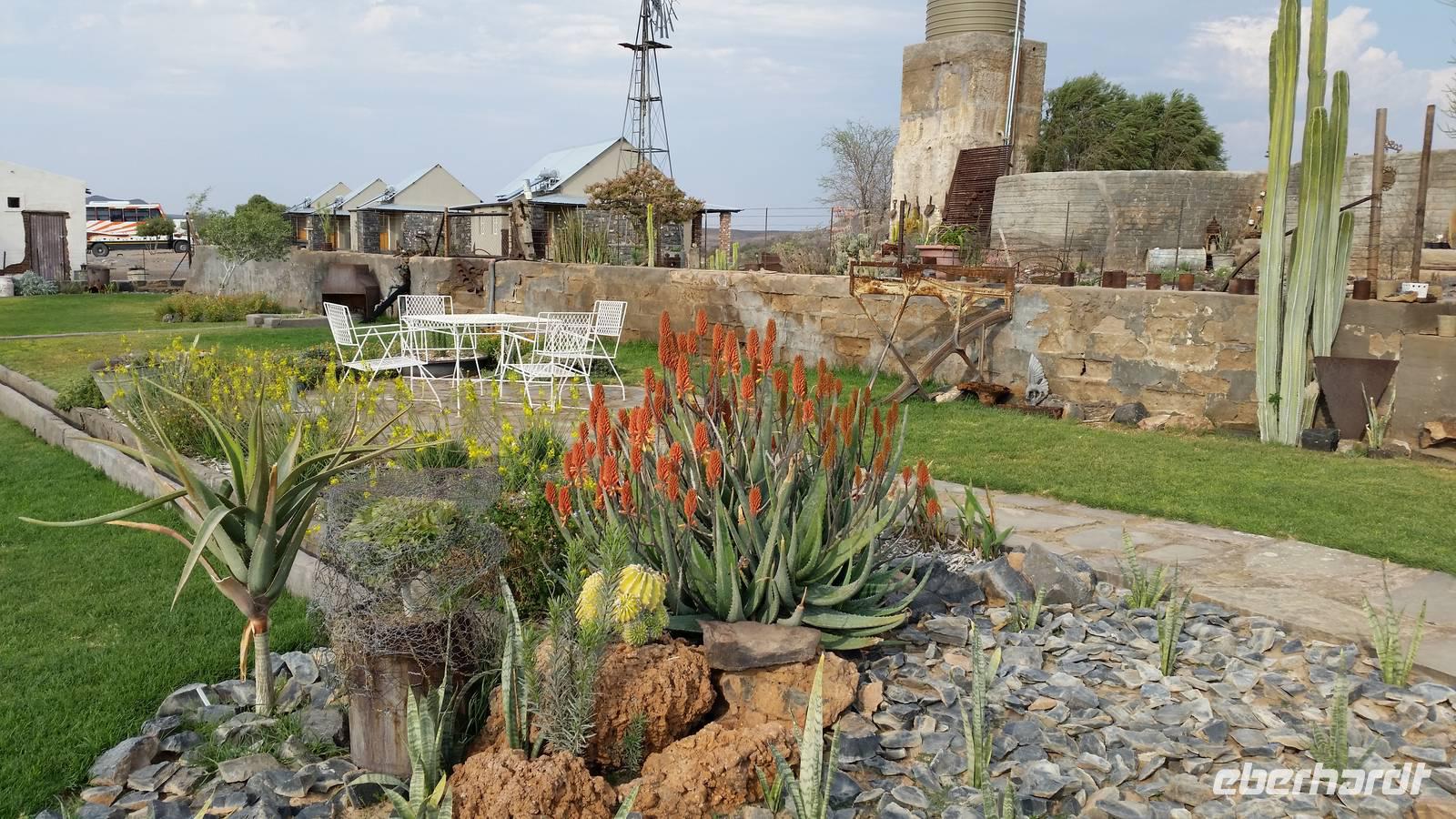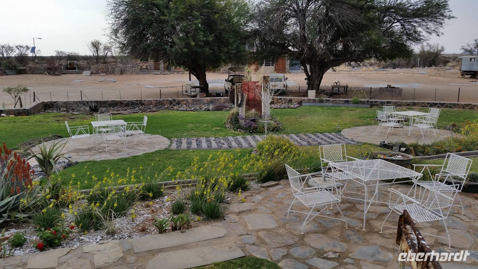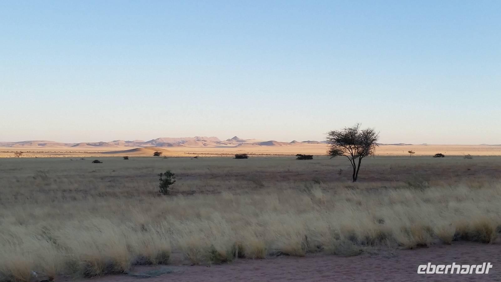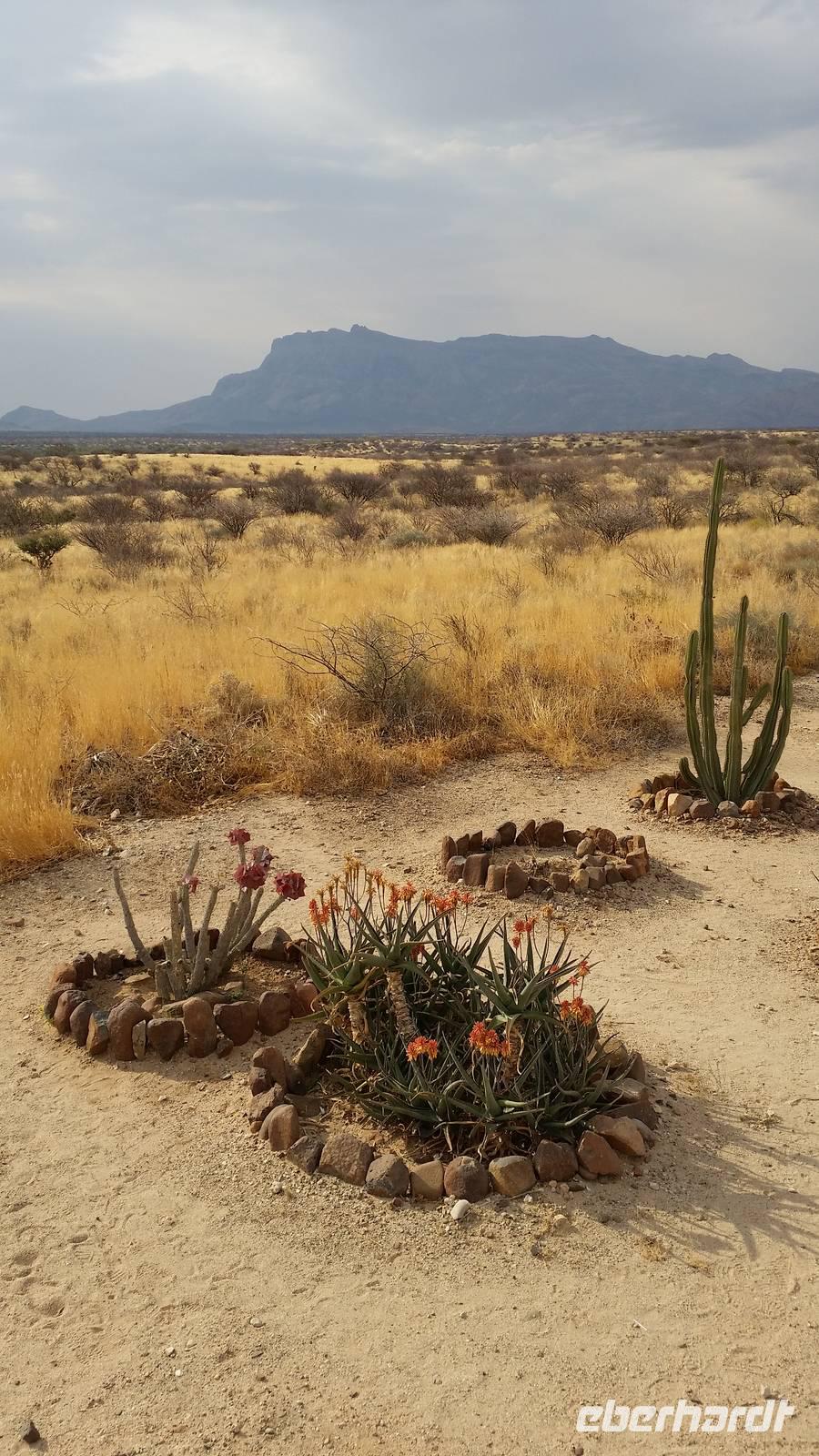 Bevor wir in dem gemütlichen Ambiente der Lodge Alte Kalköfen frühstückten, unternahmen wir noch einen kleinen Rundgang durch das Gelände. Der Besitzer zeigte uns seine „lebenden Steine", den Kalkofen und die liebevoll angelegte Gartenanlage. Zum Frühstück gab es auch auf Grund eines Ehrentages ein Ständchen der besonderen Art und einen kleinen Geburtstagskuchen. Dann machten wir uns auf die Weiterreise über Helmeringhausen, Maltahöhe und Solitaire in unsere Lodge am Rande des Namib Naukluft Parks. Am Abend bestiegen wir den kleinen Hausberg um den Sonnenuntergang zu beobachten. Oben angekommen erzählte uns Tom noch die ein oder andere wahre oder unwahre Geschichte ? und dann stießen wir bei einem Gläschen Amarula auf einen Tag voller eindrucksvoller Landschaften, herzlichen Menschen und tollen Momenten an!