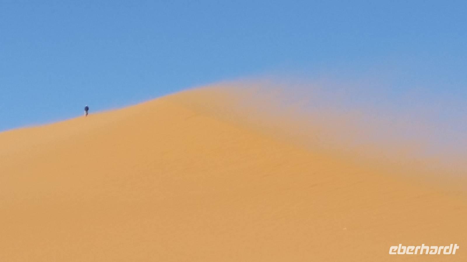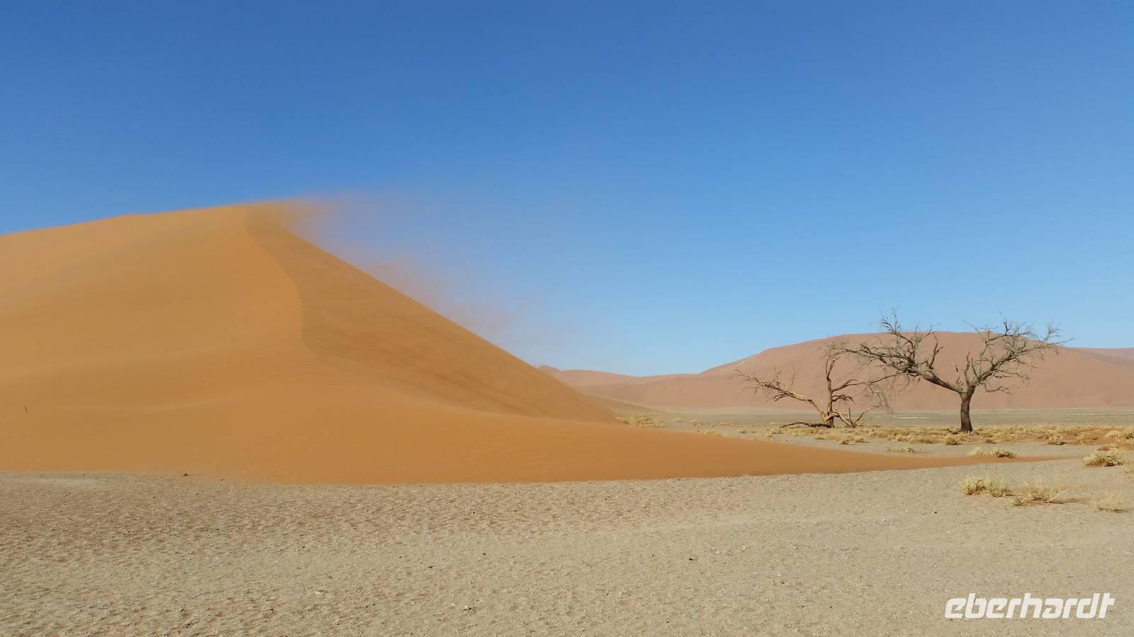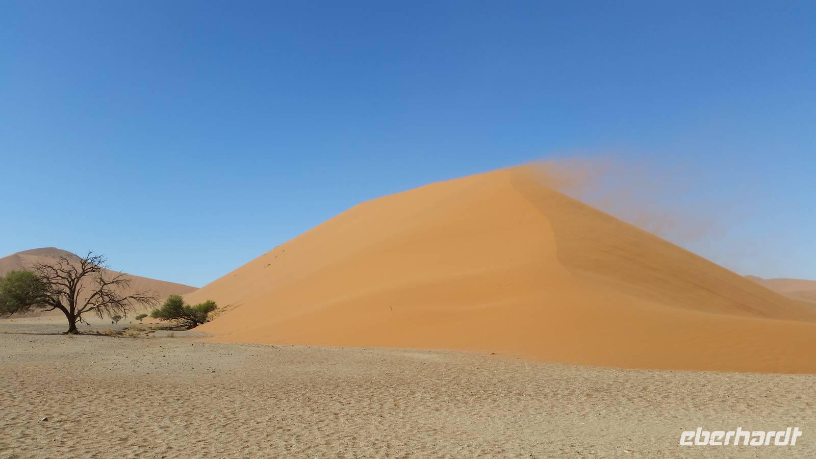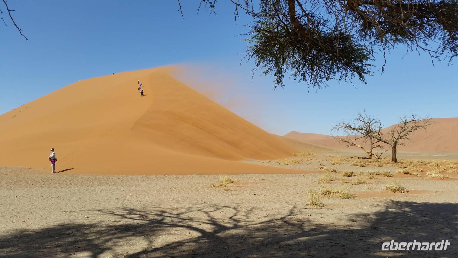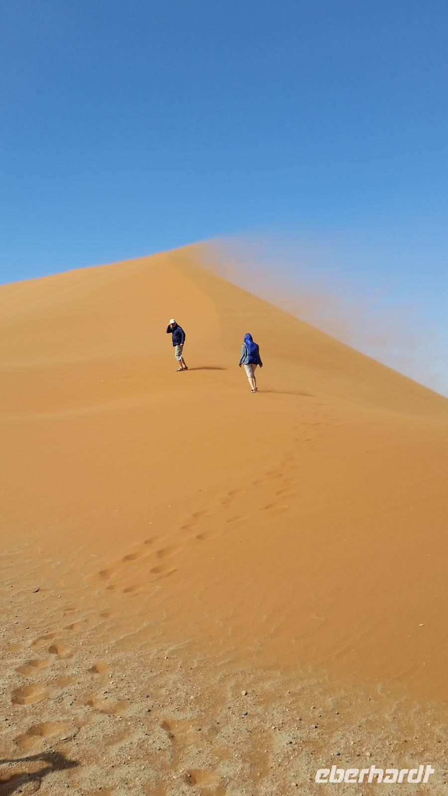 Heute erwartete uns ein im wahrsten Sinne des Wortes sandiger Tag. Unser Plan war die mächtigen Dünenlandschaften der Wüste Namib zu entdecken und vielleicht sogar zu Fuß zu erklimmen. Leider war das Wetter dafür heute nicht ganz optimal, denn über Nacht hatte plötzlich starker Wind eingesetzt. Dies sollte der Beginn einer stürmischen Begegnung mit der Düne 45 sein: schon von weitem erkannten wir, dass es in der Ferne einen mächtigen Sandsturm gab, aber dies hielt uns natürlich nicht ab, etwas näher heranzufahren. Nach einem kurzen Fotostopp in noch sicherer Entfernung fuhren wir schließlich zur bekannten Düne 45. Was für ein Sturm! Basecap drauf, Fotoapparate in der Jackentasche versteckt und los ging´s. Wir stiefelten mit heftigem Seitenwind Meter für Meter nach oben. Zwischendurch sollte natürlich auch ein Foto gemacht werden, aber auch der Wind war nicht zu unterschätzen. Und so kam es wie es kommen sollte: eine Böe von links und huuuiiiiiii war die Kamera wie eine Frisbee-Scheibe davon geflogen...auf der „Jagd" nach dieser flog dann auch...huuuiiiii noch das Basecap davon. Übereifrig wie ich war, stürzte ich mich „todesmutig" in die „Sandfluten" um beides wieder zu fangen. Glücklicherweise gelang dies auch ? - nur war ich hinterher rund 10kg schwerer, weil der Sand überall von Kopf bis Fuß an mir klebte. Doch die beste Position hatten meine Reisegäste, die das „Drama" live miterleben durften.