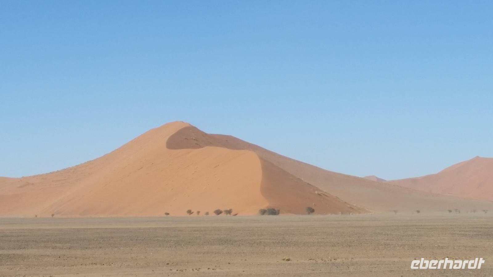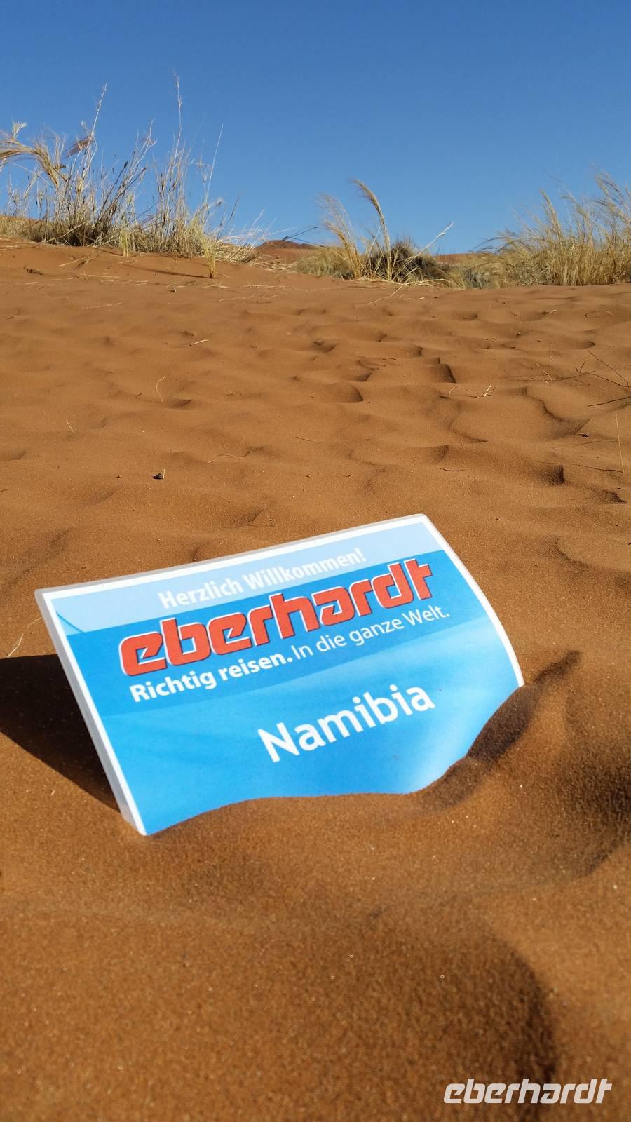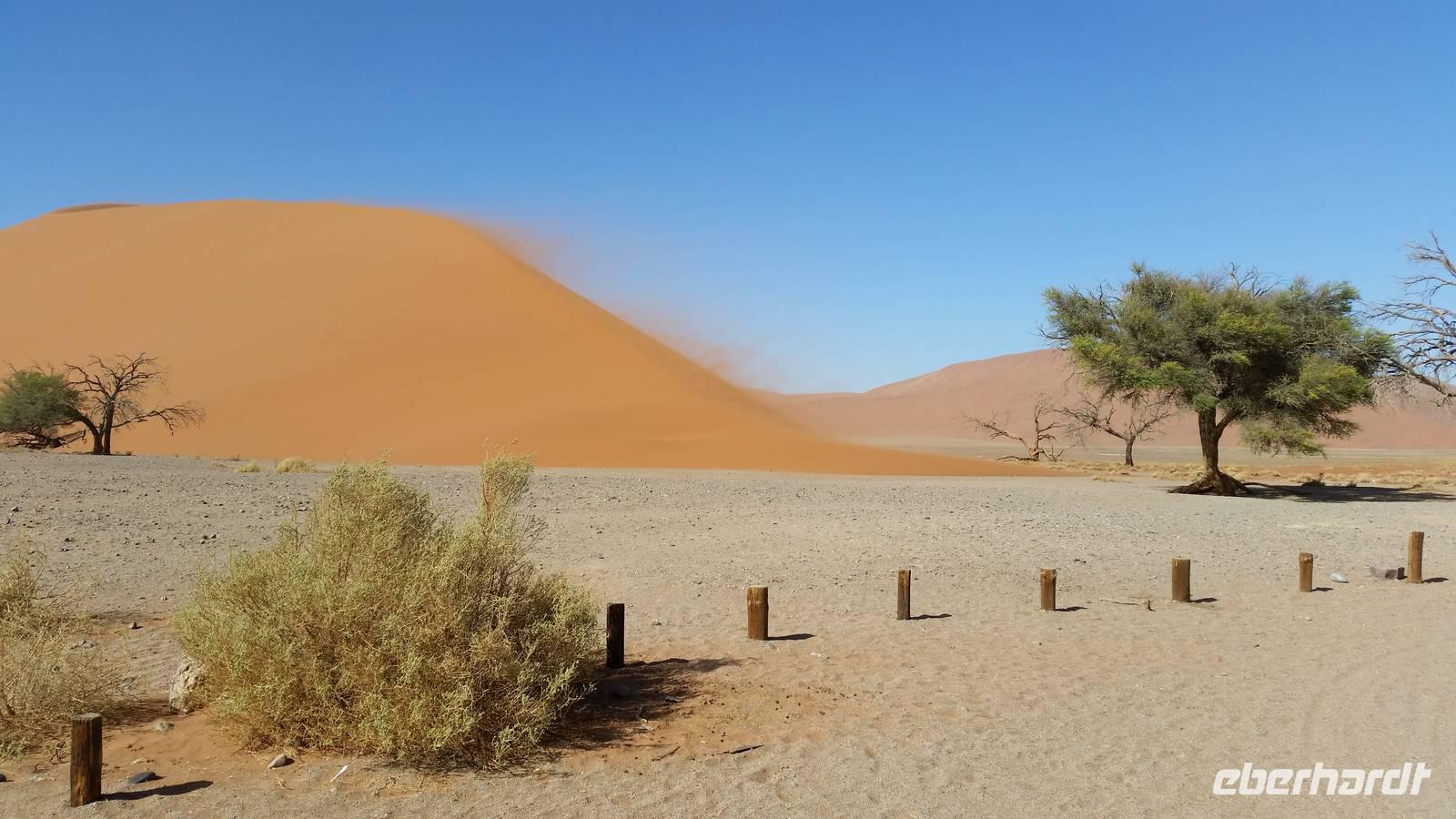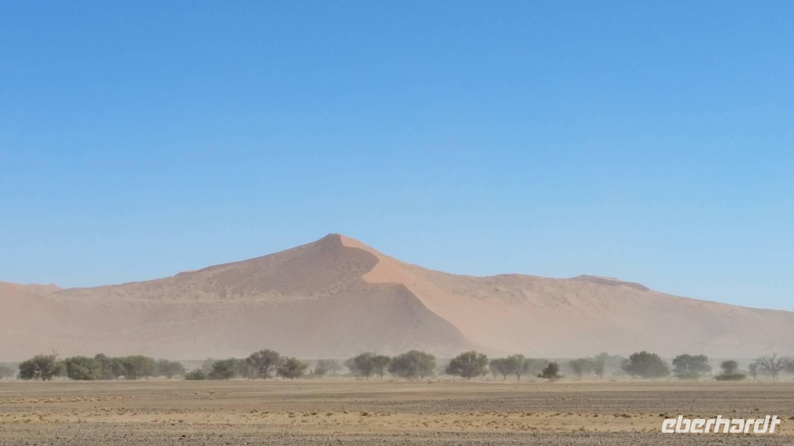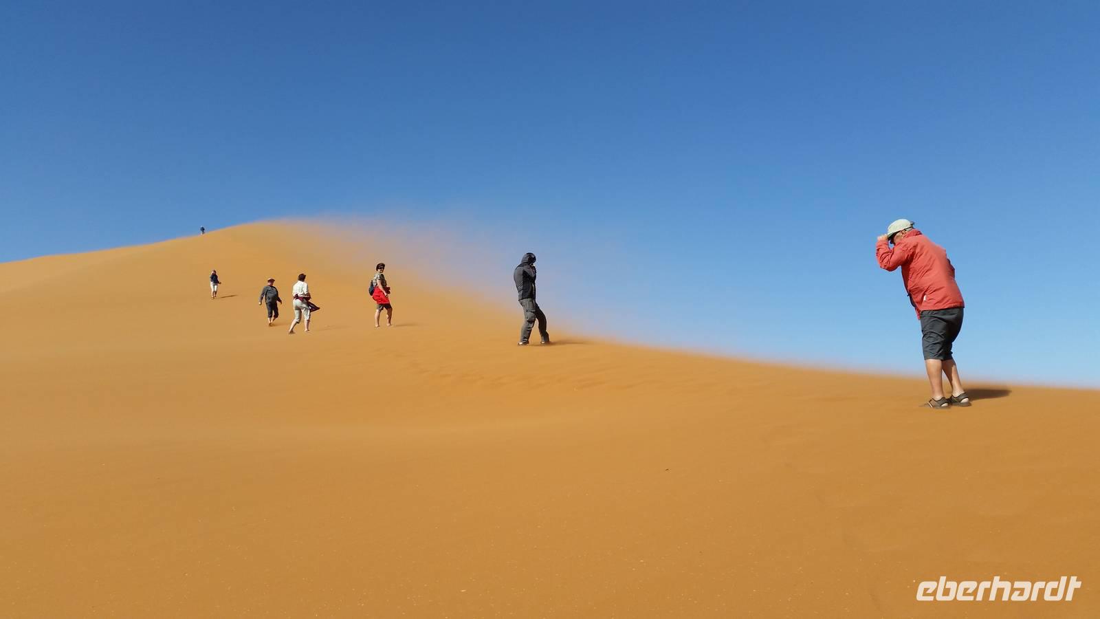 Heute erwartete uns ein im wahrsten Sinne des Wortes sandiger Tag. Unser Plan war die mächtigen Dünenlandschaften der Wüste Namib zu entdecken und vielleicht sogar zu Fuß zu erklimmen. Leider war das Wetter dafür heute nicht ganz optimal, denn über Nacht hatte plötzlich starker Wind eingesetzt. Dies sollte der Beginn einer stürmischen Begegnung mit der Düne 45 sein: schon von weitem erkannten wir, dass es in der Ferne einen mächtigen Sandsturm gab, aber dies hielt uns natürlich nicht ab, etwas näher heranzufahren. Nach einem kurzen Fotostopp in noch sicherer Entfernung fuhren wir schließlich zur bekannten Düne 45. Was für ein Sturm! Basecap drauf, Fotoapparate in der Jackentasche versteckt und los ging´s. Wir stiefelten mit heftigem Seitenwind Meter für Meter nach oben. Zwischendurch sollte natürlich auch ein Foto gemacht werden, aber auch der Wind war nicht zu unterschätzen. Und so kam es wie es kommen sollte: eine Böe von links und huuuiiiiiii war die Kamera wie eine Frisbee-Scheibe davon geflogen...auf der „Jagd" nach dieser flog dann auch...huuuiiiii noch das Basecap davon. Übereifrig wie ich war, stürzte ich mich „todesmutig" in die „Sandfluten" um beides wieder zu fangen. Glücklicherweise gelang dies auch ? - nur war ich hinterher rund 10kg schwerer, weil der Sand überall von Kopf bis Fuß an mir klebte. Doch die beste Position hatten meine Reisegäste, die das „Drama" live miterleben durften.