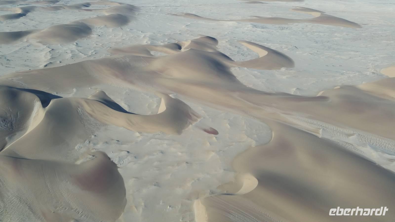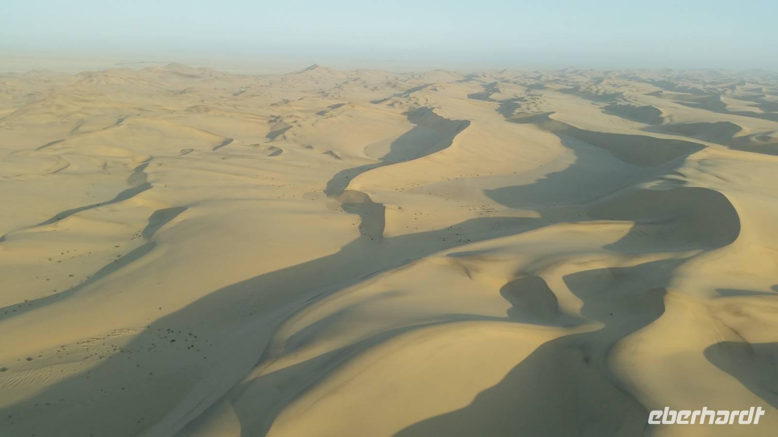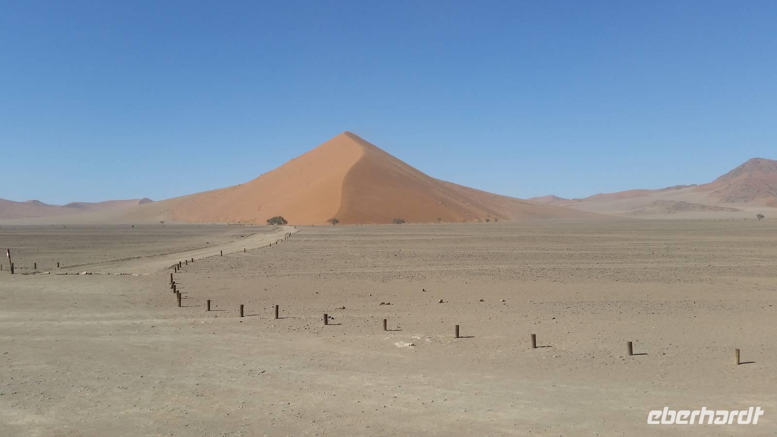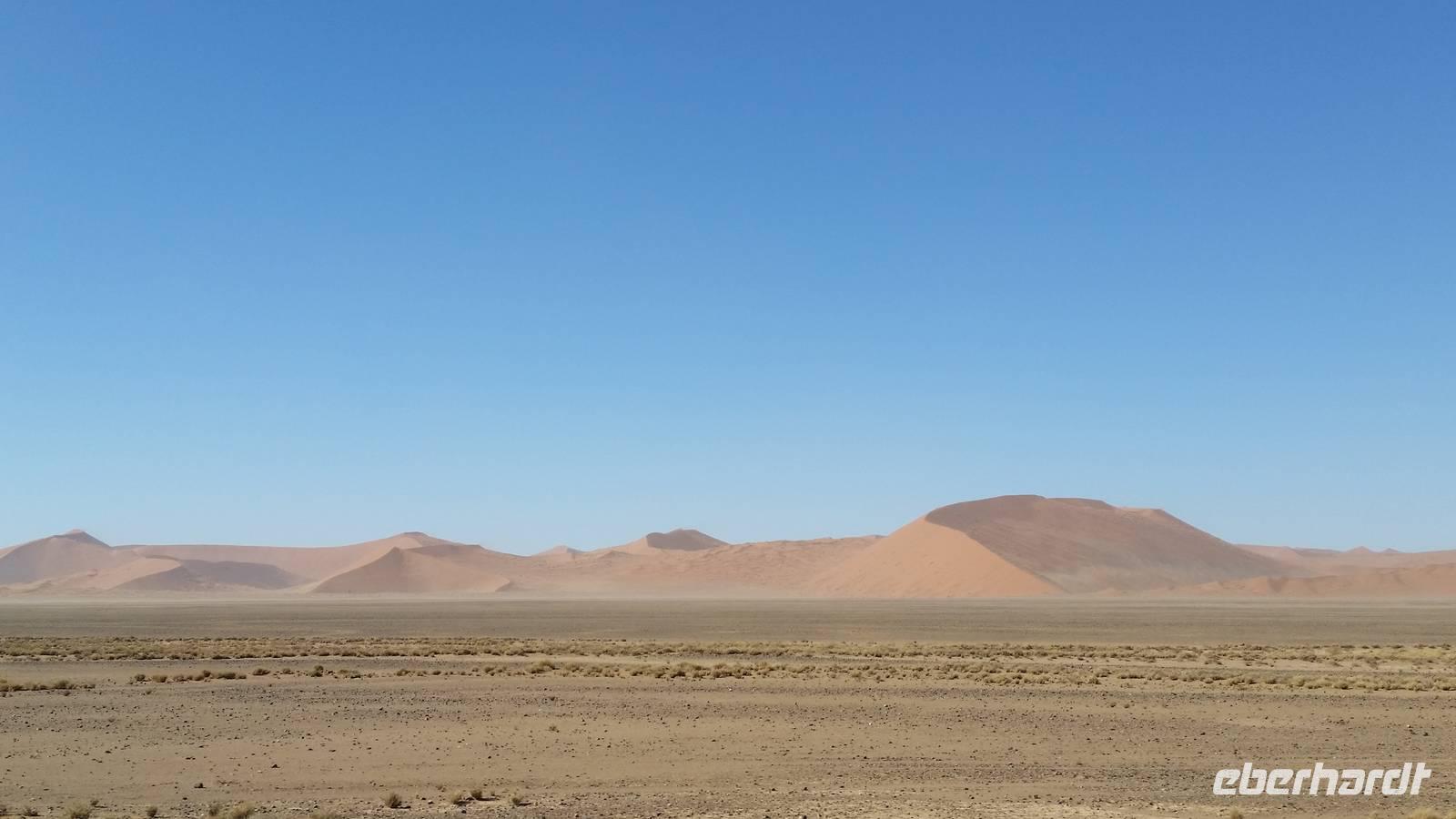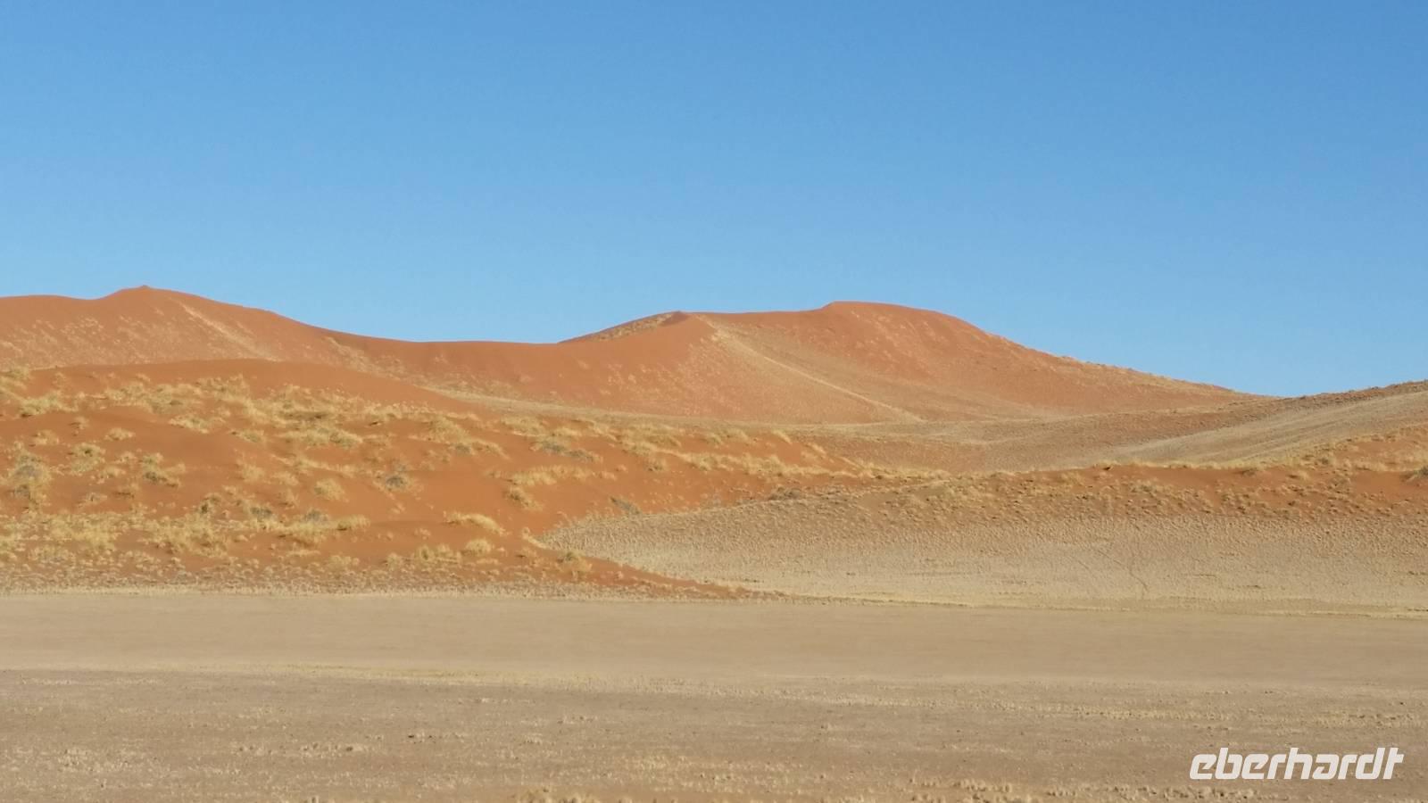 Heute erwartete uns ein im wahrsten Sinne des Wortes sandiger Tag. Unser Plan war die mächtigen Dünenlandschaften der Wüste Namib zu entdecken und vielleicht sogar zu Fuß zu erklimmen. Leider war das Wetter dafür heute nicht ganz optimal, denn über Nacht hatte plötzlich starker Wind eingesetzt. Dies sollte der Beginn einer stürmischen Begegnung mit der Düne 45 sein: schon von weitem erkannten wir, dass es in der Ferne einen mächtigen Sandsturm gab, aber dies hielt uns natürlich nicht ab, etwas näher heranzufahren. Nach einem kurzen Fotostopp in noch sicherer Entfernung fuhren wir schließlich zur bekannten Düne 45. Was für ein Sturm! Basecap drauf, Fotoapparate in der Jackentasche versteckt und los ging´s. Wir stiefelten mit heftigem Seitenwind Meter für Meter nach oben. Zwischendurch sollte natürlich auch ein Foto gemacht werden, aber auch der Wind war nicht zu unterschätzen. Und so kam es wie es kommen sollte: eine Böe von links und huuuiiiiiii war die Kamera wie eine Frisbee-Scheibe davon geflogen...auf der „Jagd" nach dieser flog dann auch...huuuiiiii noch das Basecap davon. Übereifrig wie ich war, stürzte ich mich „todesmutig" in die „Sandfluten" um beides wieder zu fangen. Glücklicherweise gelang dies auch ? - nur war ich hinterher rund 10kg schwerer, weil der Sand überall von Kopf bis Fuß an mir klebte. Doch die beste Position hatten meine Reisegäste, die das „Drama" live miterleben durften.