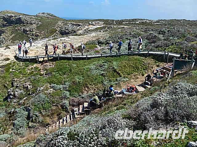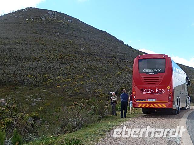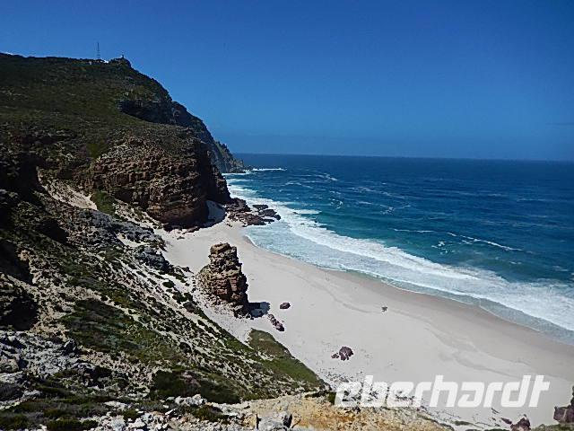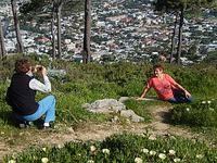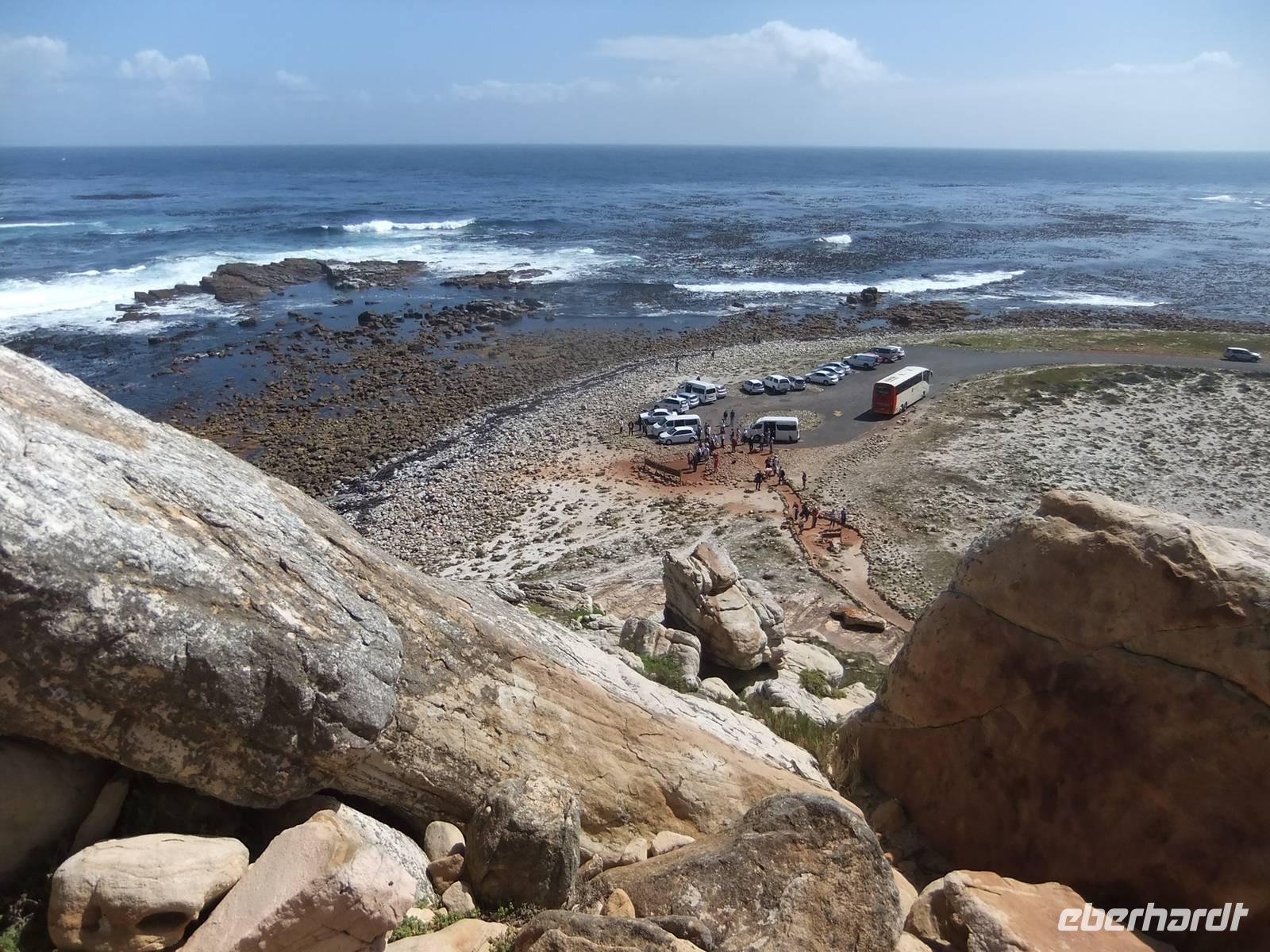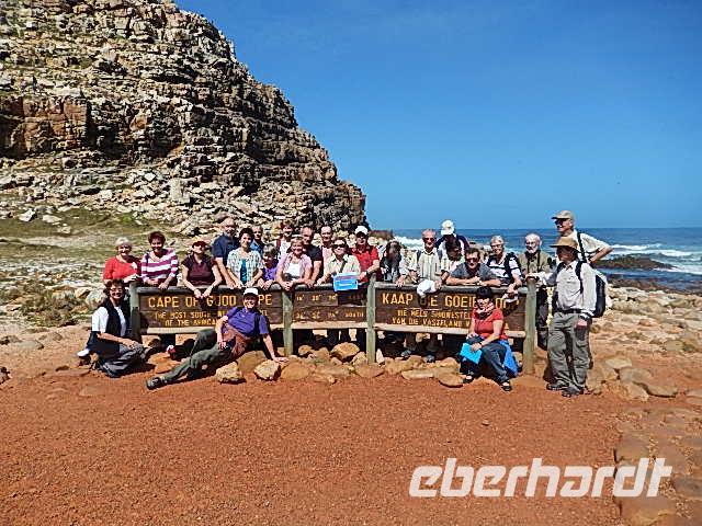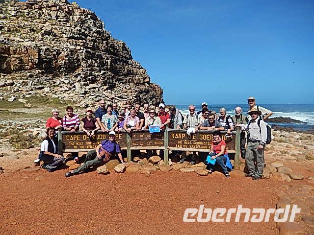 Nach den noblen Kapstädter Vororte Clifton und Camps Bay, sowie einem kurzen Fotostop an der spektakulären Küstenstraße dem Chapmans Peack Drive, mit Blick auf die Bucht des Örtchens Hout Bay fahren wir weiter in den Nationalpark Kap-Halbinsel. Mit der Standseilbahn fahren wir auf den Kap-Berg, erklimmen ca. 70 Treppenstufen und stehen am 250 Meter über dem Meeresspiegel stehendem Leuchtturm. Atemberaubend - der Wind weht, der Himmel ist blau, die Sonne strahlt. Entlang der felsigen Küste wandern wir zum Cap Point. Die im Frühling erwachende Vegetation, der Blick auf die felsige Küste und das weite Meer faszinieren uns. Am berühmten Holzschild „Cape of God Hope" schiessen wir unser Gruppenfoto und geniessen kurz das Rauschen des Atlantiks. Ein traumhaftes Fleckchen Erde.