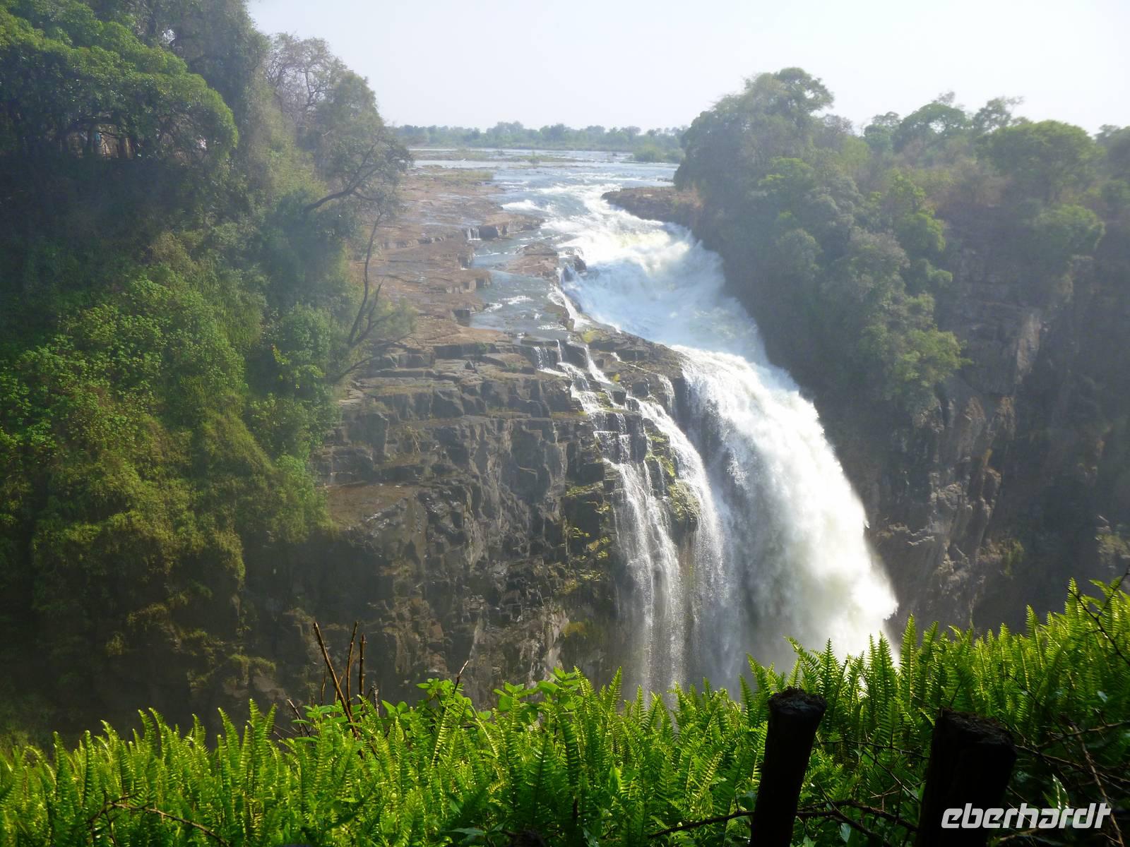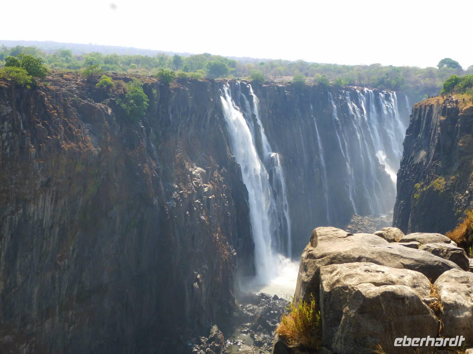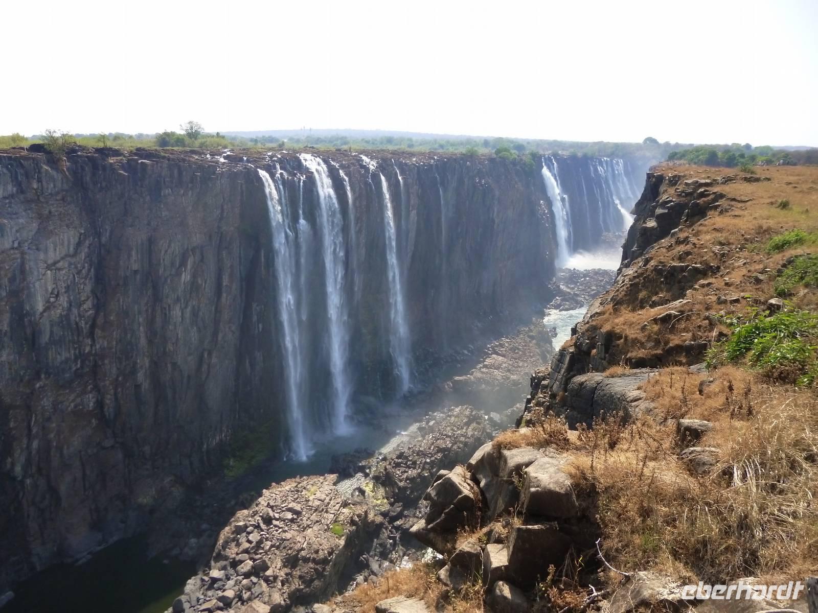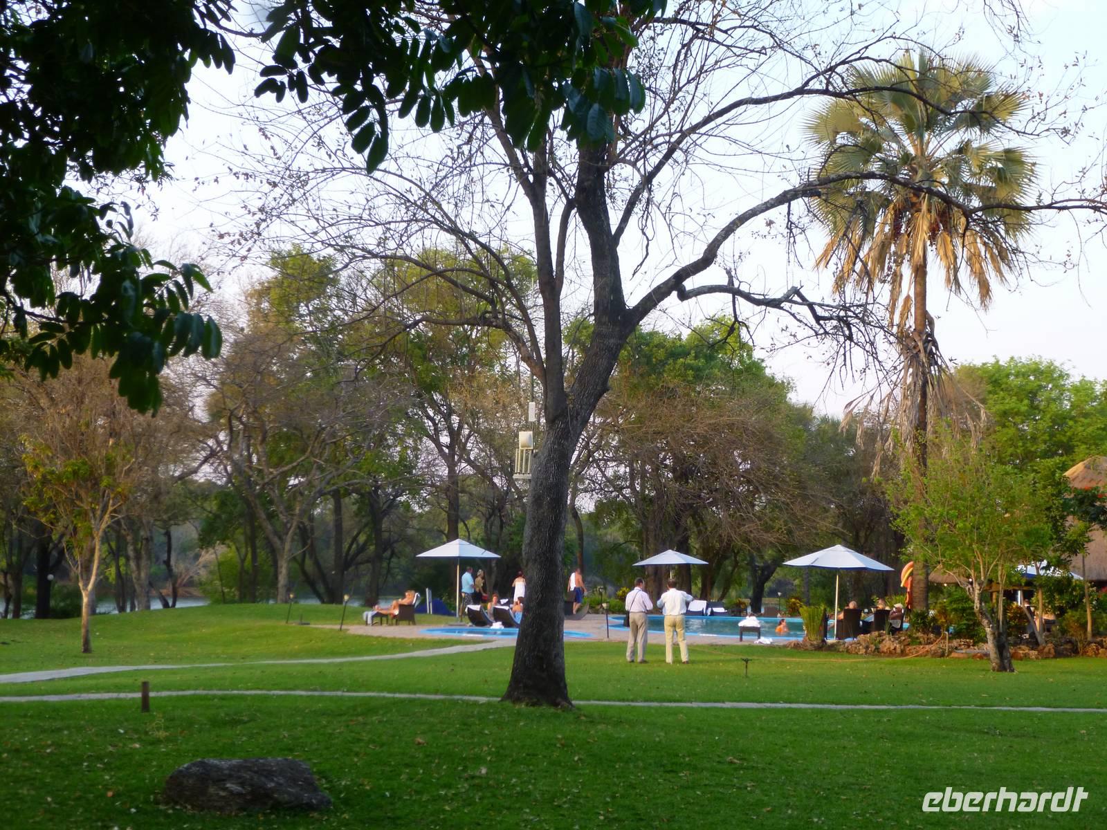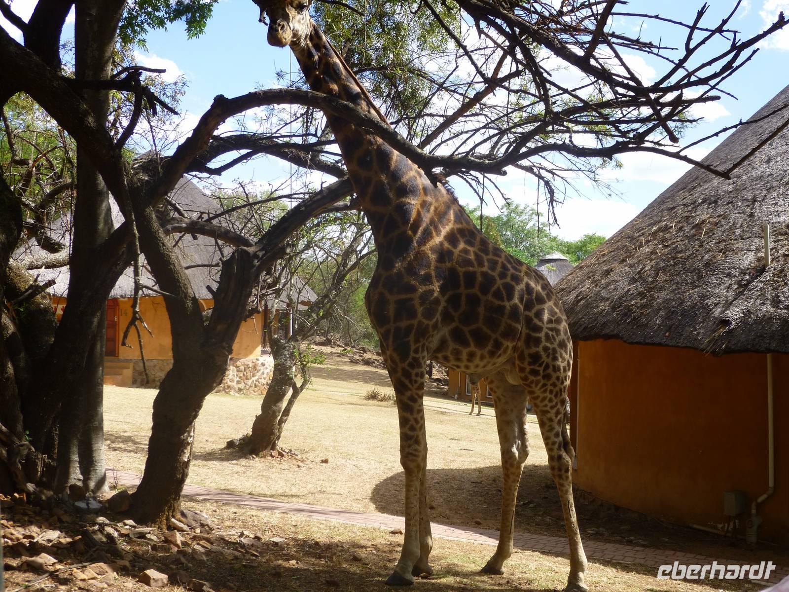 Auf zur leider letzten Etappe unserer Reise, nach Simbabwe zu den berühmten Victoria Wasserfällen. Am Flughafen Johannesburg verabschiedeten wir uns von Christel, unserer Reiseleiterin und Mohammed, unserem Busfahrer. Nach ca. 2 h Flug landeten wir in Livingstone. Eine riesige Schlange an der Passkontrolle, Kathrin sammelte kurzerhand alle Reisepässe ein und erledigte die Formalitäten, während die Eberhardt-Gäste bereits das Gepäck in Empfang nahmen. Am Ausgang wurden wir von Grace empfangen und starteten in Richtung Zimbabwe. An der Grenze ließen wir mit einem mulmigen Gefühl unsere Pässe zurück, die Alternative wäre 2 Stunden warten bei 35 Grad im Schatten. Wir vertrauten Grace... Am Nachmittag hatte wir Zeit unsere Seele baumeln zu lassen, die Krokodilfarm zu besuchten oder einfach in den Hotelpool zu hopsen. Am Abend schlemmten wir am leckeren Buffet und wurden mit Livemusik unterm Sternenhimmel unterhalten.