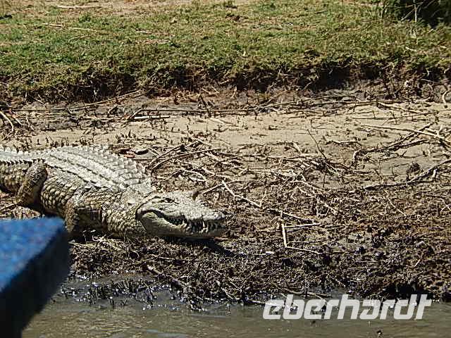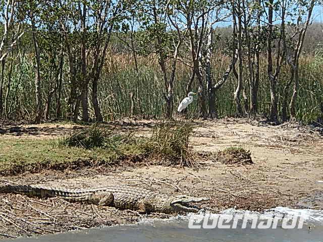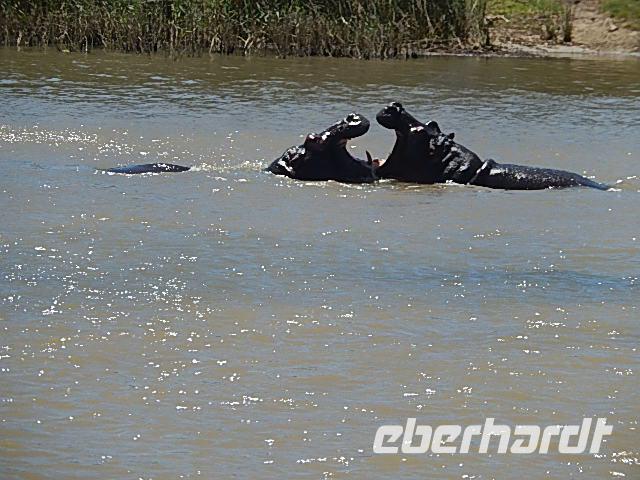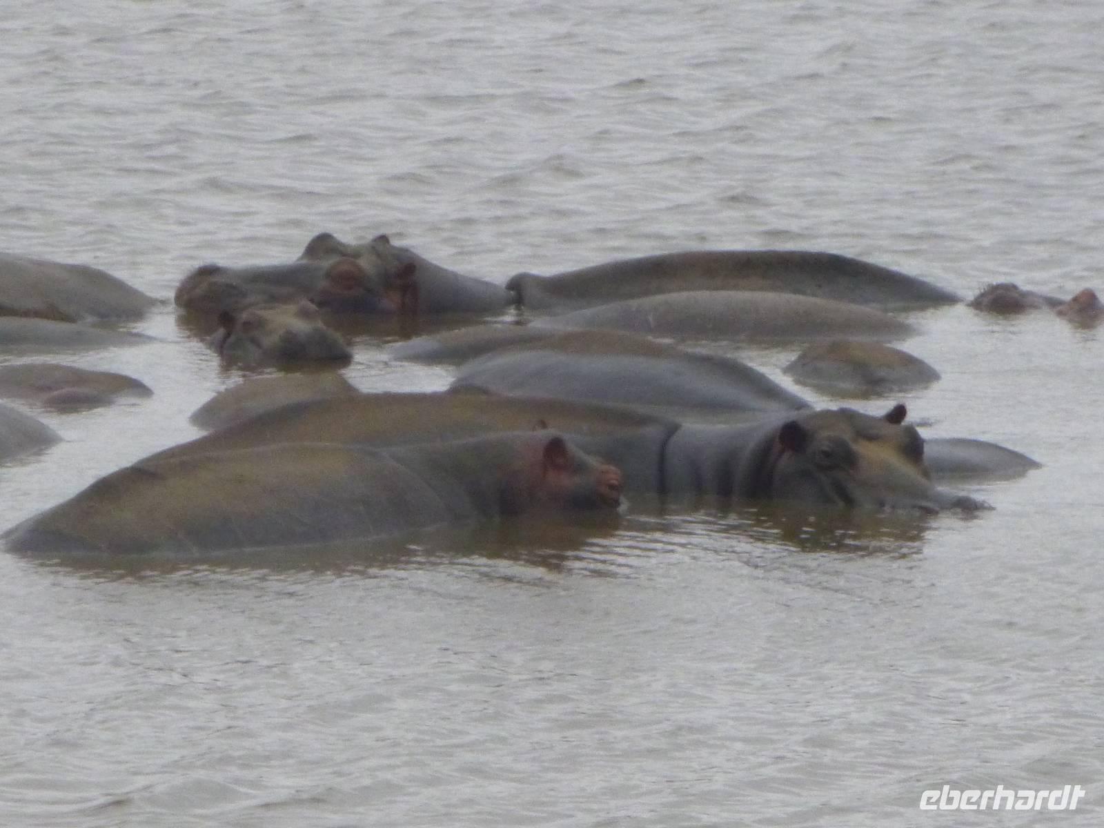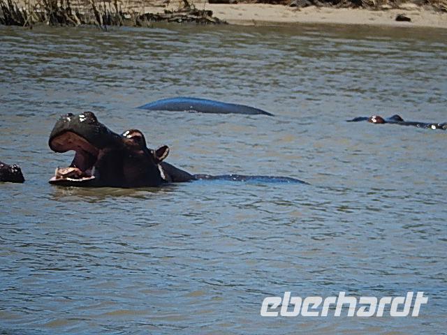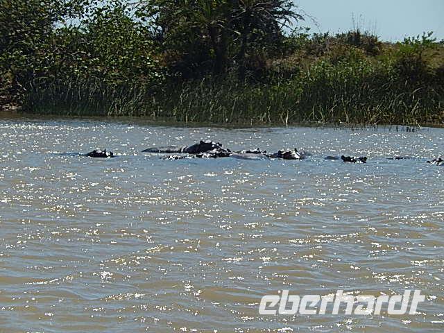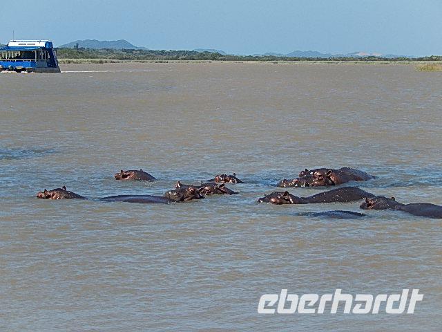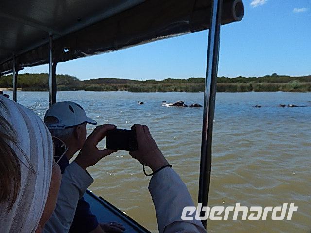 Der Tag begann geruhsam. Nach dem gemütlichen Frühstück bummelten wir zur Bootsanlegestelle für unsere Rundfahrt auf dem St.Lucia-See. Mit Fernglas und Fotoapparat bewaffnet nahmen wir unterm Sonnendach Platz. An den Ufern gedeiht eine üppige Vegetation, im Wasser und an Land erspähten Krokodile, die eine harmonische Gemeinschaft mit Witwenenten und einen Goliathreiher bildeten; Wollhalsstörche, Fisch- und Schreiseeadler. Als wir die ersten Flusspferde entdeckten, sollten wir leise sein, was aufgrund der Aufregung schwer fiel. "Hippos" schauen äußerst harmlos aus, wenn sie friedlich im Wasser liegen und ihre Ohren wie Propeller kreisen. Doch Vorsicht, sie sind gefährlich und unberechenbar!