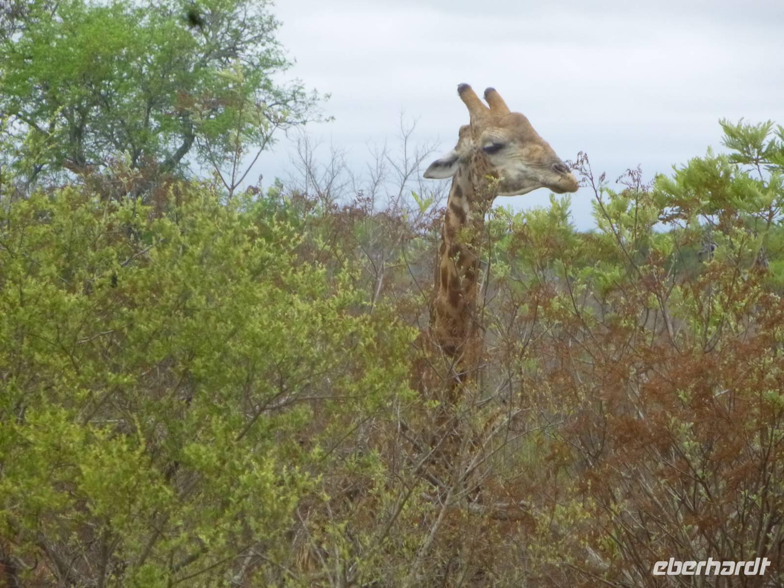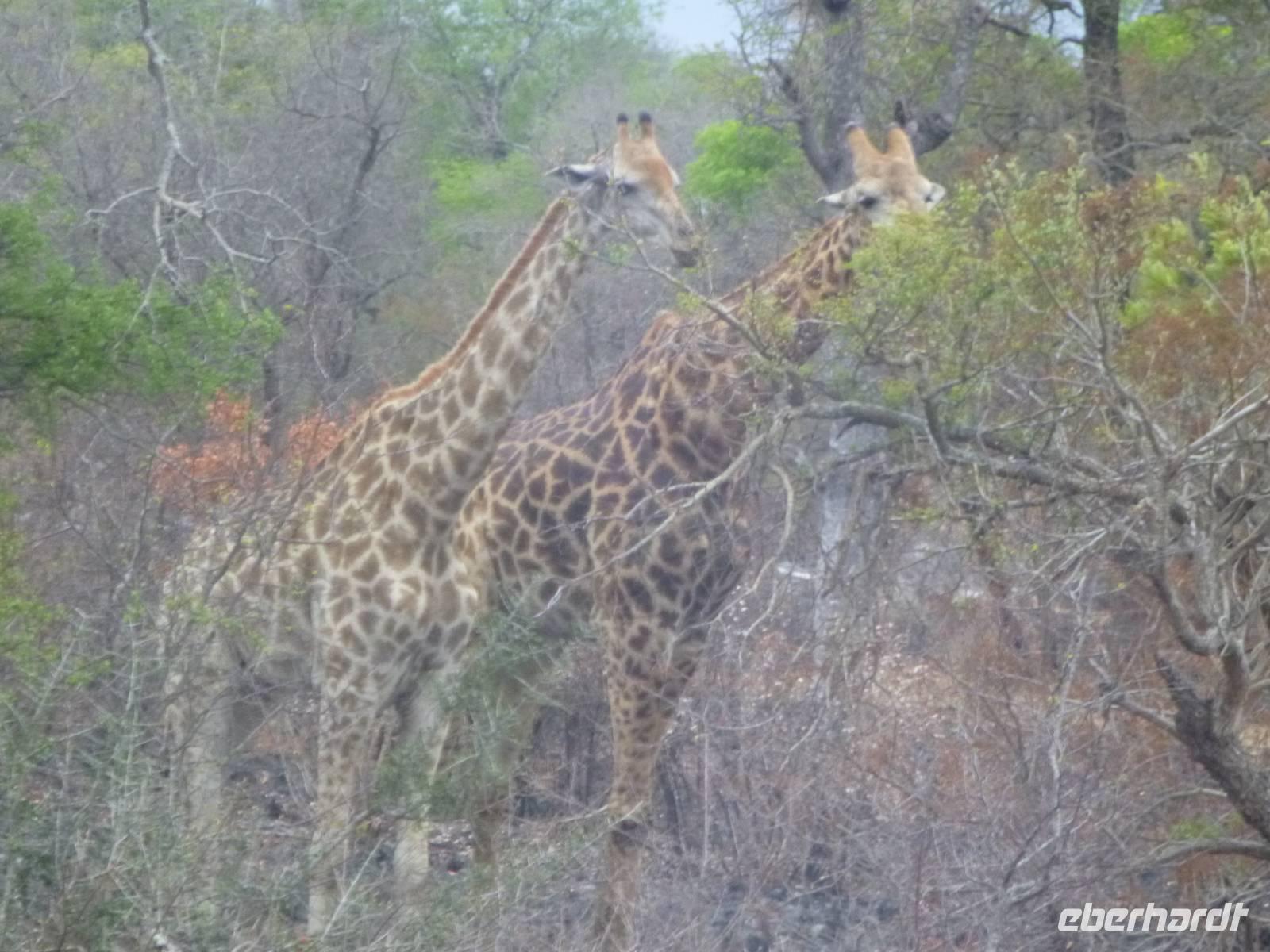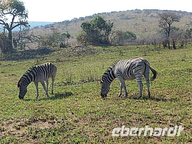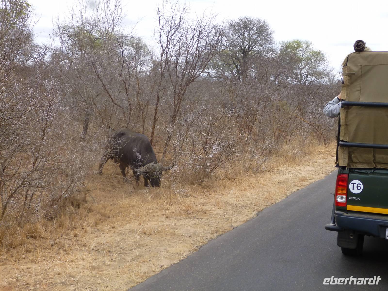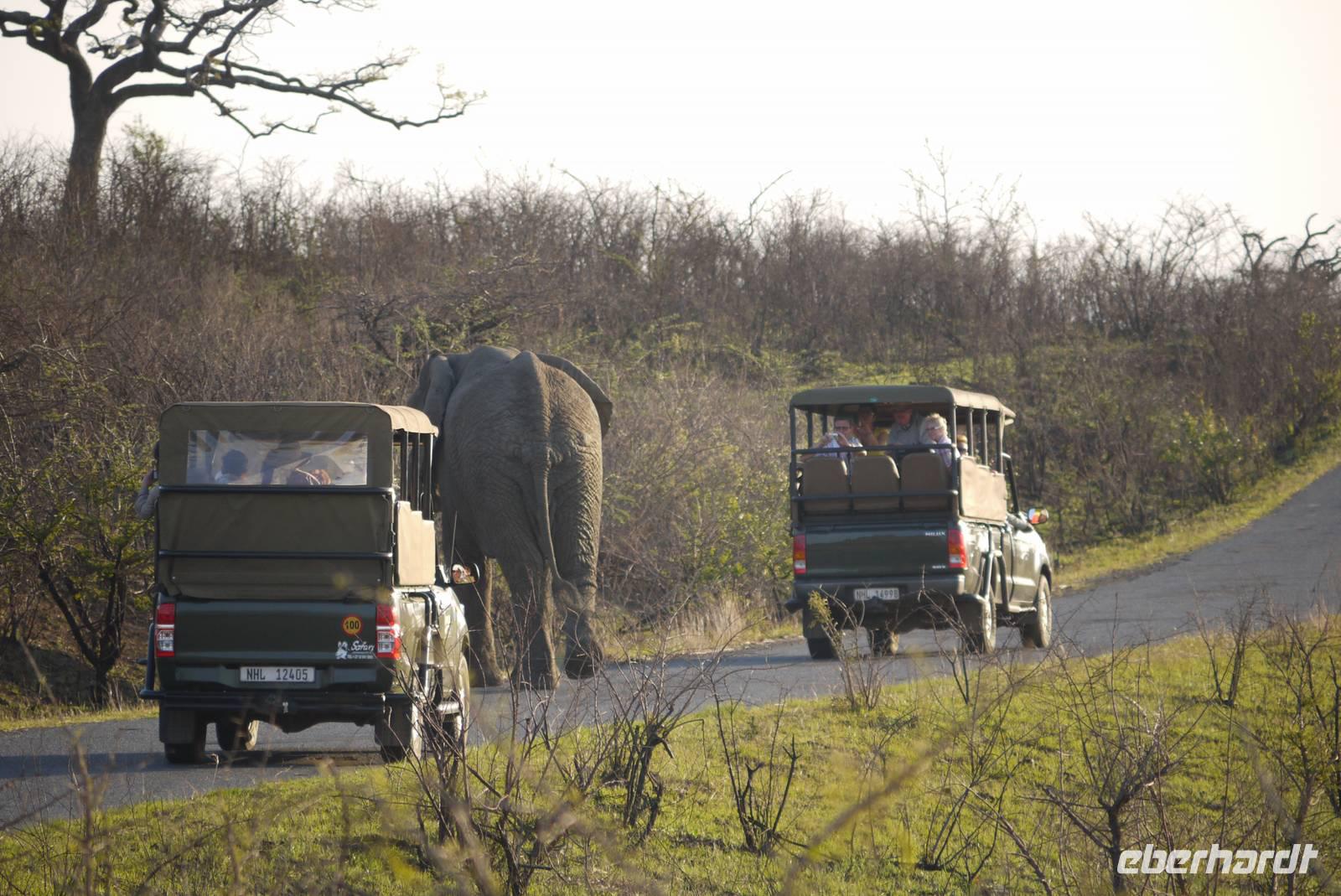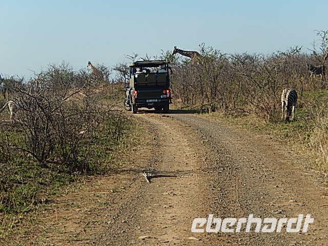 Noch vor Sonnenaufgang standen wir am nächsten Tag auf und haben am Gate unseren Bus gegen offenen Geländewagen getauscht. Das erste mal das wir in Südafrika gefroren haben. Ein bewölkter Himmel ist zwar gut für Tierbeobachtungen aber der kühle Wind war doch gewöhnungsbedürftig. Heia Safari! Zebras und Giraffen am Straßenrand, ein Büffel am Wasser, ein Nashorn versteckt im Gebüsch, Hippos im See, ein Krokodil im Fluss... Später Zebras, Giraffen, Gnus, Paviane, Elefanten, Giraffen und Impalas, Kampfadler, Schreiseeadler, Klippspringer, Gabelracke, Rotschnabeltoko, Perlhühner, Kudus und, und, und. .. Fast am Ende der Safari wurde es für einige nochmal spannend, ein Leopard auf der Jagd in einem ausgetrocknetem Flusslauf ... genial. Schade dieses Erlebnis entging einer unserer Jeep-Besatzungen. Müde, aber voller neuer, überwältigender Eindrücke kehrten wir von der Safari ins Hotel zurück.