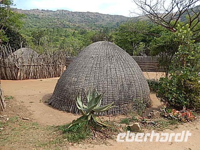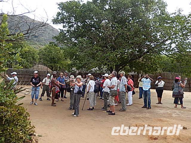 Bald waren wir im belebten Manzini und bummelten über den hiesigen Swazimarkt. Auf dem Markt wird fast alles feil geboten: Schmuck, Holzschnitzreien, Souvenire aller Art, schöne Stoffe und wir erhielten einen warmen Händedruck vom Sangoma. Vorbei am Sitz der Königin Mutter gelangten wir ins Ezulwini-Tal. Im Mantenga Nature Reserva begrüßte uns John, ein junger Swazi und lud uns zum Rundgang durch das Village ein. Er erzählte uns Interessantes aus dem Dorfleben, auch durften wir eine Rundhütte, genannt Bienenkorb, von innen besichtigen. Nur in gebückter Haltung ging's hinein, Männer zuerst und danach die Frauen, die immer getrennt von den Männern stehen müssen. Im Inneren der Hütte waren wir von den angenehmen Temperaturen überrascht, draußen war es viel wärmer, auch der nicht vorhandene Rauchabzug schien zu funktionieren. Danach erwartete uns ein mitreißendes, musikalisches Feuerwerk. Lächelnde Swazis in farbenfrohen Kleidern sangen, tanzten und trommelten für uns. Wir waren begeistert von den akrobatischen Tänzen, dem kraftvollem Trommeln, dem stimmgewaltigen, harmonischen Gesang. Auch unsere Füße konnten wir dabei nicht still halten und einige Gäste tanzten mit. Gleich in der Nähe und eingebettet in die Natur befindet sich die Mantenga Lodge, wo wir am Abend unser Bergfest feierten und übernachteten.