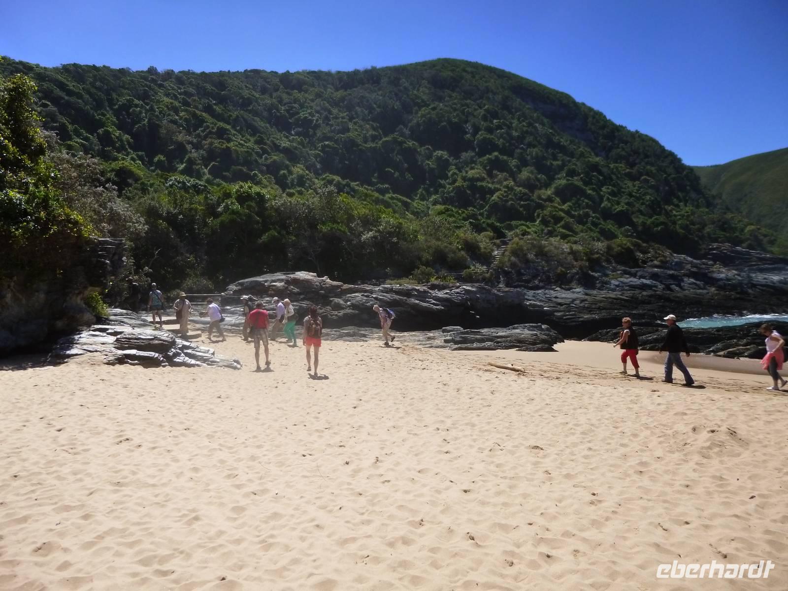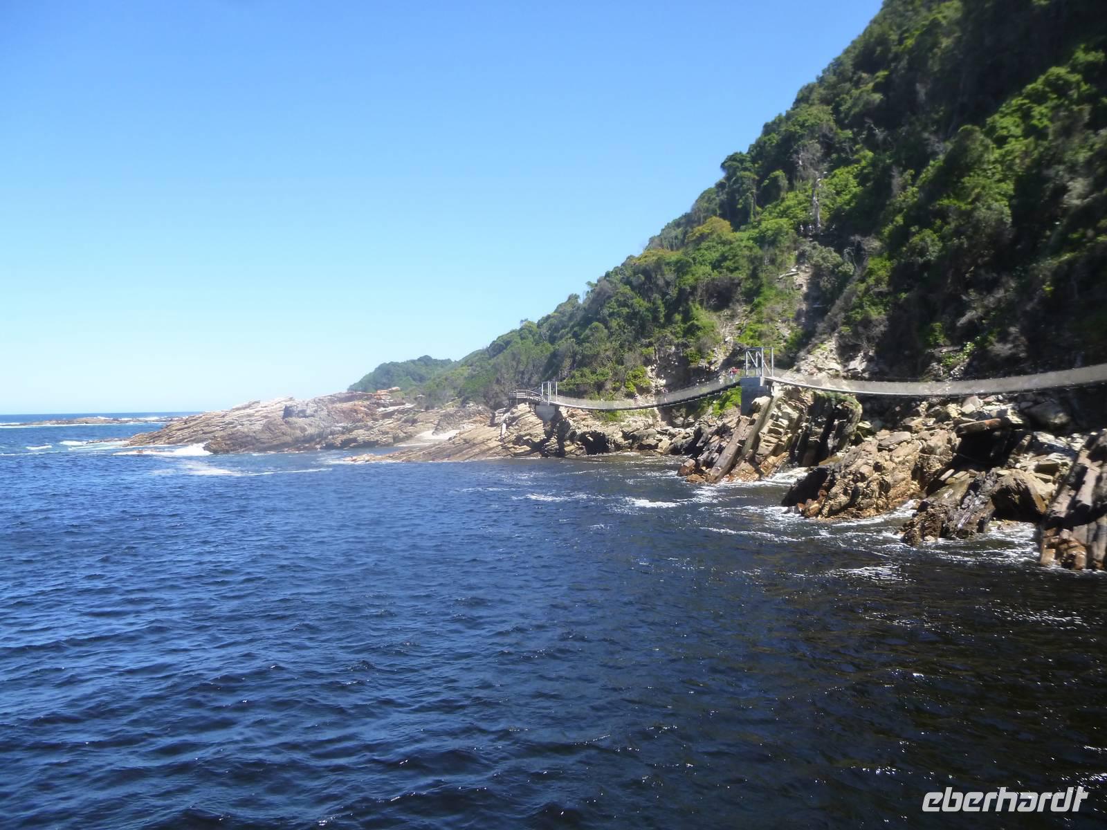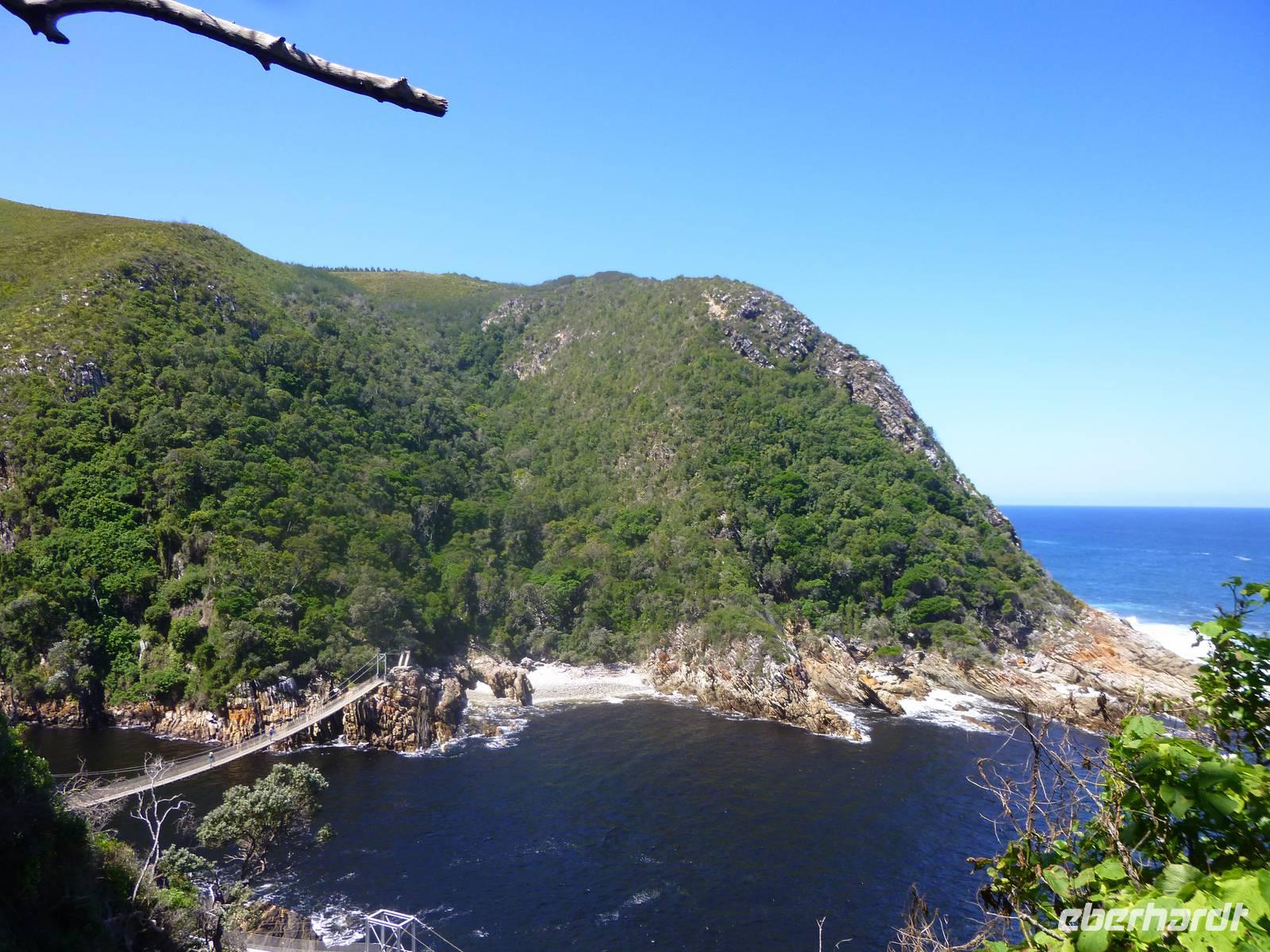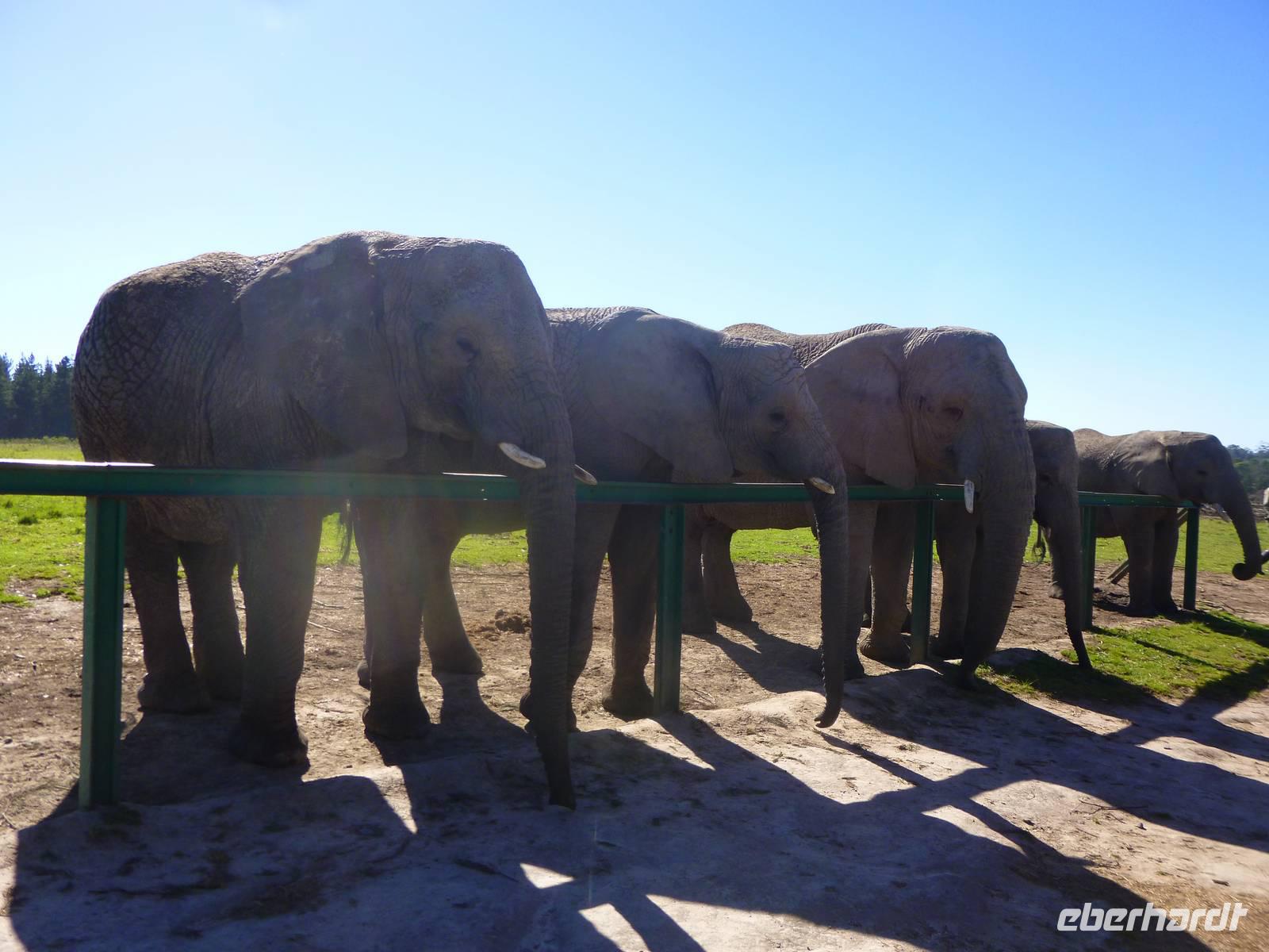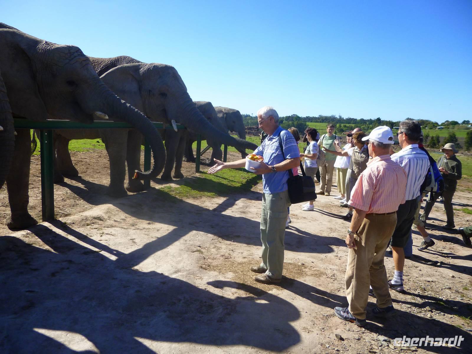 Am nächsten morgen freuen wir uns auf den Besuch des Knysna-Elephant-Park. Zuerst erfahren wir alles Wissenswerte über das Leben der riesigen Dickhäuter. Von uns wußte keiner, das eine natürliche Todesursache von Elefanten verhungern ist, da nach einer Lebensdauer von ca. 40 Jahren die Zähne der Tiere nicht mehr nachwachsen. Mit kleinen Eimerchen mit Obsthäppchen lockten wir die grauen Riesen und konnten so, unter Aufsicht der Ranger, hautnahen Kontakt mit den Tieren aufnehmen. Trotz erhöhten Knuddelfaktors begegneten wir den Dickhäutern mit Respekt. Der Besuch war ein tolles Erlebnis. Nach Plettenberg Bay entschwand die Küste vorerst unseren Augen und wir überquerten gewaltige Schluchten. An der Bloukrans-Bridge stopten wir und beobachteten wie sich Adrenalin-Junkies kopfüber in die 216 m tiefe Schlucht stürzten. Im Tsitsikamma Nationalpark angekommen, wanderten wir bei strahlendem Sonnenschein auf dem befestigten Rundweg durch ein Stück „Urwald" und wurden mit fantastischen Ausblicken beschenkt. Auf der Hängebrücke stehend, schauten wir fasziniert wie der schwarze Storms-River in den blauen Indischen Ozean mündet. Vor der Weiterfahrt gab es noch ein Schlückchen vom leckeren Amarula an der romantischen Küste des Indischen Ozeans bei herrlichstem Wetter - Abschied von der Gartenroute.