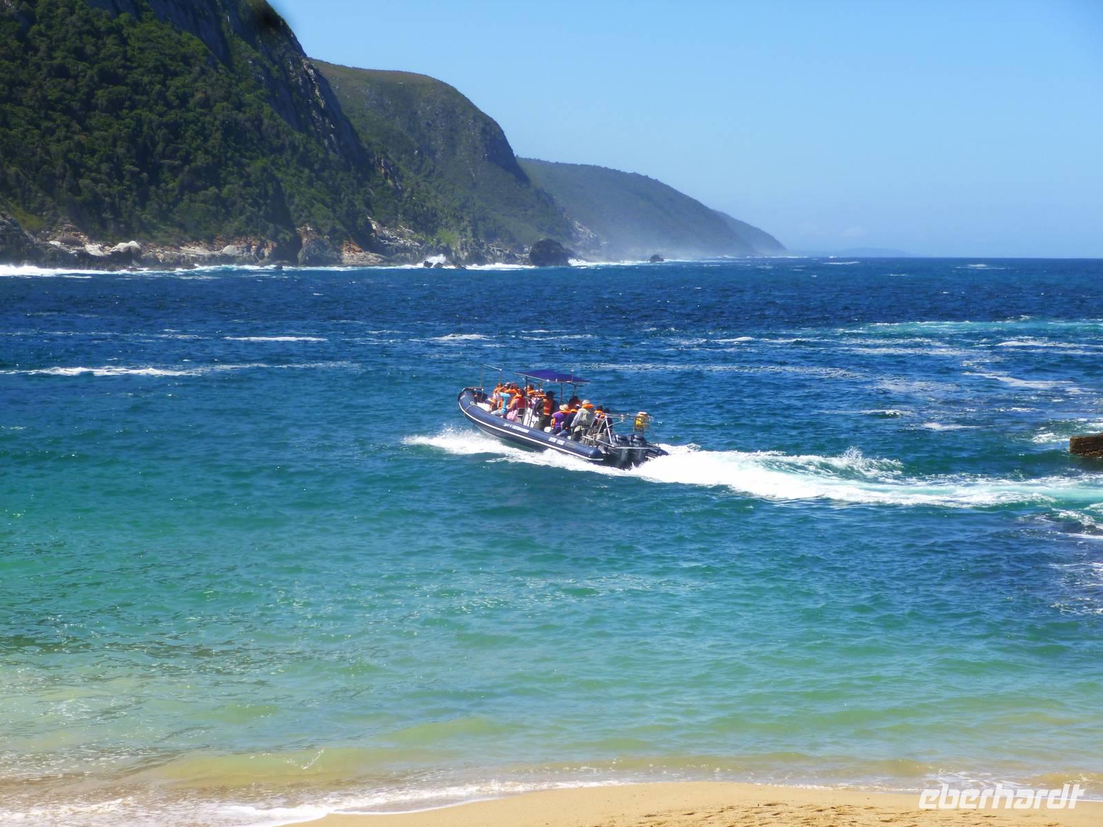 Nach dem Frühstück entführte uns Mathilda, in die Welt der Cango Caves. Dieses imposante Tropfsteinhöhlensystem ist zu großen Teilen noch unerforscht. Im charmanten Deutsch erklärte sie auf amüsante Weise die Geschichte der Höhle und sang für uns im großen Höhlensaal, eine tolle Akustik, wir bekamen Gänsehaut. Das Gebiet um Oudtshoorn ist bekannt für die Straußenzucht, da darf ein Besuch einer Farm natürlich nicht fehlen. Bei einer Führung wurden wir in die Geheimnisse der Straußenzucht eingeweiht und lernten einige „Farmbewohner" kennen. Zum Mittagessen probierten wir dann ein saftiges Straußensteak. Über den Outeniqua-Pass gelangen wir bei strahlendem Sonnenschein wieder an die Küste. In Wilderness können wir nicht widerstehen und müssen unsere Füße einmal in den Indischen Ozean zu halten. Bevor wir in unser nächstes Etappenziel die Lagunenstadt Knysna aufbrechen, stossen wir mit Amarula auf den heutigen Feiertag in Deutschland an. Nach der Ankunft im Hotel Graywood nutzen alle die Gelegenheit die kleine Knysna Waterfront mit Ihren vielen Restaurants und Geschäften zu erkunden.