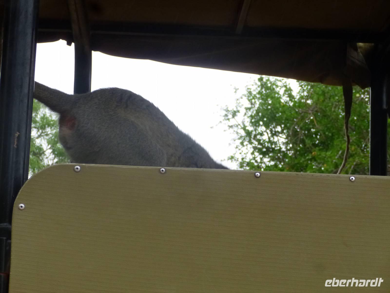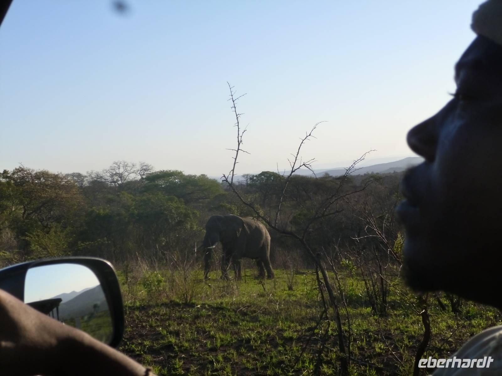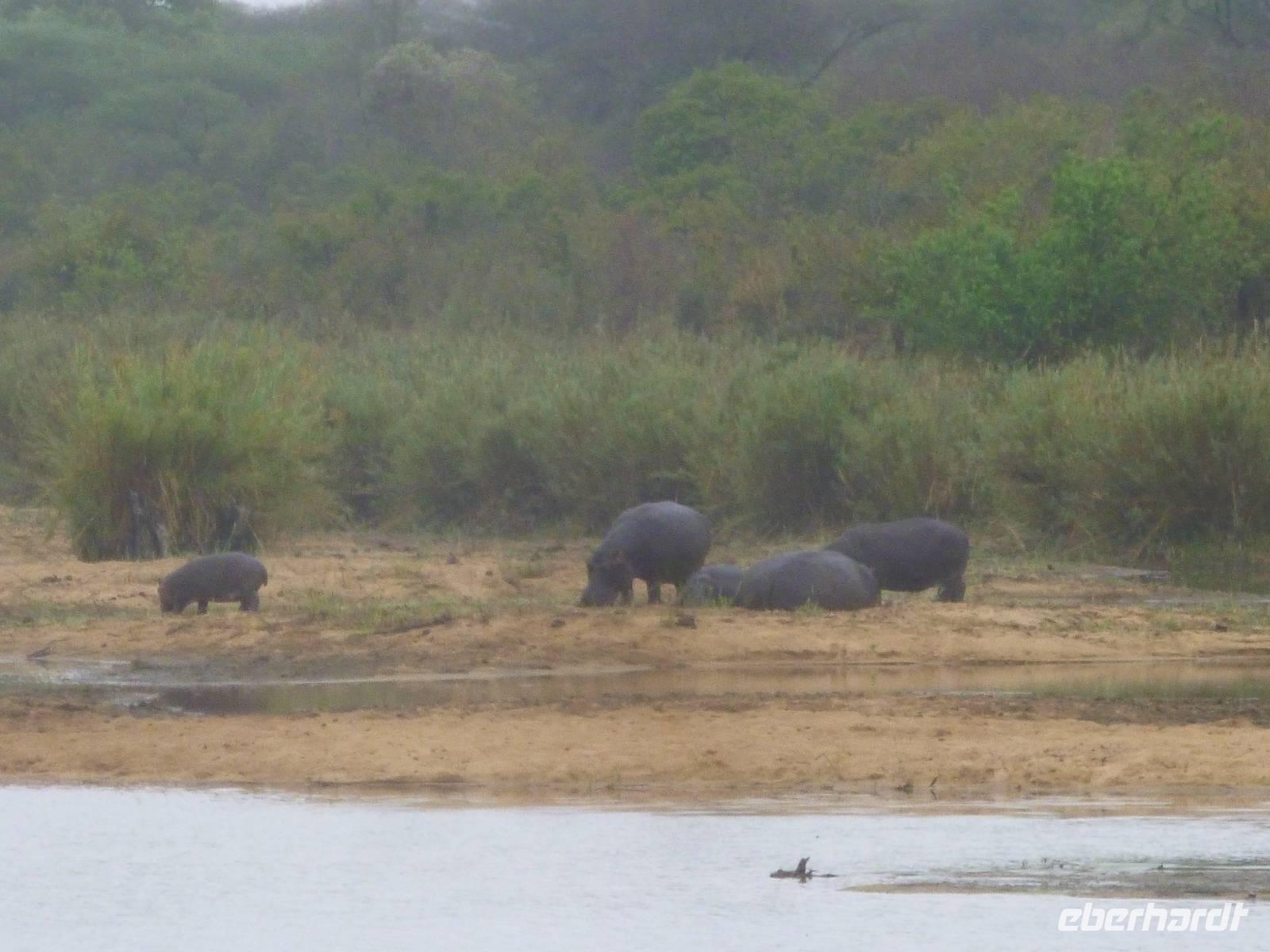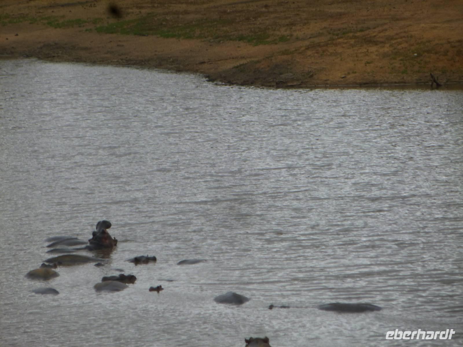 Am Nachmittag startete die gesamte Gruppe zu einem Ausflug in den 70 km entfernten Hluhluwe-Umfolozi-Nationalpark.Bei der Safari im offenen Geländewagen erspähten wir große und kleine Tiere: Elefanten, Giraffen, eine lustige Warzenschweinfamilie, Paviane, Impalas, Zebras, Wiedehopf und ... Nashörner. Der Park ist bekannt für seine große Nashornpopulation und einige konnten wir direkt neben unserem Jeep bestaunen. Voller toller Eindrücke von den Tierbeobachtungen kehrten wir ins Hotel zurück und warteten... auf das hoteleigene Hippo. Leider hatte es an diesem Abend was anderes vor.;-)